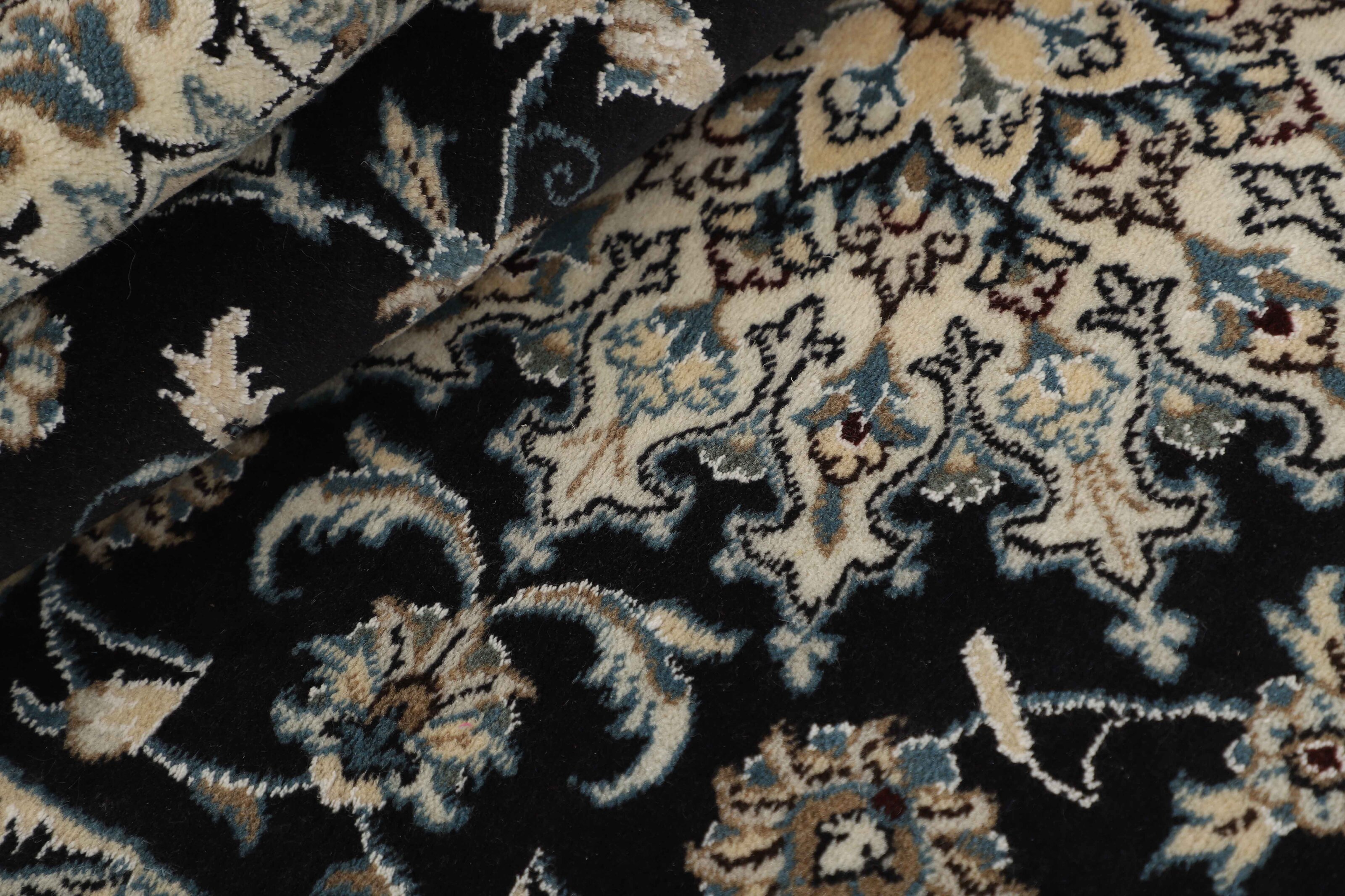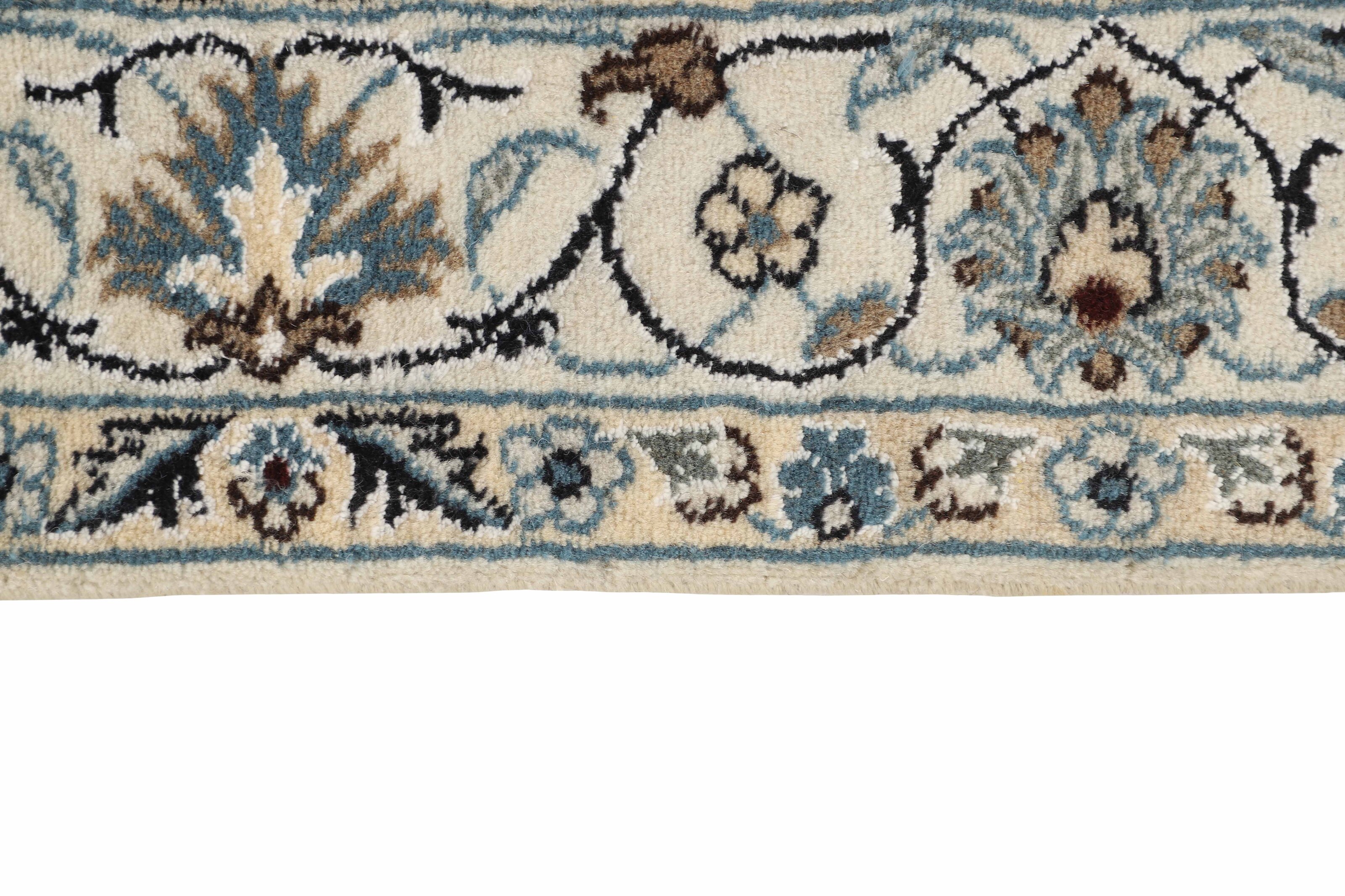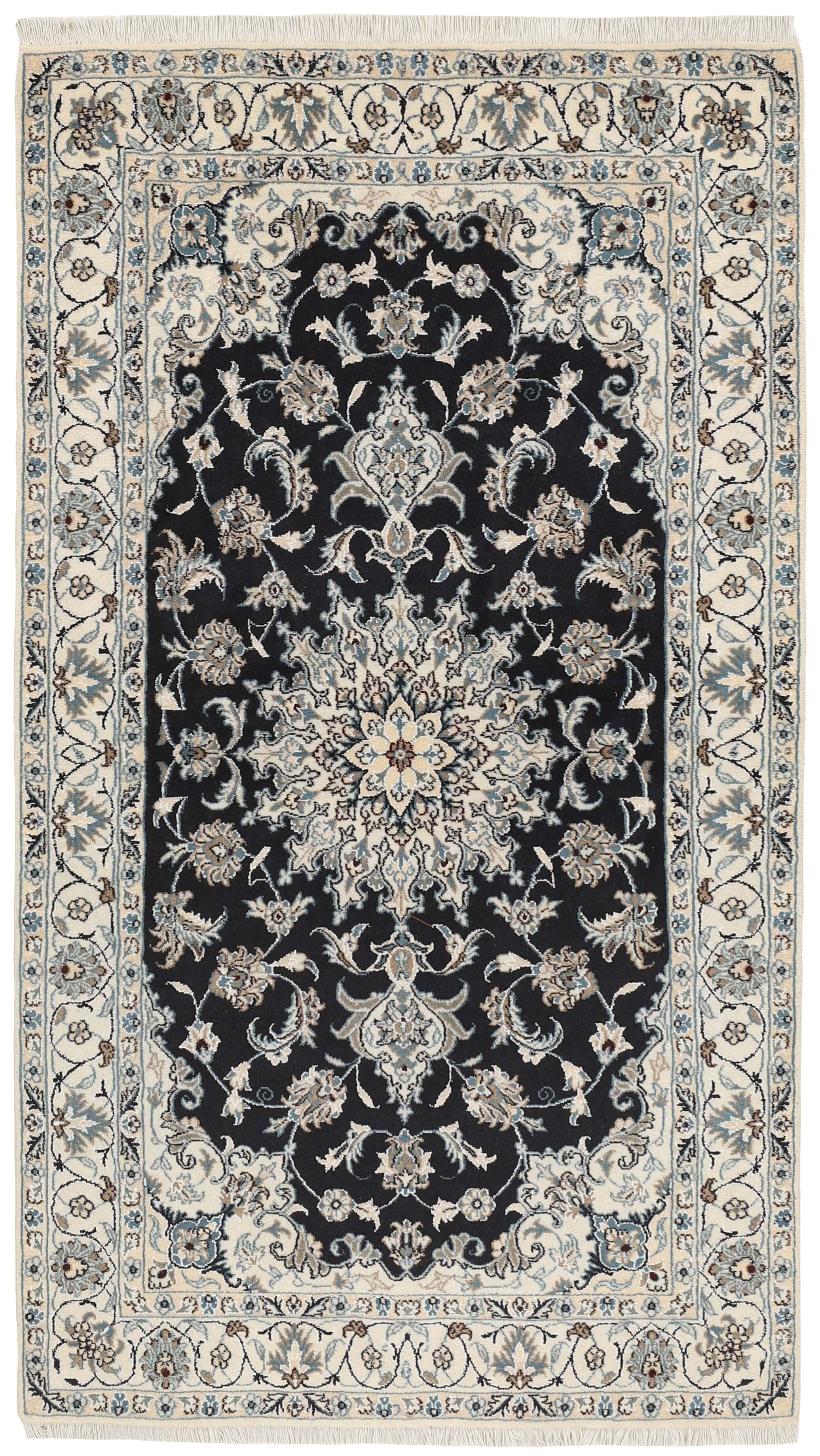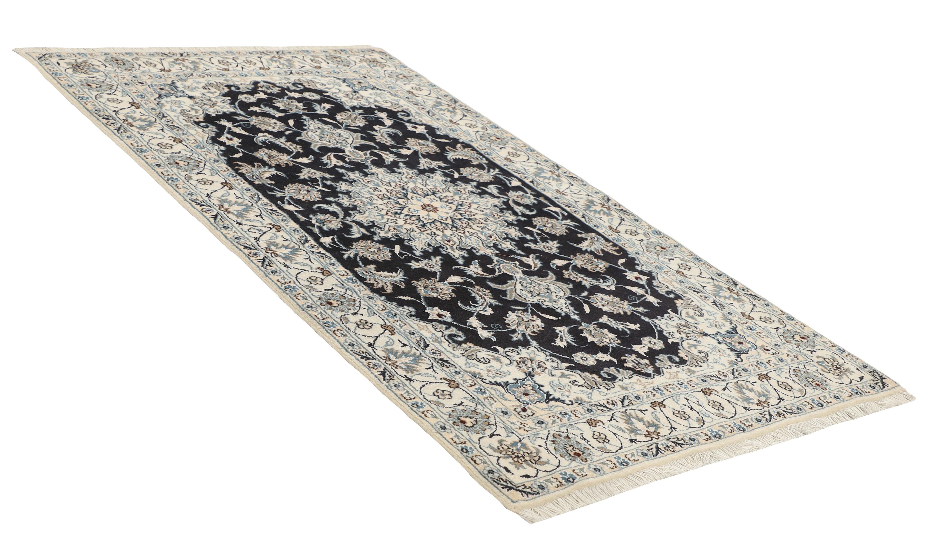 Nain KashmarItem no.: 1519780 Size: 117 cm x 208 cmNain is a city of about 50.000 people, located in the Isfahan Province. It has historic significance, since it was the last stop on caravan routes before Kavir-a-Lut, one of the deserts that stretch through the centre of Iran. The Nain Mosque is one of Iran’s oldest, and is built far better than the later and more famous mosques of Isfahan. The industry in Nain was traditionally focused on the production of wool garments, but the weavers switched to rug production when the demand fell. Their new products soon became famous, as the weavers were skilled and used good quality materials. The warp and weft are cotton, with a wool pile and contours of silk. Sometimes, silk is used more in the base. The colours are refined; nuances of ivory and cream, with small areas of red, green, and blue. As with the rugs from Isfahan, the patterns of the Nain rugs are also classical. The Nain rugs are made in all sizes, including the very large of up to 60m2, and some of these have a pure silk pile. The largest Nain rug produced was 20 by 20 metres.
