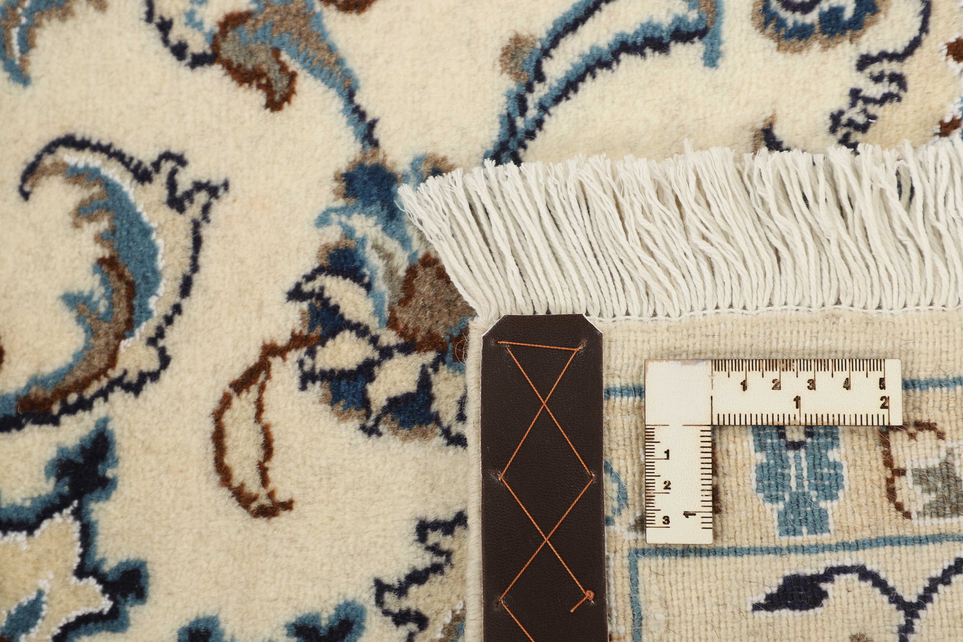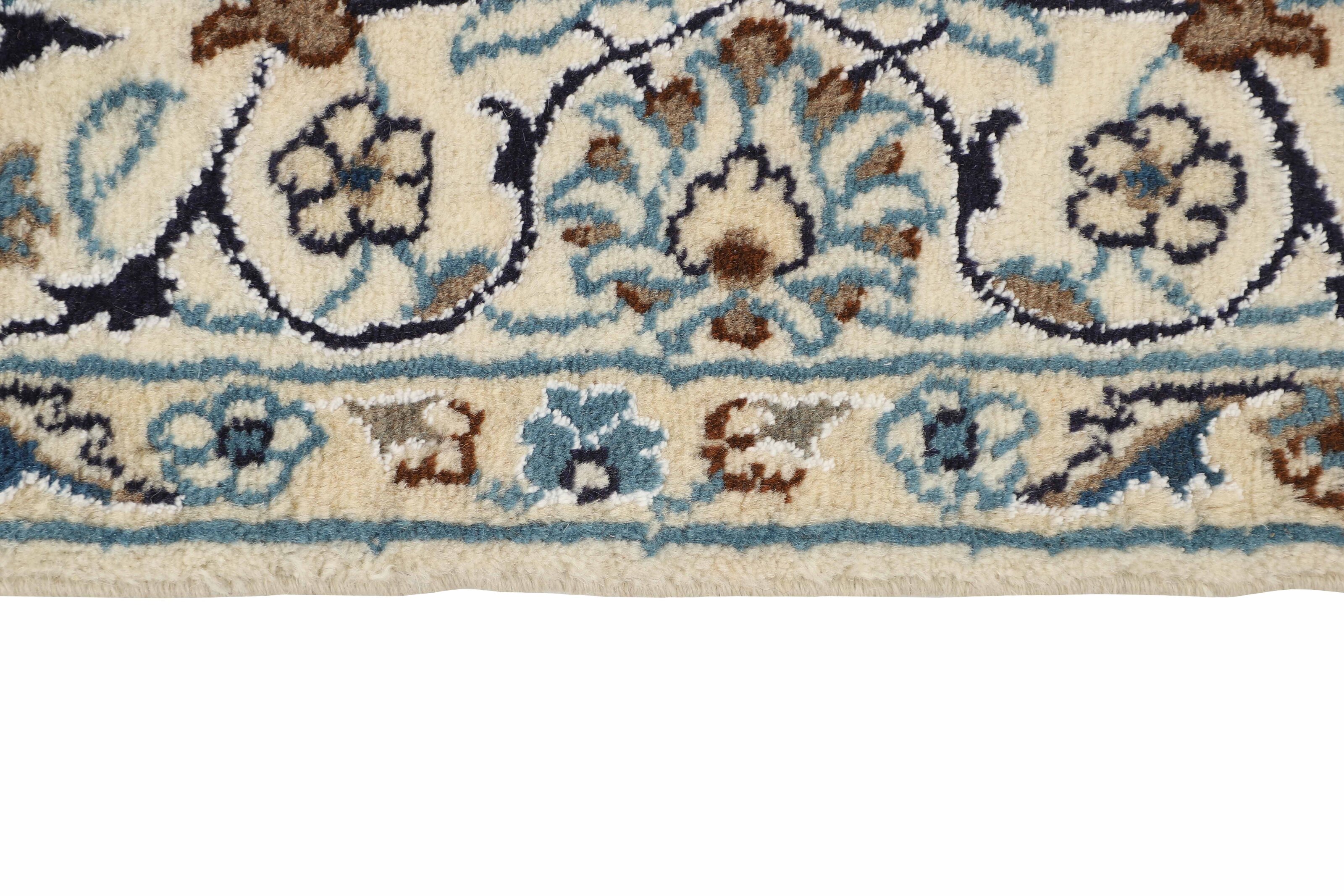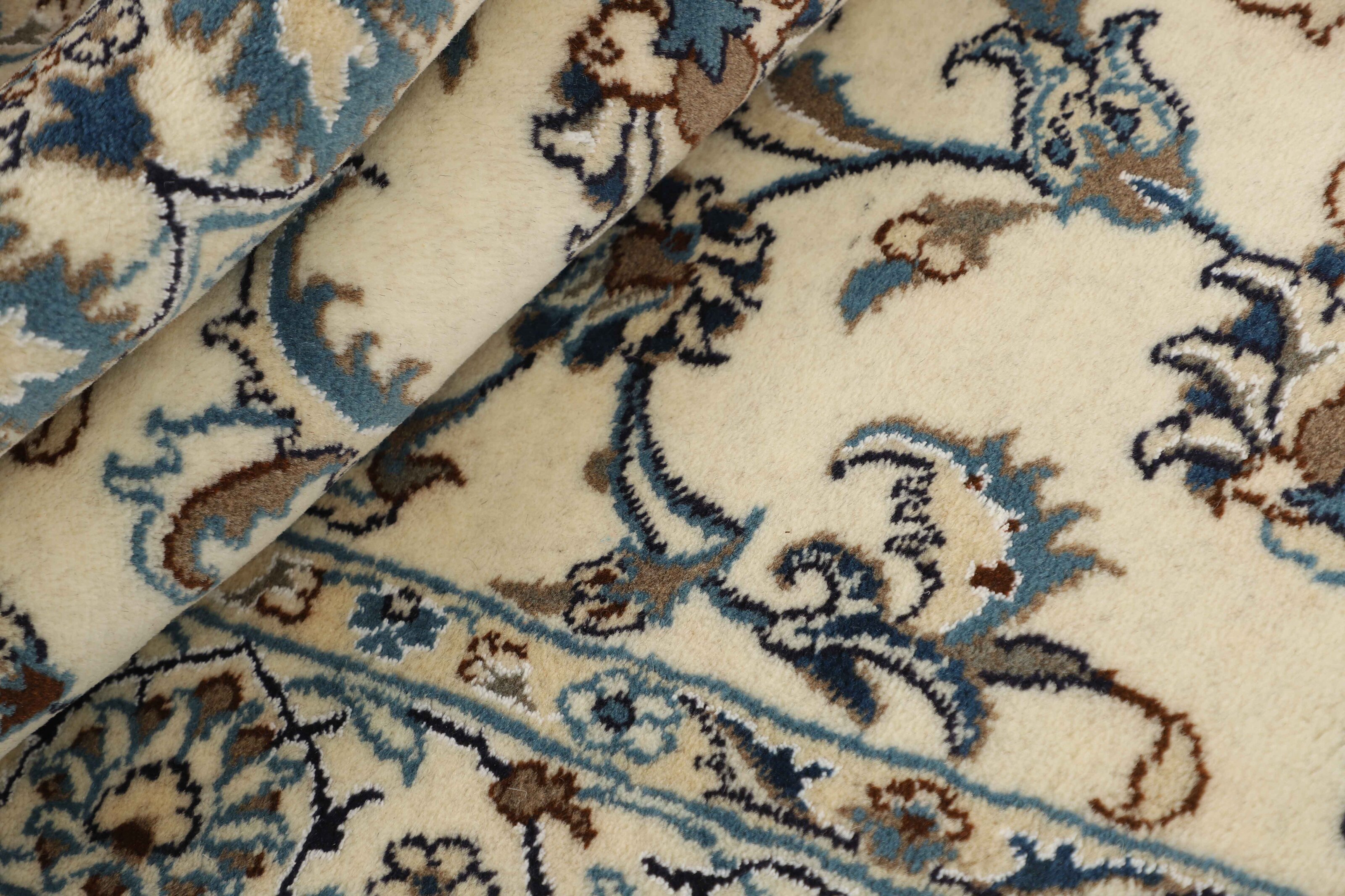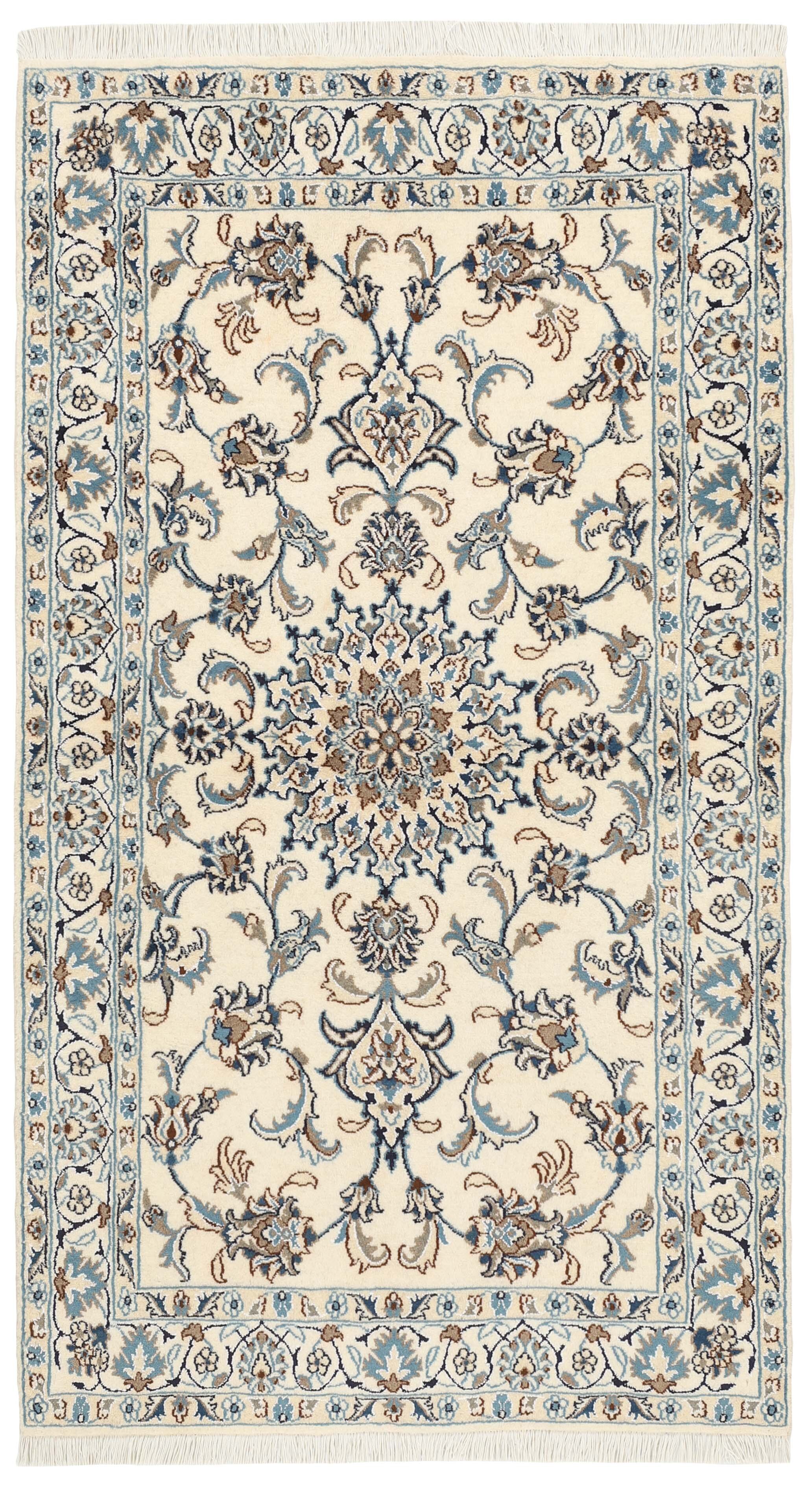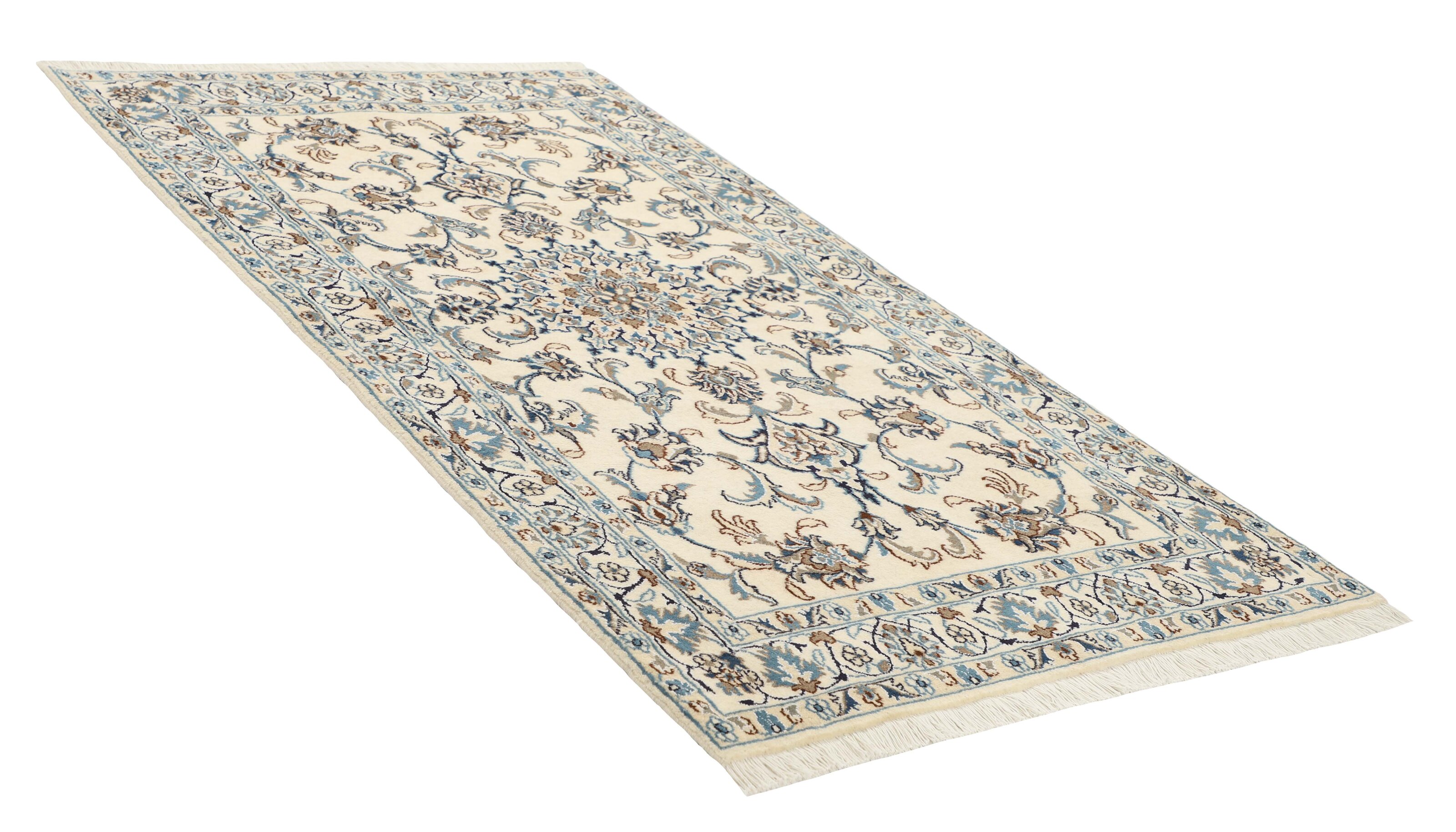 Nain KashmarItem no.: 1519783 Size: 116 cm x 206 cmNain is a city of about 50.000 people, located in the Isfahan Province. It has historic significance, since it was the last stop on caravan routes before Kavir-a-Lut, one of the deserts that stretch through the centre of Iran. The Nain Mosque is one of Iran’s oldest, and is built far better than the later and more famous mosques of Isfahan. The industry in Nain was traditionally focused on the production of wool garments, but the weavers switched to rug production when the demand fell. Their new products soon became famous, as the weavers were skilled and used good quality materials. The warp and weft are cotton, with a wool pile and contours of silk. Sometimes, silk is used more in the base. The colours are refined; nuances of ivory and cream, with small areas of red, green, and blue. As with the rugs from Isfahan, the patterns of the Nain rugs are also classical. The Nain rugs are made in all sizes, including the very large of up to 60m2, and some of these have a pure silk pile. The largest Nain rug produced was 20 by 20 metres.