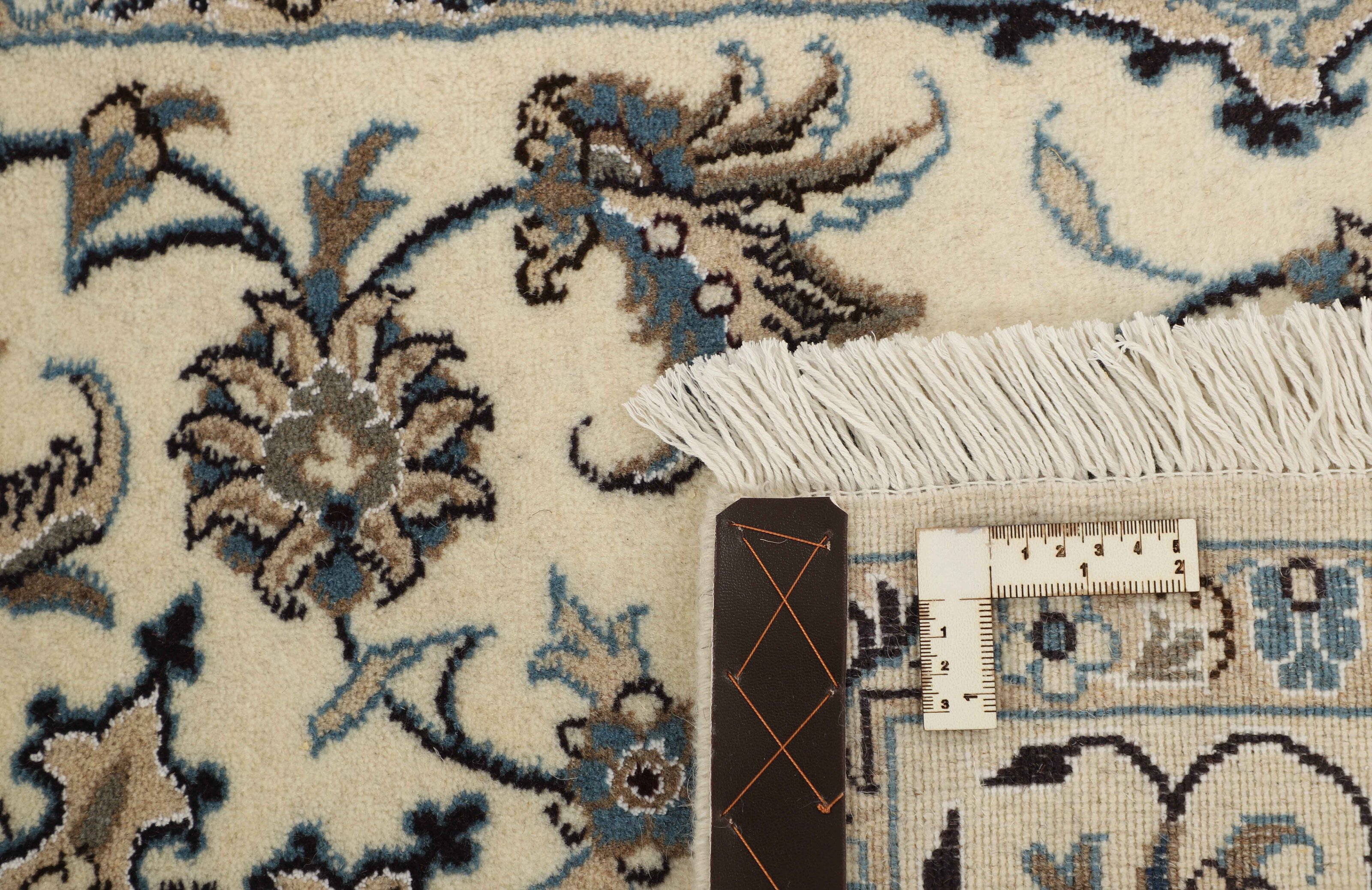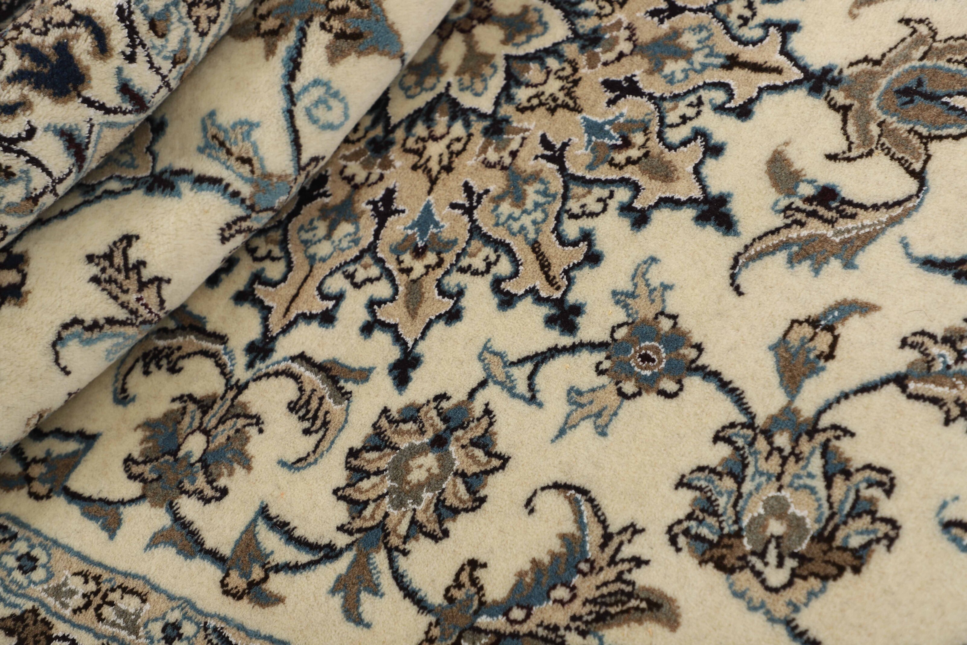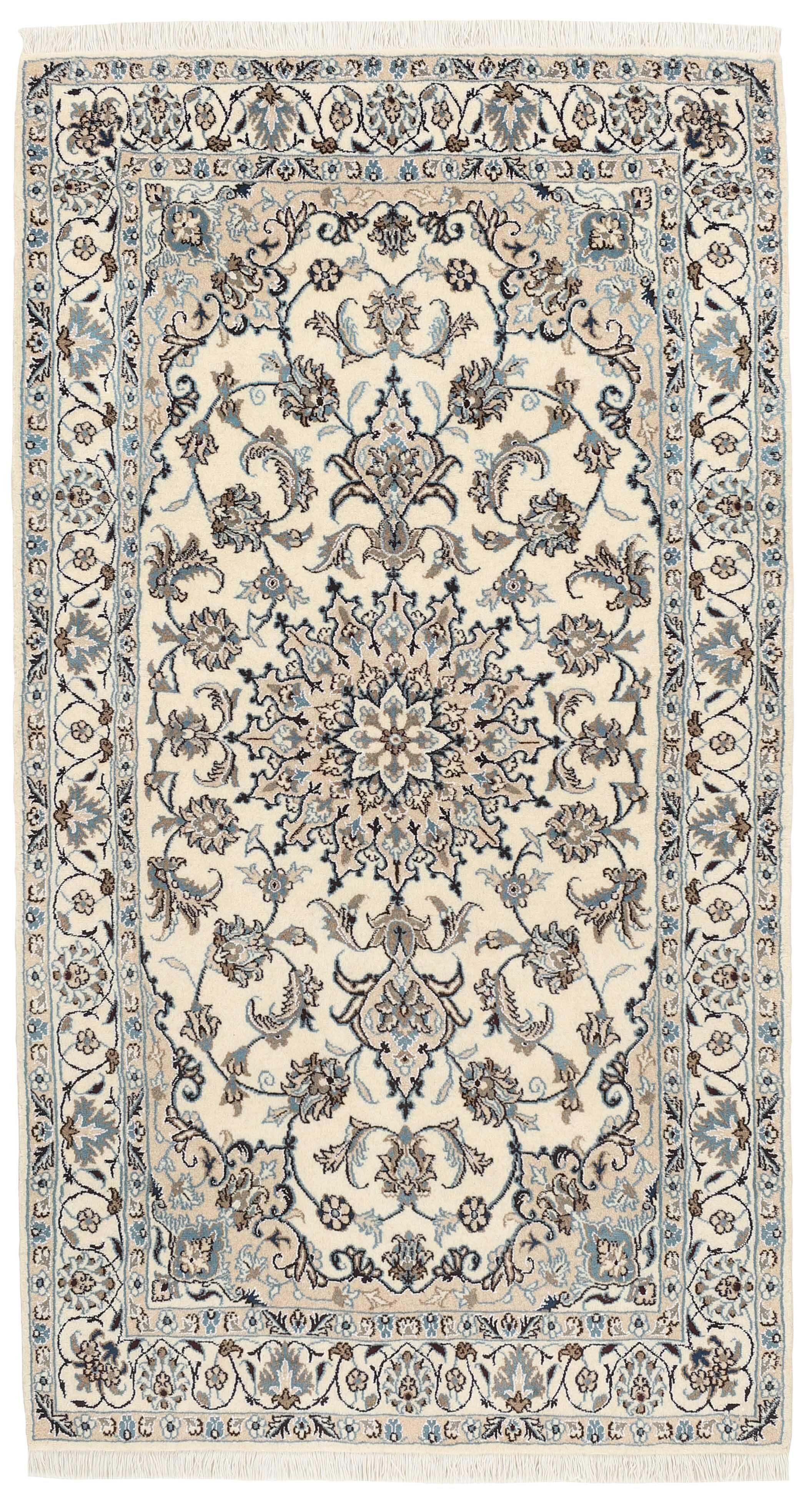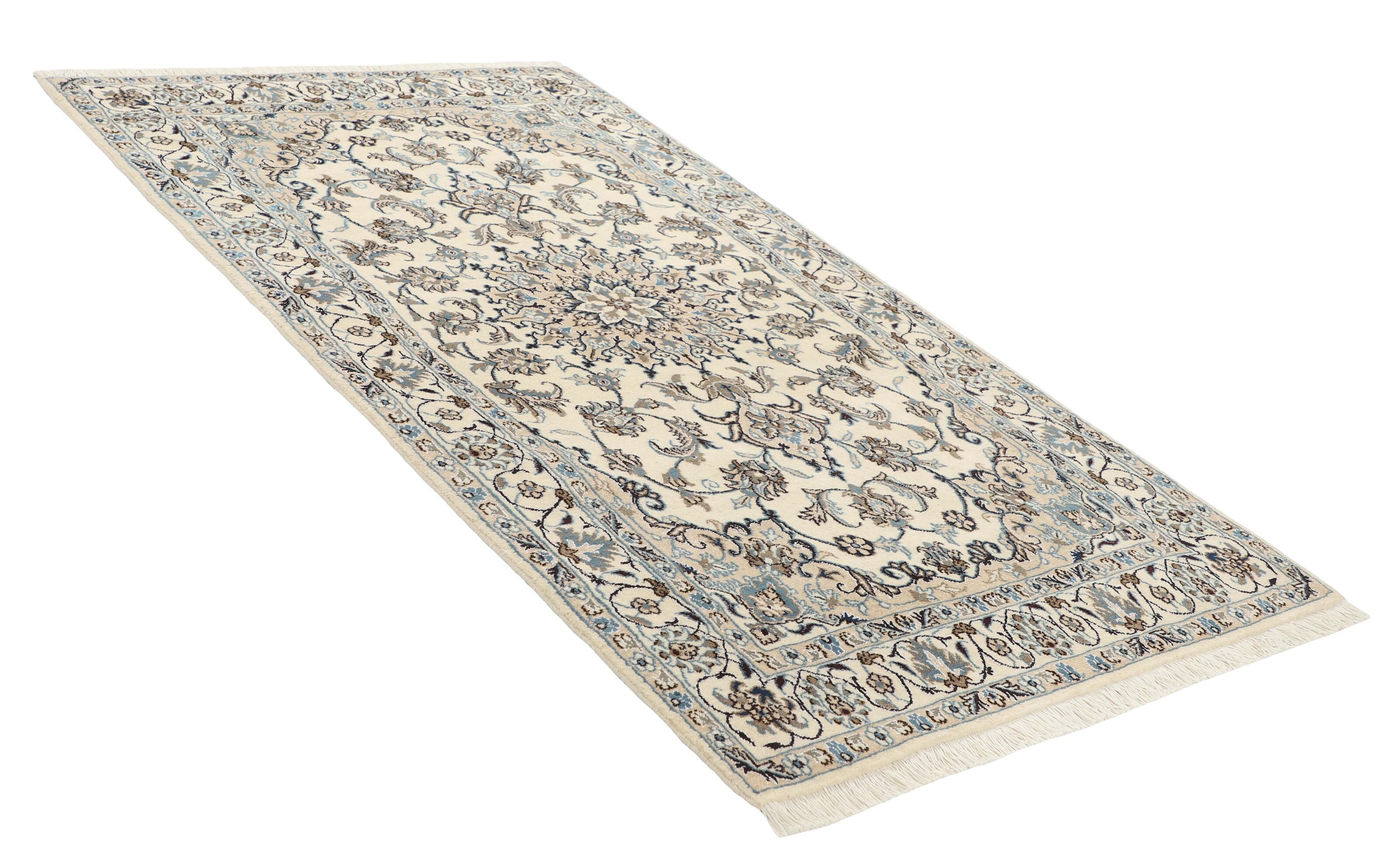 Nain KashmarItem no.: 1519784 Size: 119 cm x 217 cmNain is a city of about 50.000 people, located in the Isfahan Province. It has historic significance, since it was the last stop on caravan routes before Kavir-a-Lut, one of the deserts that stretch through the centre of Iran. The Nain Mosque is one of Iran’s oldest, and is built far better than the later and more famous mosques of Isfahan. The industry in Nain was traditionally focused on the production of wool garments, but the weavers switched to rug production when the demand fell. Their new products soon became famous, as the weavers were skilled and used good quality materials. The warp and weft are cotton, with a wool pile and contours of silk. Sometimes, silk is used more in the base. The colours are refined; nuances of ivory and cream, with small areas of red, green, and blue. As with the rugs from Isfahan, the patterns of the Nain rugs are also classical. The Nain rugs are made in all sizes, including the very large of up to 60m2, and some of these have a pure silk pile. The largest Nain rug produced was 20 by 20 metres.