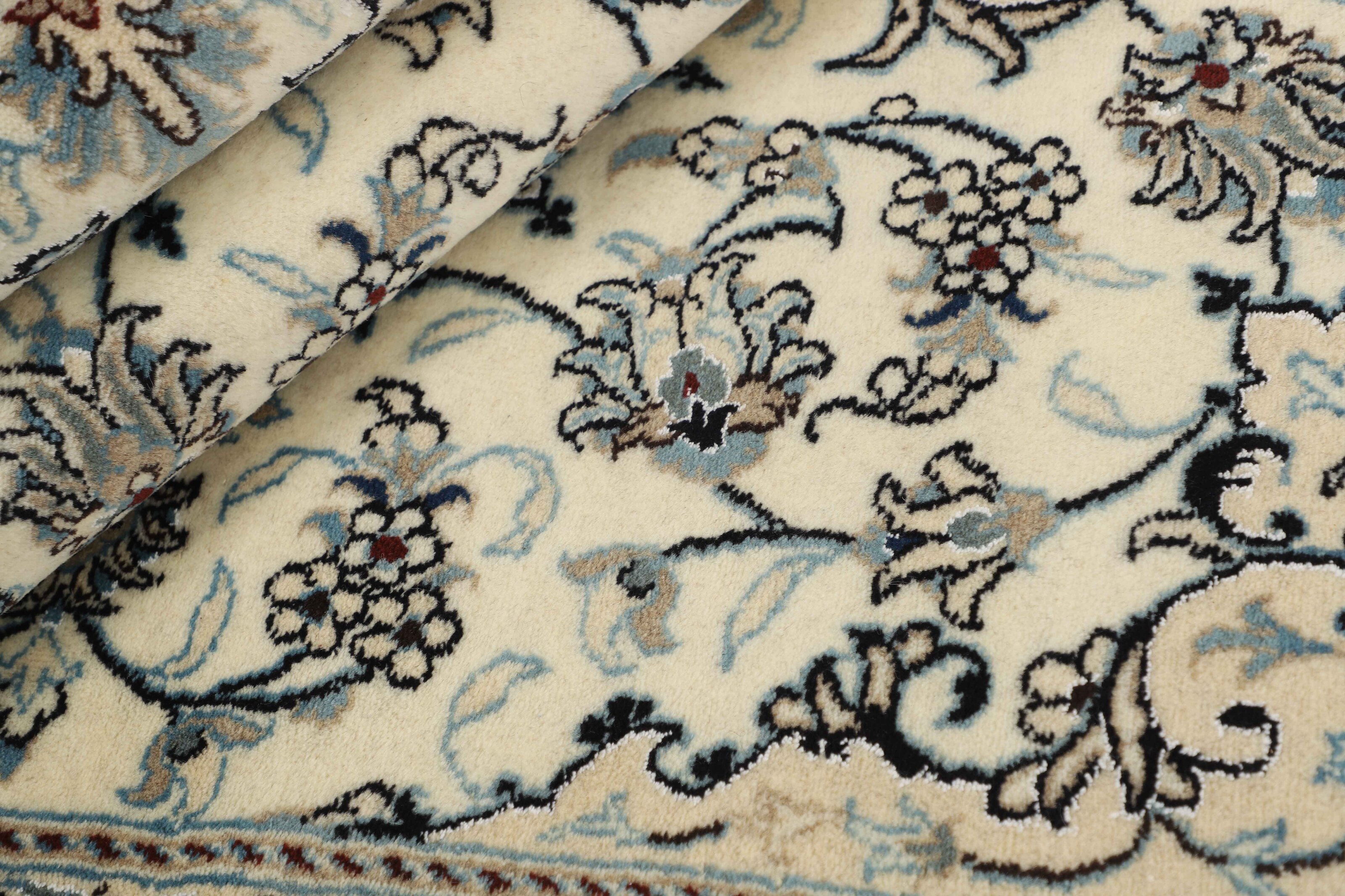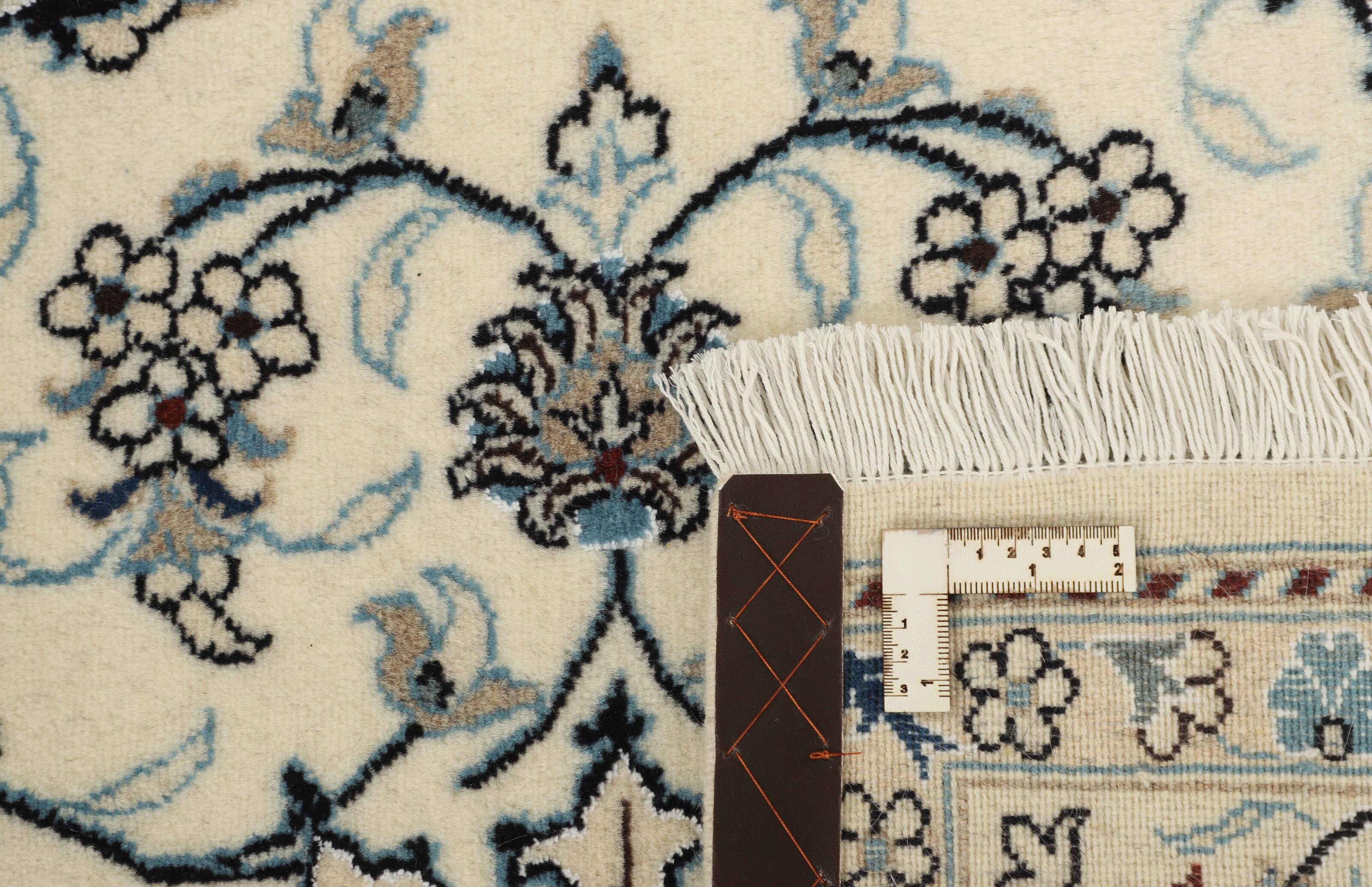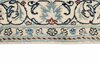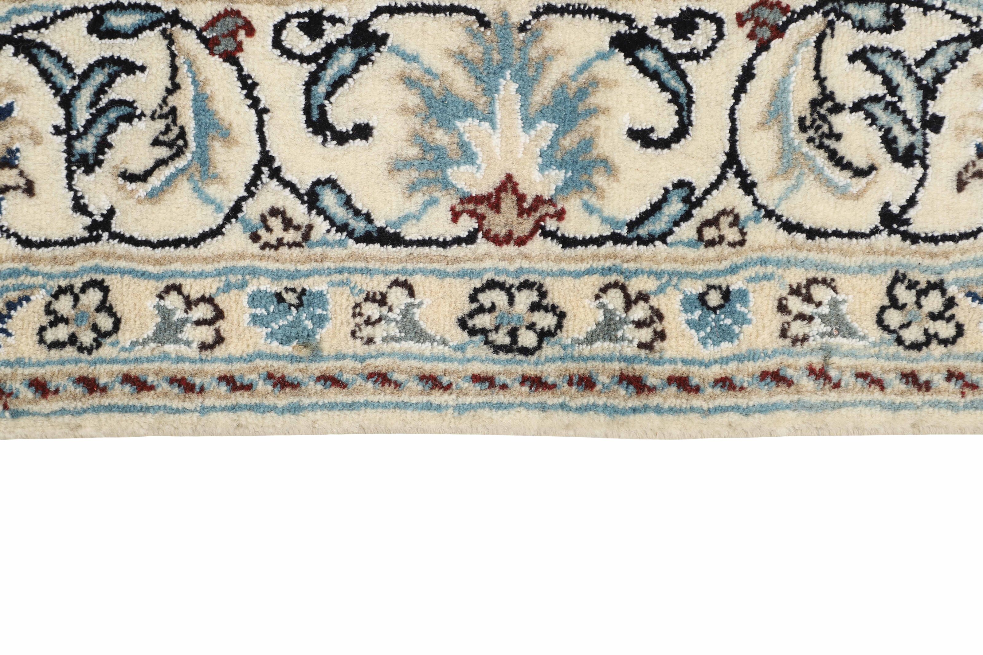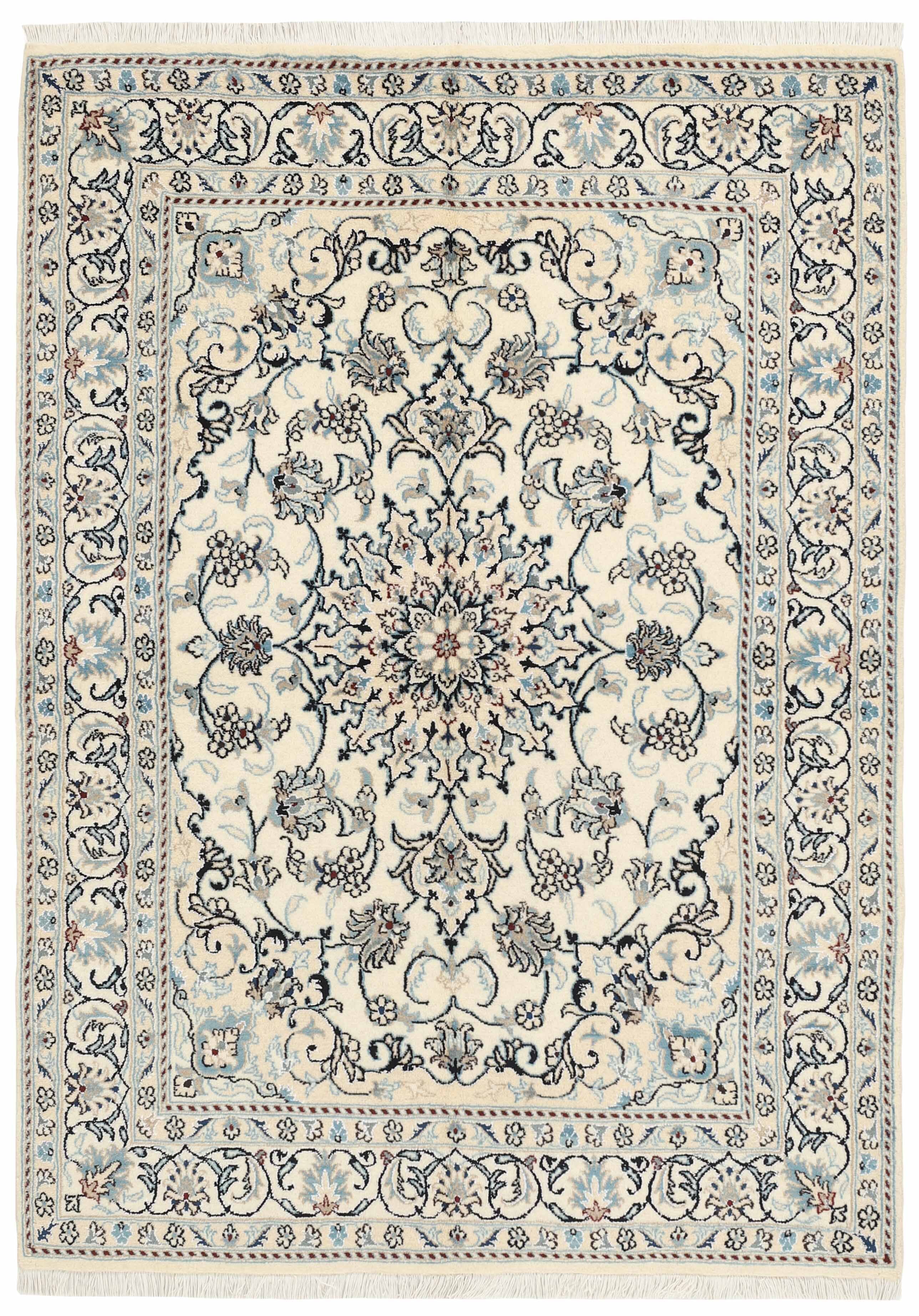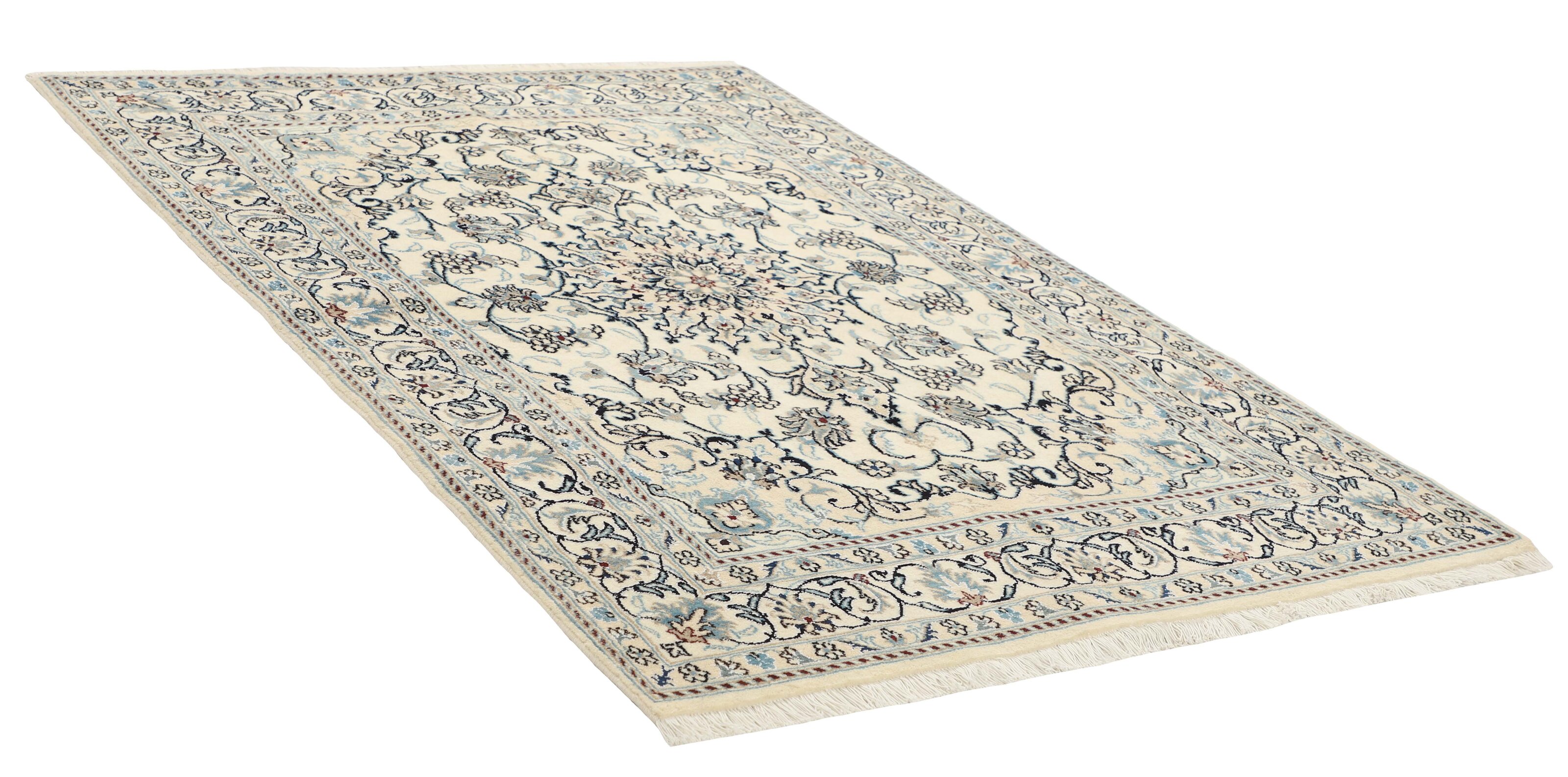Nain KashmarItem no.: 1519789 Size: 146 cm x 202 cmNain is a city of about 50.000 people, located in the Isfahan Province. It has historic significance, since it was the last stop on caravan routes before Kavir-a-Lut, one of the deserts that stretch through the centre of Iran. The Nain Mosque is one of Iran’s oldest, and is built far better than the later and more famous mosques of Isfahan. The industry in Nain was traditionally focused on the production of wool garments, but the weavers switched to rug production when the demand fell. Their new products soon became famous, as the weavers were skilled and used good quality materials. The warp and weft are cotton, with a wool pile and contours of silk. Sometimes, silk is used more in the base. The colours are refined; nuances of ivory and cream, with small areas of red, green, and blue. As with the rugs from Isfahan, the patterns of the Nain rugs are also classical. The Nain rugs are made in all sizes, including the very large of up to 60m2, and some of these have a pure silk pile. The largest Nain rug produced was 20 by 20 metres.