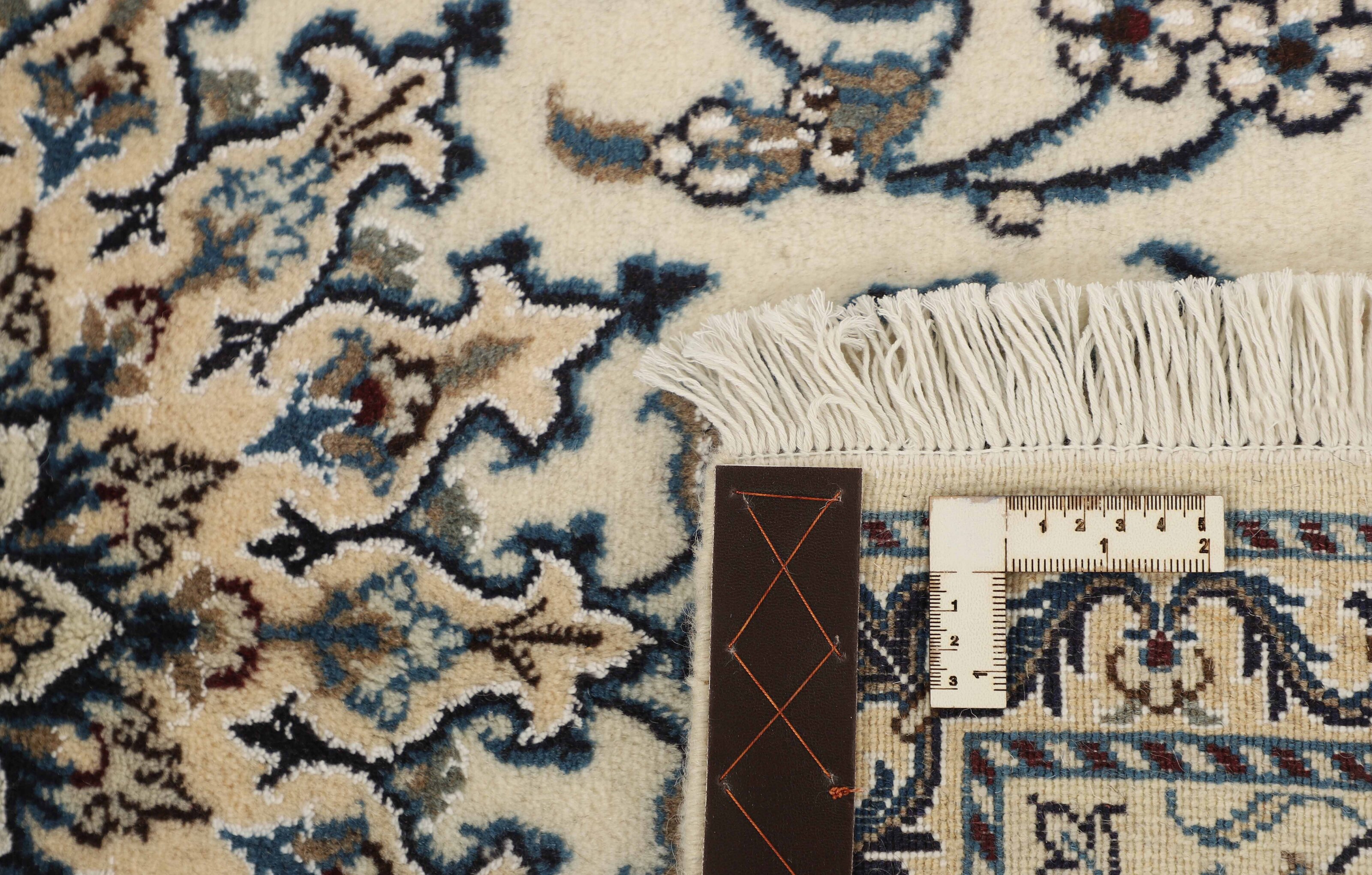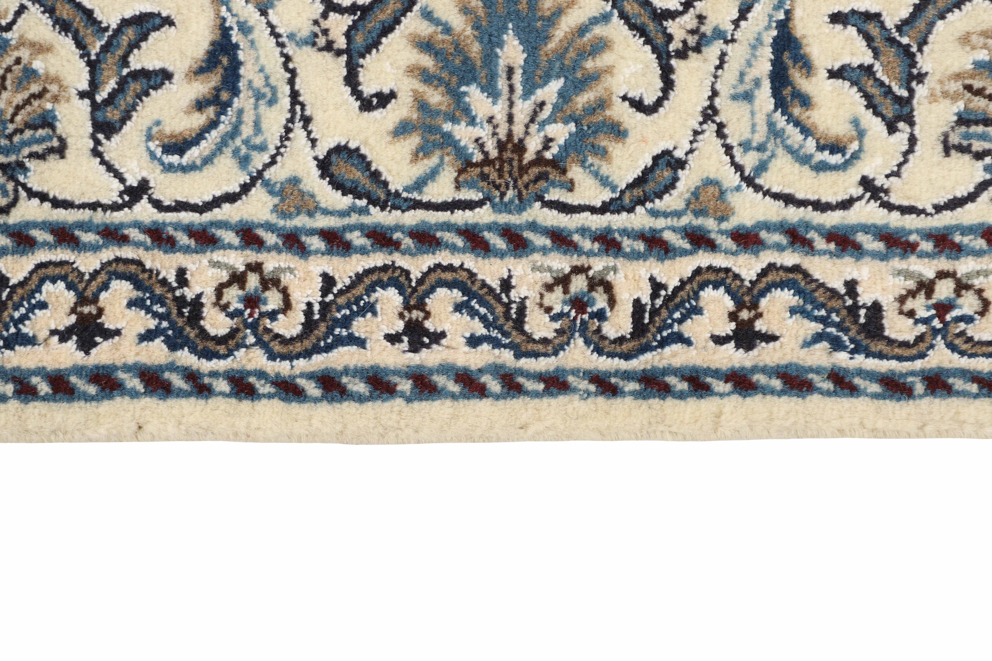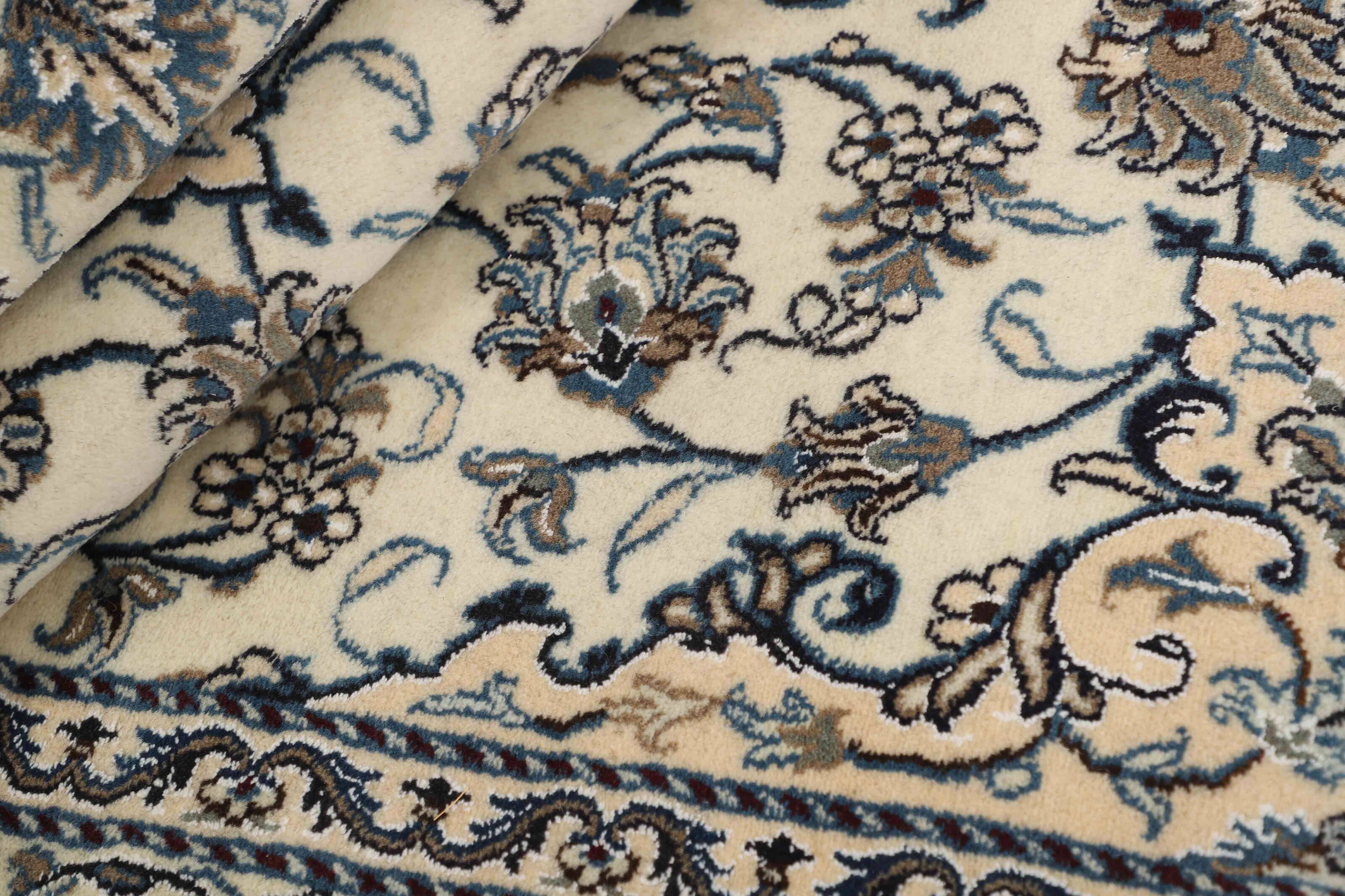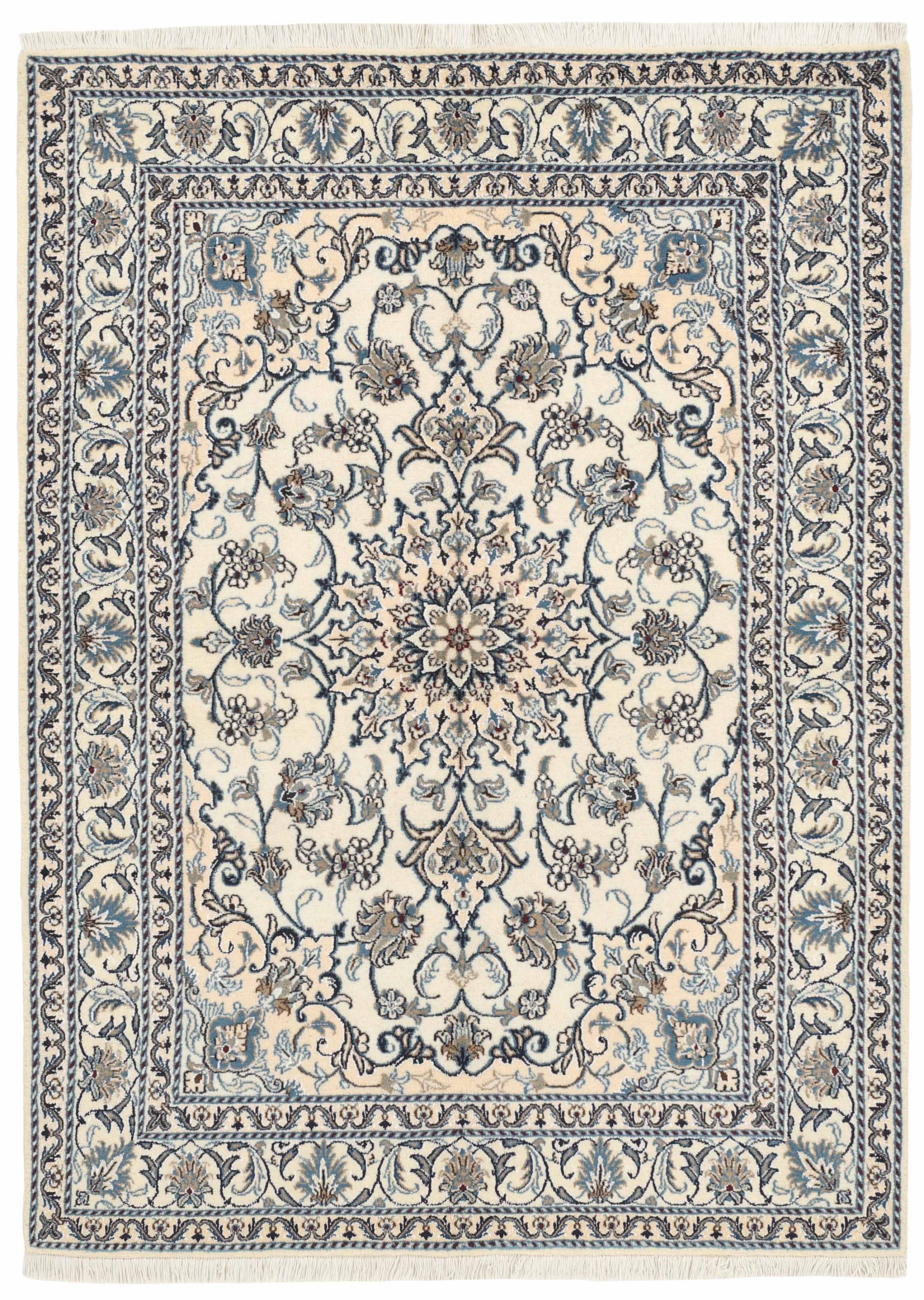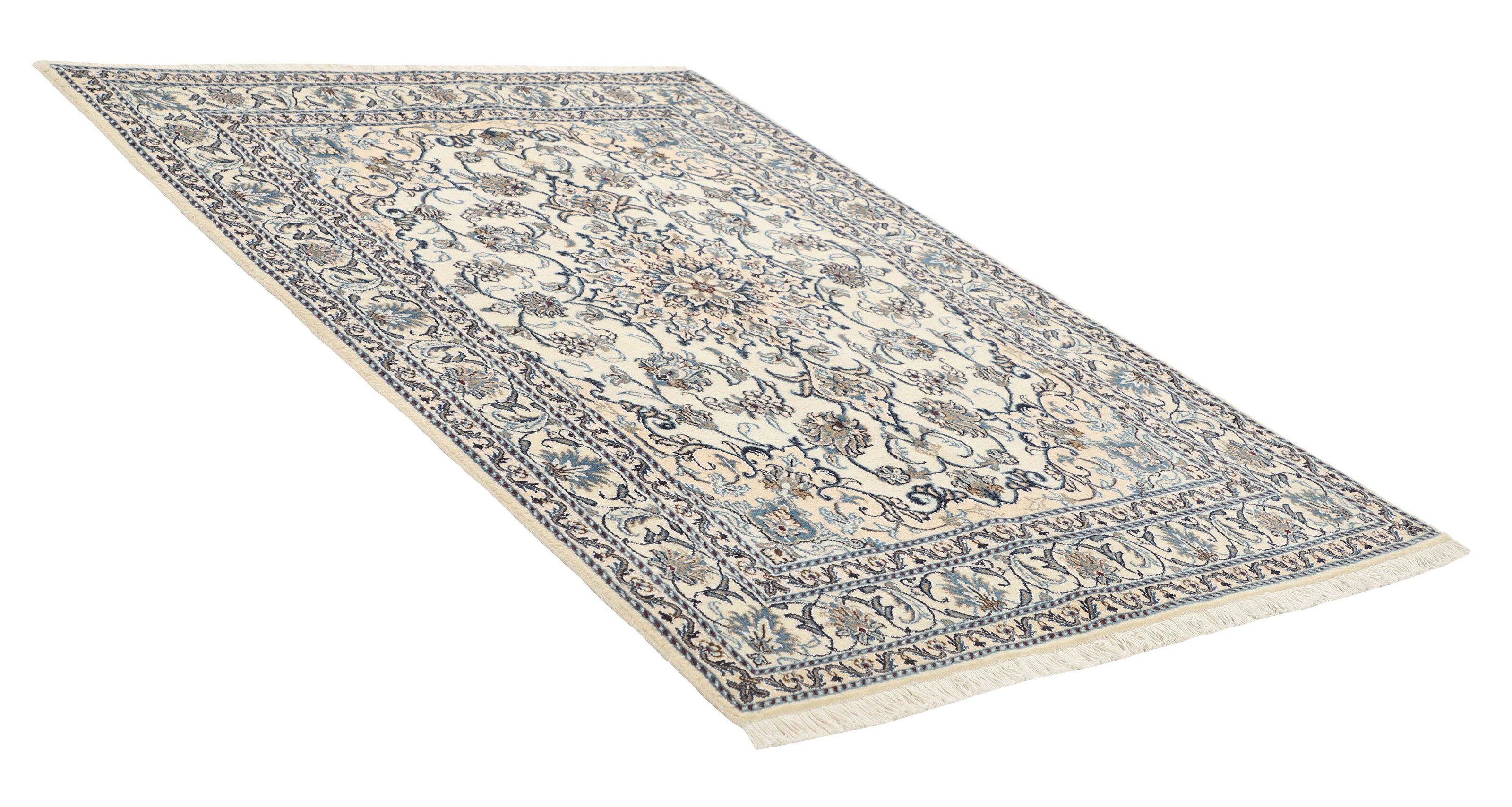 Nain KashmarItem no.: 1519790 Size: 146 cm x 203 cmNain is a city of about 50.000 people, located in the Isfahan Province. It has historic significance, since it was the last stop on caravan routes before Kavir-a-Lut, one of the deserts that stretch through the centre of Iran. The Nain Mosque is one of Iran’s oldest, and is built far better than the later and more famous mosques of Isfahan. The industry in Nain was traditionally focused on the production of wool garments, but the weavers switched to rug production when the demand fell. Their new products soon became famous, as the weavers were skilled and used good quality materials. The warp and weft are cotton, with a wool pile and contours of silk. Sometimes, silk is used more in the base. The colours are refined; nuances of ivory and cream, with small areas of red, green, and blue. As with the rugs from Isfahan, the patterns of the Nain rugs are also classical. The Nain rugs are made in all sizes, including the very large of up to 60m2, and some of these have a pure silk pile. The largest Nain rug produced was 20 by 20 metres.