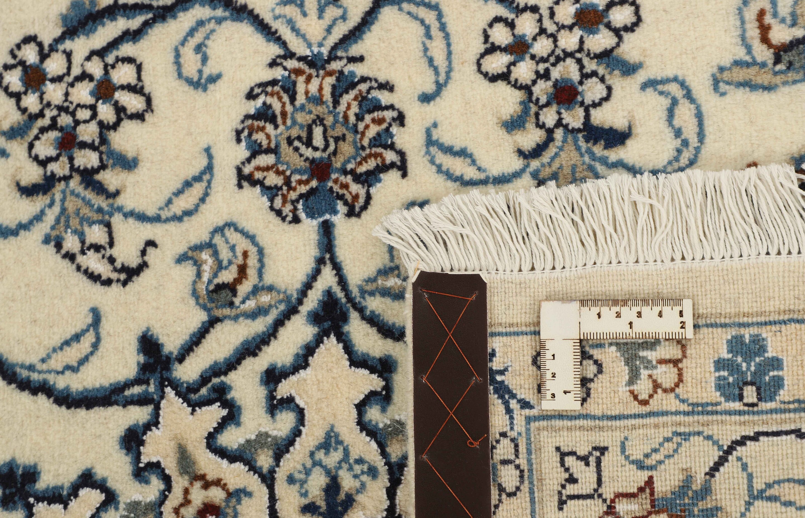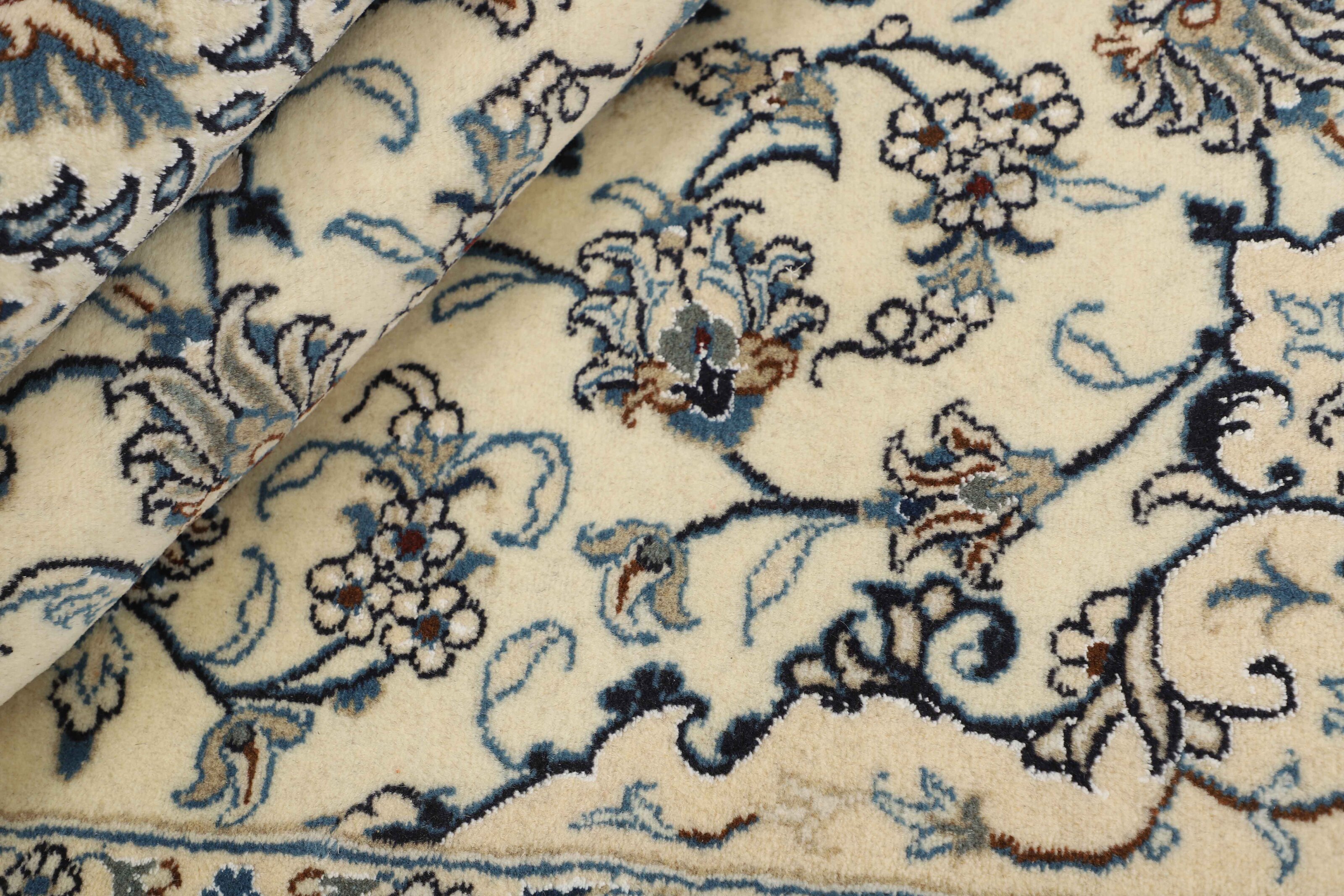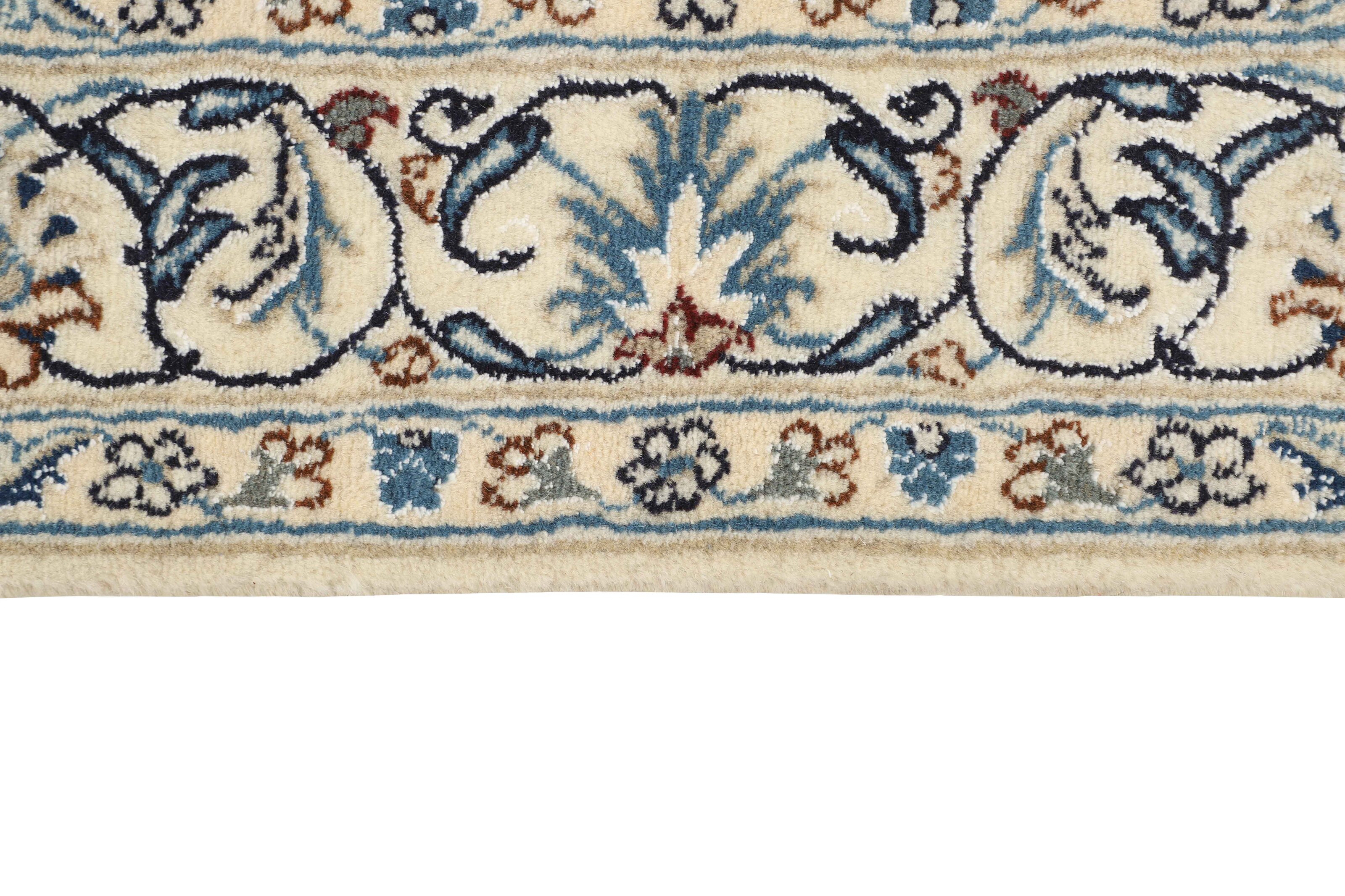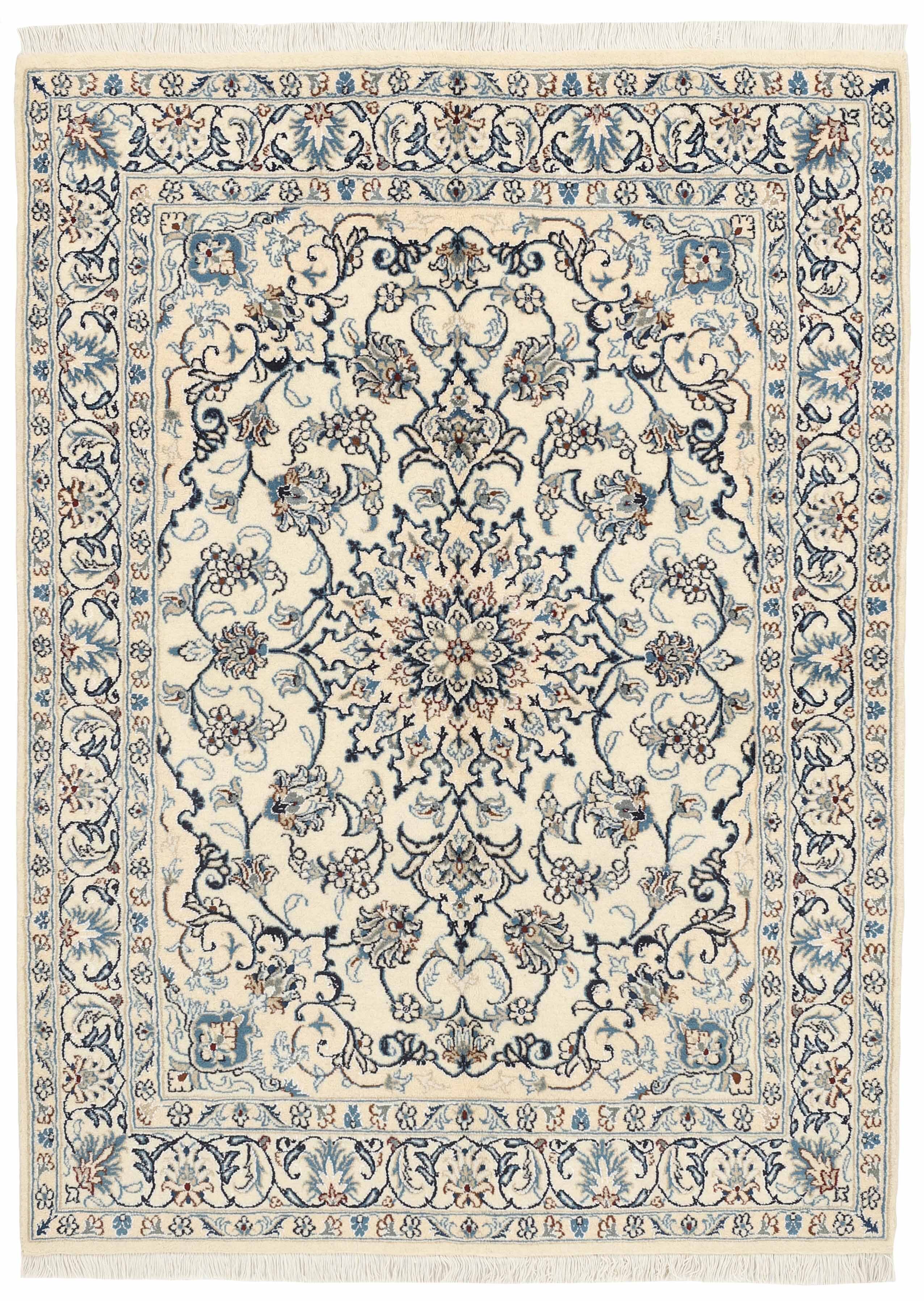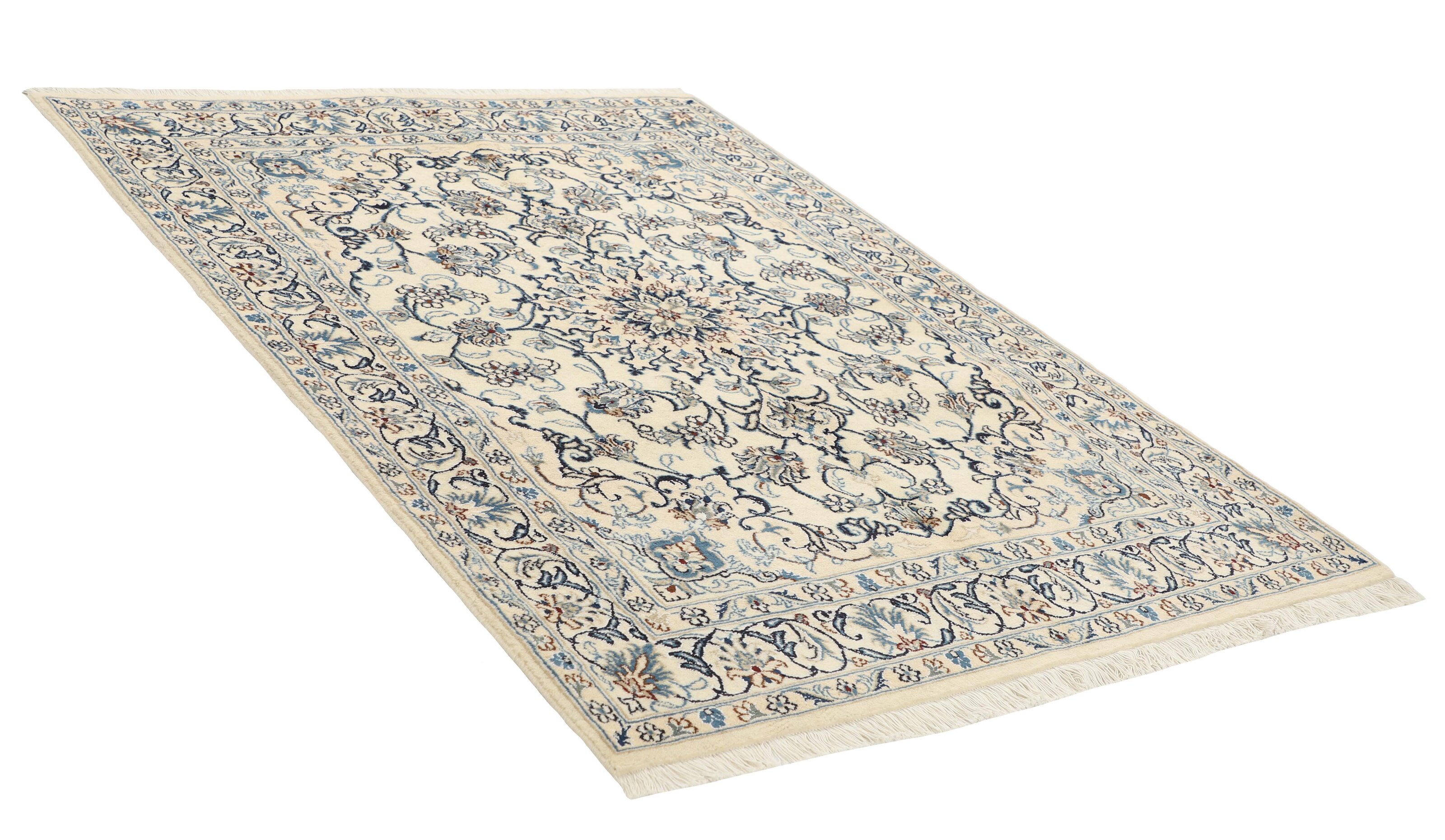 Nain KashmarItem no.: 1519791 Size: 144 cm x 197 cmNain is a city of about 50.000 people, located in the Isfahan Province. It has historic significance, since it was the last stop on caravan routes before Kavir-a-Lut, one of the deserts that stretch through the centre of Iran. The Nain Mosque is one of Iran’s oldest, and is built far better than the later and more famous mosques of Isfahan. The industry in Nain was traditionally focused on the production of wool garments, but the weavers switched to rug production when the demand fell. Their new products soon became famous, as the weavers were skilled and used good quality materials. The warp and weft are cotton, with a wool pile and contours of silk. Sometimes, silk is used more in the base. The colours are refined; nuances of ivory and cream, with small areas of red, green, and blue. As with the rugs from Isfahan, the patterns of the Nain rugs are also classical. The Nain rugs are made in all sizes, including the very large of up to 60m2, and some of these have a pure silk pile. The largest Nain rug produced was 20 by 20 metres.