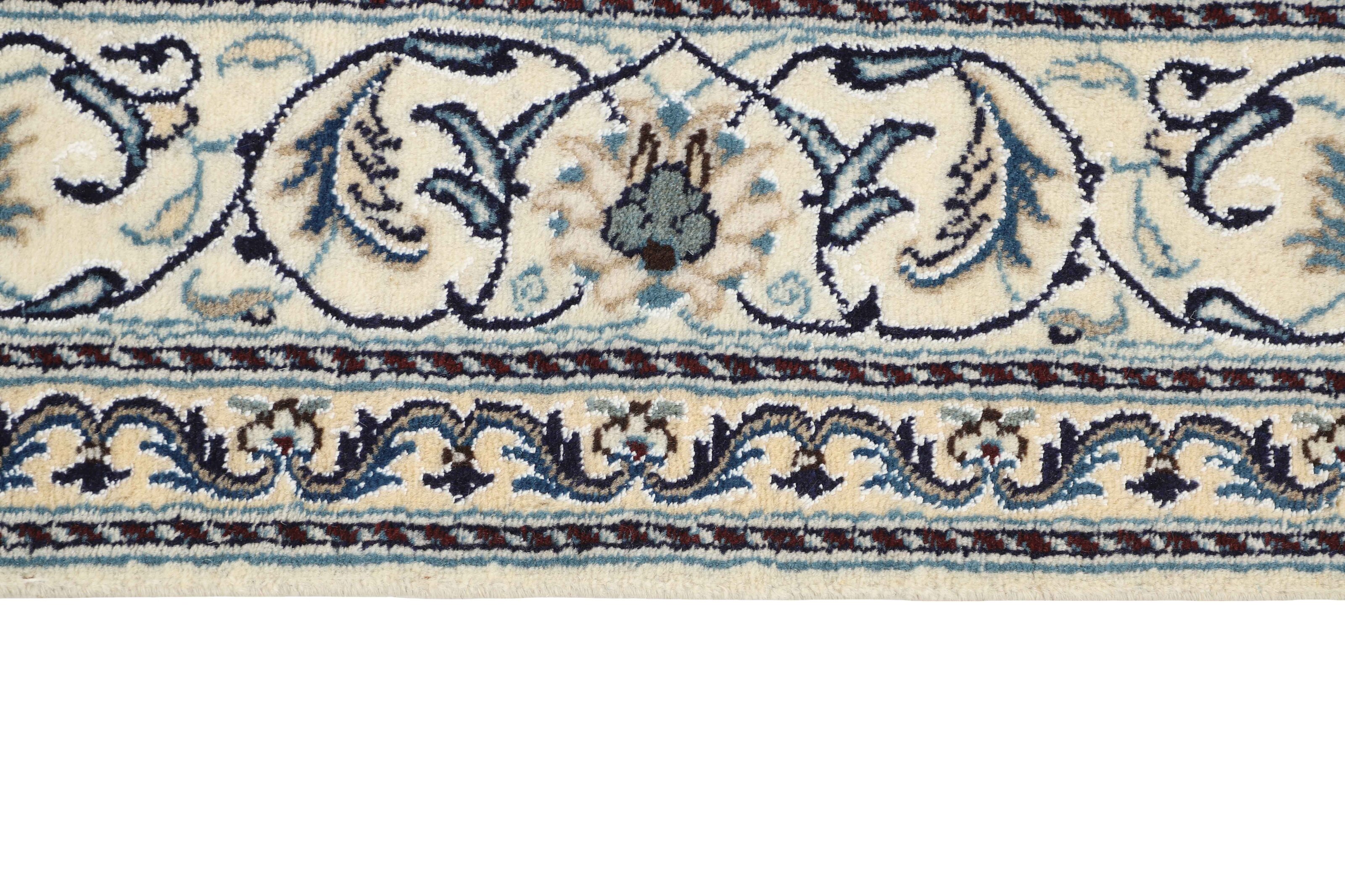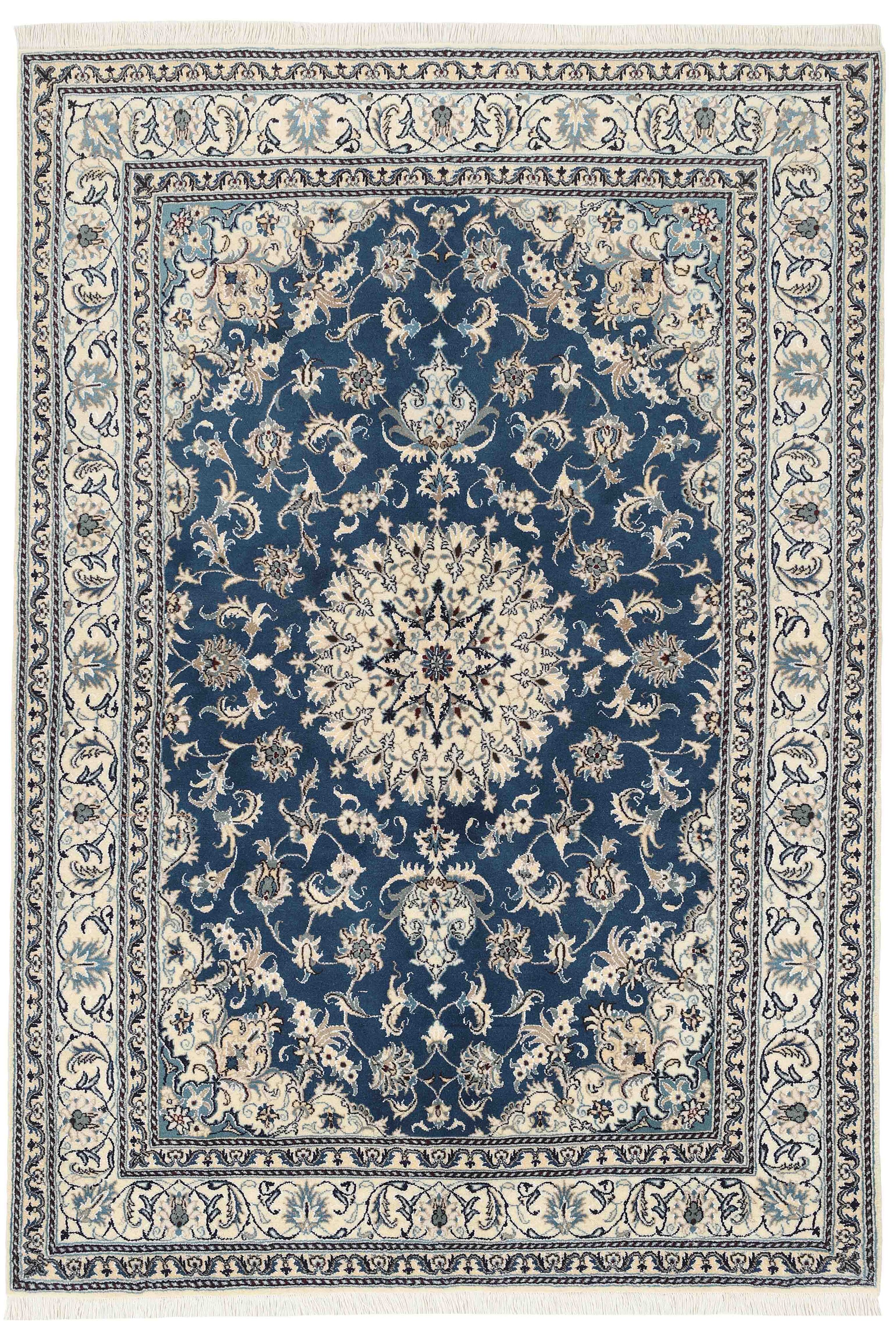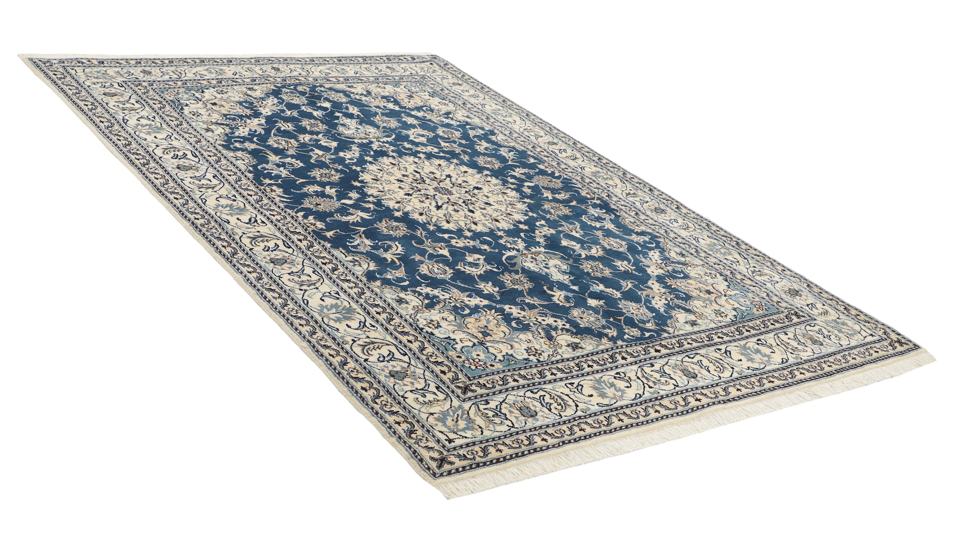 Nain KashmarItem no.: 1519792 Size: 162 cm x 242 cmNain is a city of about 50.000 people, located in the Isfahan Province. It has historic significance, since it was the last stop on caravan routes before Kavir-a-Lut, one of the deserts that stretch through the centre of Iran. The Nain Mosque is one of Iran’s oldest, and is built far better than the later and more famous mosques of Isfahan. The industry in Nain was traditionally focused on the production of wool garments, but the weavers switched to rug production when the demand fell. Their new products soon became famous, as the weavers were skilled and used good quality materials. The warp and weft are cotton, with a wool pile and contours of silk. Sometimes, silk is used more in the base. The colours are refined; nuances of ivory and cream, with small areas of red, green, and blue. As with the rugs from Isfahan, the patterns of the Nain rugs are also classical. The Nain rugs are made in all sizes, including the very large of up to 60m2, and some of these have a pure silk pile. The largest Nain rug produced was 20 by 20 metres.