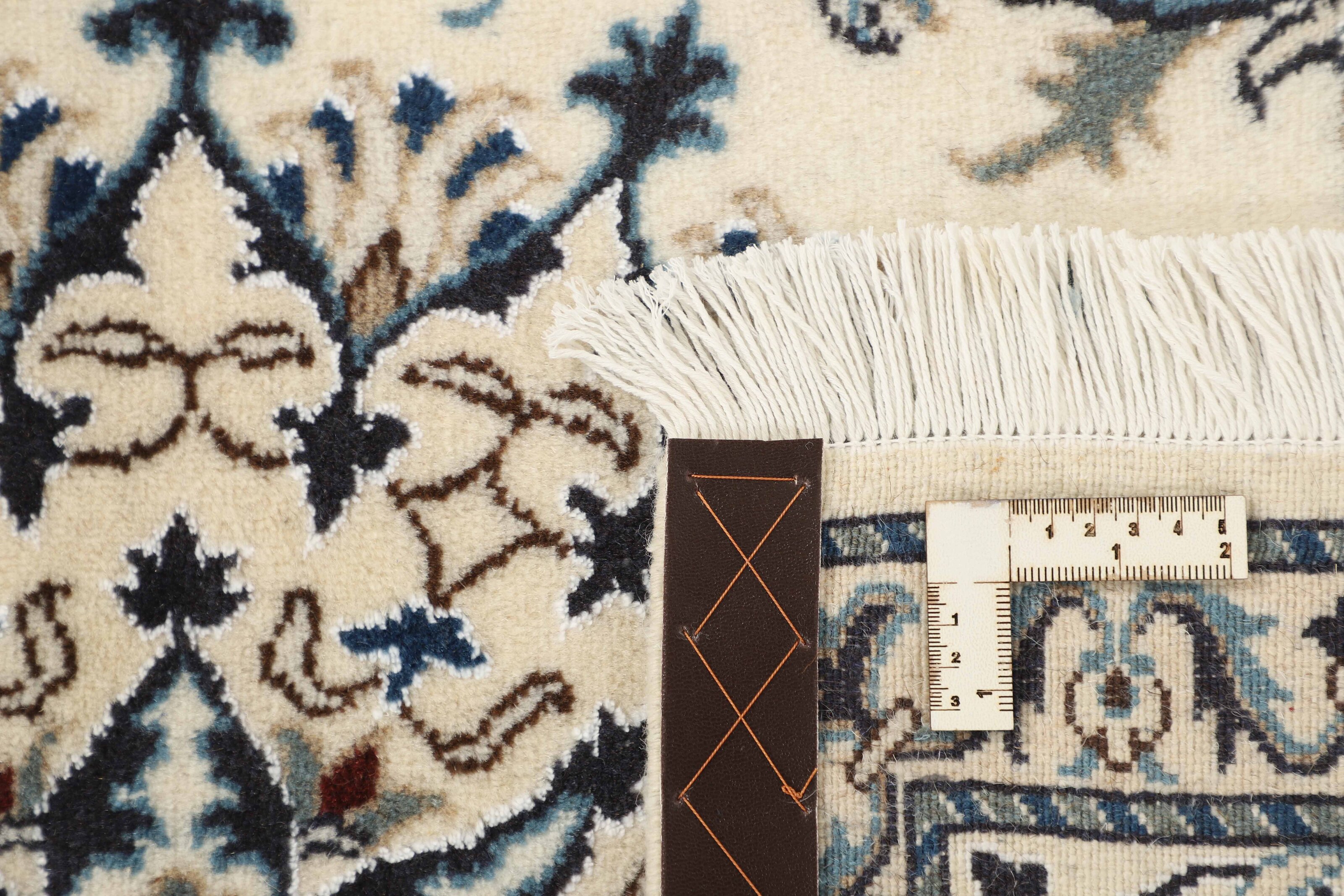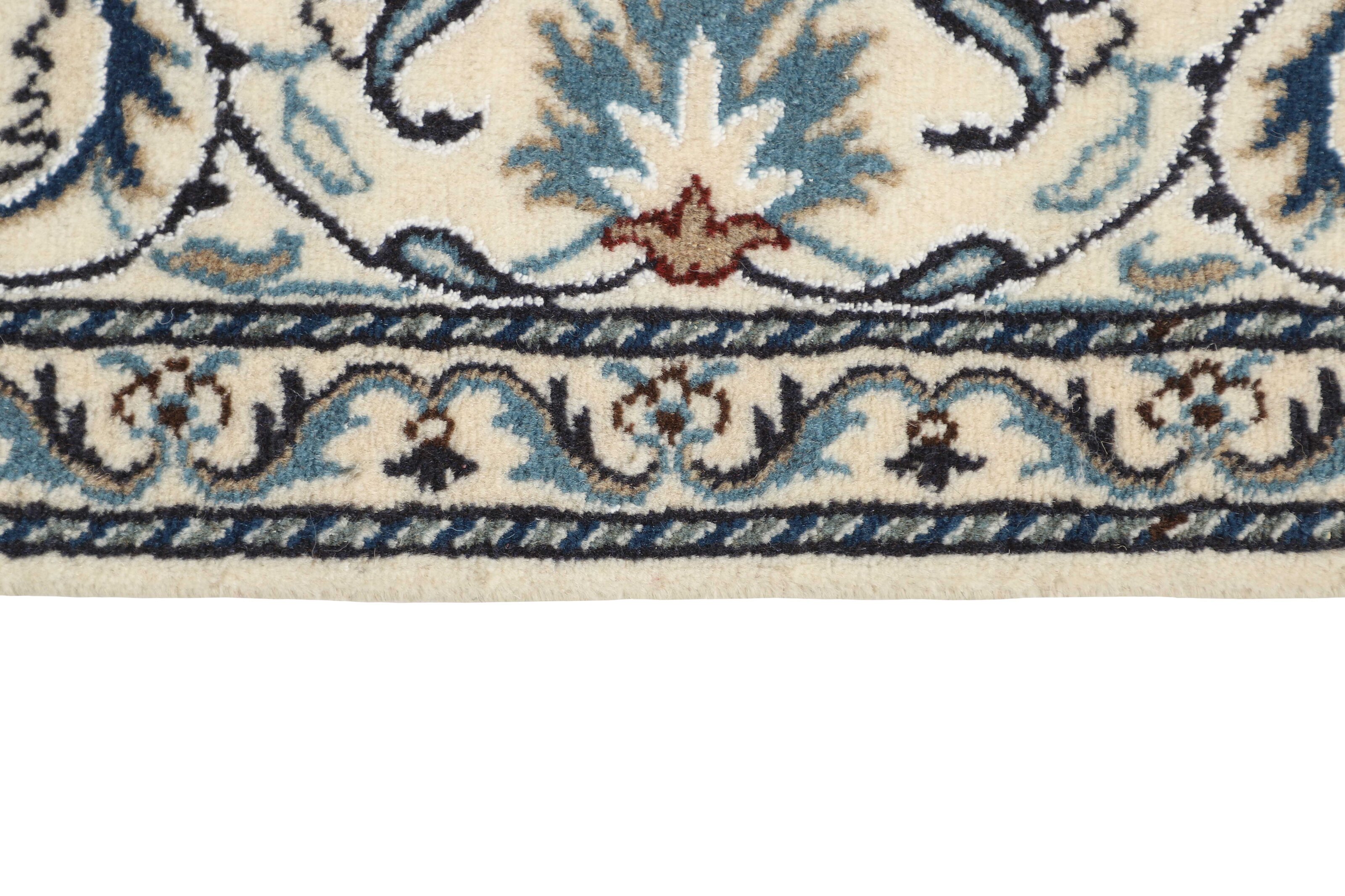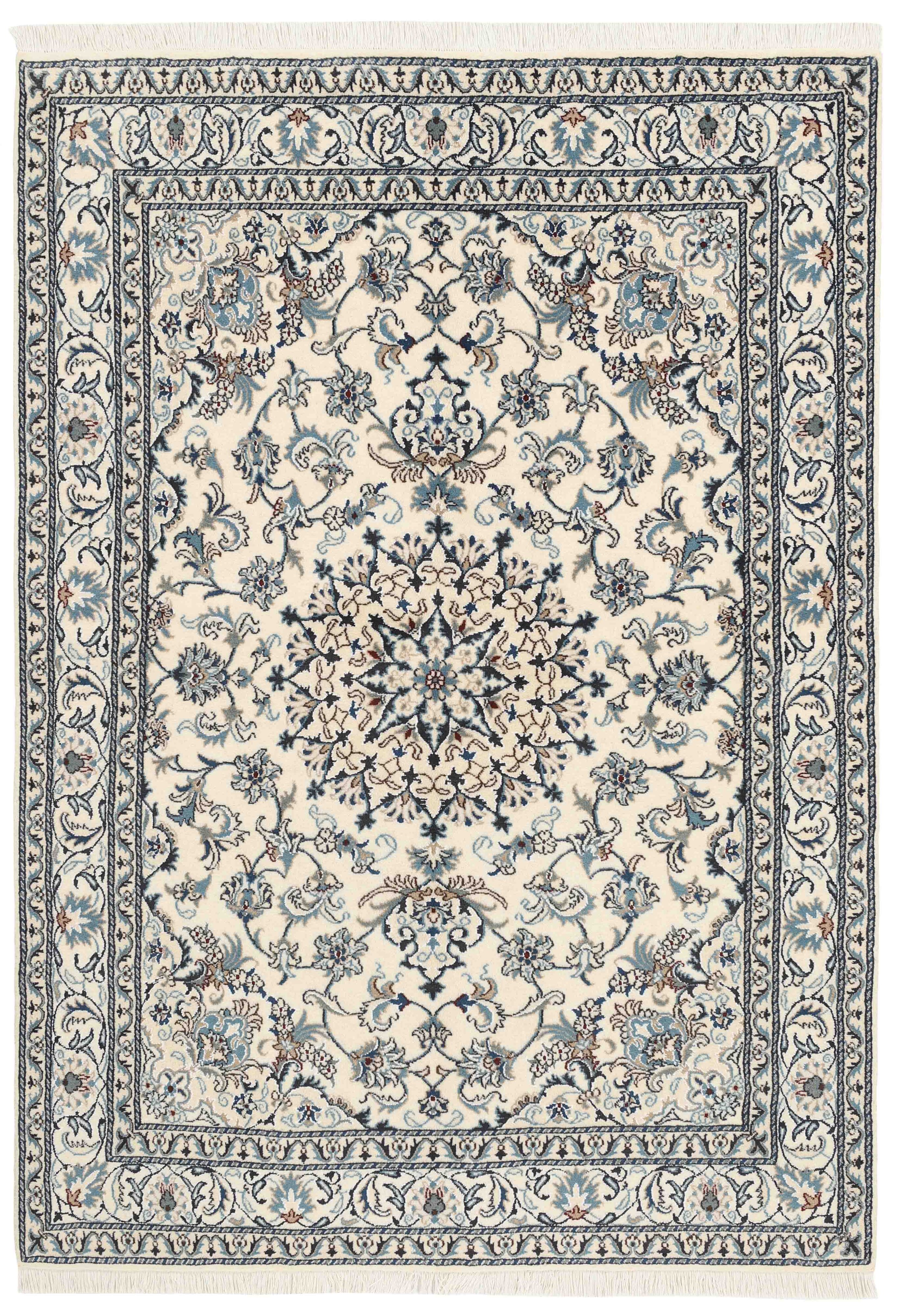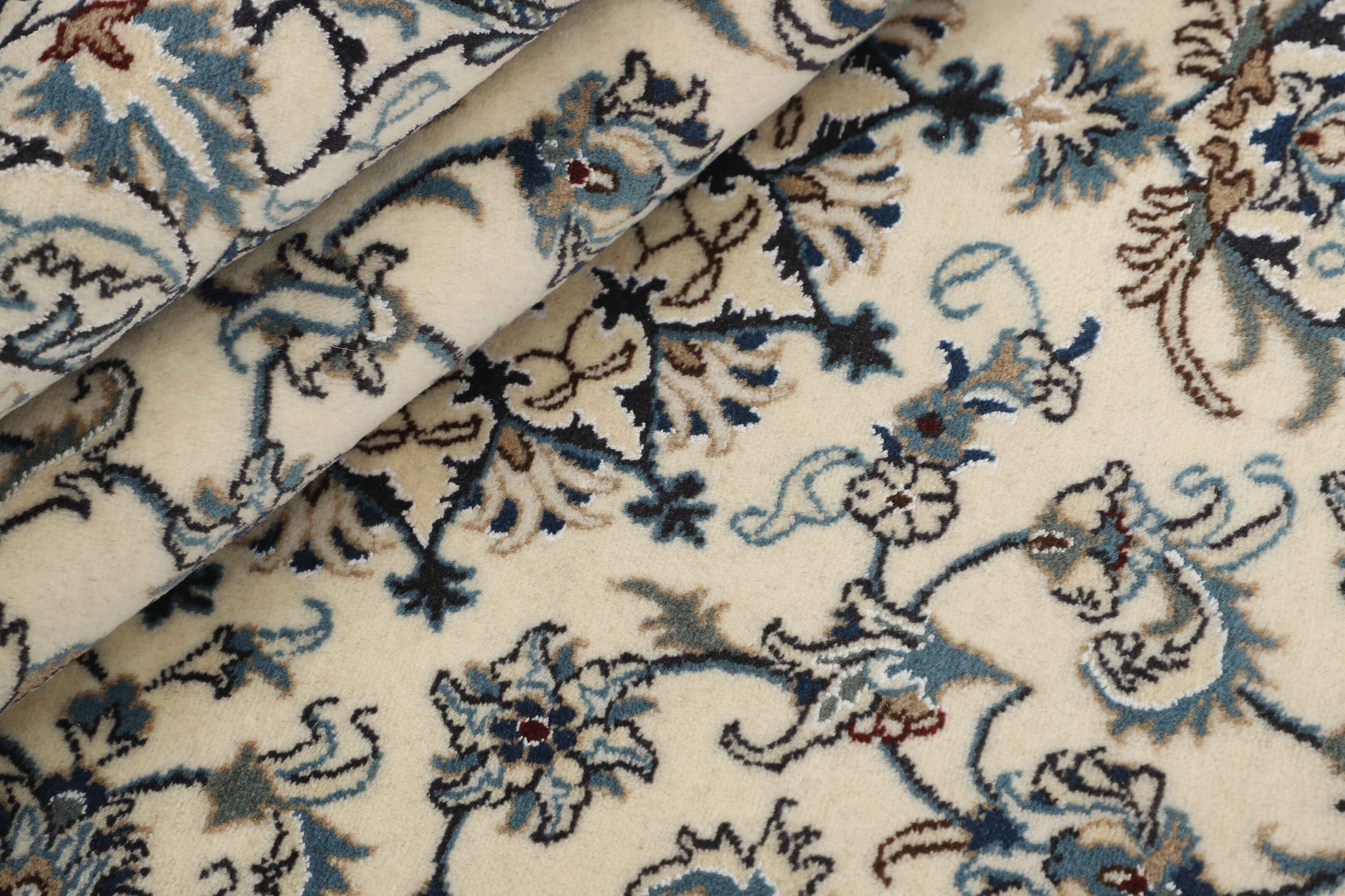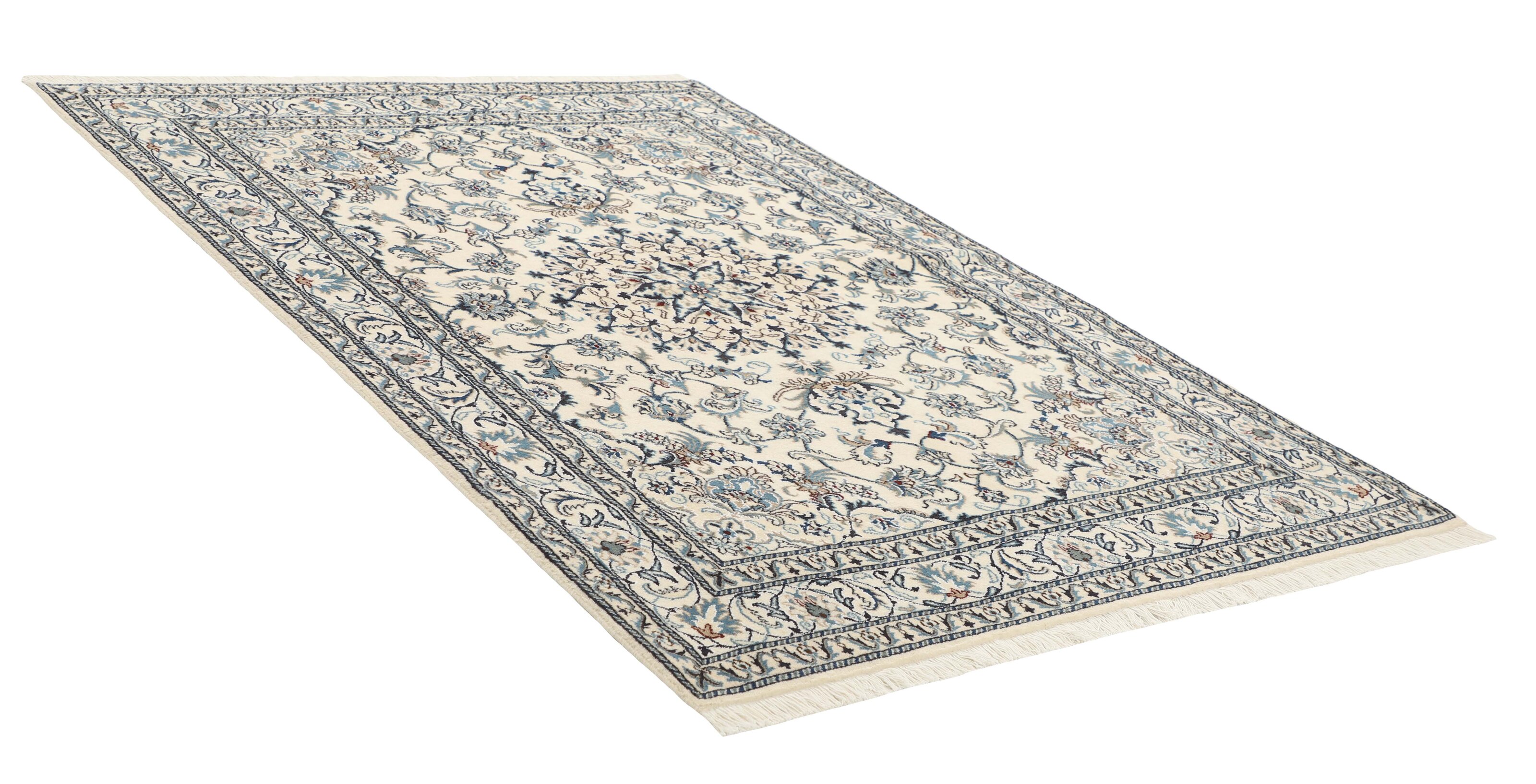 Nain KashmarItem no.: 1519794 Size: 161 cm x 229 cmNain is a city of about 50.000 people, located in the Isfahan Province. It has historic significance, since it was the last stop on caravan routes before Kavir-a-Lut, one of the deserts that stretch through the centre of Iran. The Nain Mosque is one of Iran’s oldest, and is built far better than the later and more famous mosques of Isfahan. The industry in Nain was traditionally focused on the production of wool garments, but the weavers switched to rug production when the demand fell. Their new products soon became famous, as the weavers were skilled and used good quality materials. The warp and weft are cotton, with a wool pile and contours of silk. Sometimes, silk is used more in the base. The colours are refined; nuances of ivory and cream, with small areas of red, green, and blue. As with the rugs from Isfahan, the patterns of the Nain rugs are also classical. The Nain rugs are made in all sizes, including the very large of up to 60m2, and some of these have a pure silk pile. The largest Nain rug produced was 20 by 20 metres.
