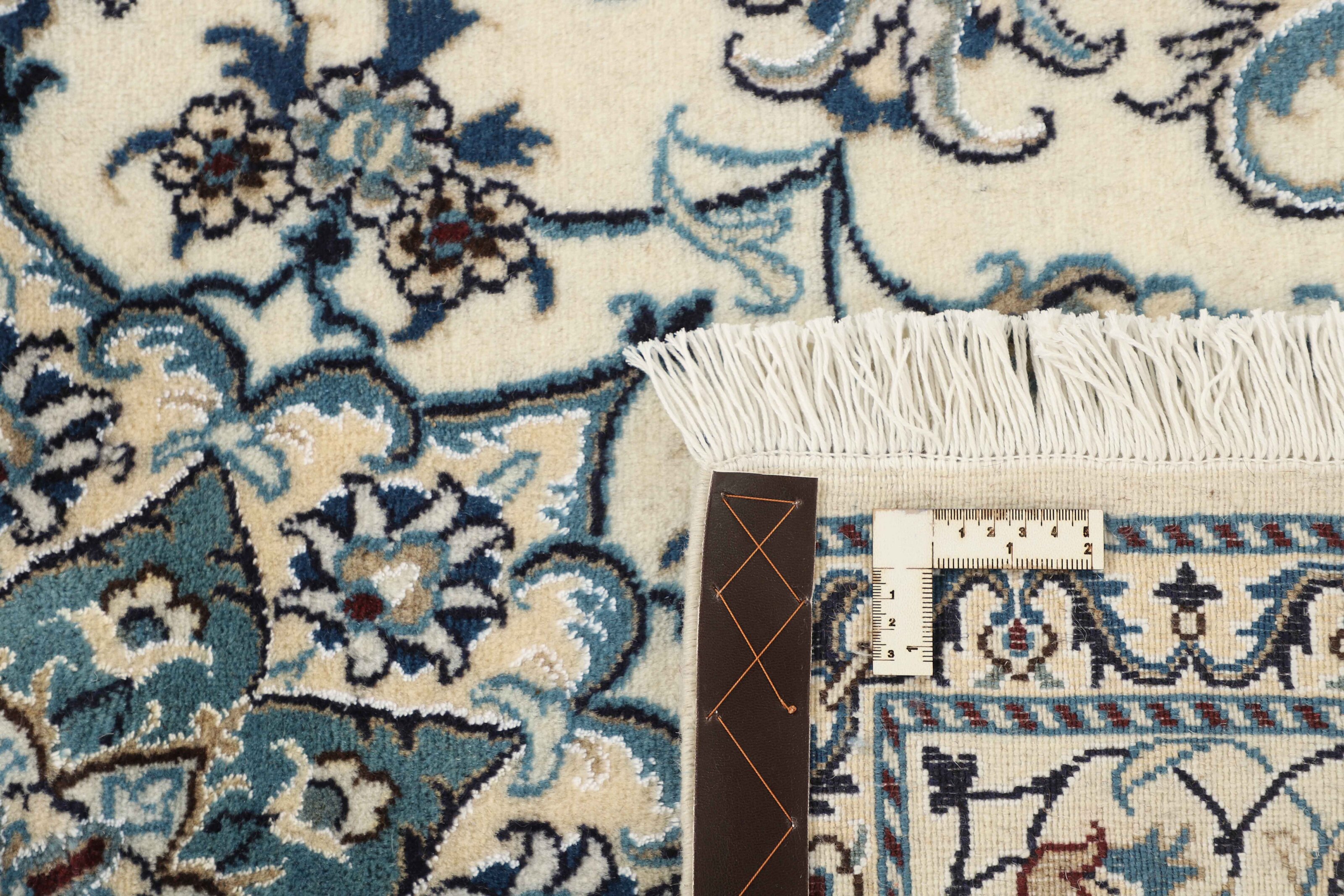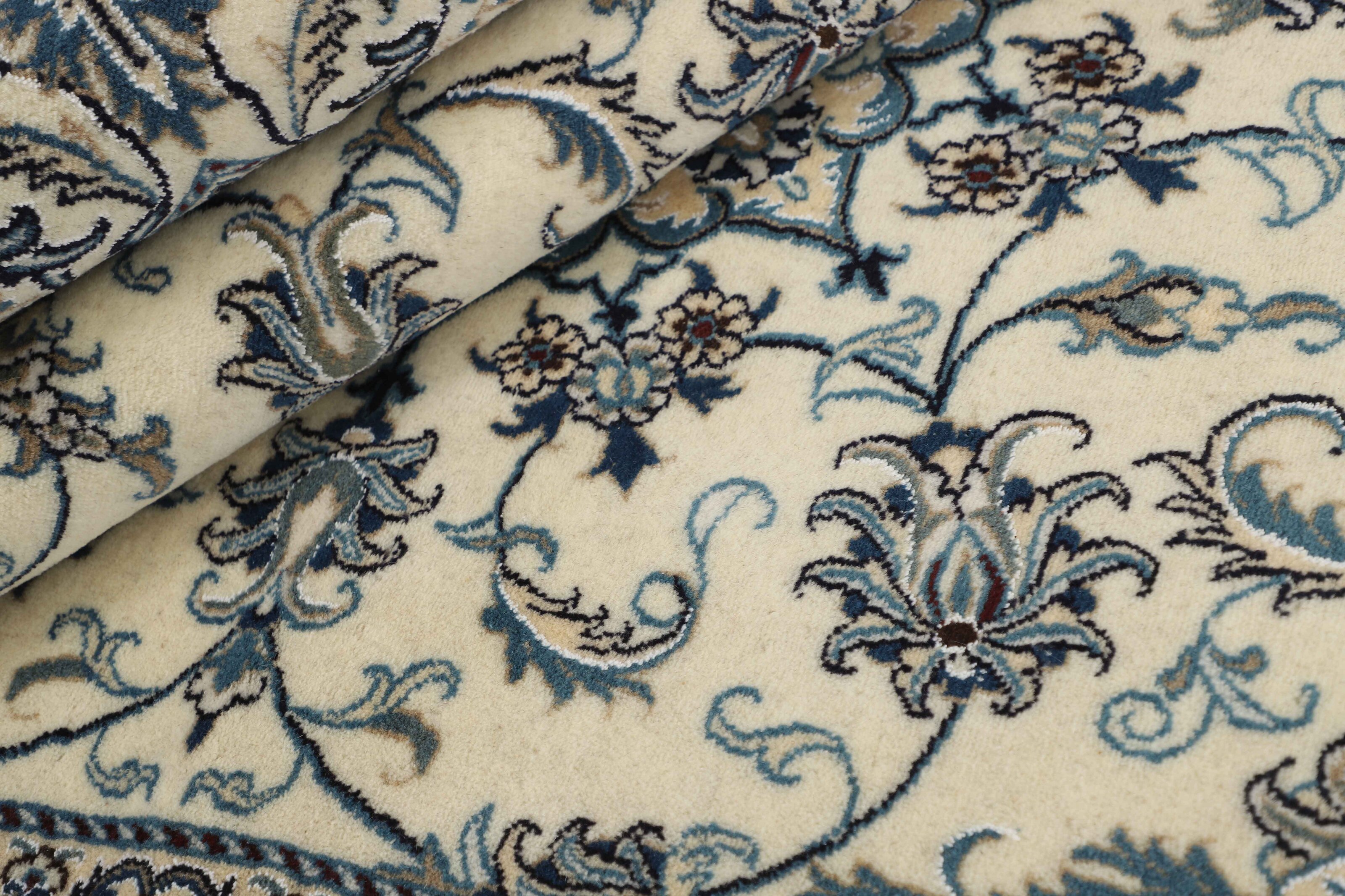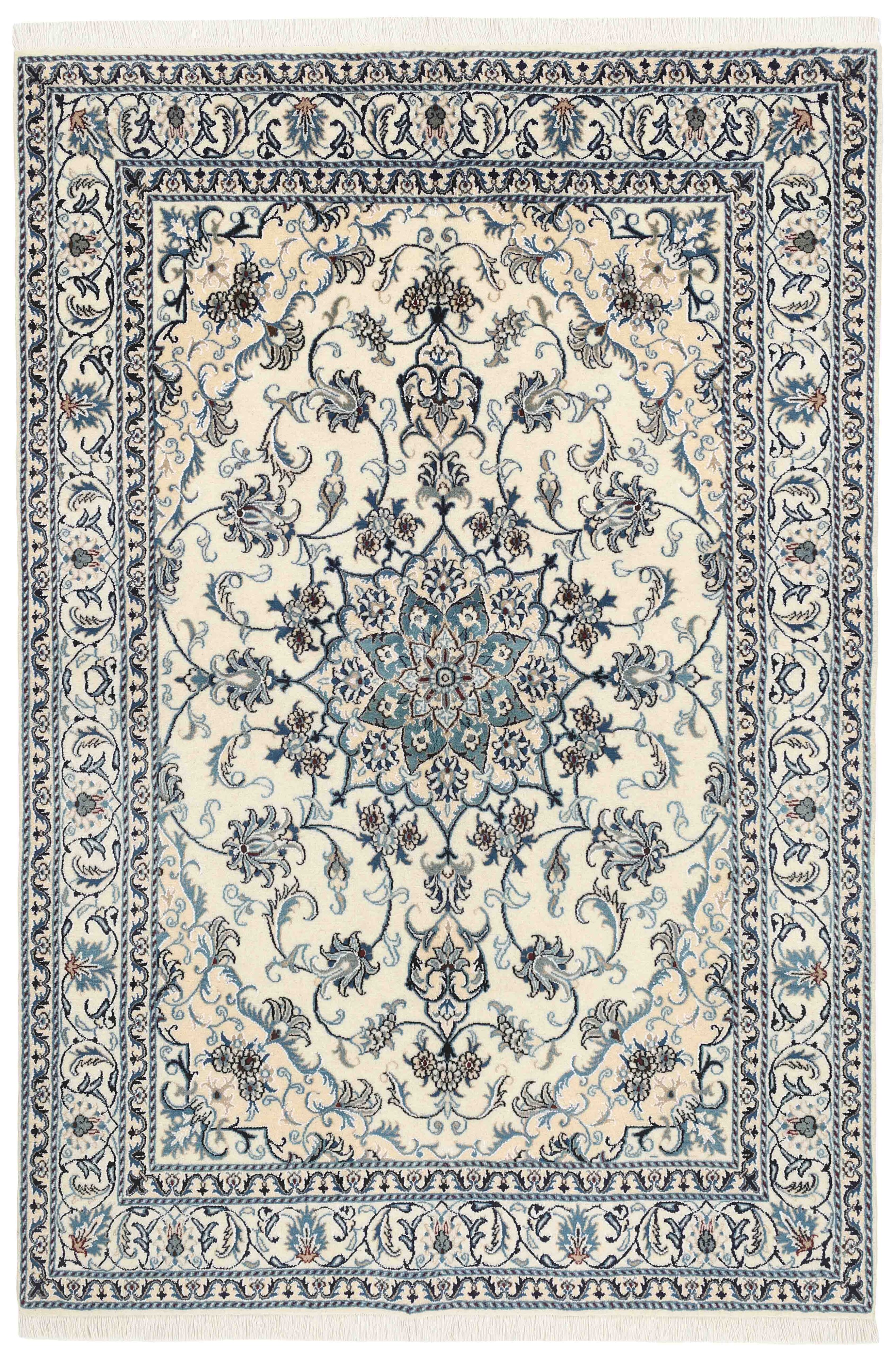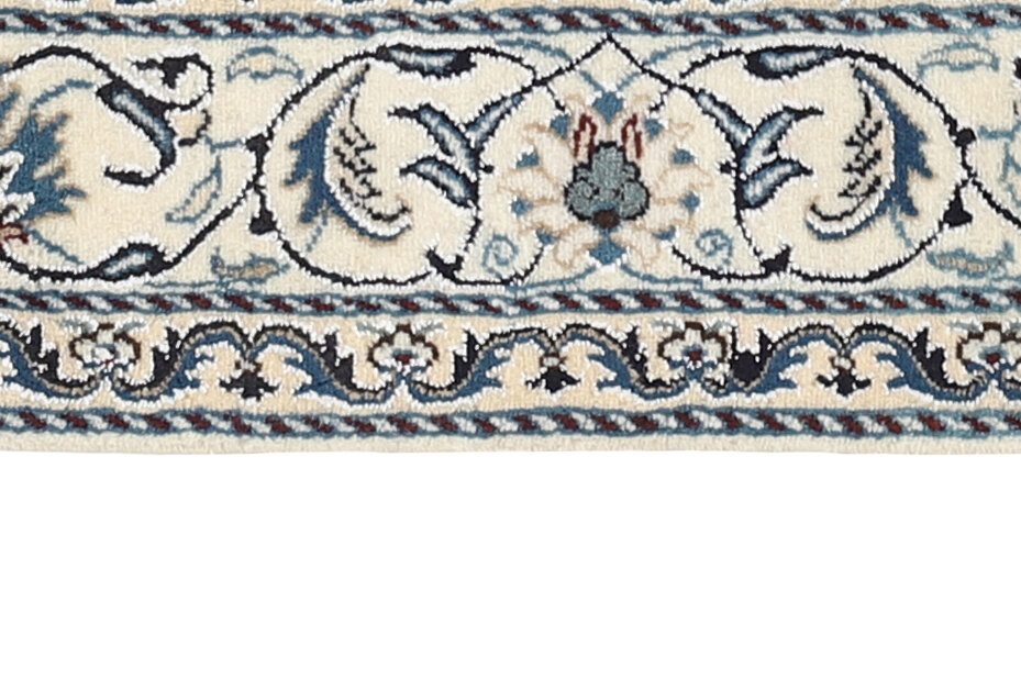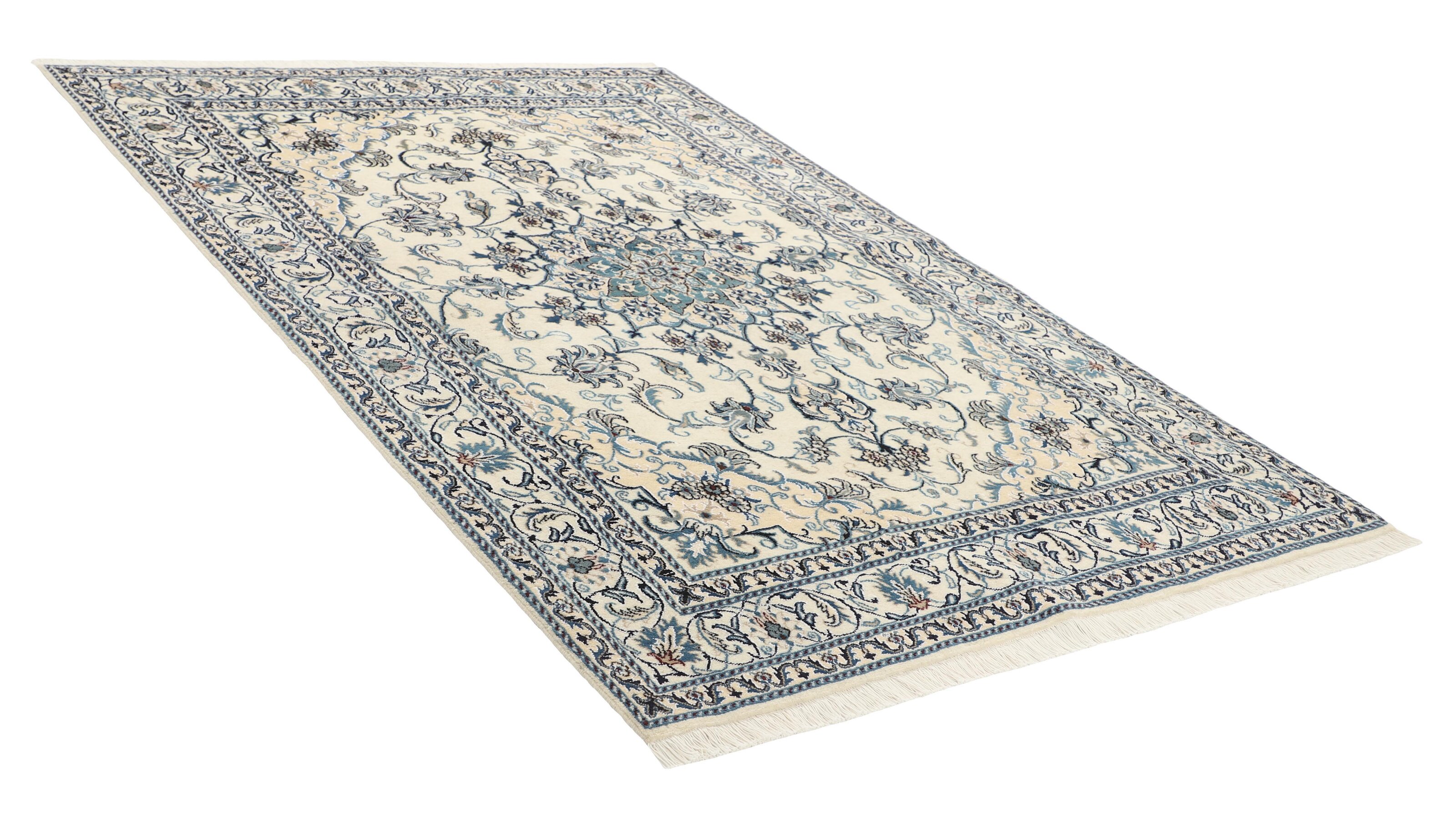 Nain KashmarItem no.: 1519795 Size: 163 cm x 242 cmNain is a city of about 50.000 people, located in the Isfahan Province. It has historic significance, since it was the last stop on caravan routes before Kavir-a-Lut, one of the deserts that stretch through the centre of Iran. The Nain Mosque is one of Iran’s oldest, and is built far better than the later and more famous mosques of Isfahan. The industry in Nain was traditionally focused on the production of wool garments, but the weavers switched to rug production when the demand fell. Their new products soon became famous, as the weavers were skilled and used good quality materials. The warp and weft are cotton, with a wool pile and contours of silk. Sometimes, silk is used more in the base. The colours are refined; nuances of ivory and cream, with small areas of red, green, and blue. As with the rugs from Isfahan, the patterns of the Nain rugs are also classical. The Nain rugs are made in all sizes, including the very large of up to 60m2, and some of these have a pure silk pile. The largest Nain rug produced was 20 by 20 metres.