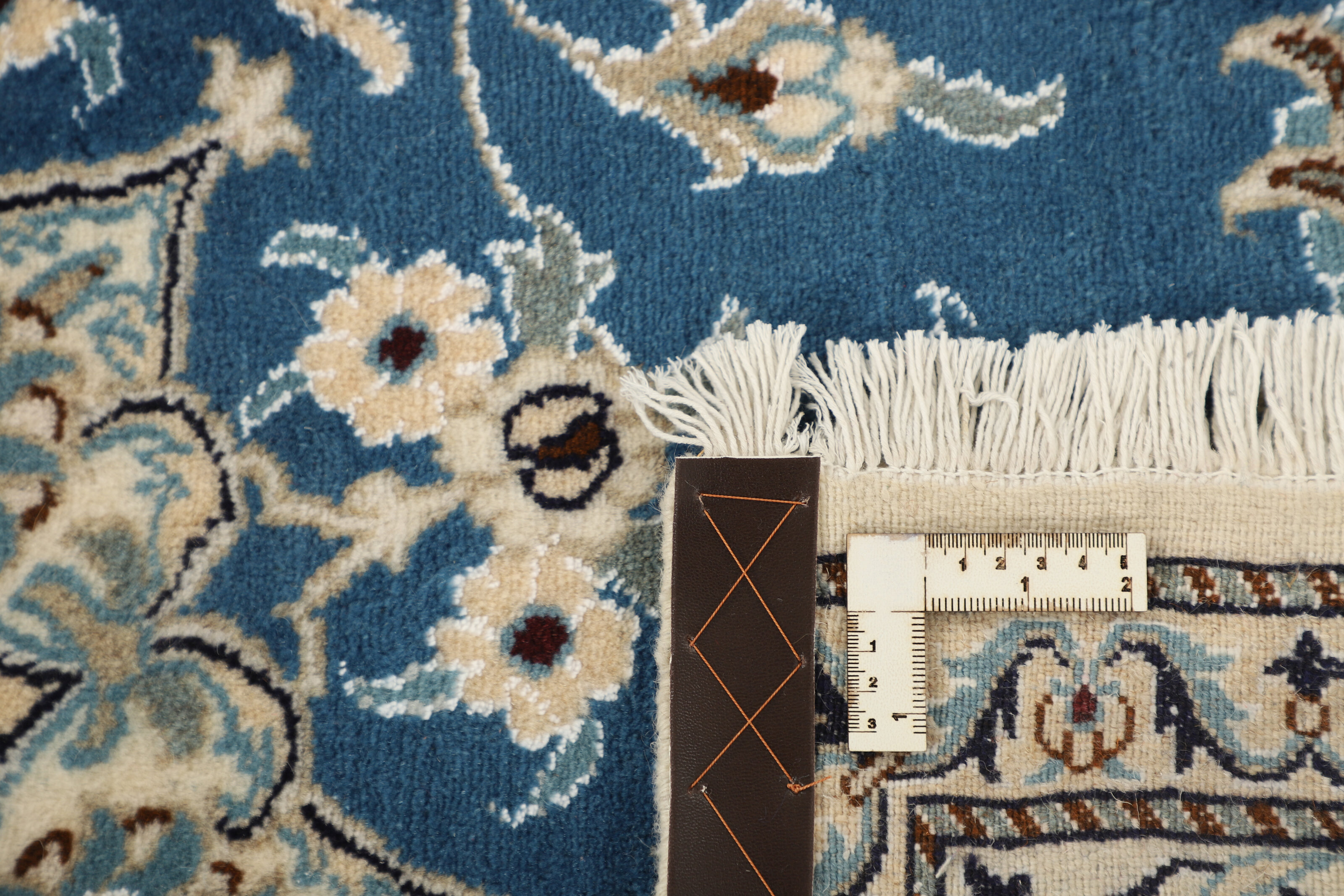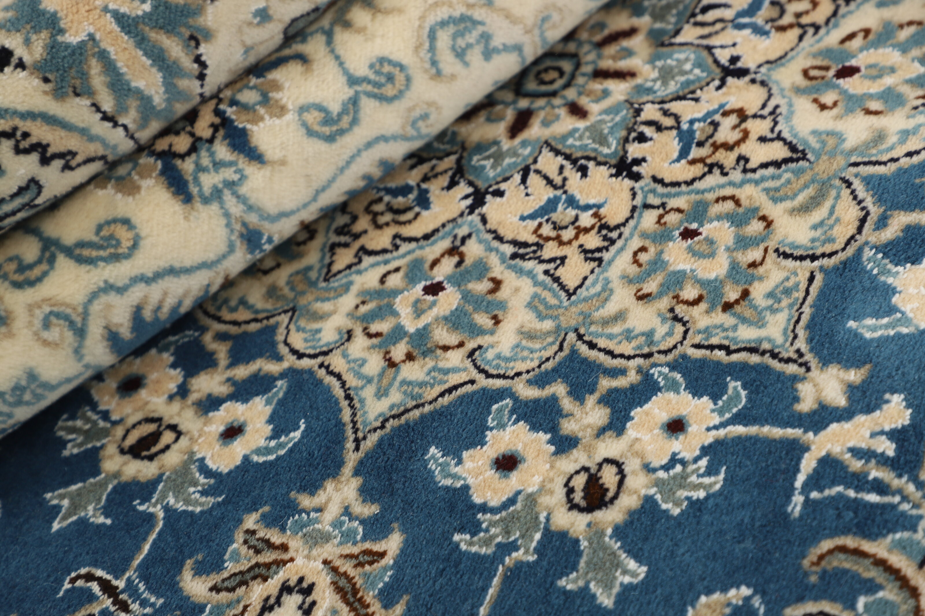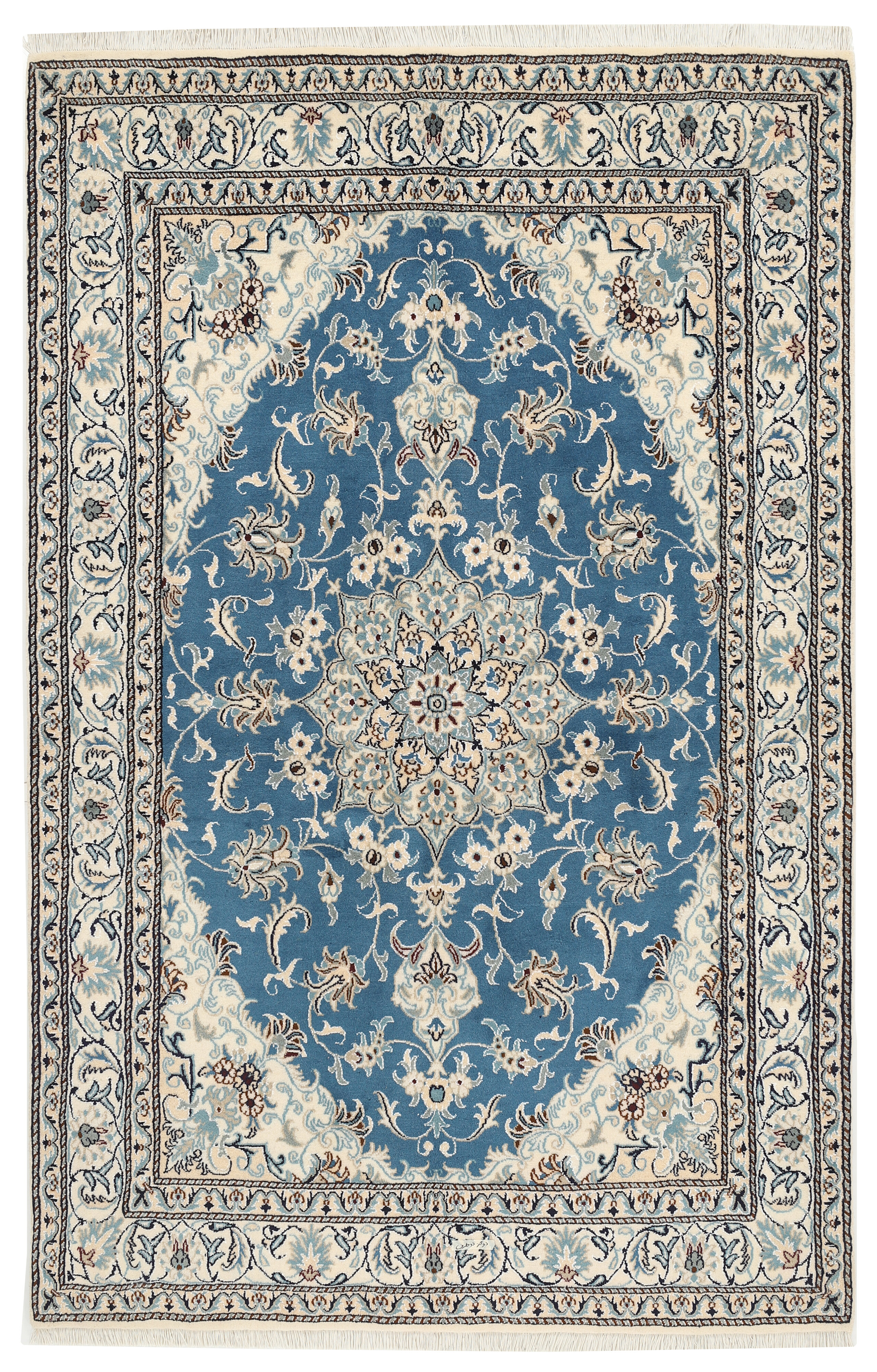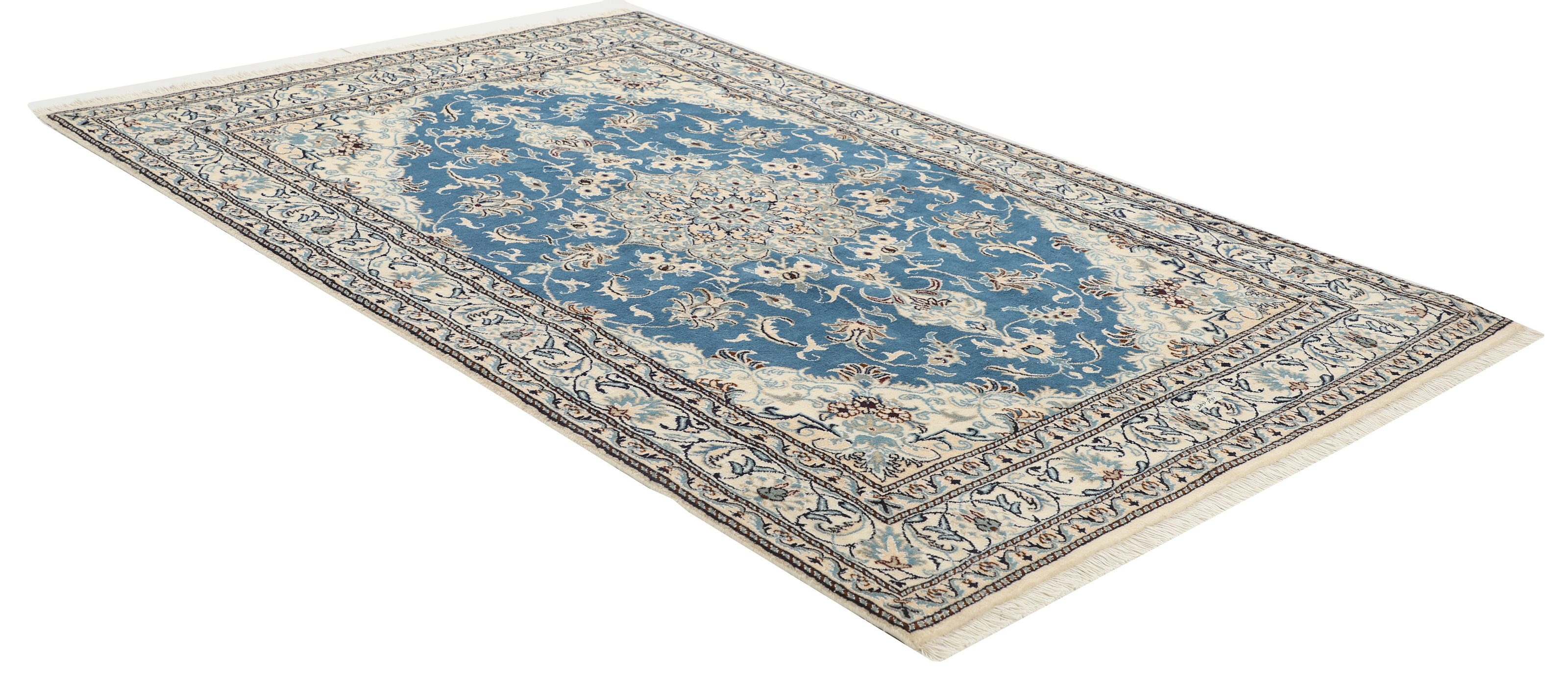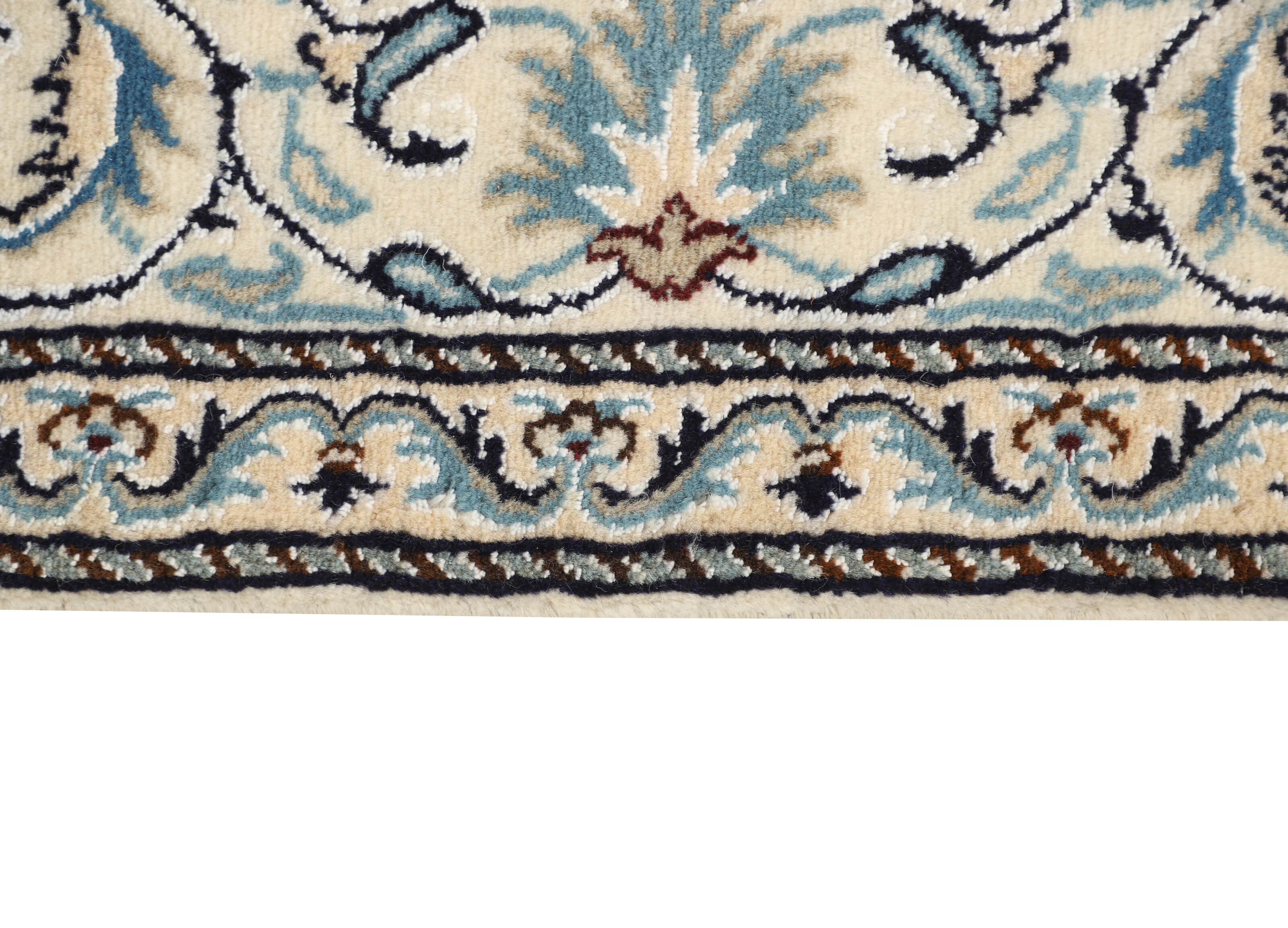 Nain KashmarItem no.: 1519800 Size: 160 cm x 250 cmNain is a city of about 50.000 people, located in the Isfahan Province. It has historic significance, since it was the last stop on caravan routes before Kavir-a-Lut, one of the deserts that stretch through the centre of Iran. The Nain Mosque is one of Iran’s oldest, and is built far better than the later and more famous mosques of Isfahan. The industry in Nain was traditionally focused on the production of wool garments, but the weavers switched to rug production when the demand fell. Their new products soon became famous, as the weavers were skilled and used good quality materials. The warp and weft are cotton, with a wool pile and contours of silk. Sometimes, silk is used more in the base. The colours are refined; nuances of ivory and cream, with small areas of red, green, and blue. As with the rugs from Isfahan, the patterns of the Nain rugs are also classical. The Nain rugs are made in all sizes, including the very large of up to 60m2, and some of these have a pure silk pile. The largest Nain rug produced was 20 by 20 metres.