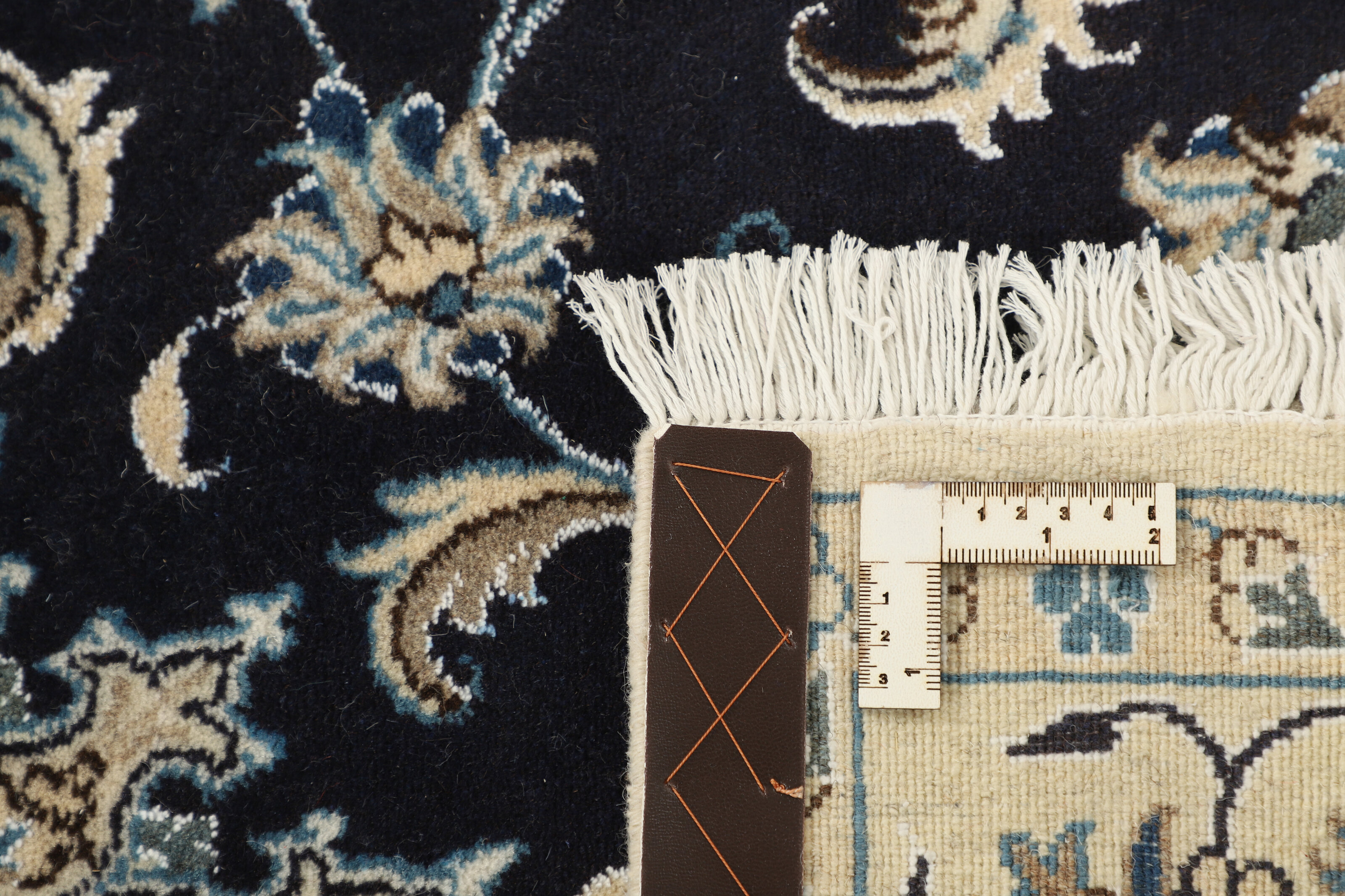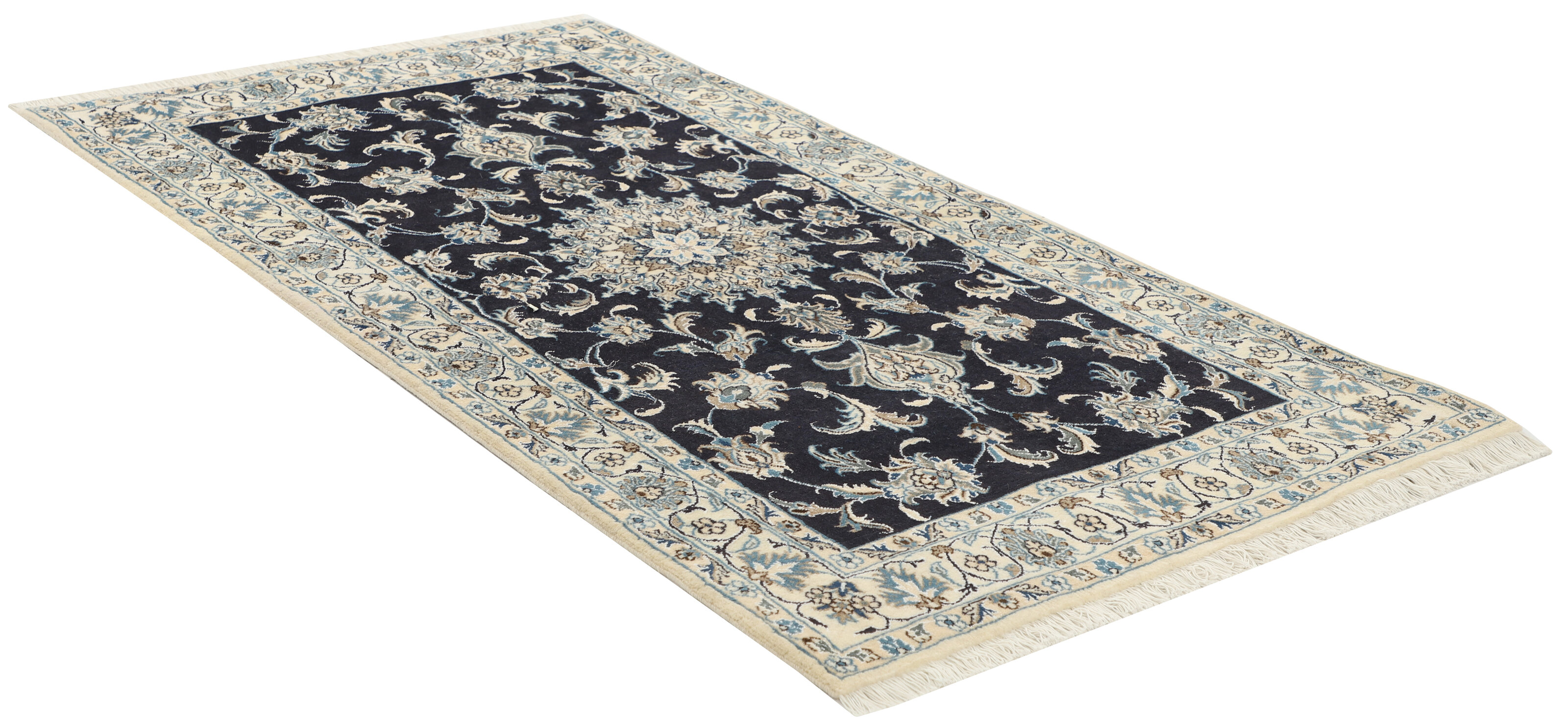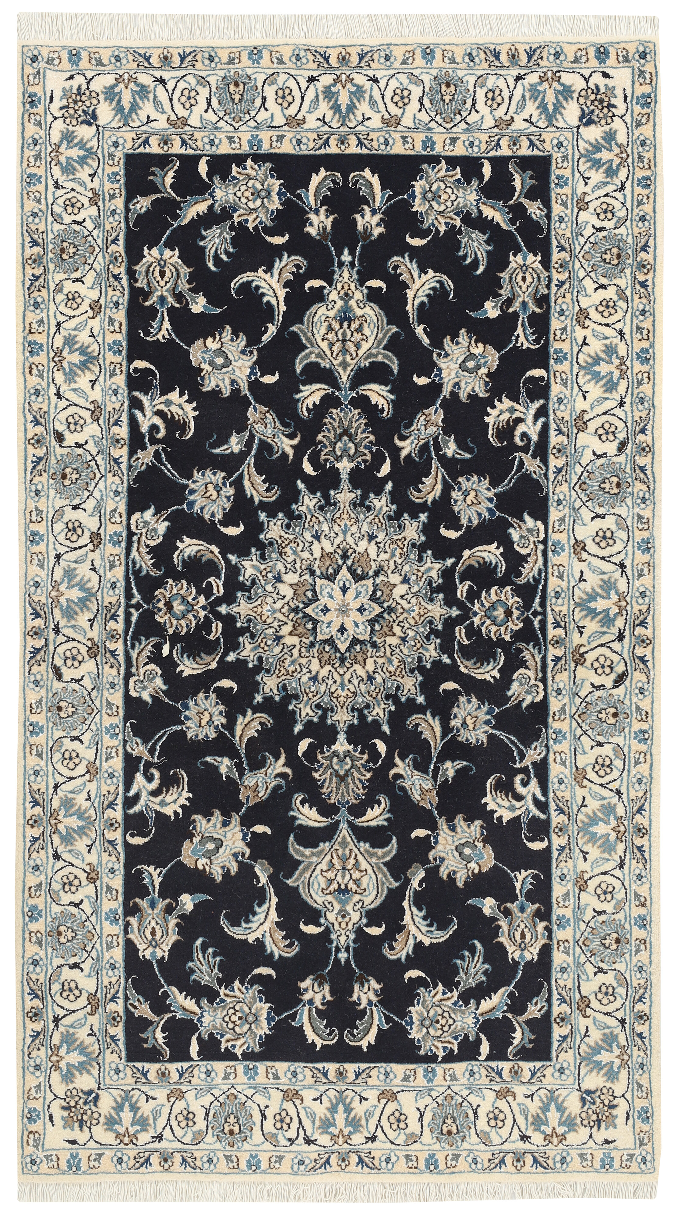 Nain KashmarItem no.: 1519802 Size: 117 cm x 205 cmNain is a city of about 50.000 people, located in the Isfahan Province. It has historic significance, since it was the last stop on caravan routes before Kavir-a-Lut, one of the deserts that stretch through the centre of Iran. The Nain Mosque is one of Iran’s oldest, and is built far better than the later and more famous mosques of Isfahan. The industry in Nain was traditionally focused on the production of wool garments, but the weavers switched to rug production when the demand fell. Their new products soon became famous, as the weavers were skilled and used good quality materials. The warp and weft are cotton, with a wool pile and contours of silk. Sometimes, silk is used more in the base. The colours are refined; nuances of ivory and cream, with small areas of red, green, and blue. As with the rugs from Isfahan, the patterns of the Nain rugs are also classical. The Nain rugs are made in all sizes, including the very large of up to 60m2, and some of these have a pure silk pile. The largest Nain rug produced was 20 by 20 metres.