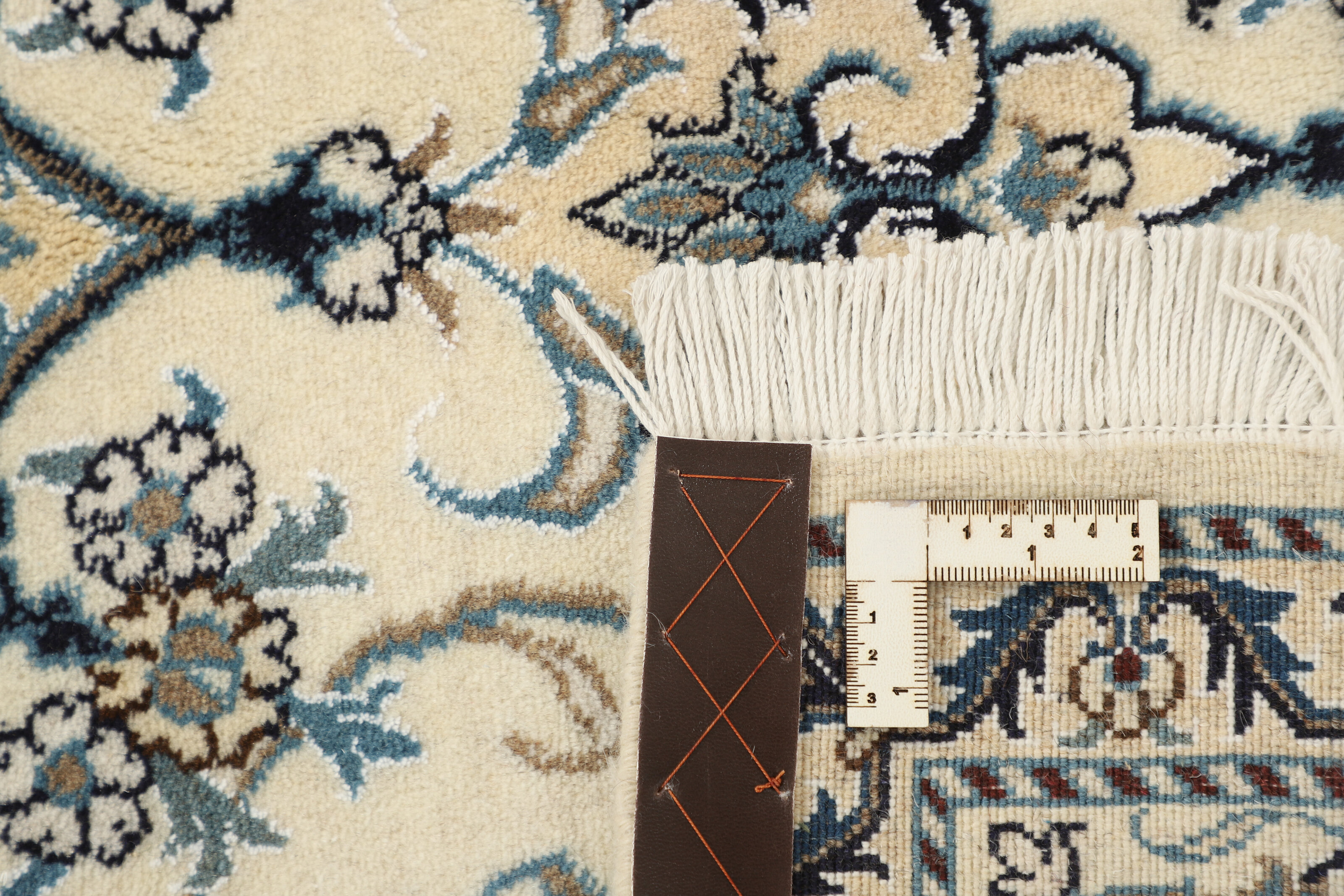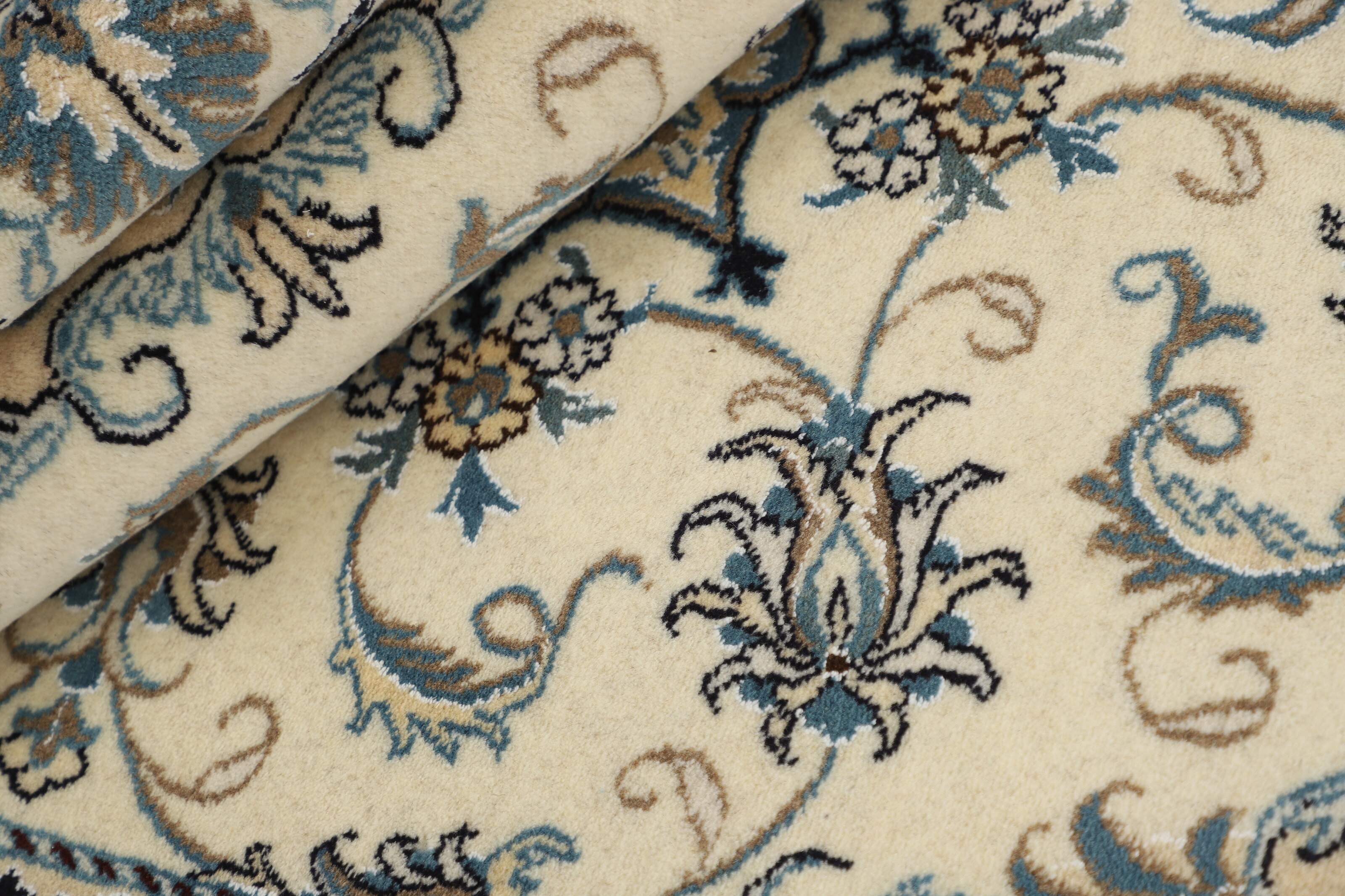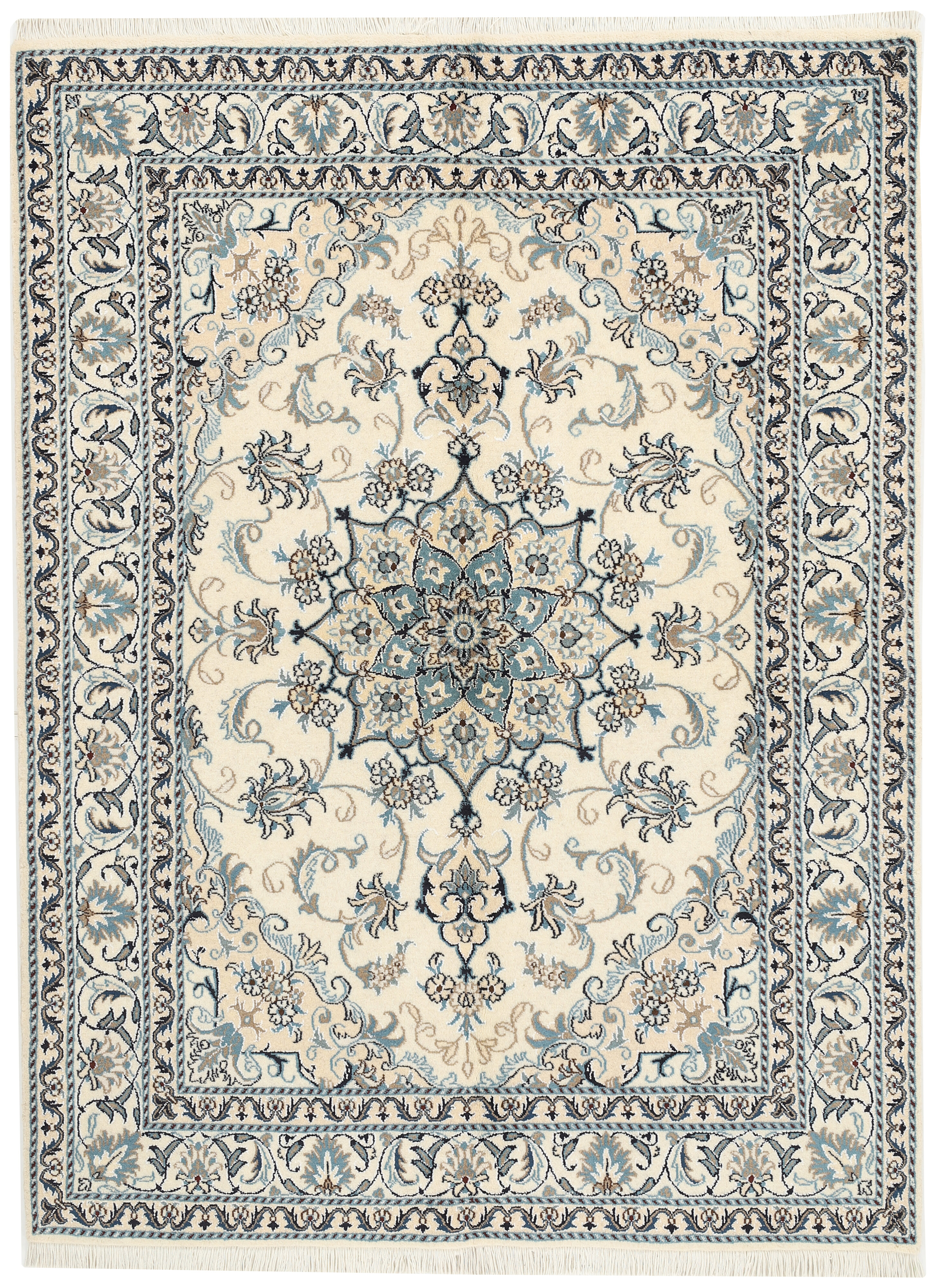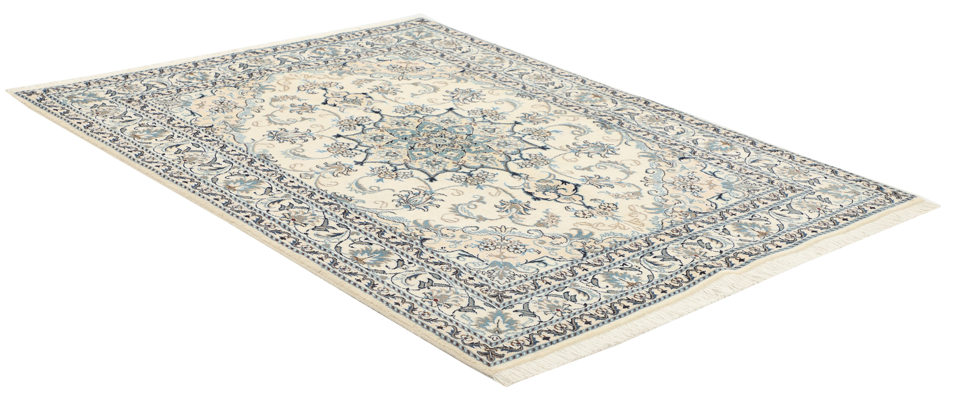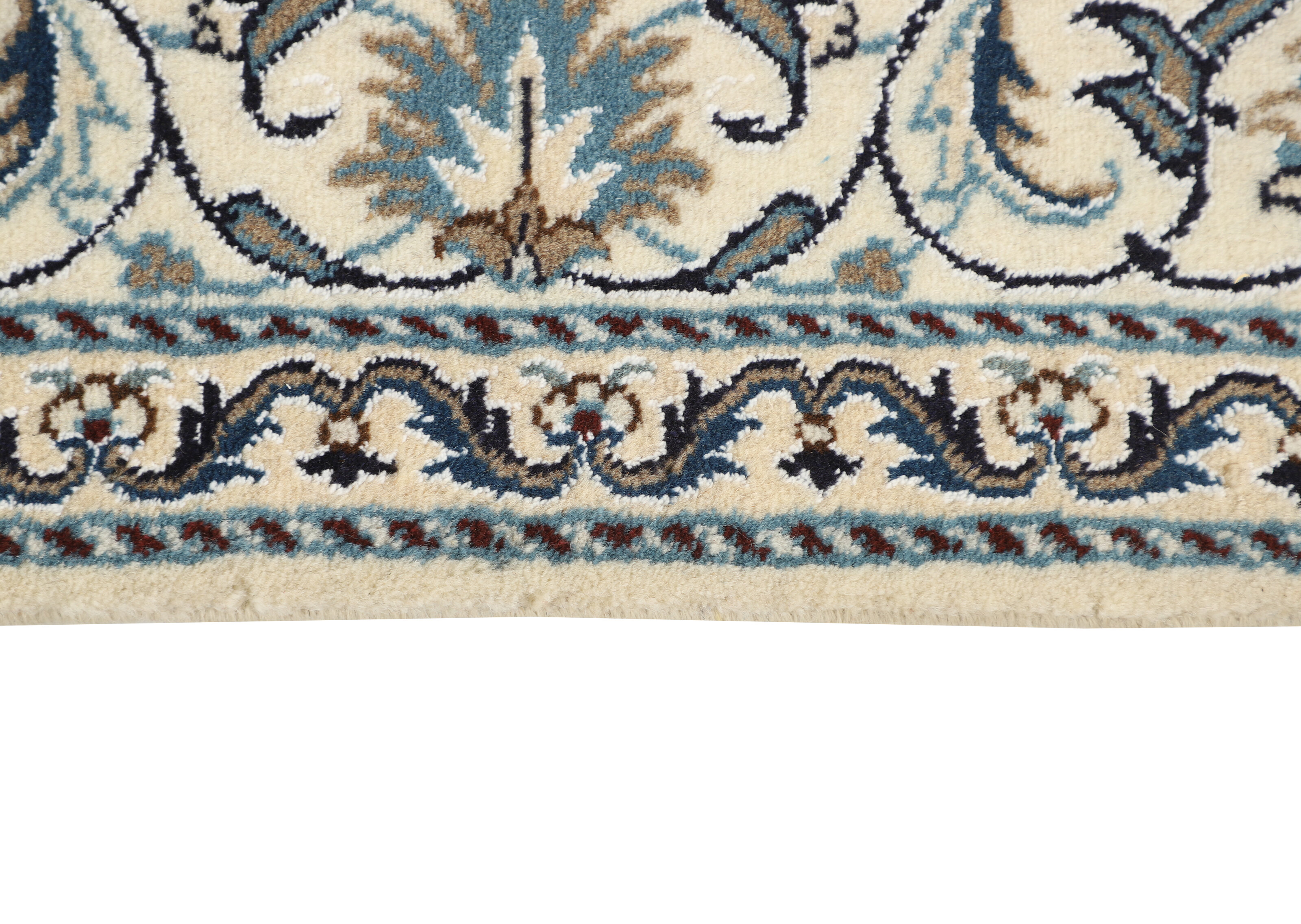 Nain KashmarItem no.: 1519806 Size: 147 cm x 196 cmNain is a city of about 50.000 people, located in the Isfahan Province. It has historic significance, since it was the last stop on caravan routes before Kavir-a-Lut, one of the deserts that stretch through the centre of Iran. The Nain Mosque is one of Iran’s oldest, and is built far better than the later and more famous mosques of Isfahan. The industry in Nain was traditionally focused on the production of wool garments, but the weavers switched to rug production when the demand fell. Their new products soon became famous, as the weavers were skilled and used good quality materials. The warp and weft are cotton, with a wool pile and contours of silk. Sometimes, silk is used more in the base. The colours are refined; nuances of ivory and cream, with small areas of red, green, and blue. As with the rugs from Isfahan, the patterns of the Nain rugs are also classical. The Nain rugs are made in all sizes, including the very large of up to 60m2, and some of these have a pure silk pile. The largest Nain rug produced was 20 by 20 metres.