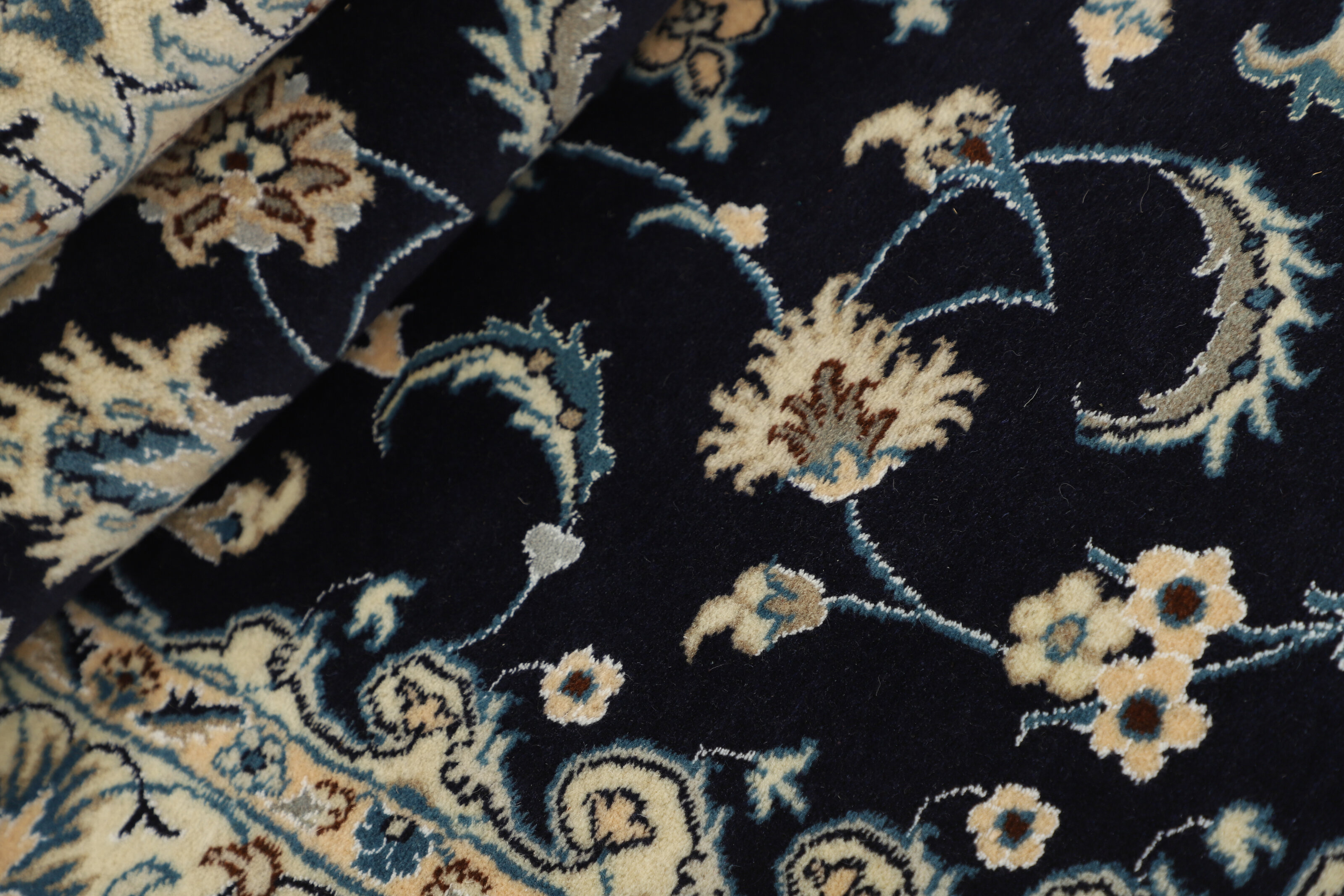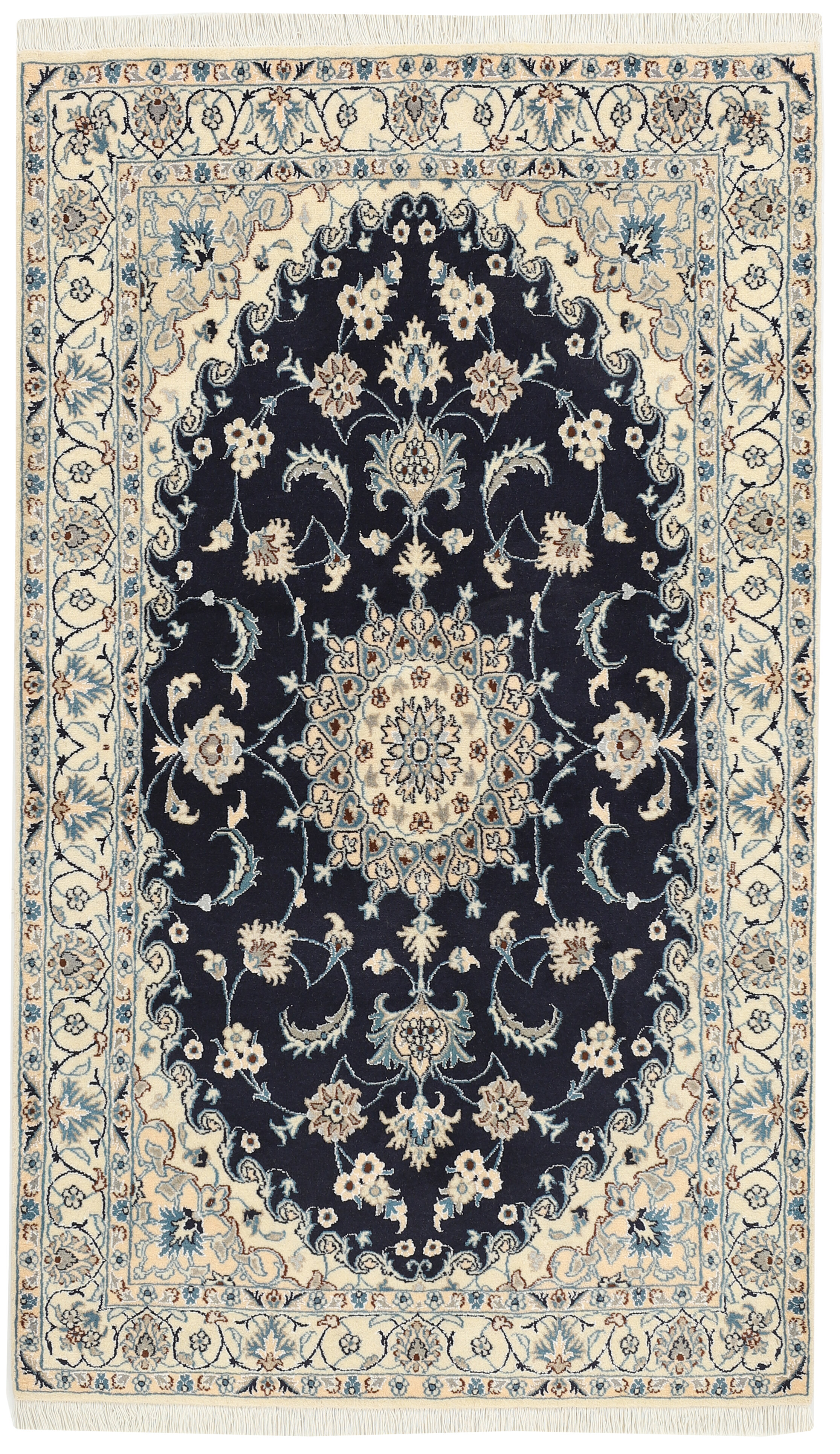 Nain KashmarItem no.: 1519810 Size: 120 cm x 207 cmNain is a city of about 50.000 people, located in the Isfahan Province. It has historic significance, since it was the last stop on caravan routes before Kavir-a-Lut, one of the deserts that stretch through the centre of Iran. The Nain Mosque is one of Iran’s oldest, and is built far better than the later and more famous mosques of Isfahan. The industry in Nain was traditionally focused on the production of wool garments, but the weavers switched to rug production when the demand fell. Their new products soon became famous, as the weavers were skilled and used good quality materials. The warp and weft are cotton, with a wool pile and contours of silk. Sometimes, silk is used more in the base. The colours are refined; nuances of ivory and cream, with small areas of red, green, and blue. As with the rugs from Isfahan, the patterns of the Nain rugs are also classical. The Nain rugs are made in all sizes, including the very large of up to 60m2, and some of these have a pure silk pile. The largest Nain rug produced was 20 by 20 metres.