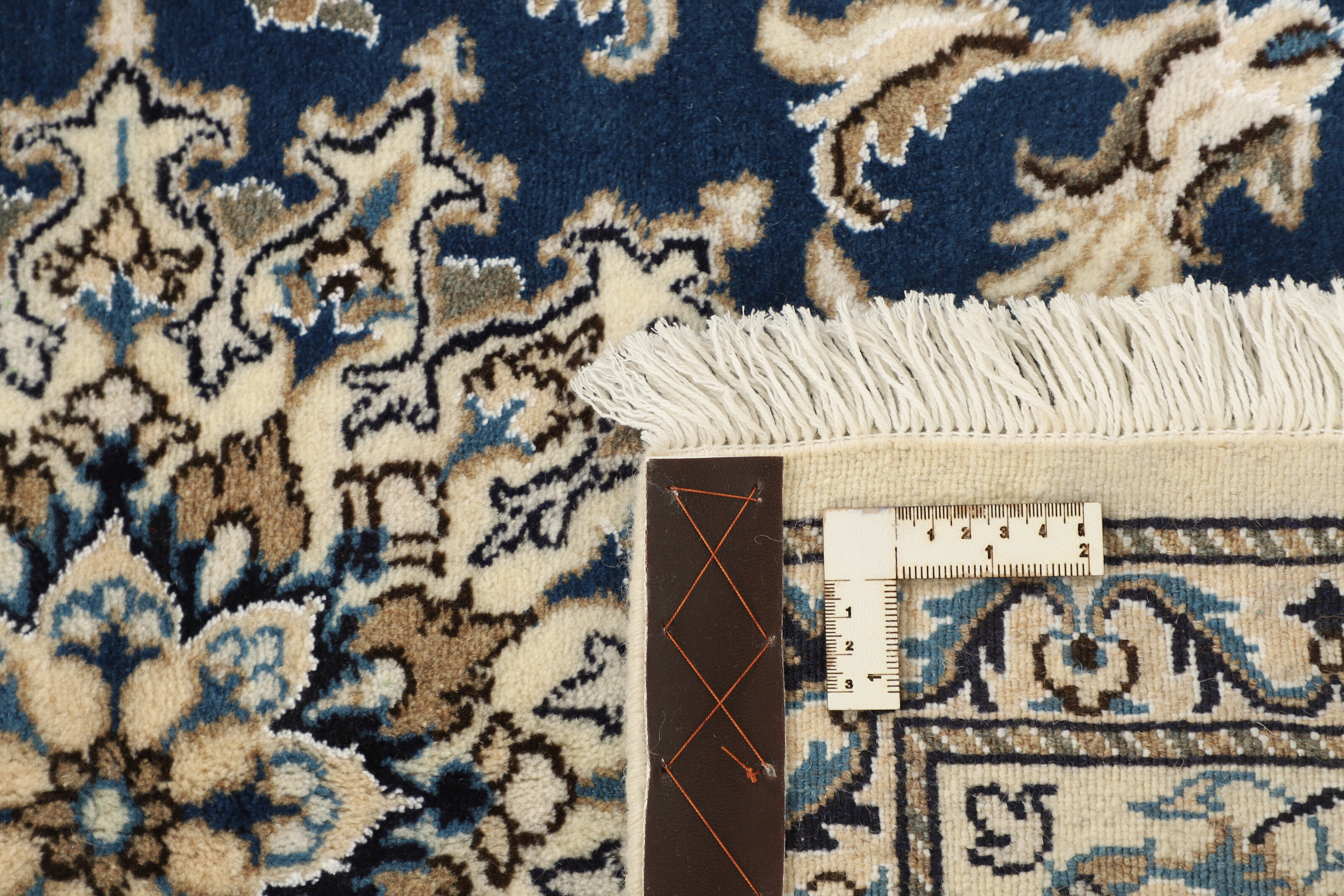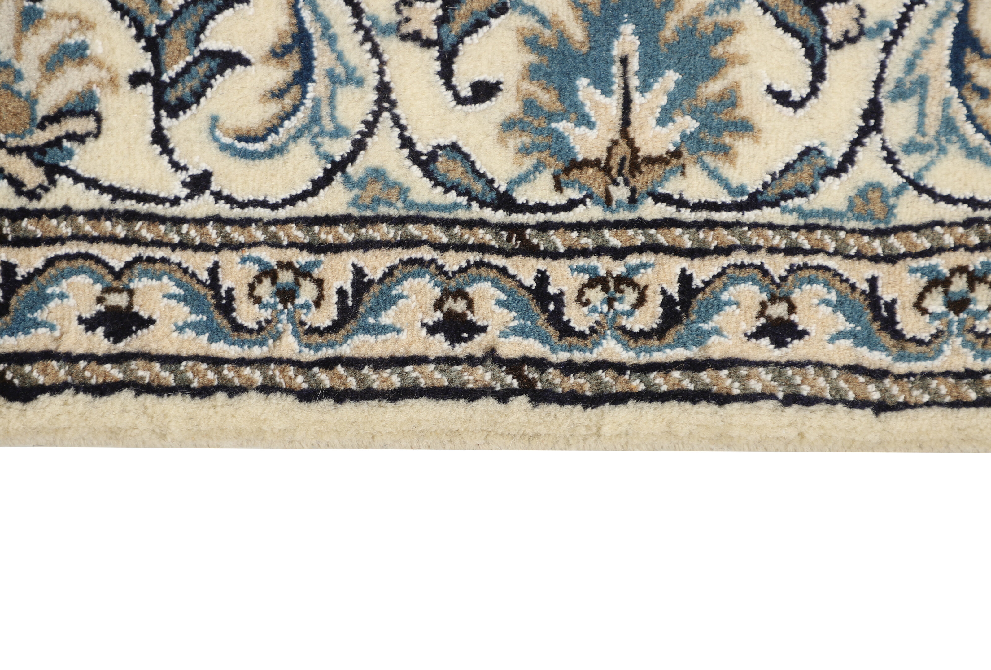 Nain KashmarItem no.: 1519820 Size: 142 cm x 195 cmNain is a city of about 50.000 people, located in the Isfahan Province. It has historic significance, since it was the last stop on caravan routes before Kavir-a-Lut, one of the deserts that stretch through the centre of Iran. The Nain Mosque is one of Iran’s oldest, and is built far better than the later and more famous mosques of Isfahan. The industry in Nain was traditionally focused on the production of wool garments, but the weavers switched to rug production when the demand fell. Their new products soon became famous, as the weavers were skilled and used good quality materials. The warp and weft are cotton, with a wool pile and contours of silk. Sometimes, silk is used more in the base. The colours are refined; nuances of ivory and cream, with small areas of red, green, and blue. As with the rugs from Isfahan, the patterns of the Nain rugs are also classical. The Nain rugs are made in all sizes, including the very large of up to 60m2, and some of these have a pure silk pile. The largest Nain rug produced was 20 by 20 metres.