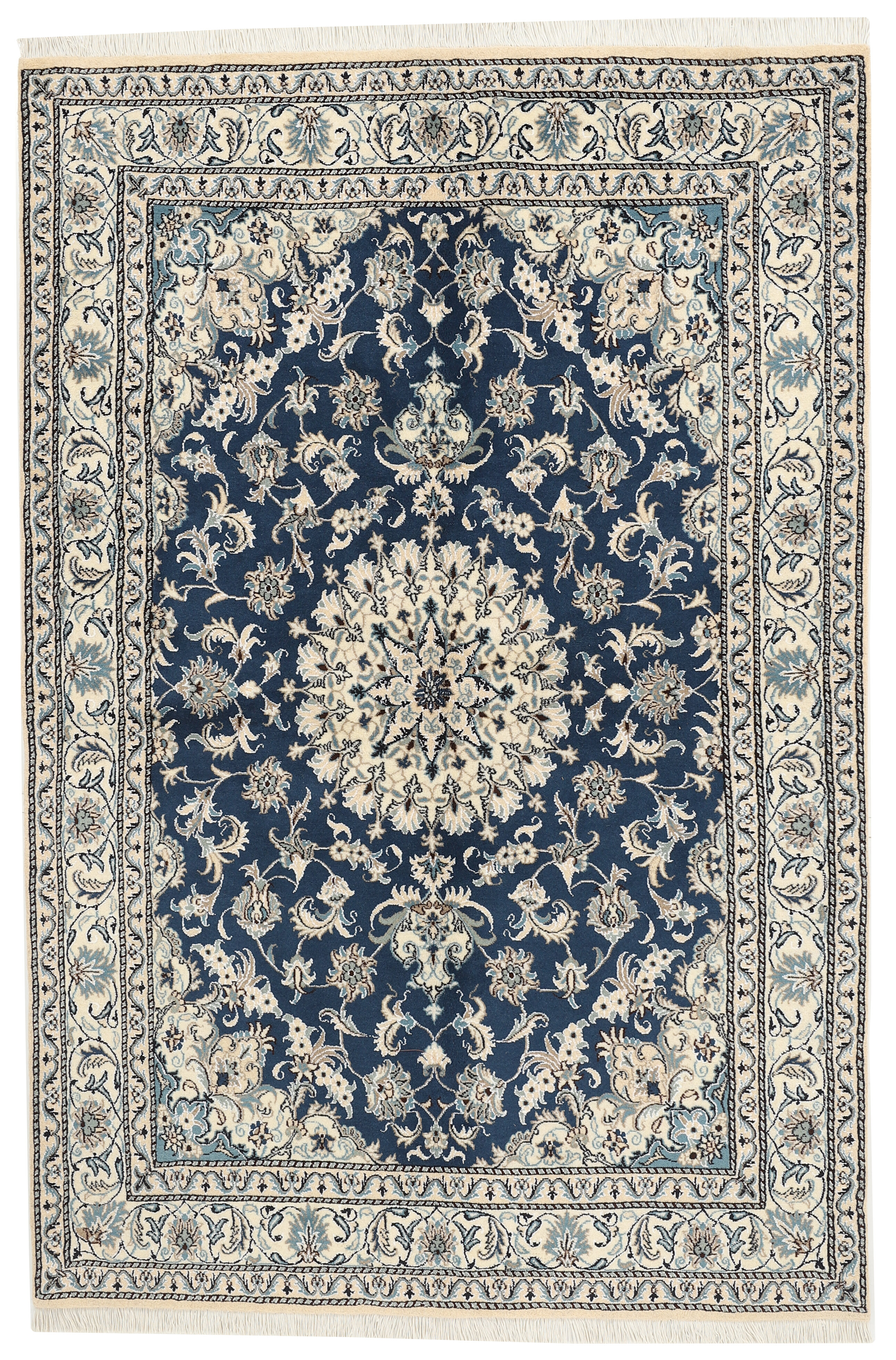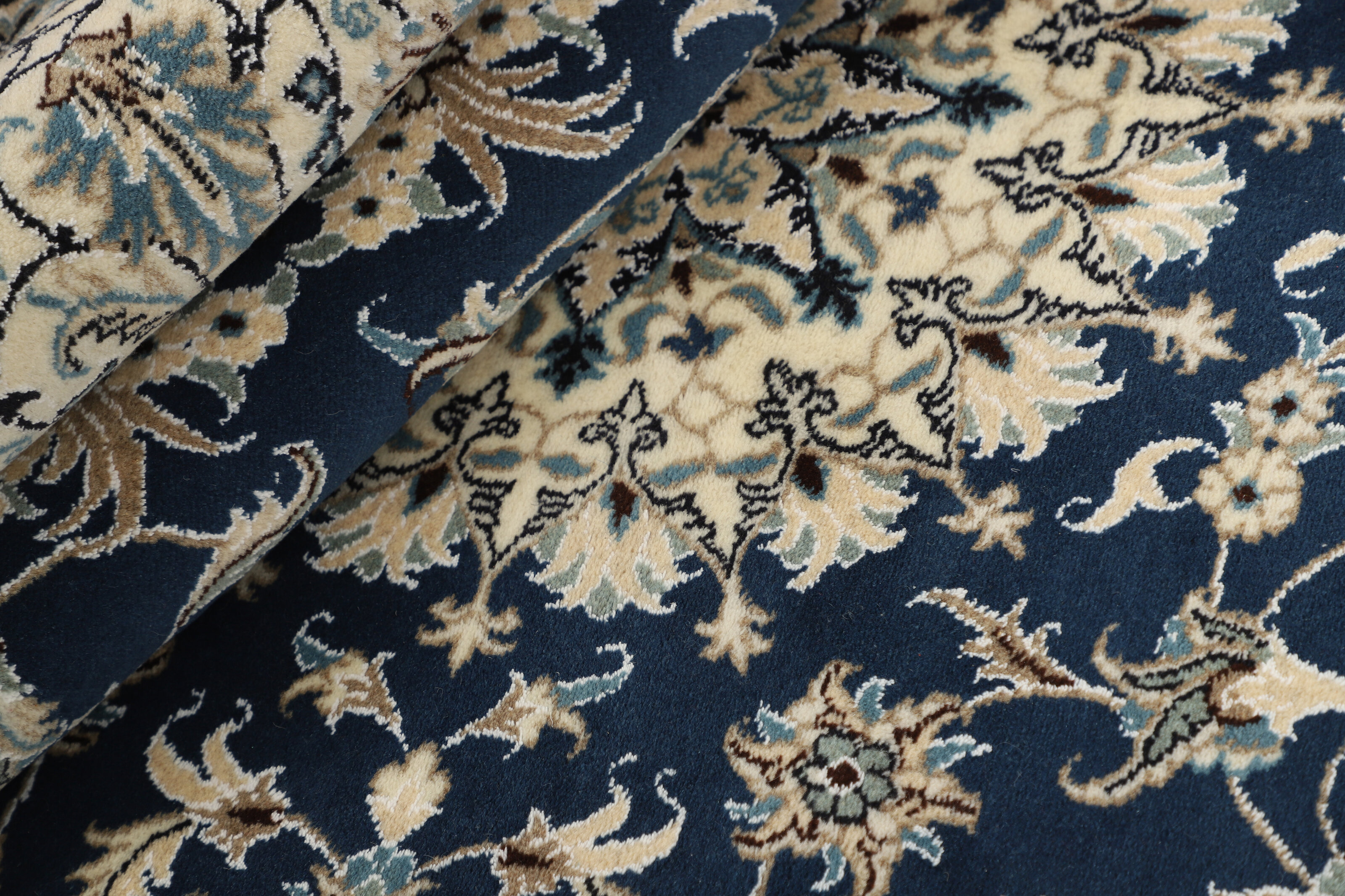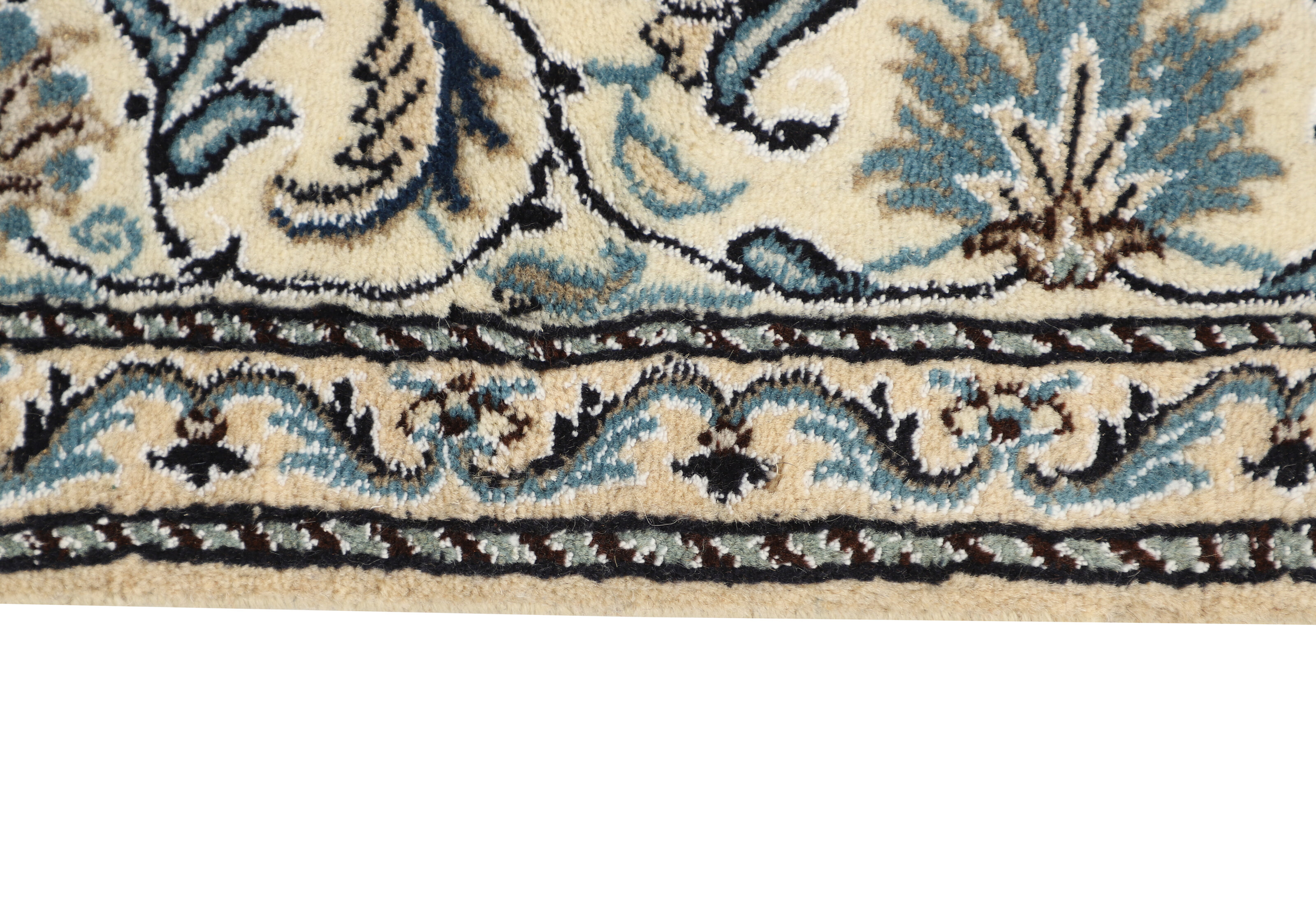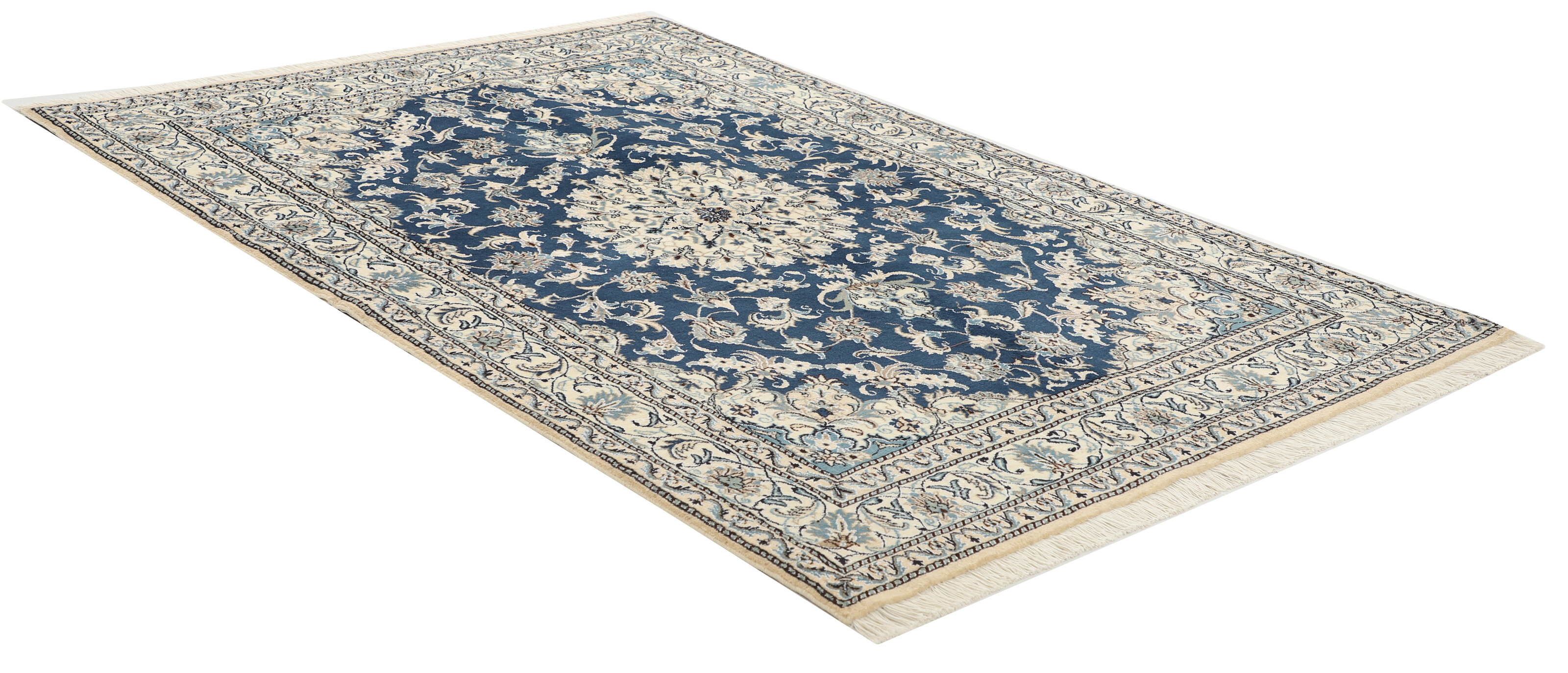 Nain KashmarItem no.: 1519823 Size: 160 cm x 240 cmNain is a city of about 50.000 people, located in the Isfahan Province. It has historic significance, since it was the last stop on caravan routes before Kavir-a-Lut, one of the deserts that stretch through the centre of Iran. The Nain Mosque is one of Iran’s oldest, and is built far better than the later and more famous mosques of Isfahan. The industry in Nain was traditionally focused on the production of wool garments, but the weavers switched to rug production when the demand fell. Their new products soon became famous, as the weavers were skilled and used good quality materials. The warp and weft are cotton, with a wool pile and contours of silk. Sometimes, silk is used more in the base. The colours are refined; nuances of ivory and cream, with small areas of red, green, and blue. As with the rugs from Isfahan, the patterns of the Nain rugs are also classical. The Nain rugs are made in all sizes, including the very large of up to 60m2, and some of these have a pure silk pile. The largest Nain rug produced was 20 by 20 metres.