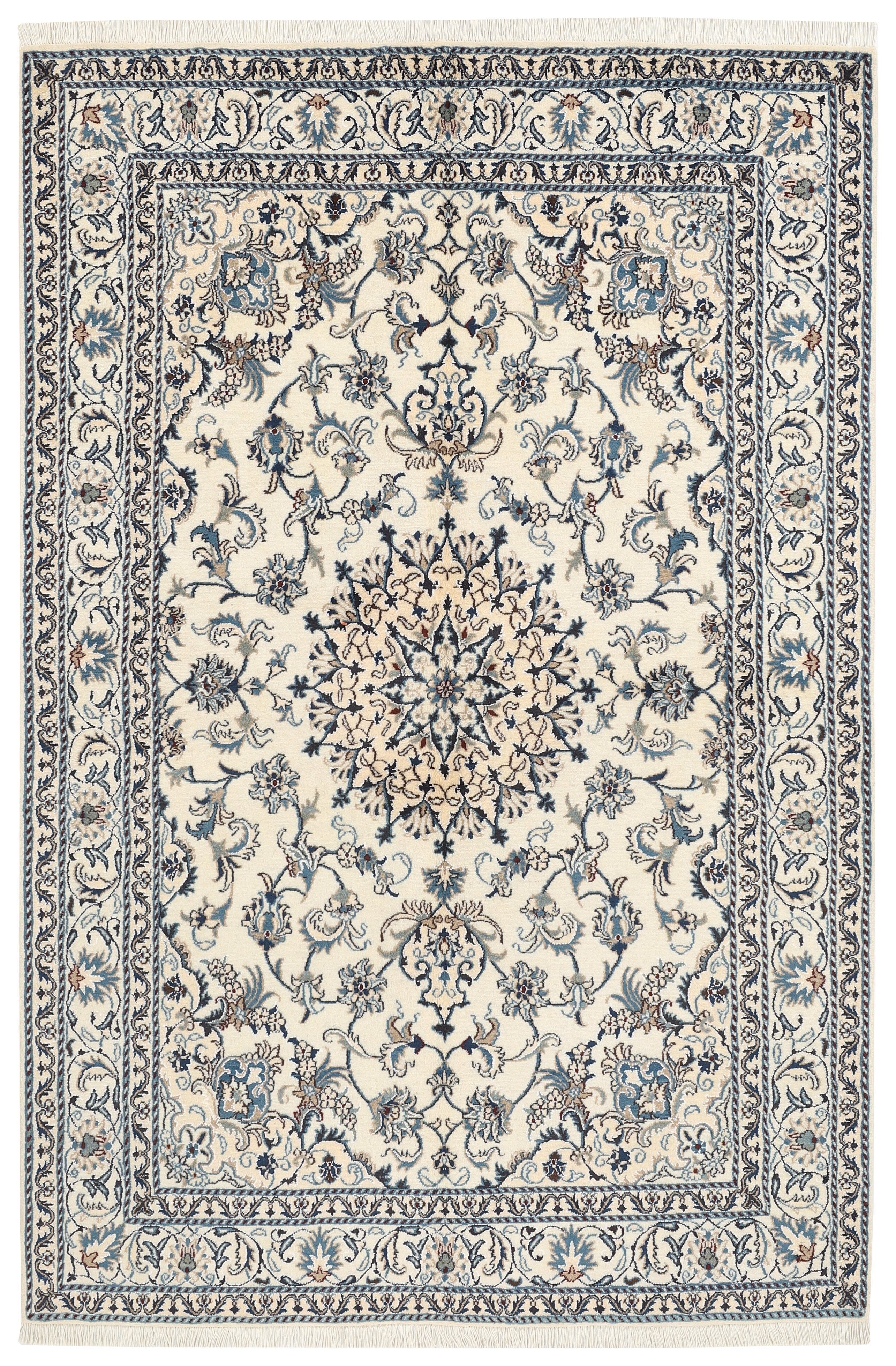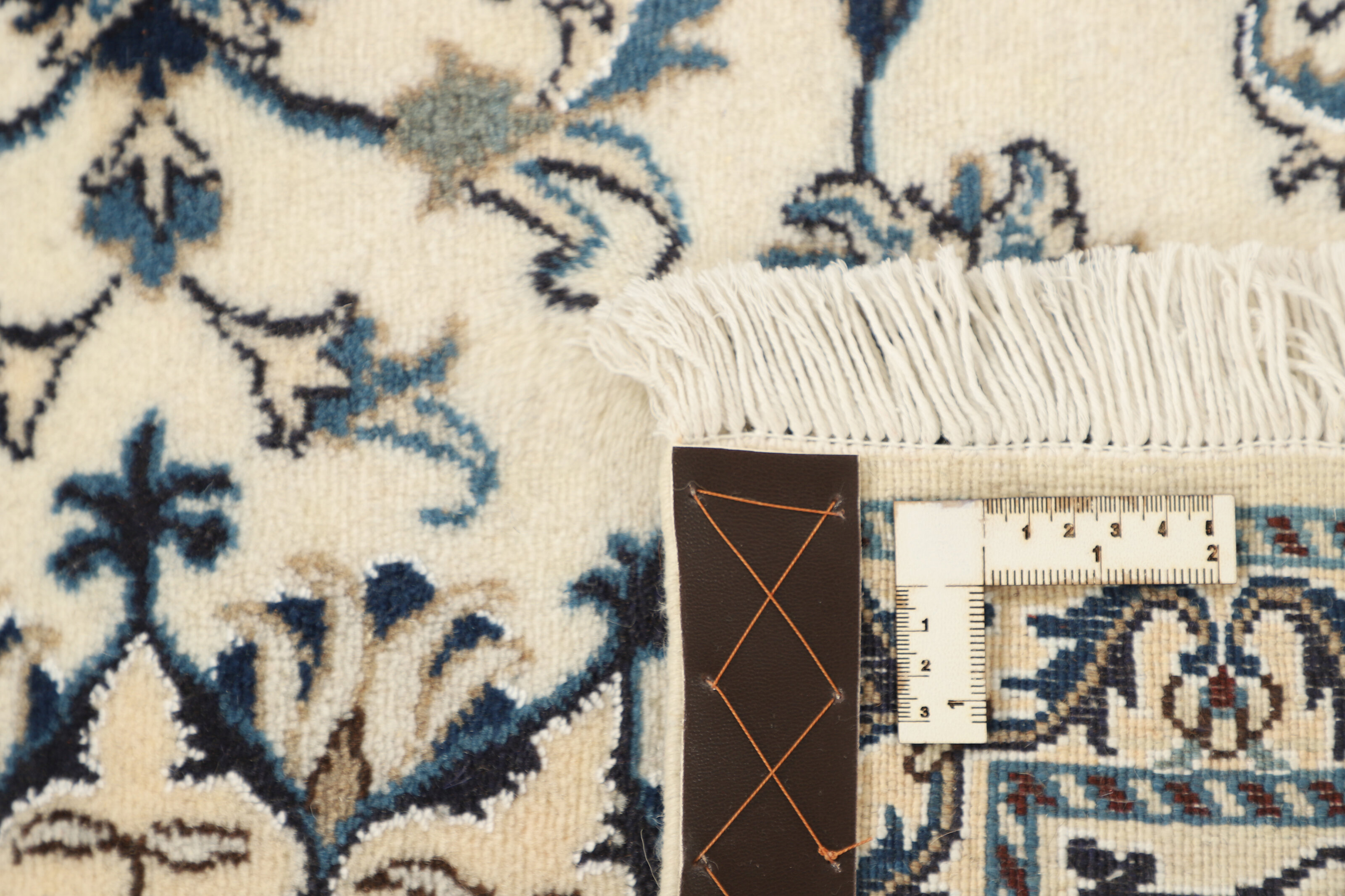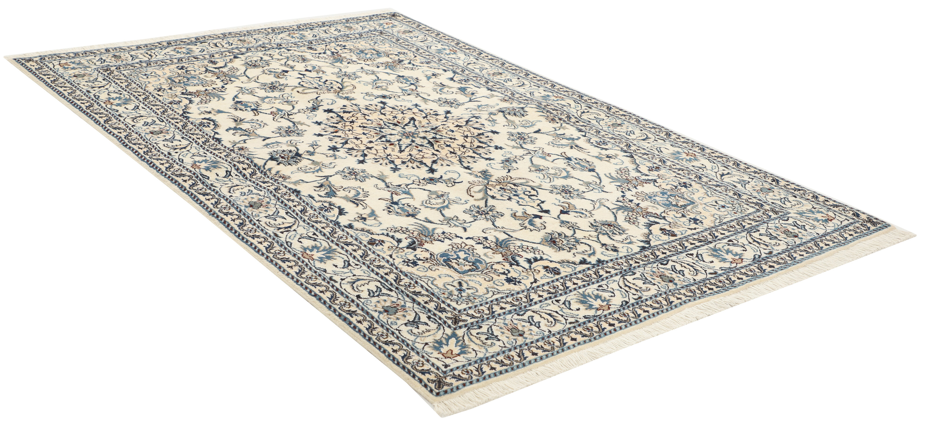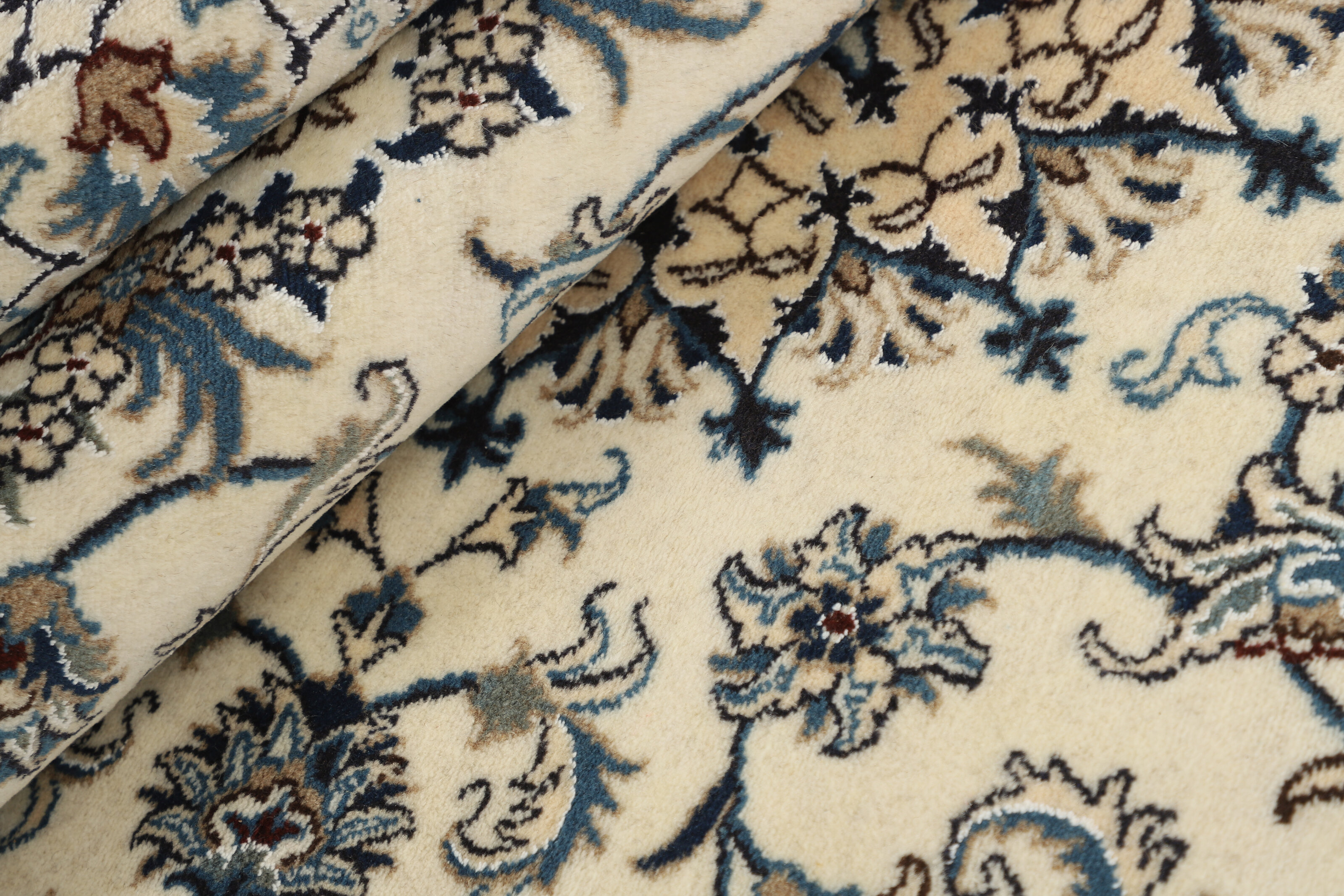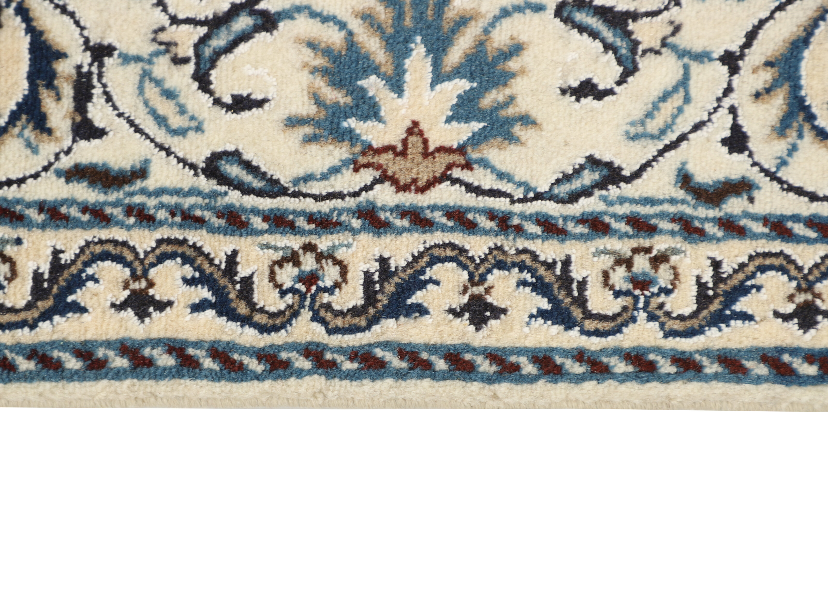 Nain KashmarItem no.: 1519825 Size: 160 cm x 240 cmNain is a city of about 50.000 people, located in the Isfahan Province. It has historic significance, since it was the last stop on caravan routes before Kavir-a-Lut, one of the deserts that stretch through the centre of Iran. The Nain Mosque is one of Iran’s oldest, and is built far better than the later and more famous mosques of Isfahan. The industry in Nain was traditionally focused on the production of wool garments, but the weavers switched to rug production when the demand fell. Their new products soon became famous, as the weavers were skilled and used good quality materials. The warp and weft are cotton, with a wool pile and contours of silk. Sometimes, silk is used more in the base. The colours are refined; nuances of ivory and cream, with small areas of red, green, and blue. As with the rugs from Isfahan, the patterns of the Nain rugs are also classical. The Nain rugs are made in all sizes, including the very large of up to 60m2, and some of these have a pure silk pile. The largest Nain rug produced was 20 by 20 metres.
