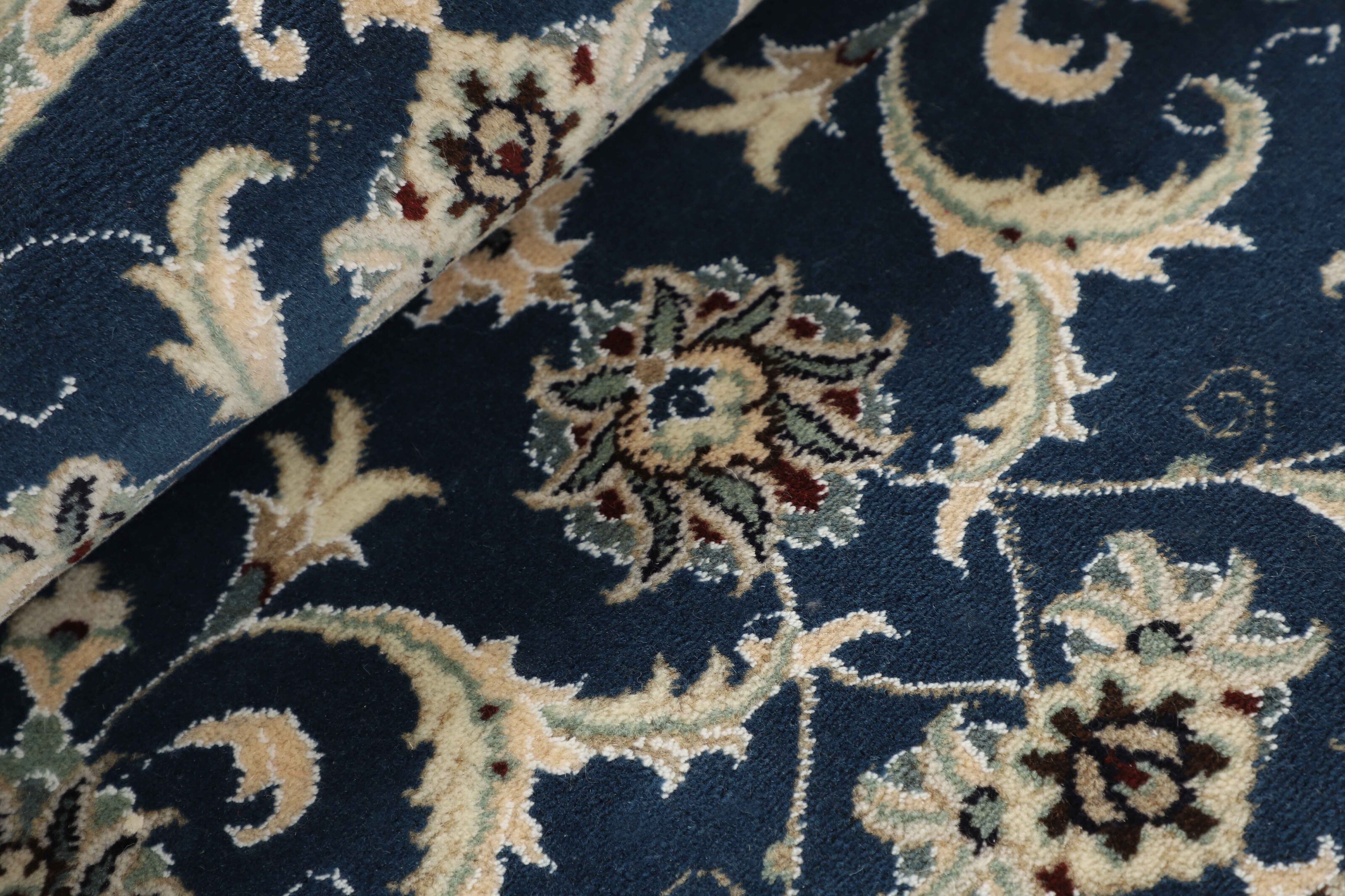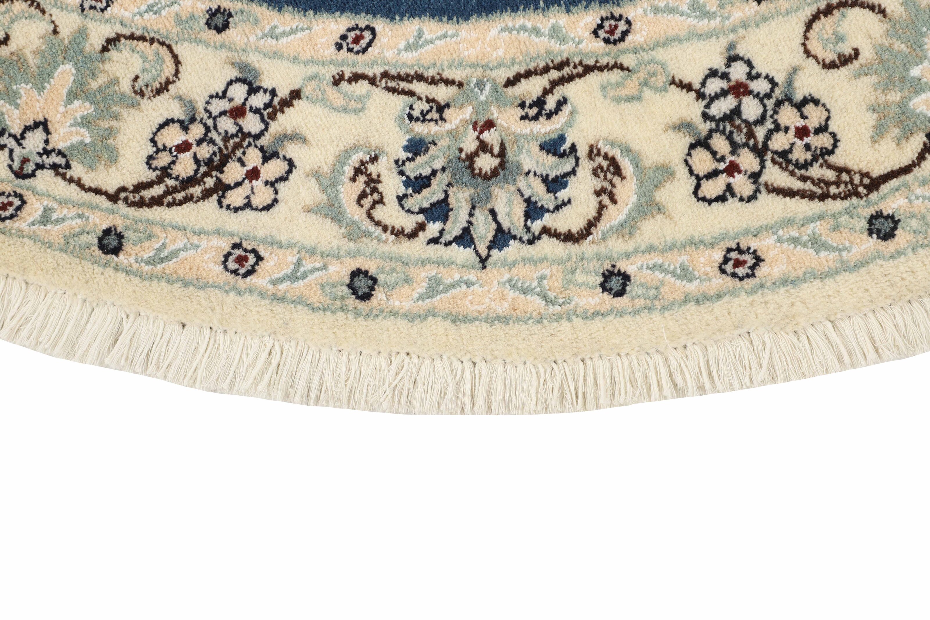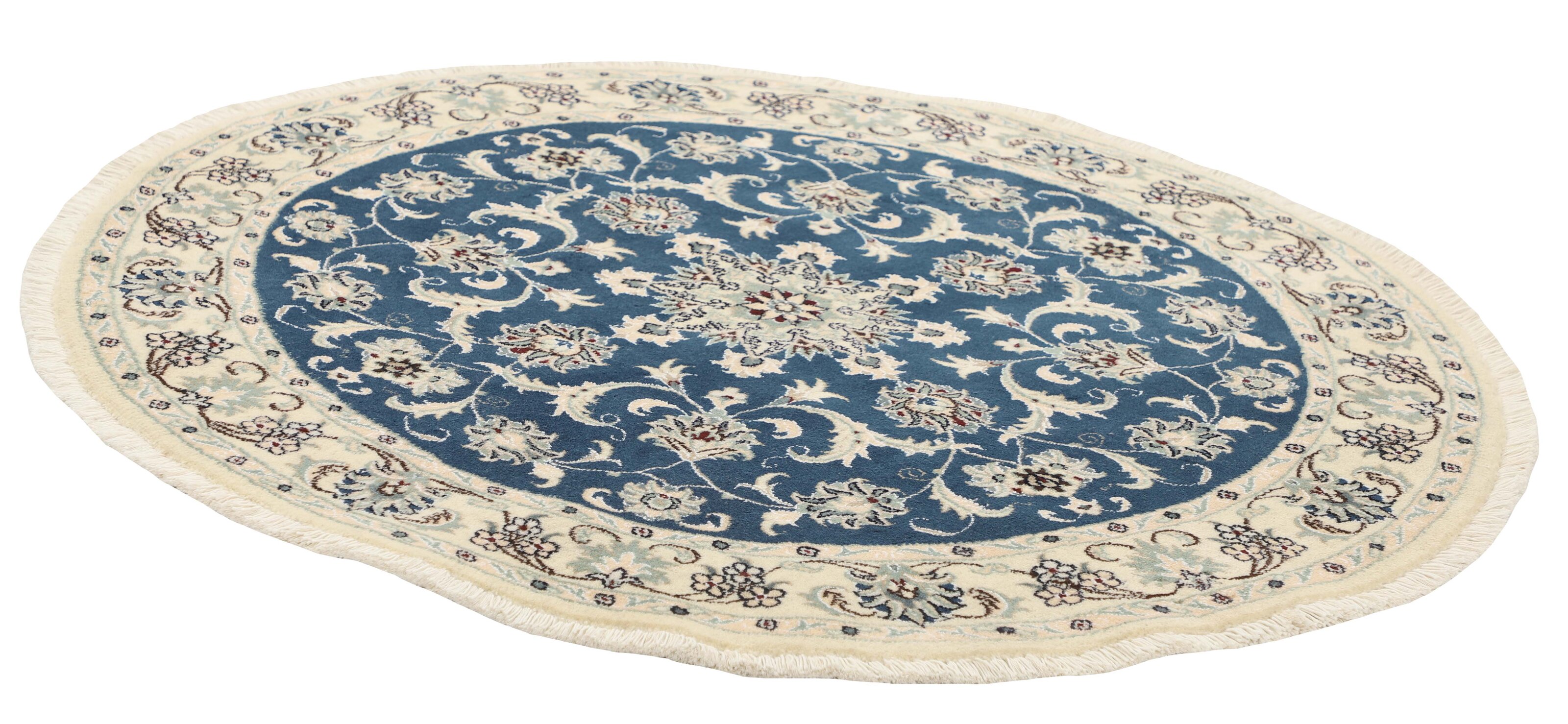 Nain KashmarItem no.: 1519842 Size: 145 cm x 145 cmNain is a city of about 50.000 people, located in the Isfahan Province. It has historic significance, since it was the last stop on caravan routes before Kavir-a-Lut, one of the deserts that stretch through the centre of Iran. The Nain Mosque is one of Iran’s oldest, and is built far better than the later and more famous mosques of Isfahan. The industry in Nain was traditionally focused on the production of wool garments, but the weavers switched to rug production when the demand fell. Their new products soon became famous, as the weavers were skilled and used good quality materials. The warp and weft are cotton, with a wool pile and contours of silk. Sometimes, silk is used more in the base. The colours are refined; nuances of ivory and cream, with small areas of red, green, and blue. As with the rugs from Isfahan, the patterns of the Nain rugs are also classical. The Nain rugs are made in all sizes, including the very large of up to 60m2, and some of these have a pure silk pile. The largest Nain rug produced was 20 by 20 metres.