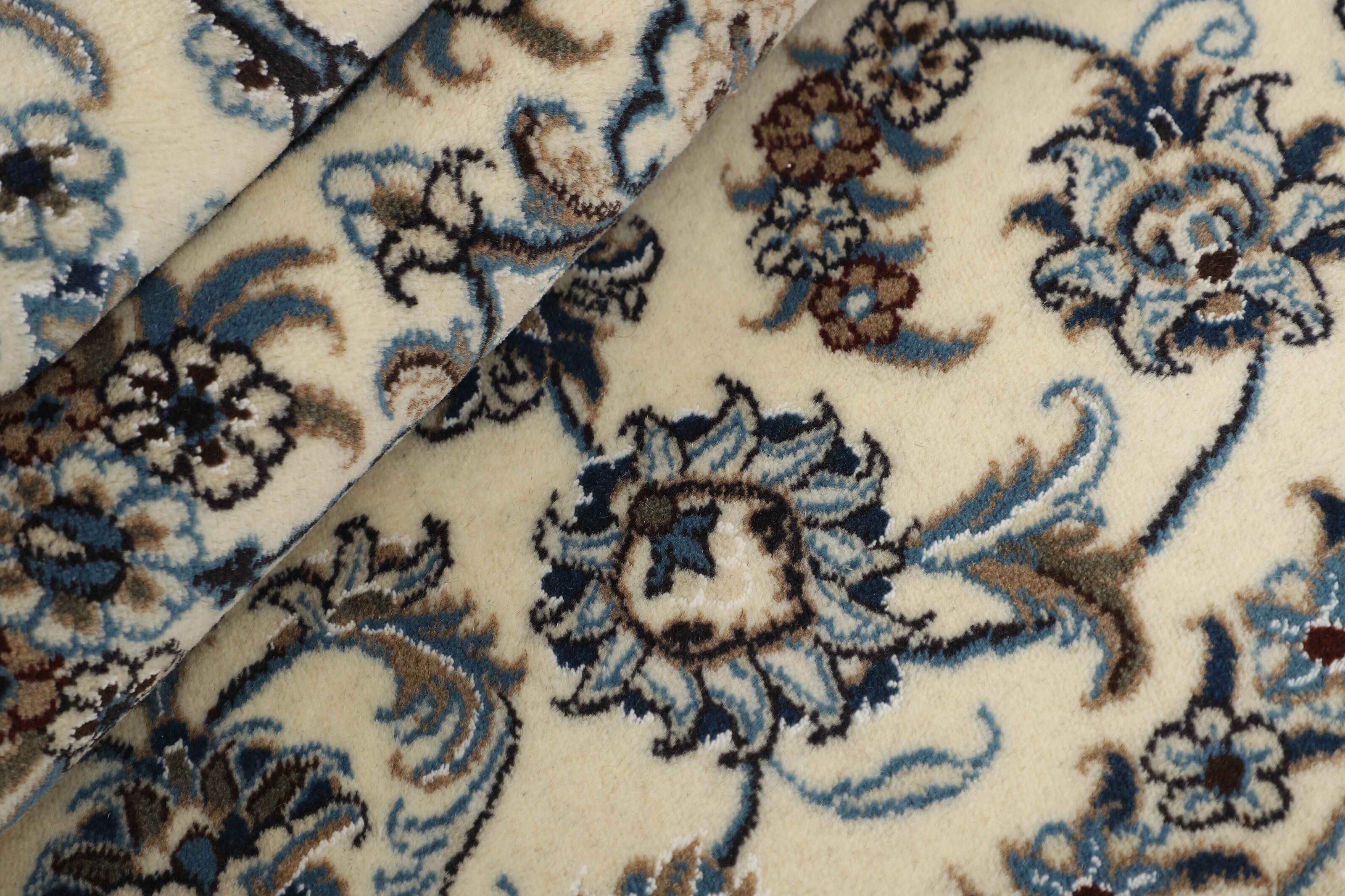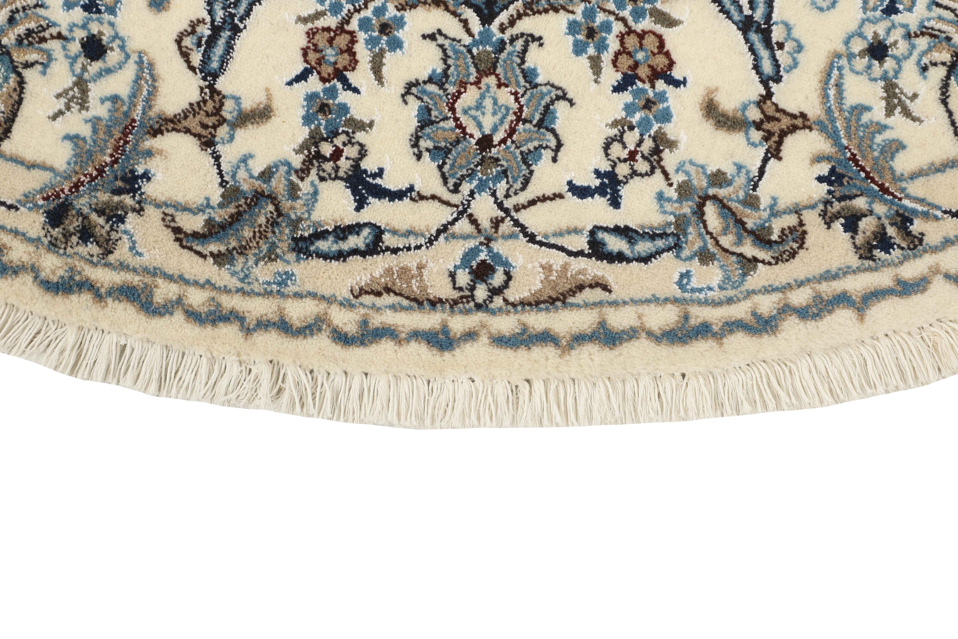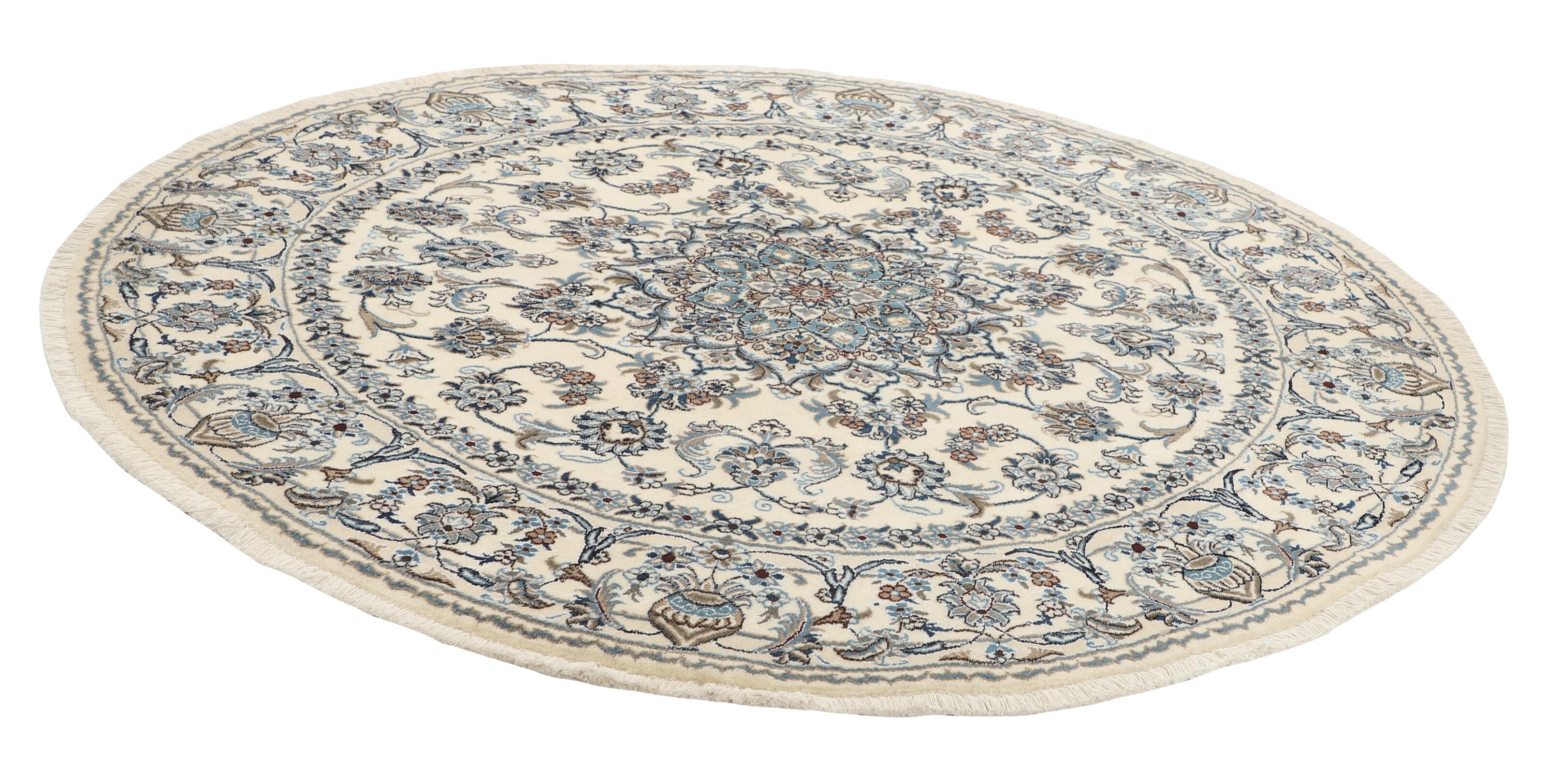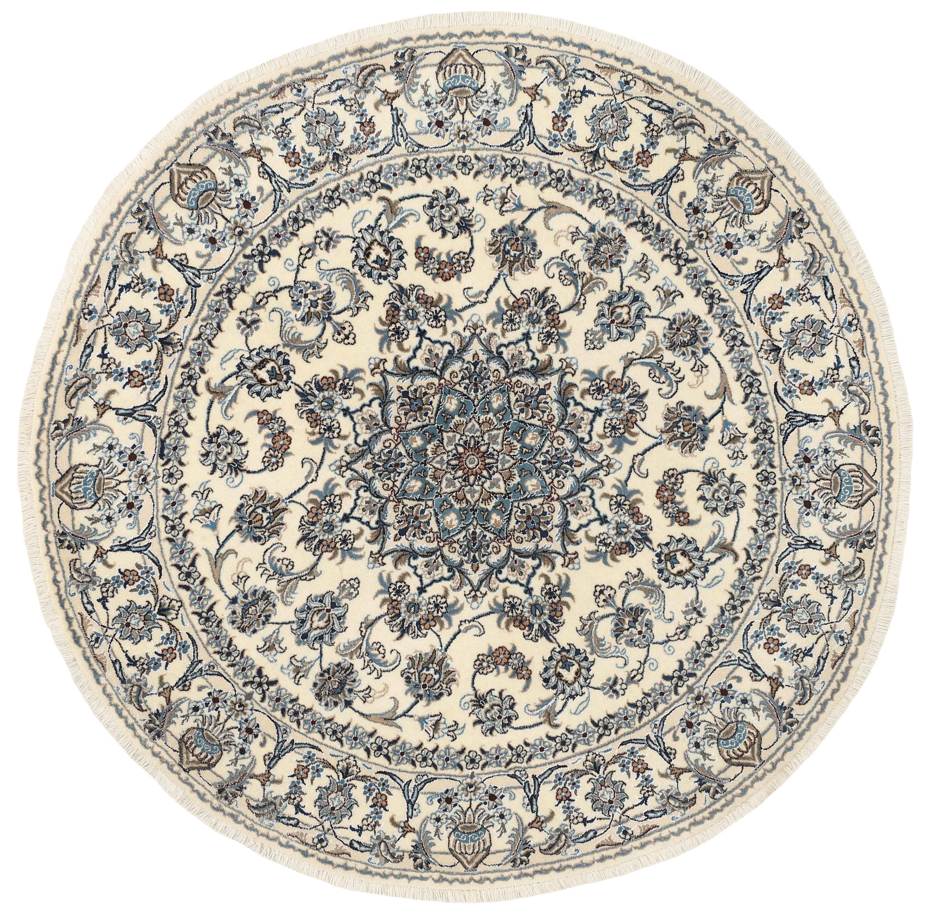 Nain KashmarItem no.: 1519850 Size: 200 cm x 200 cmNain is a city of about 50.000 people, located in the Isfahan Province. It has historic significance, since it was the last stop on caravan routes before Kavir-a-Lut, one of the deserts that stretch through the centre of Iran. The Nain Mosque is one of Iran’s oldest, and is built far better than the later and more famous mosques of Isfahan. The industry in Nain was traditionally focused on the production of wool garments, but the weavers switched to rug production when the demand fell. Their new products soon became famous, as the weavers were skilled and used good quality materials. The warp and weft are cotton, with a wool pile and contours of silk. Sometimes, silk is used more in the base. The colours are refined; nuances of ivory and cream, with small areas of red, green, and blue. As with the rugs from Isfahan, the patterns of the Nain rugs are also classical. The Nain rugs are made in all sizes, including the very large of up to 60m2, and some of these have a pure silk pile. The largest Nain rug produced was 20 by 20 metres.