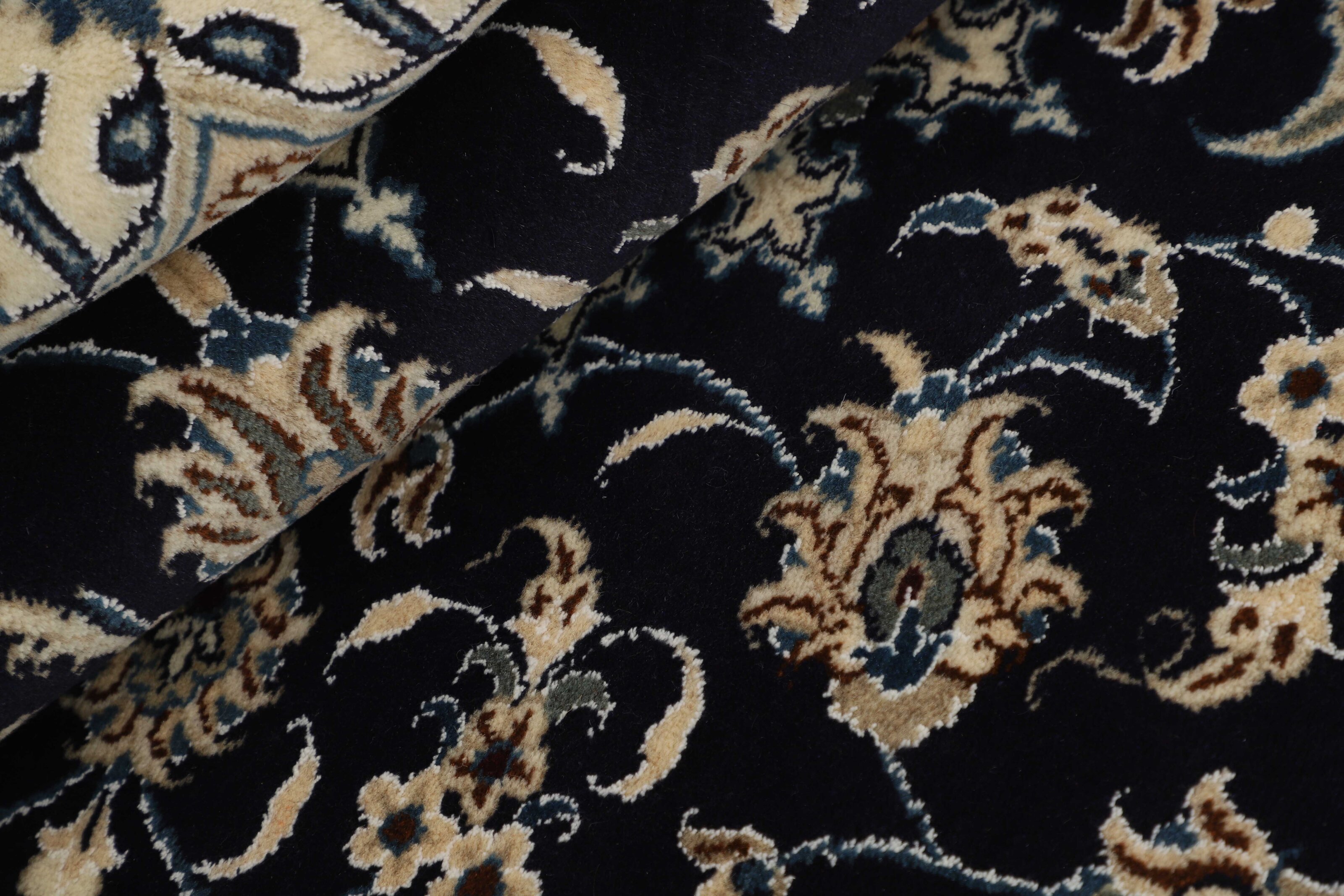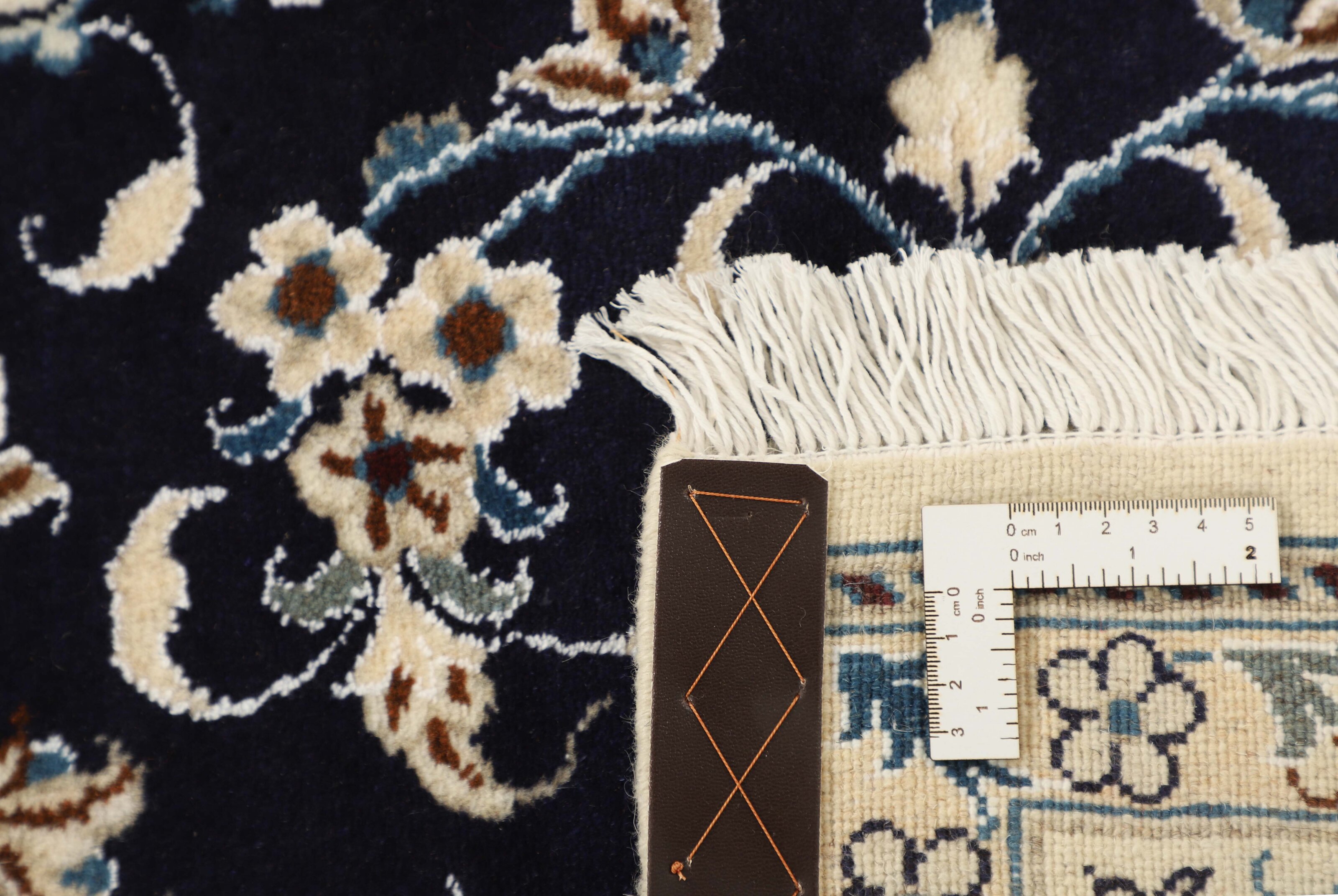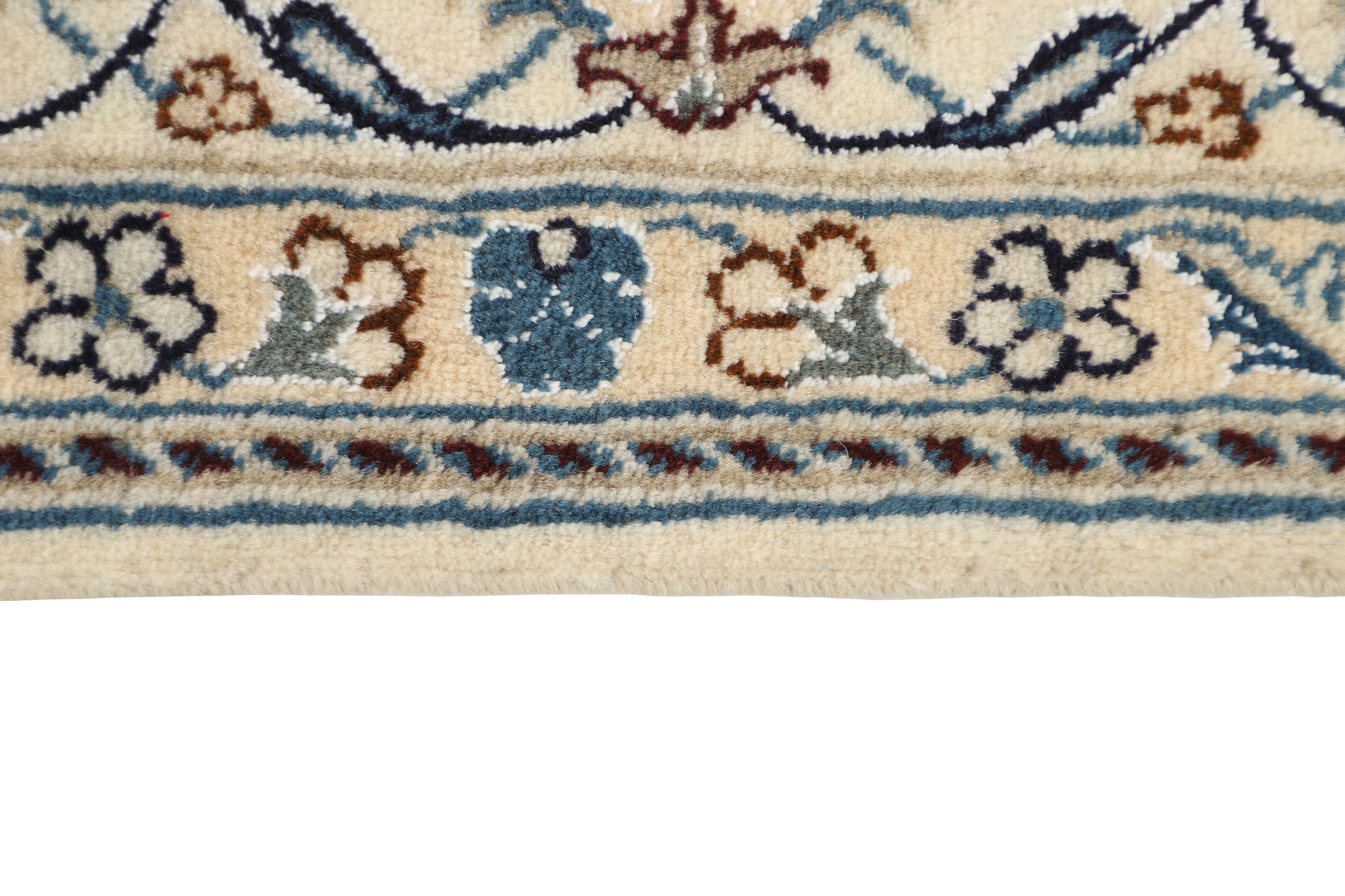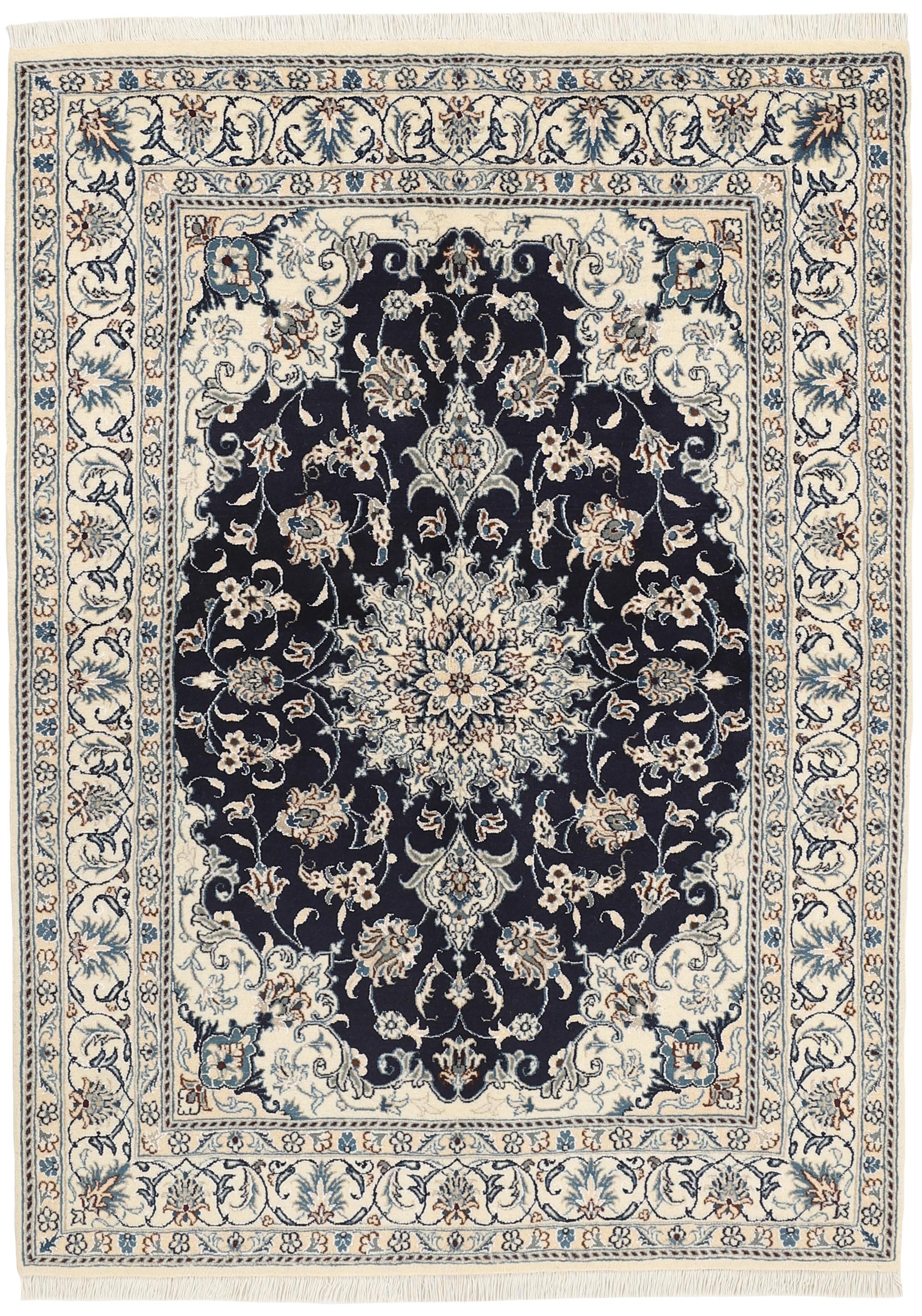 Nain KashmarItem no.: 1519872 Size: 149 cm x 205 cmNain is a city of about 50.000 people, located in the Isfahan Province. It has historic significance, since it was the last stop on caravan routes before Kavir-a-Lut, one of the deserts that stretch through the centre of Iran. The Nain Mosque is one of Iran’s oldest, and is built far better than the later and more famous mosques of Isfahan. The industry in Nain was traditionally focused on the production of wool garments, but the weavers switched to rug production when the demand fell. Their new products soon became famous, as the weavers were skilled and used good quality materials. The warp and weft are cotton, with a wool pile and contours of silk. Sometimes, silk is used more in the base. The colours are refined; nuances of ivory and cream, with small areas of red, green, and blue. As with the rugs from Isfahan, the patterns of the Nain rugs are also classical. The Nain rugs are made in all sizes, including the very large of up to 60m2, and some of these have a pure silk pile. The largest Nain rug produced was 20 by 20 metres.