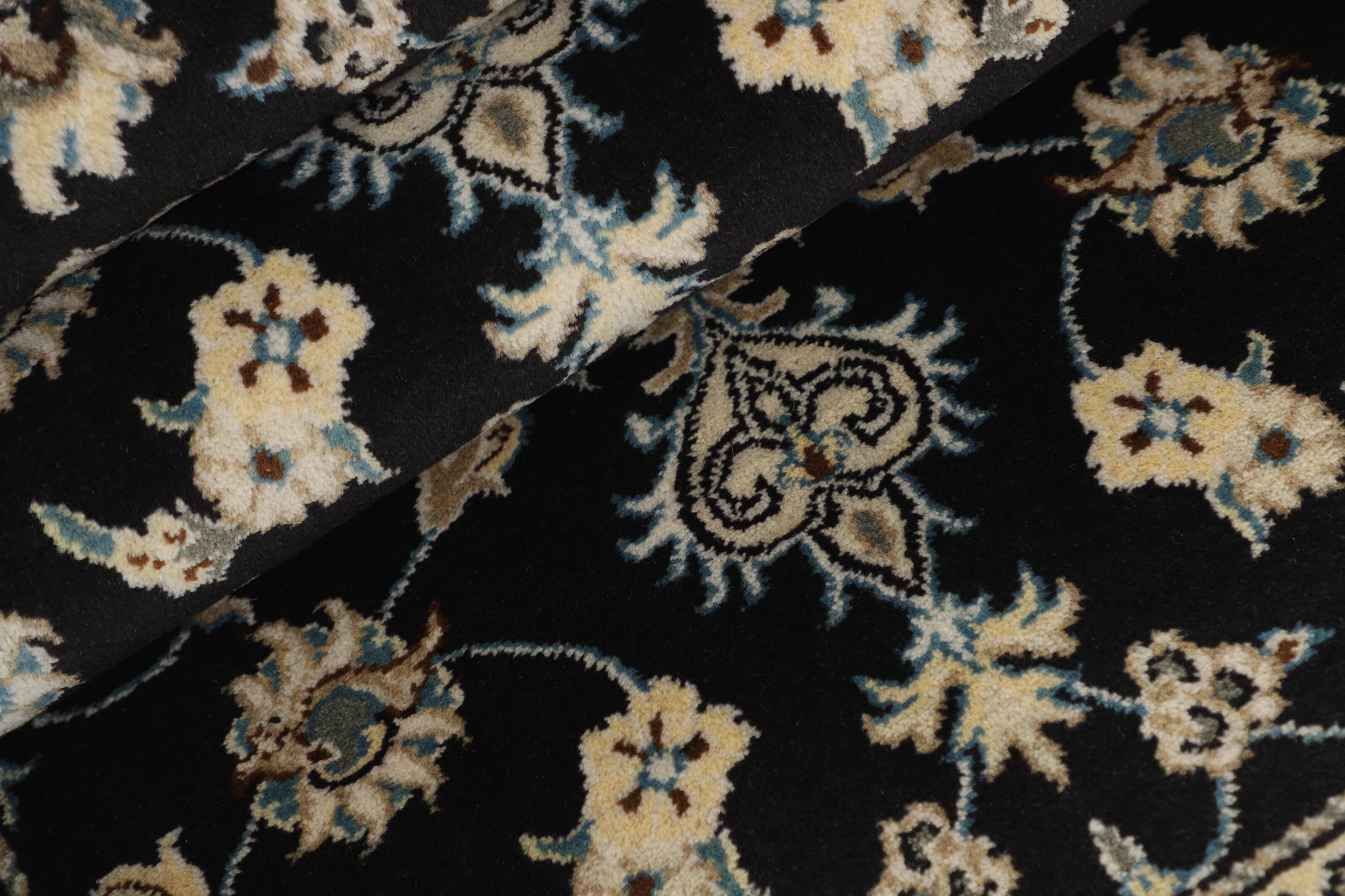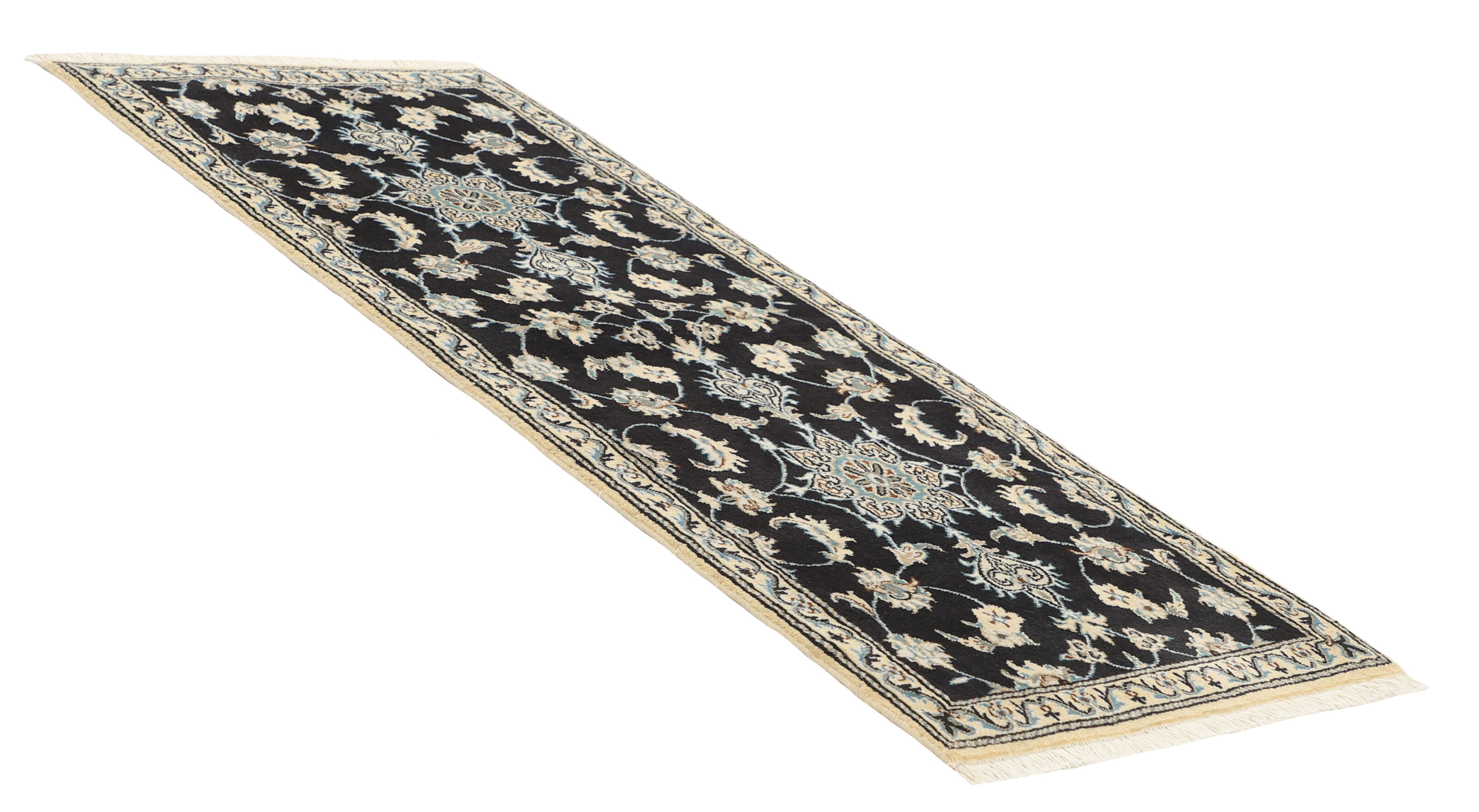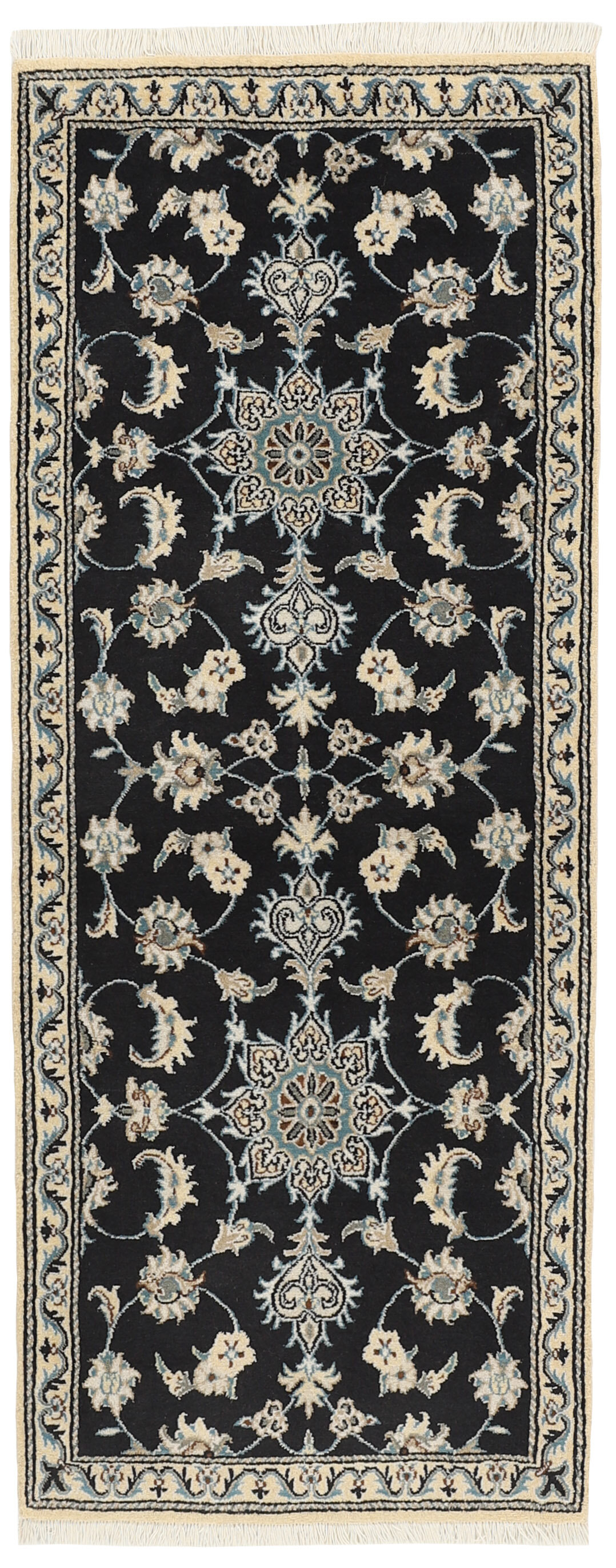 Nain KashmarItem no.: 1519879 Size: 78 cm x 193 cmNain is a city of about 50.000 people, located in the Isfahan Province. It has historic significance, since it was the last stop on caravan routes before Kavir-a-Lut, one of the deserts that stretch through the centre of Iran. The Nain Mosque is one of Iran’s oldest, and is built far better than the later and more famous mosques of Isfahan. The industry in Nain was traditionally focused on the production of wool garments, but the weavers switched to rug production when the demand fell. Their new products soon became famous, as the weavers were skilled and used good quality materials. The warp and weft are cotton, with a wool pile and contours of silk. Sometimes, silk is used more in the base. The colours are refined; nuances of ivory and cream, with small areas of red, green, and blue. As with the rugs from Isfahan, the patterns of the Nain rugs are also classical. The Nain rugs are made in all sizes, including the very large of up to 60m2, and some of these have a pure silk pile. The largest Nain rug produced was 20 by 20 metres.