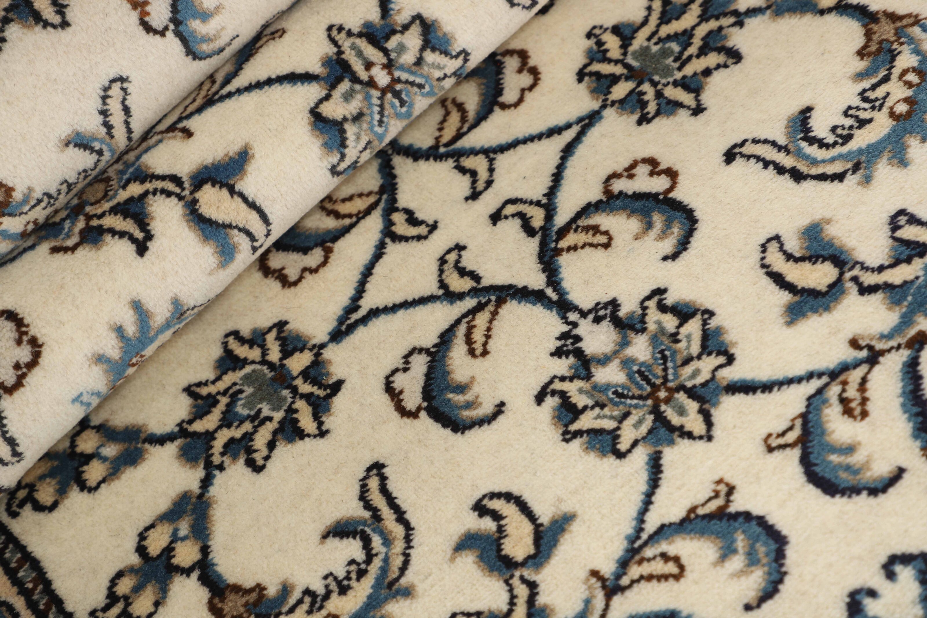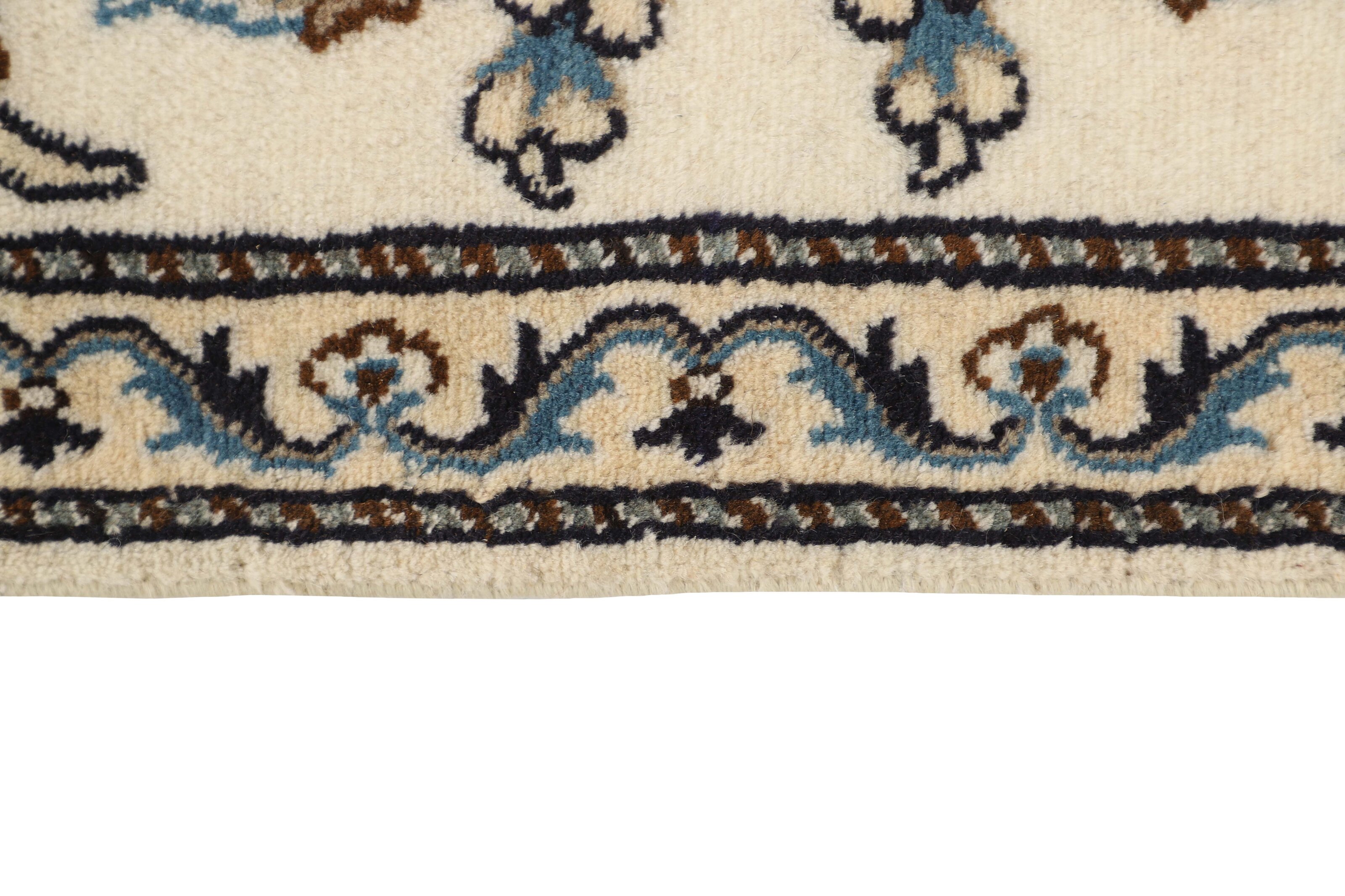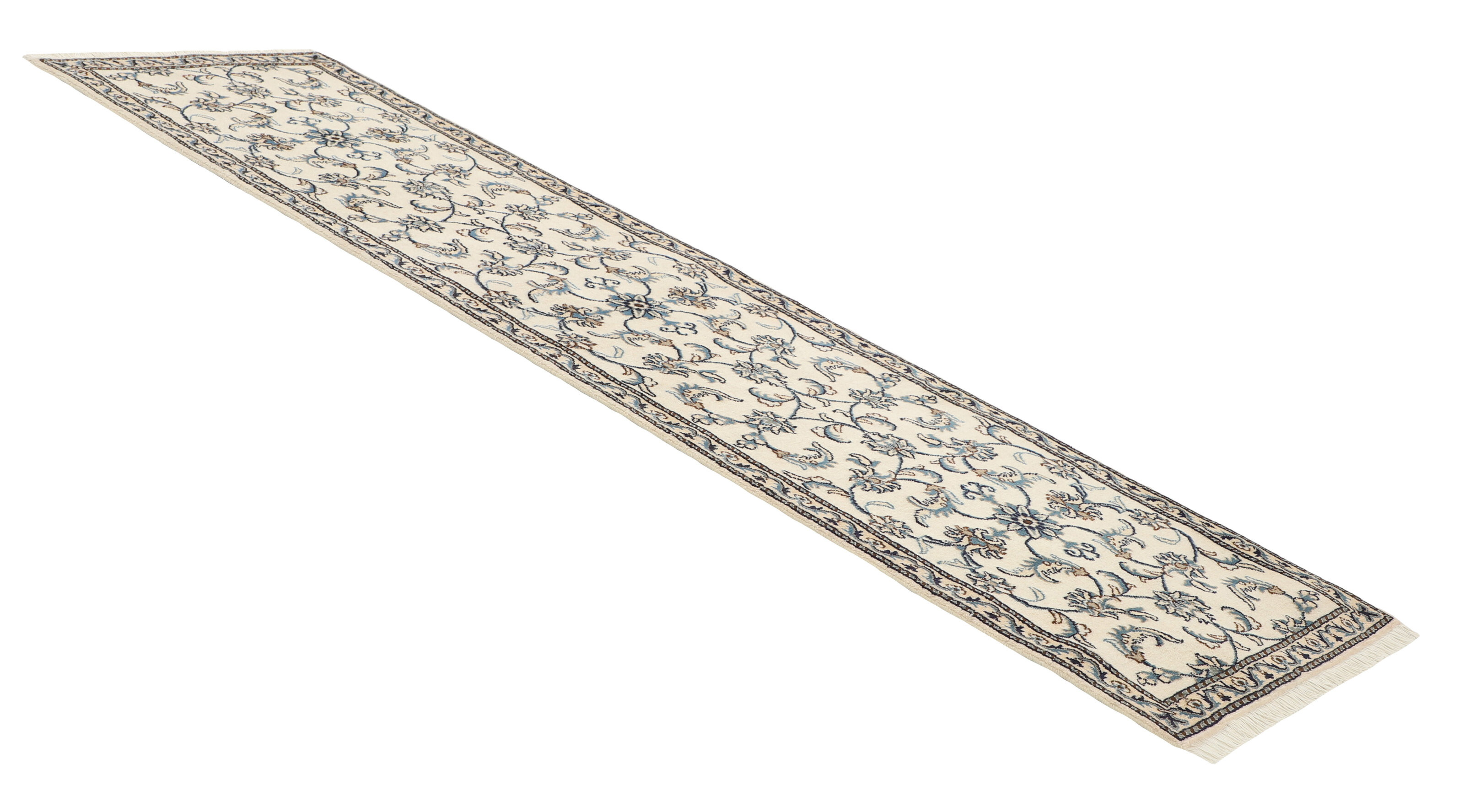 Nain KashmarItem no.: 1519890 Size: 76 cm x 293 cmNain is a city of about 50.000 people, located in the Isfahan Province. It has historic significance, since it was the last stop on caravan routes before Kavir-a-Lut, one of the deserts that stretch through the centre of Iran. The Nain Mosque is one of Iran’s oldest, and is built far better than the later and more famous mosques of Isfahan. The industry in Nain was traditionally focused on the production of wool garments, but the weavers switched to rug production when the demand fell. Their new products soon became famous, as the weavers were skilled and used good quality materials. The warp and weft are cotton, with a wool pile and contours of silk. Sometimes, silk is used more in the base. The colours are refined; nuances of ivory and cream, with small areas of red, green, and blue. As with the rugs from Isfahan, the patterns of the Nain rugs are also classical. The Nain rugs are made in all sizes, including the very large of up to 60m2, and some of these have a pure silk pile. The largest Nain rug produced was 20 by 20 metres.