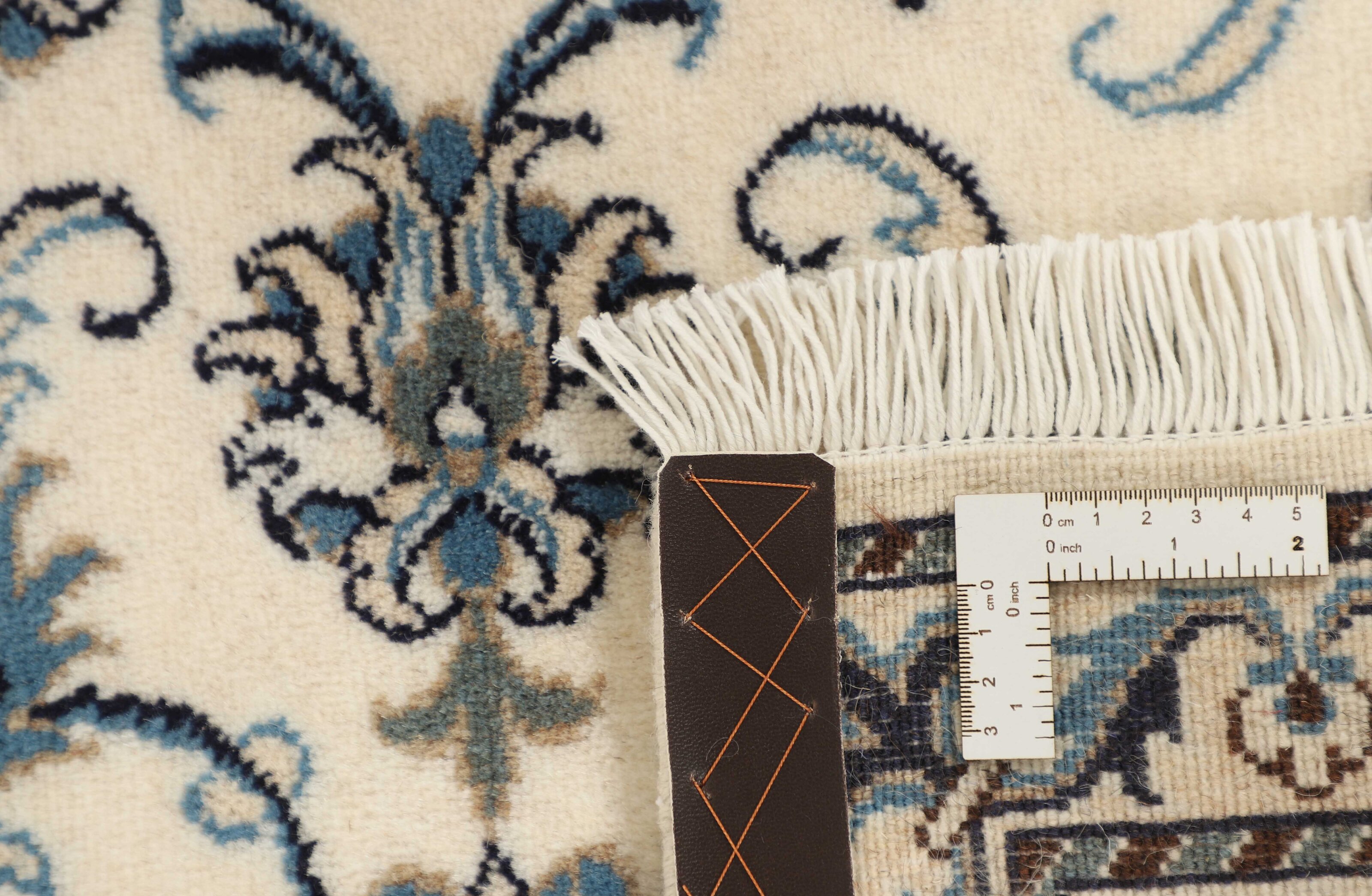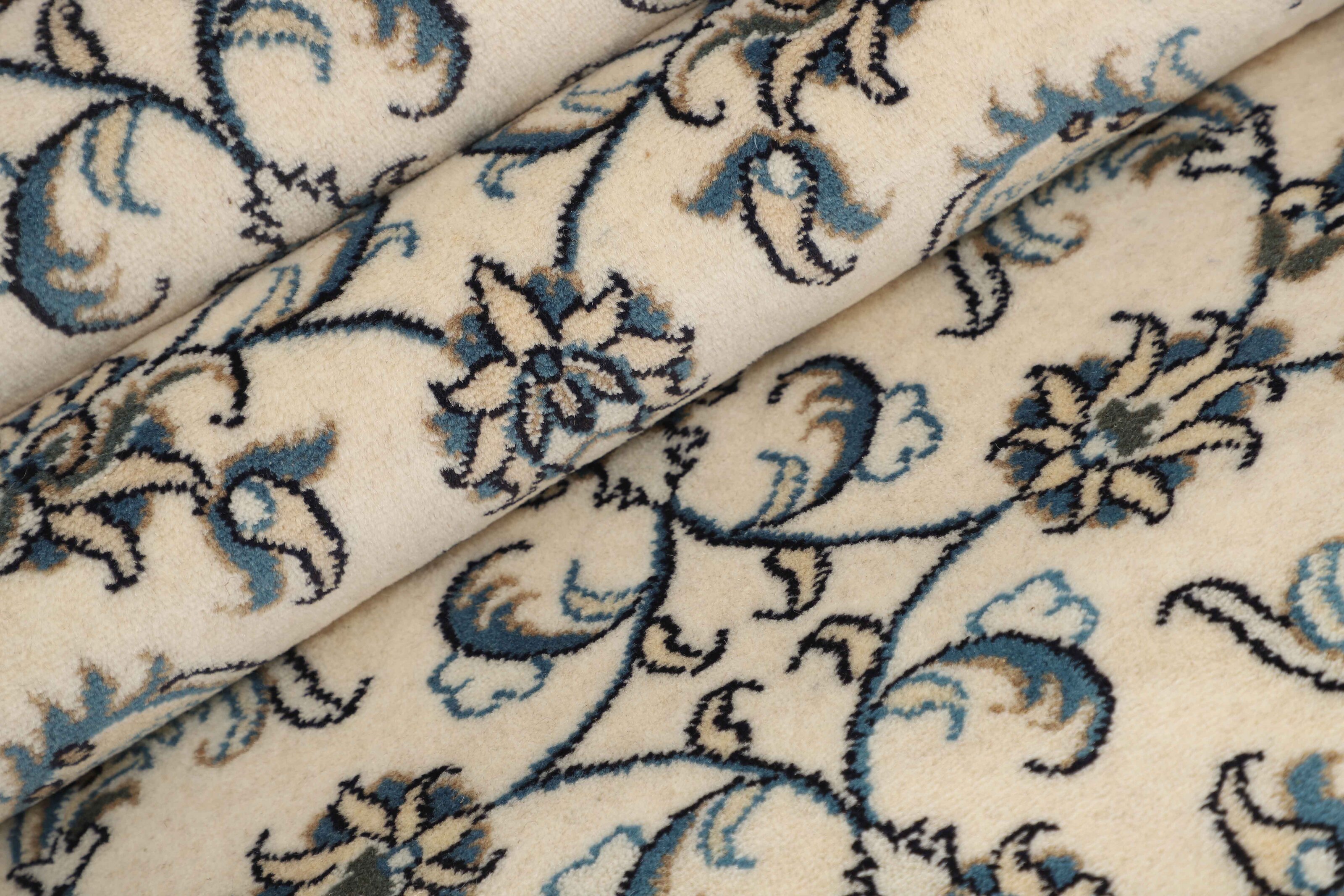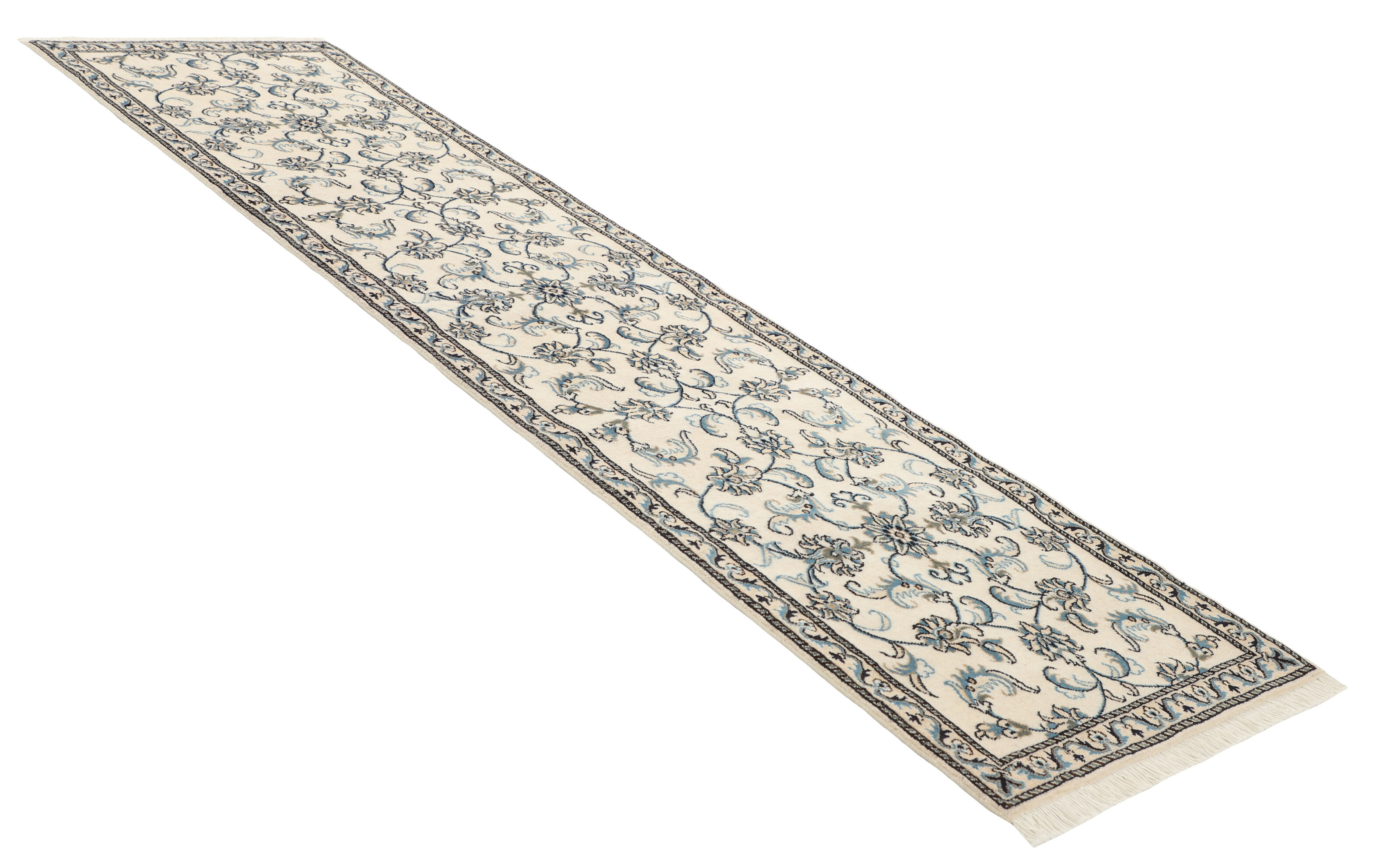 Nain KashmarItem no.: 1519891 Size: 79 cm x 298 cmNain is a city of about 50.000 people, located in the Isfahan Province. It has historic significance, since it was the last stop on caravan routes before Kavir-a-Lut, one of the deserts that stretch through the centre of Iran. The Nain Mosque is one of Iran’s oldest, and is built far better than the later and more famous mosques of Isfahan. The industry in Nain was traditionally focused on the production of wool garments, but the weavers switched to rug production when the demand fell. Their new products soon became famous, as the weavers were skilled and used good quality materials. The warp and weft are cotton, with a wool pile and contours of silk. Sometimes, silk is used more in the base. The colours are refined; nuances of ivory and cream, with small areas of red, green, and blue. As with the rugs from Isfahan, the patterns of the Nain rugs are also classical. The Nain rugs are made in all sizes, including the very large of up to 60m2, and some of these have a pure silk pile. The largest Nain rug produced was 20 by 20 metres.