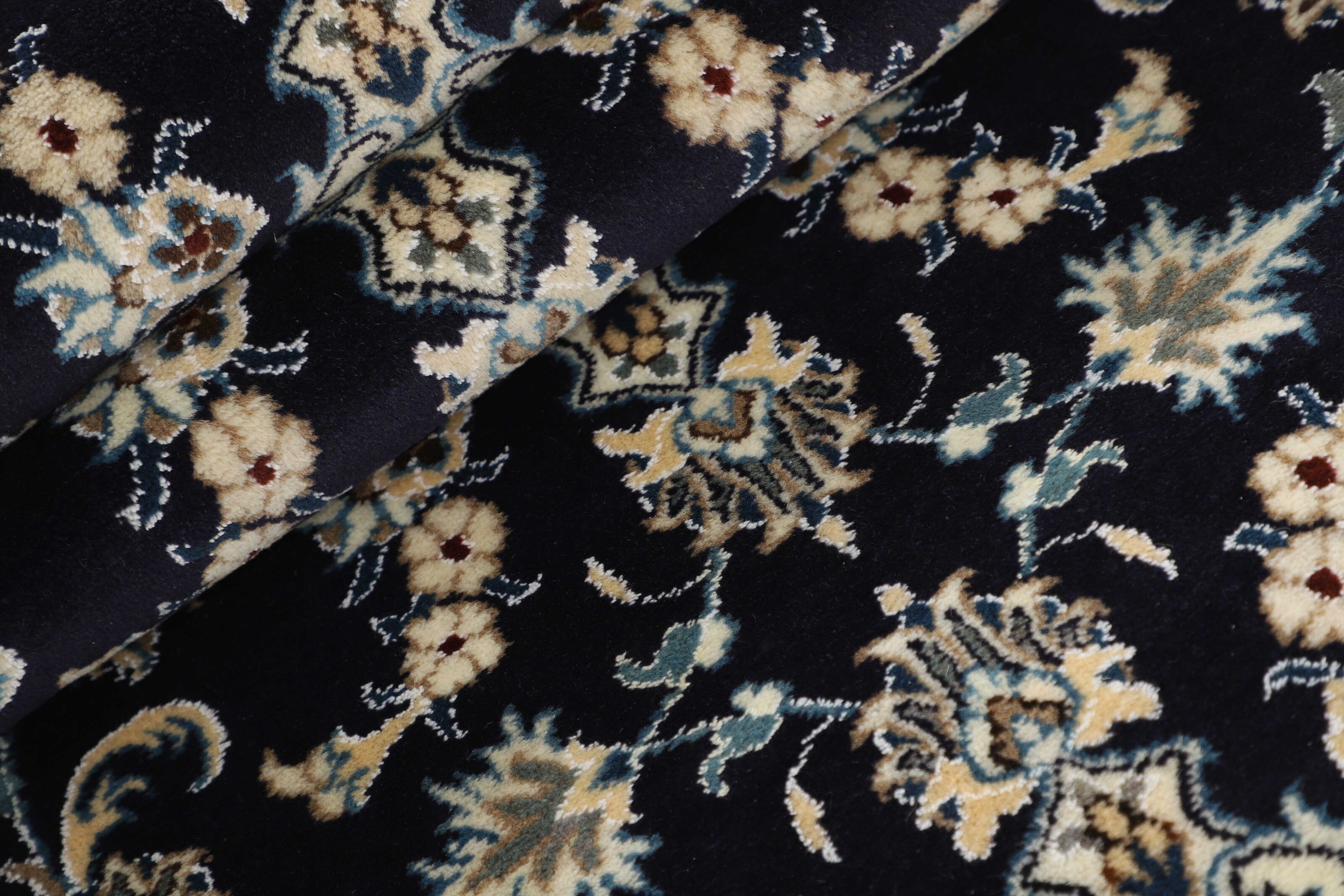 Nain KashmarItem no.: 1519893 Size: 75 cm x 292 cmNain is a city of about 50.000 people, located in the Isfahan Province. It has historic significance, since it was the last stop on caravan routes before Kavir-a-Lut, one of the deserts that stretch through the centre of Iran. The Nain Mosque is one of Iran’s oldest, and is built far better than the later and more famous mosques of Isfahan. The industry in Nain was traditionally focused on the production of wool garments, but the weavers switched to rug production when the demand fell. Their new products soon became famous, as the weavers were skilled and used good quality materials. The warp and weft are cotton, with a wool pile and contours of silk. Sometimes, silk is used more in the base. The colours are refined; nuances of ivory and cream, with small areas of red, green, and blue. As with the rugs from Isfahan, the patterns of the Nain rugs are also classical. The Nain rugs are made in all sizes, including the very large of up to 60m2, and some of these have a pure silk pile. The largest Nain rug produced was 20 by 20 metres.