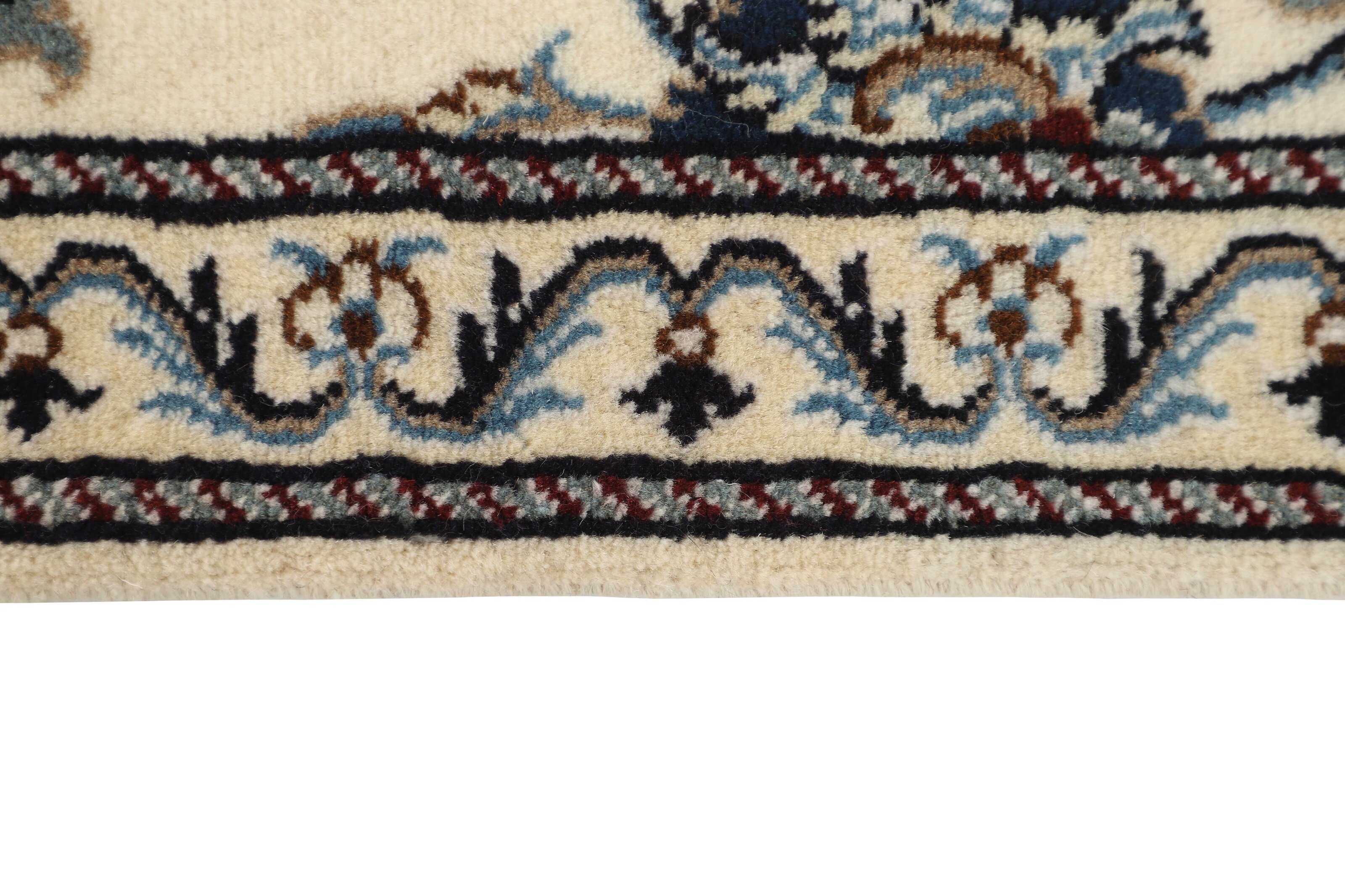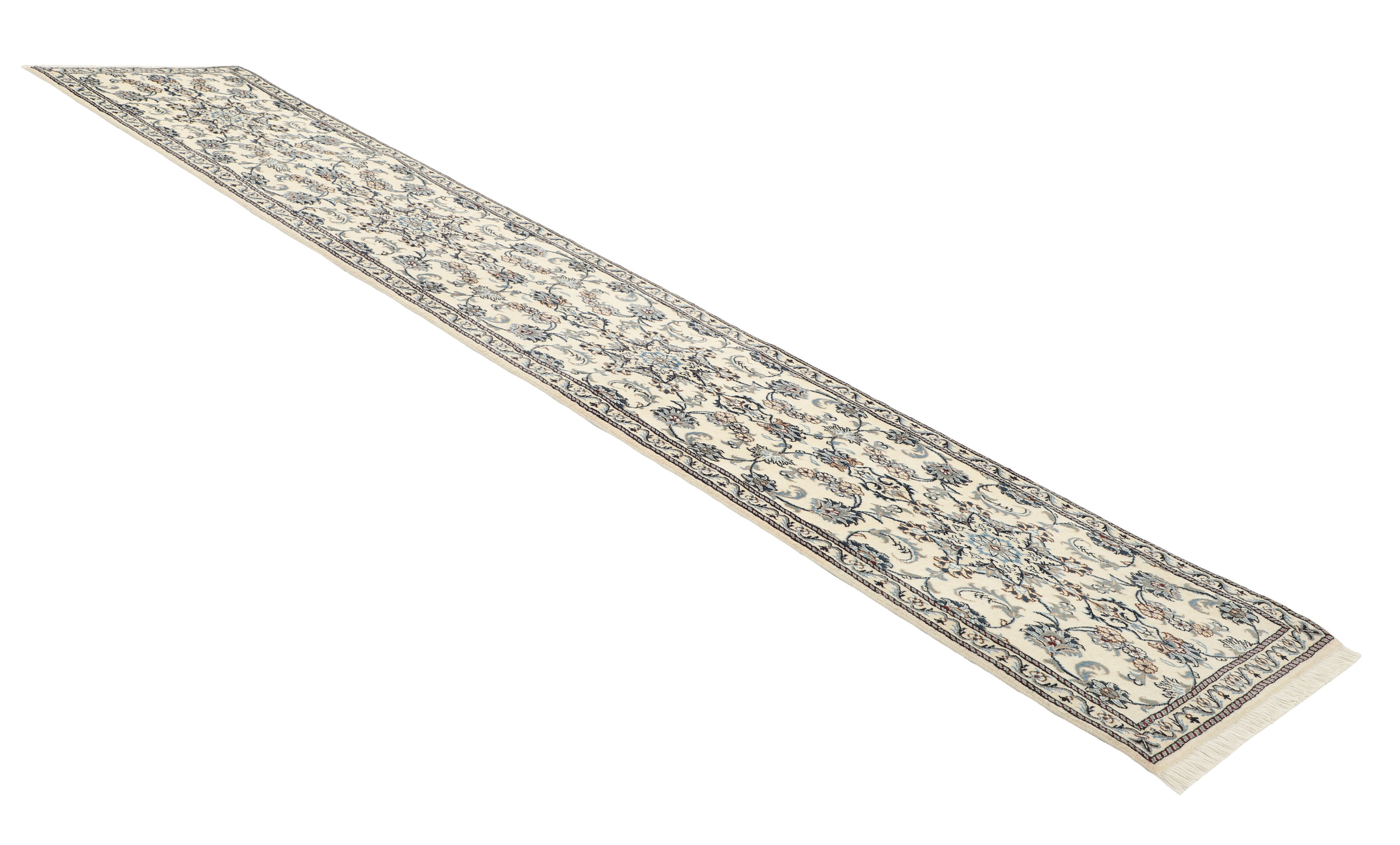 Nain KashmarItem no.: 1519896 Size: 71 cm x 389 cmNain is a city of about 50.000 people, located in the Isfahan Province. It has historic significance, since it was the last stop on caravan routes before Kavir-a-Lut, one of the deserts that stretch through the centre of Iran. The Nain Mosque is one of Iran’s oldest, and is built far better than the later and more famous mosques of Isfahan. The industry in Nain was traditionally focused on the production of wool garments, but the weavers switched to rug production when the demand fell. Their new products soon became famous, as the weavers were skilled and used good quality materials. The warp and weft are cotton, with a wool pile and contours of silk. Sometimes, silk is used more in the base. The colours are refined; nuances of ivory and cream, with small areas of red, green, and blue. As with the rugs from Isfahan, the patterns of the Nain rugs are also classical. The Nain rugs are made in all sizes, including the very large of up to 60m2, and some of these have a pure silk pile. The largest Nain rug produced was 20 by 20 metres.