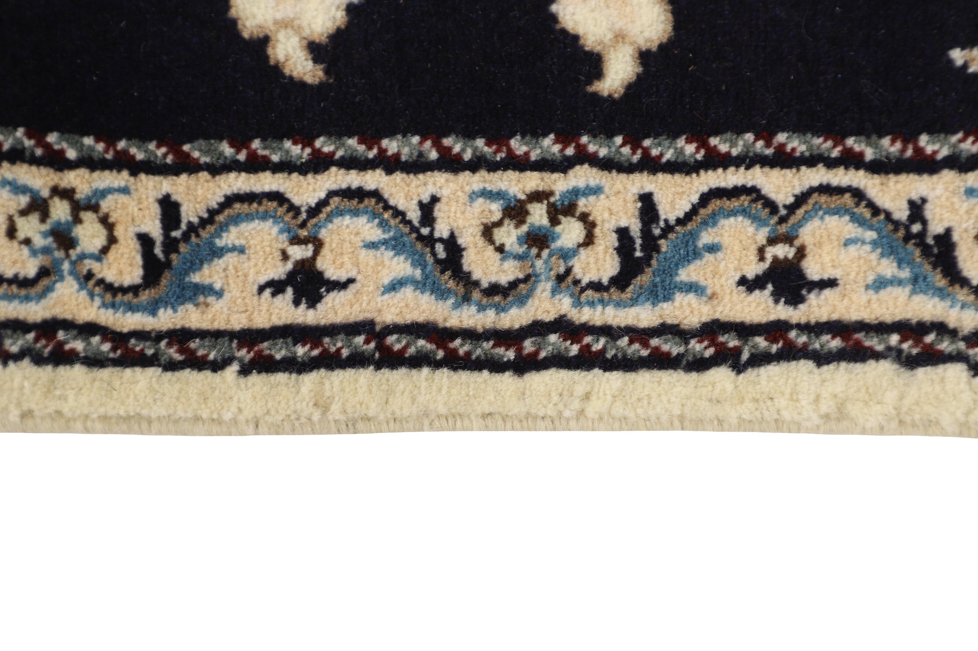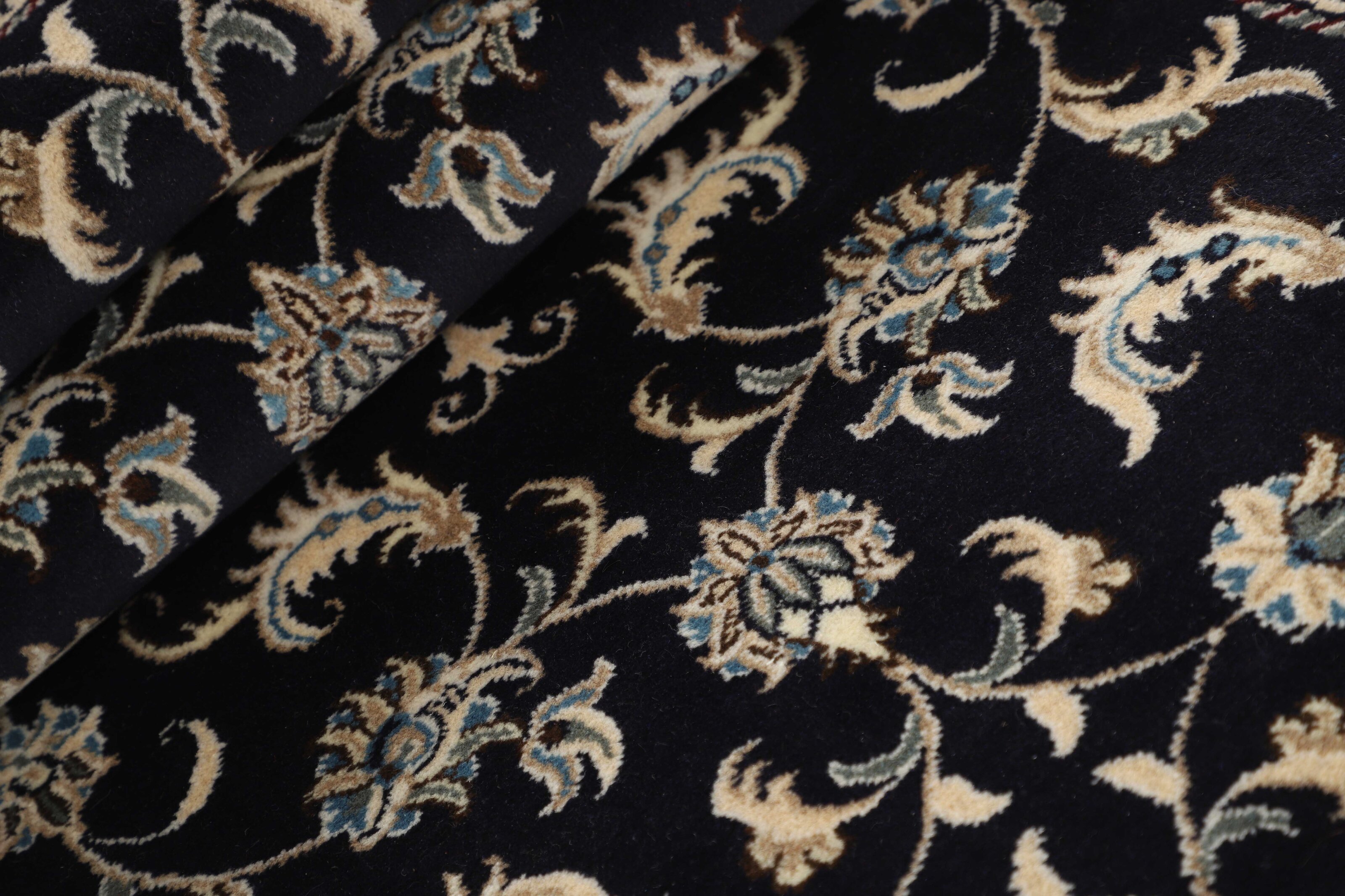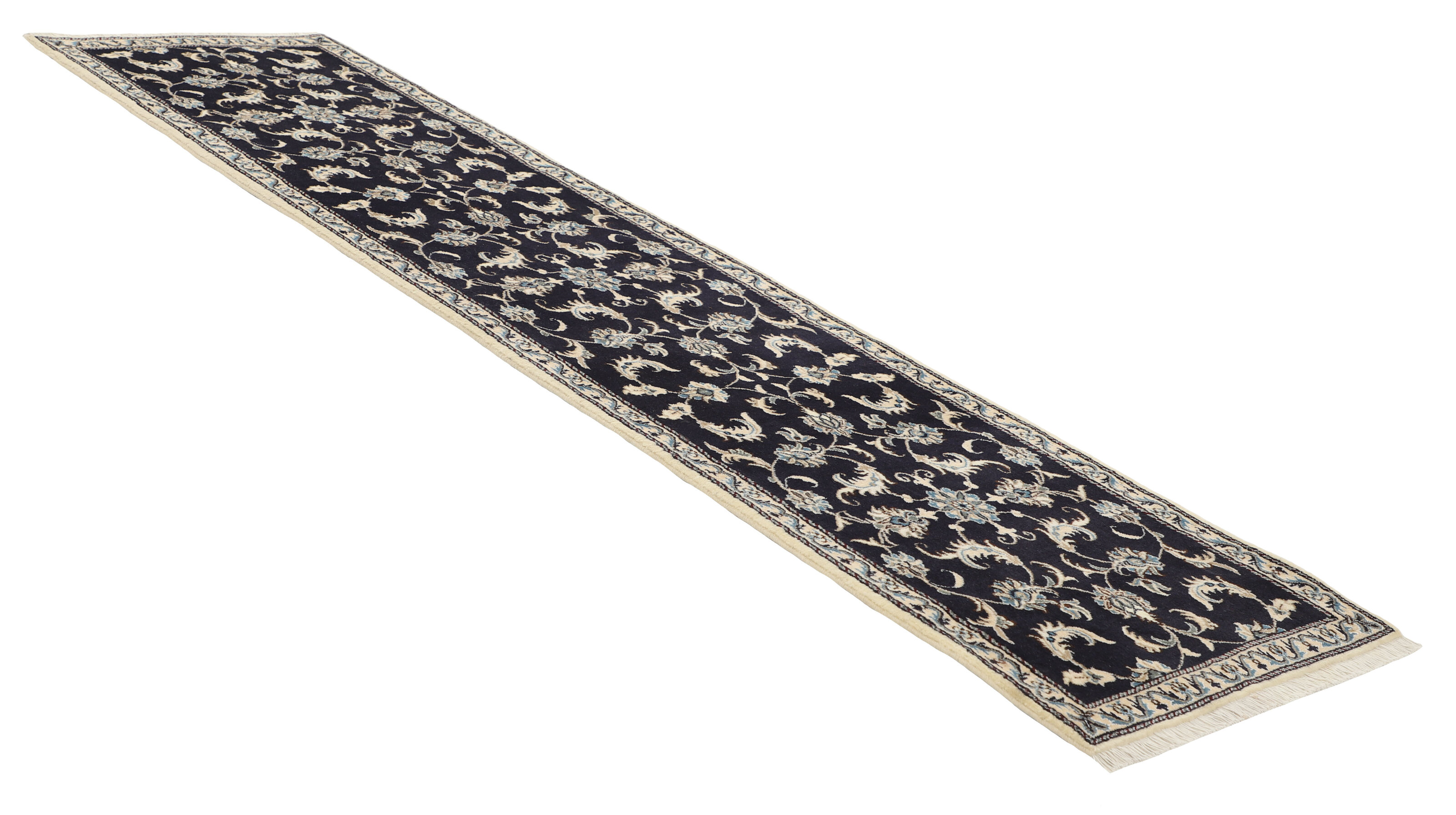 Nain KashmarItem no.: 1519903 Size: 76 cm x 291 cmNain is a city of about 50.000 people, located in the Isfahan Province. It has historic significance, since it was the last stop on caravan routes before Kavir-a-Lut, one of the deserts that stretch through the centre of Iran. The Nain Mosque is one of Iran’s oldest, and is built far better than the later and more famous mosques of Isfahan. The industry in Nain was traditionally focused on the production of wool garments, but the weavers switched to rug production when the demand fell. Their new products soon became famous, as the weavers were skilled and used good quality materials. The warp and weft are cotton, with a wool pile and contours of silk. Sometimes, silk is used more in the base. The colours are refined; nuances of ivory and cream, with small areas of red, green, and blue. As with the rugs from Isfahan, the patterns of the Nain rugs are also classical. The Nain rugs are made in all sizes, including the very large of up to 60m2, and some of these have a pure silk pile. The largest Nain rug produced was 20 by 20 metres.