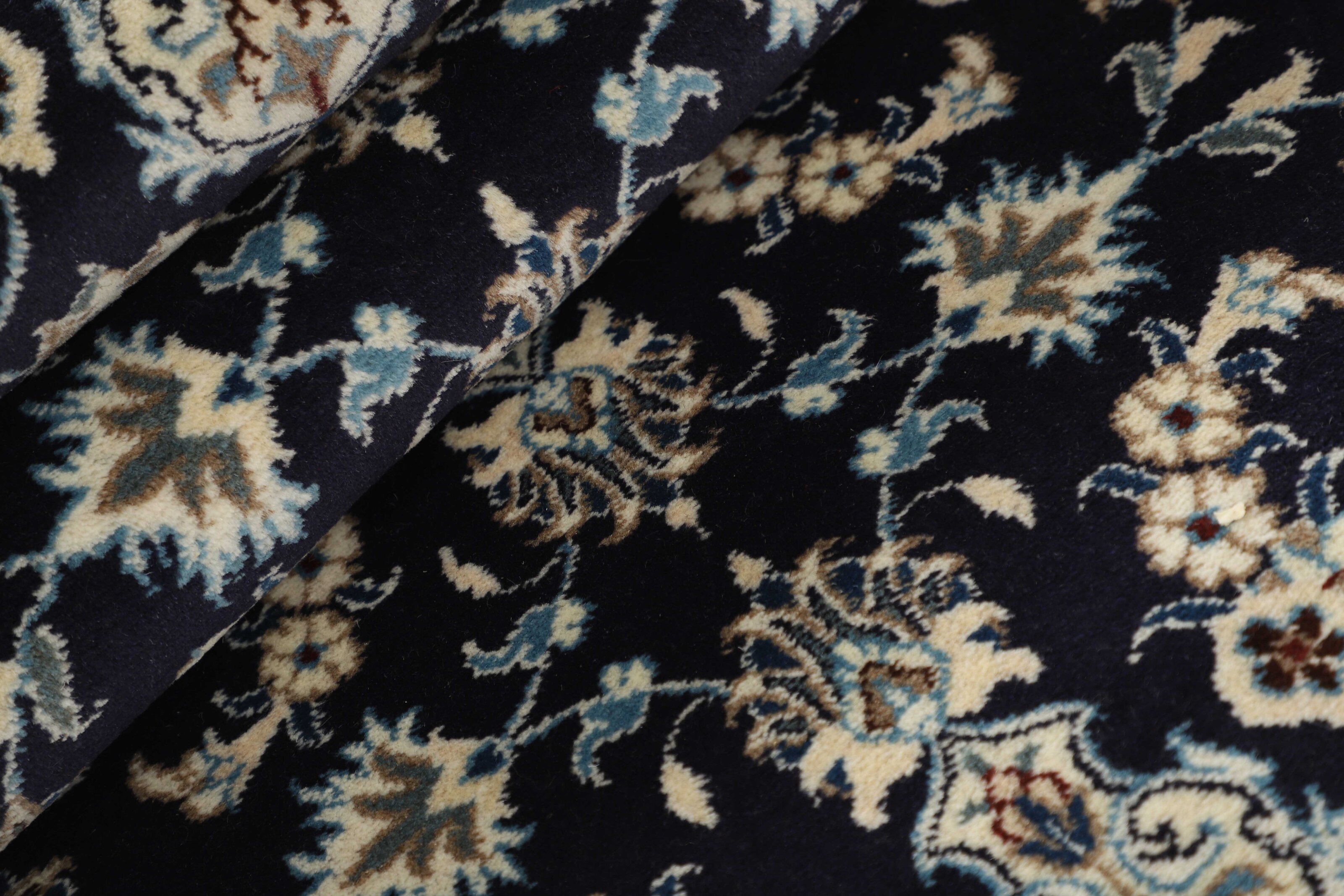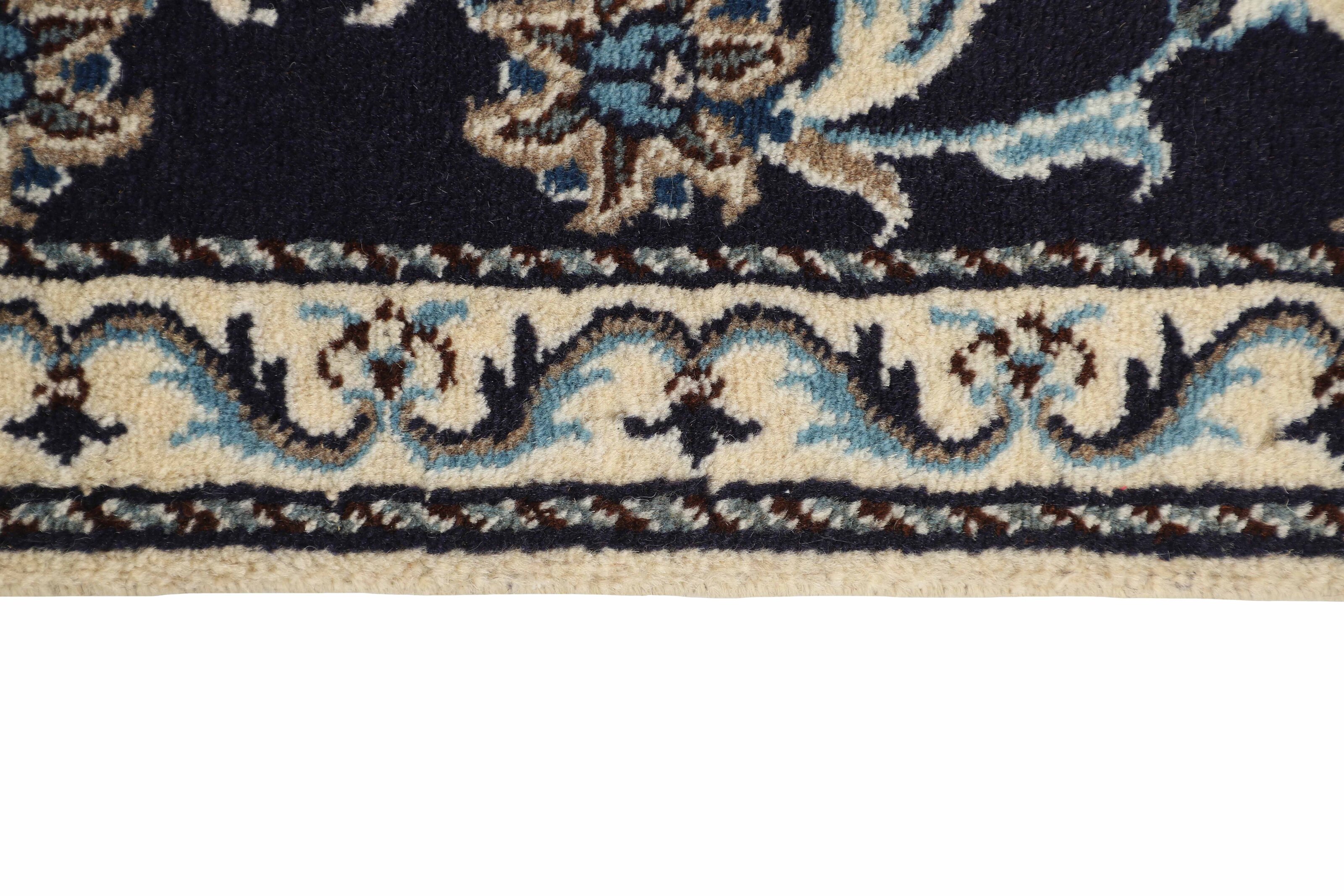 Nain KashmarItem no.: 1519904 Size: 78 cm x 387 cmNain is a city of about 50.000 people, located in the Isfahan Province. It has historic significance, since it was the last stop on caravan routes before Kavir-a-Lut, one of the deserts that stretch through the centre of Iran. The Nain Mosque is one of Iran’s oldest, and is built far better than the later and more famous mosques of Isfahan. The industry in Nain was traditionally focused on the production of wool garments, but the weavers switched to rug production when the demand fell. Their new products soon became famous, as the weavers were skilled and used good quality materials. The warp and weft are cotton, with a wool pile and contours of silk. Sometimes, silk is used more in the base. The colours are refined; nuances of ivory and cream, with small areas of red, green, and blue. As with the rugs from Isfahan, the patterns of the Nain rugs are also classical. The Nain rugs are made in all sizes, including the very large of up to 60m2, and some of these have a pure silk pile. The largest Nain rug produced was 20 by 20 metres.