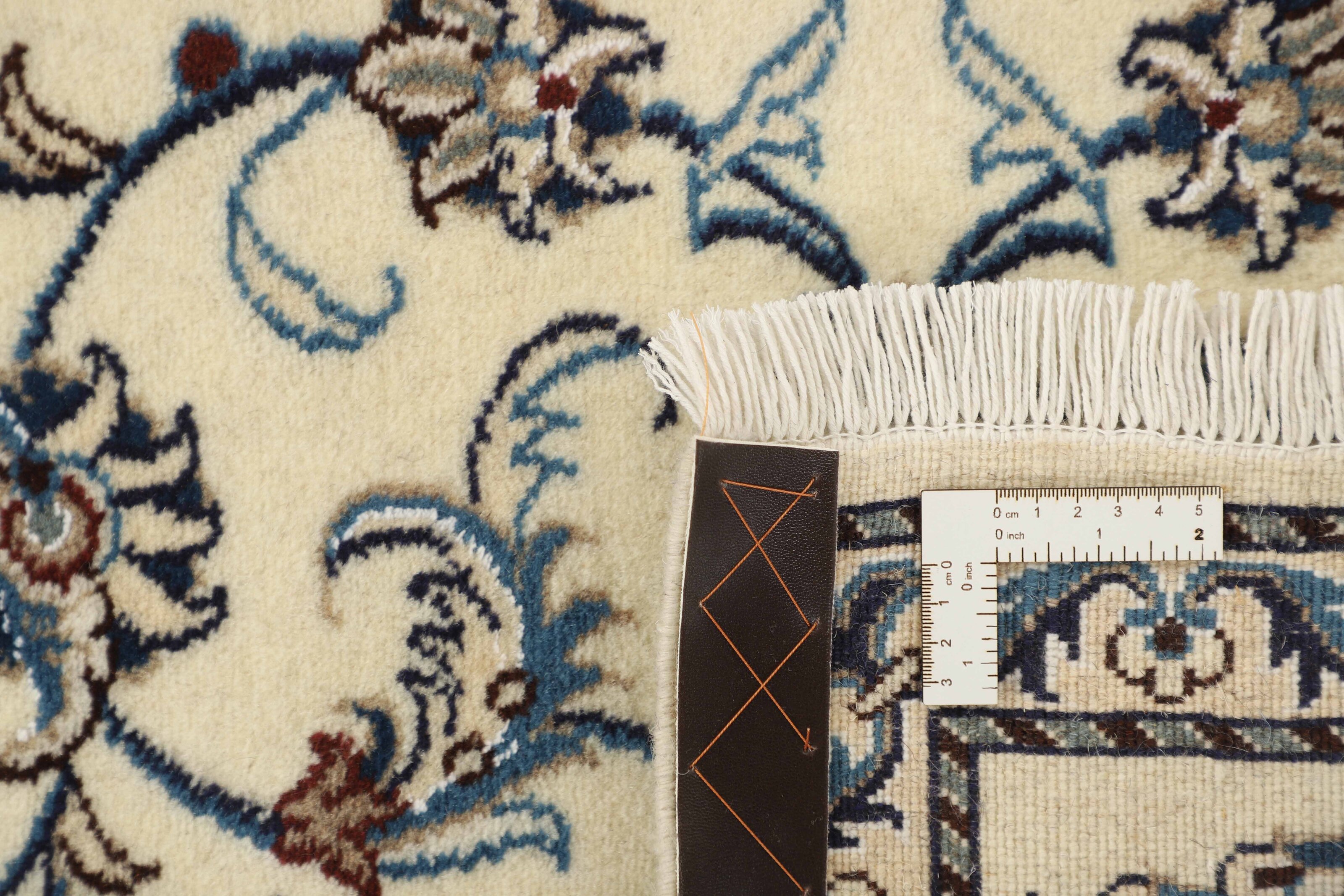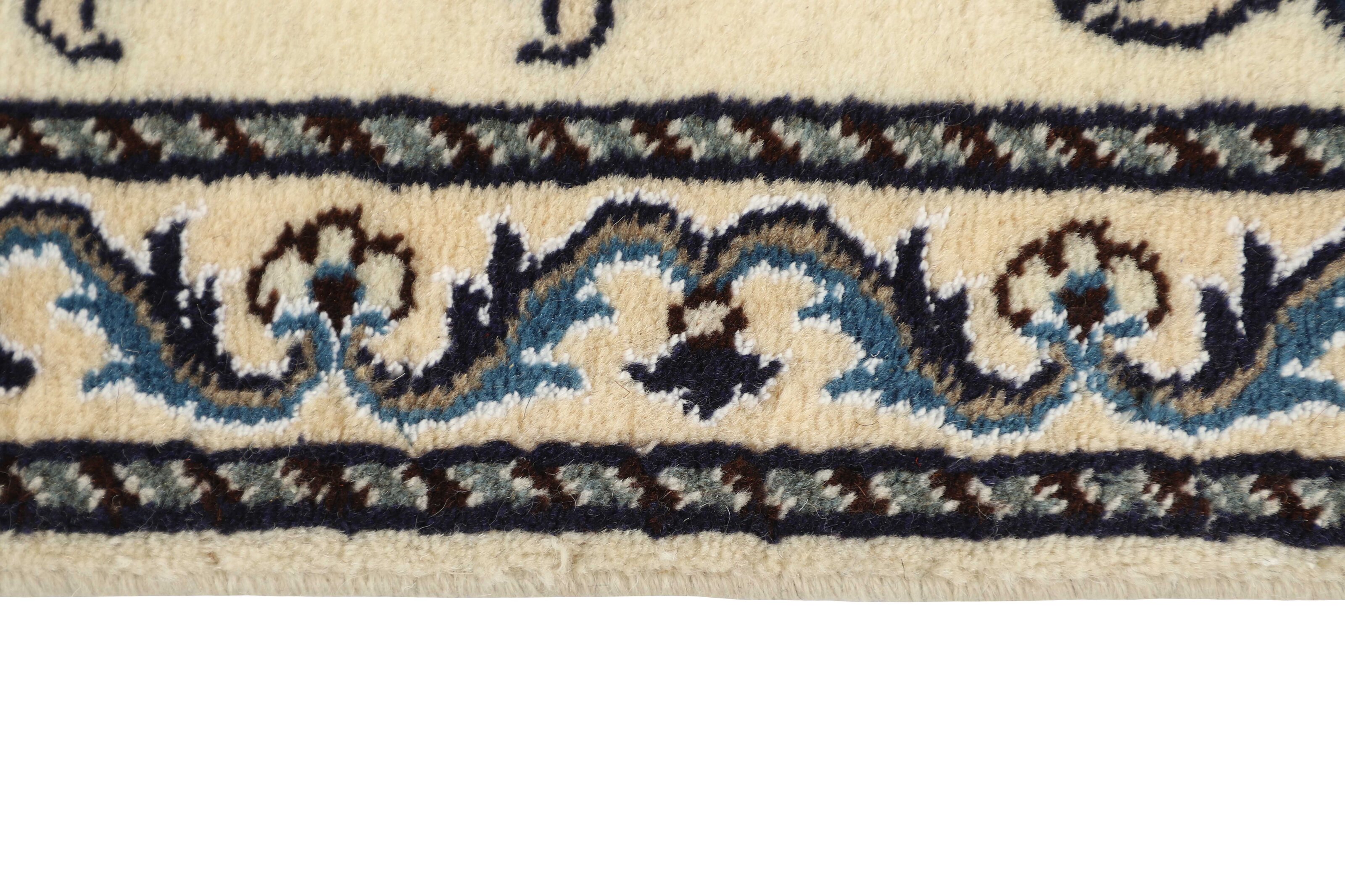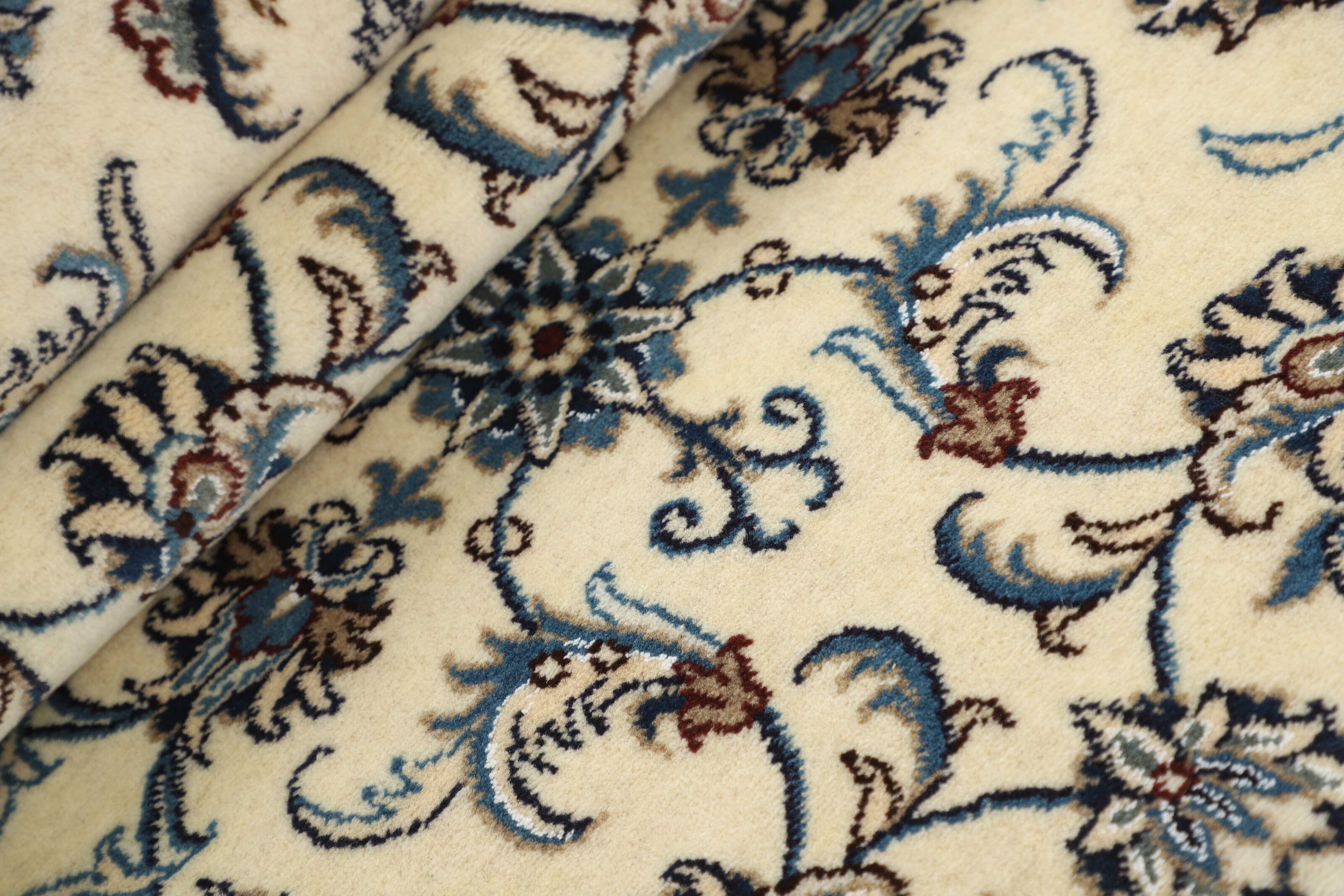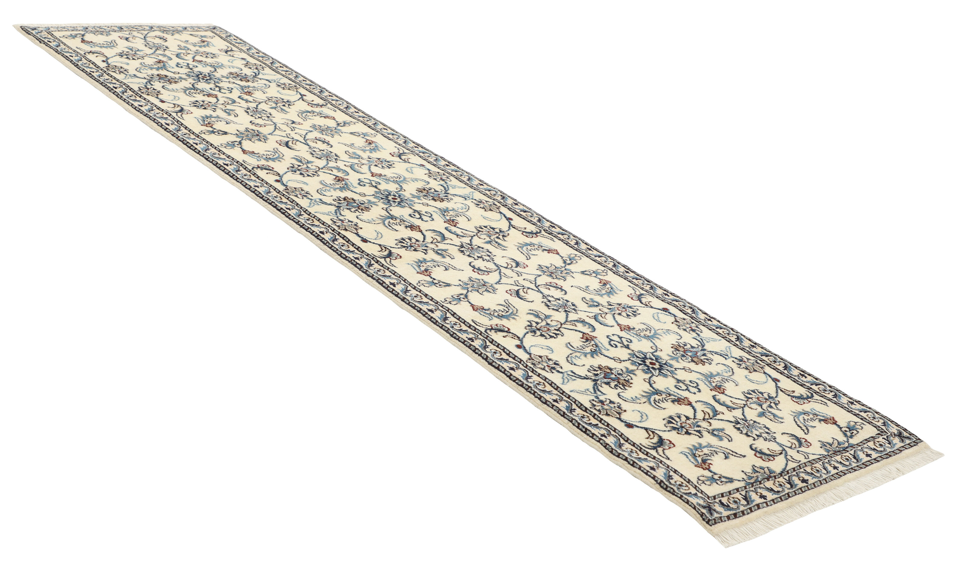 Nain KashmarItem no.: 1519905 Size: 77 cm x 300 cmNain is a city of about 50.000 people, located in the Isfahan Province. It has historic significance, since it was the last stop on caravan routes before Kavir-a-Lut, one of the deserts that stretch through the centre of Iran. The Nain Mosque is one of Iran’s oldest, and is built far better than the later and more famous mosques of Isfahan. The industry in Nain was traditionally focused on the production of wool garments, but the weavers switched to rug production when the demand fell. Their new products soon became famous, as the weavers were skilled and used good quality materials. The warp and weft are cotton, with a wool pile and contours of silk. Sometimes, silk is used more in the base. The colours are refined; nuances of ivory and cream, with small areas of red, green, and blue. As with the rugs from Isfahan, the patterns of the Nain rugs are also classical. The Nain rugs are made in all sizes, including the very large of up to 60m2, and some of these have a pure silk pile. The largest Nain rug produced was 20 by 20 metres.