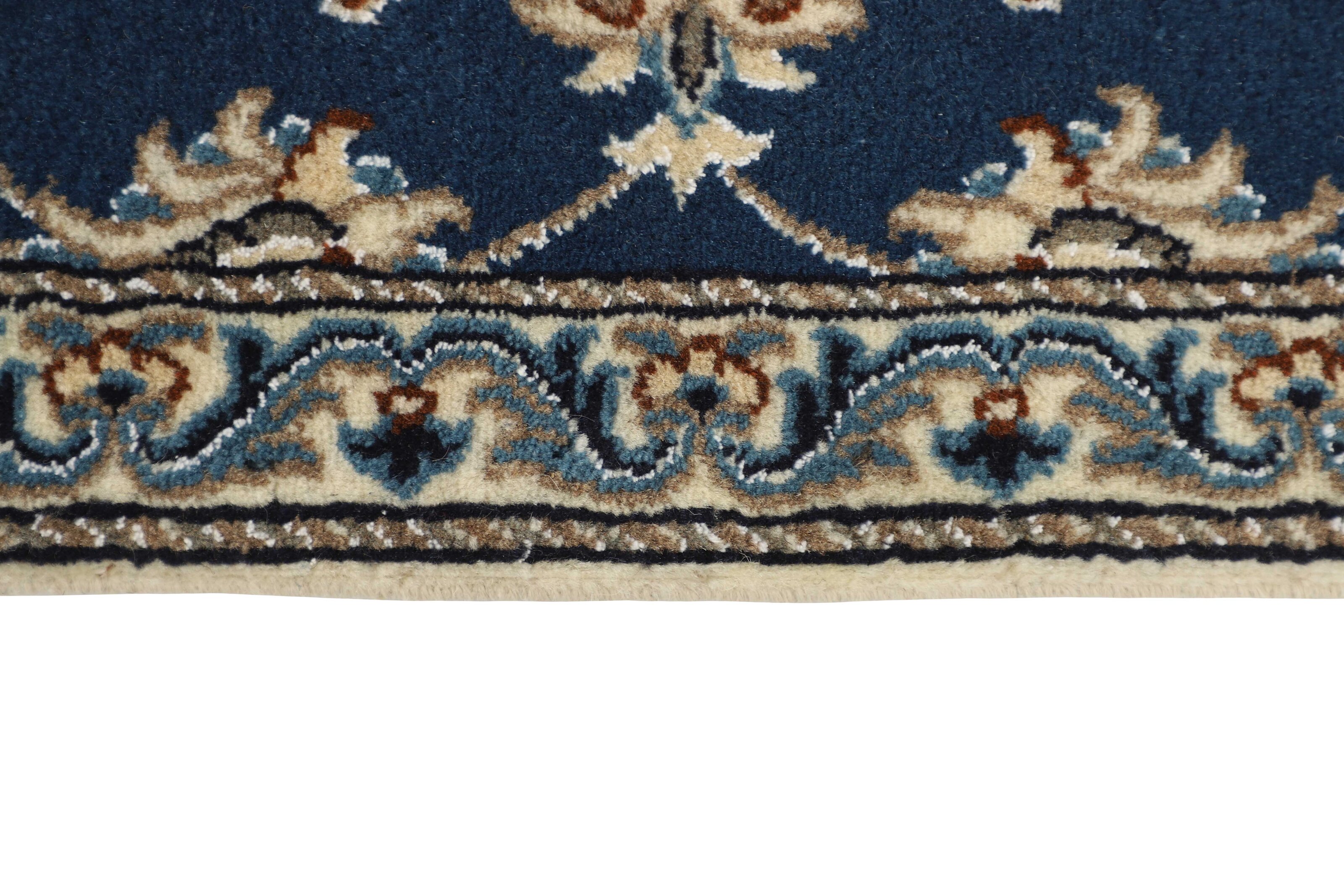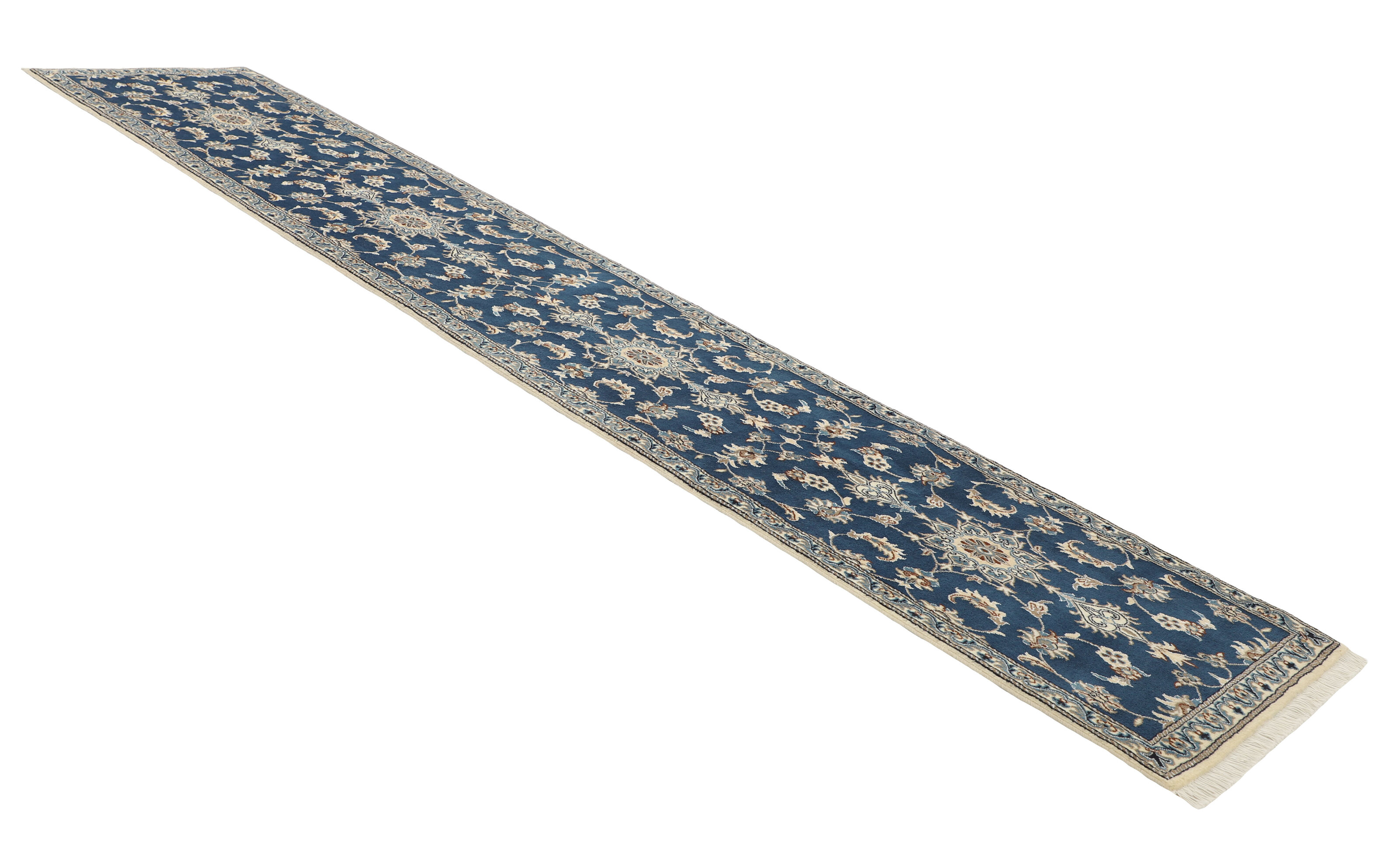 Nain KashmarItem no.: 1519909 Size: 77 cm x 390 cmNain is a city of about 50.000 people, located in the Isfahan Province. It has historic significance, since it was the last stop on caravan routes before Kavir-a-Lut, one of the deserts that stretch through the centre of Iran. The Nain Mosque is one of Iran’s oldest, and is built far better than the later and more famous mosques of Isfahan. The industry in Nain was traditionally focused on the production of wool garments, but the weavers switched to rug production when the demand fell. Their new products soon became famous, as the weavers were skilled and used good quality materials. The warp and weft are cotton, with a wool pile and contours of silk. Sometimes, silk is used more in the base. The colours are refined; nuances of ivory and cream, with small areas of red, green, and blue. As with the rugs from Isfahan, the patterns of the Nain rugs are also classical. The Nain rugs are made in all sizes, including the very large of up to 60m2, and some of these have a pure silk pile. The largest Nain rug produced was 20 by 20 metres.