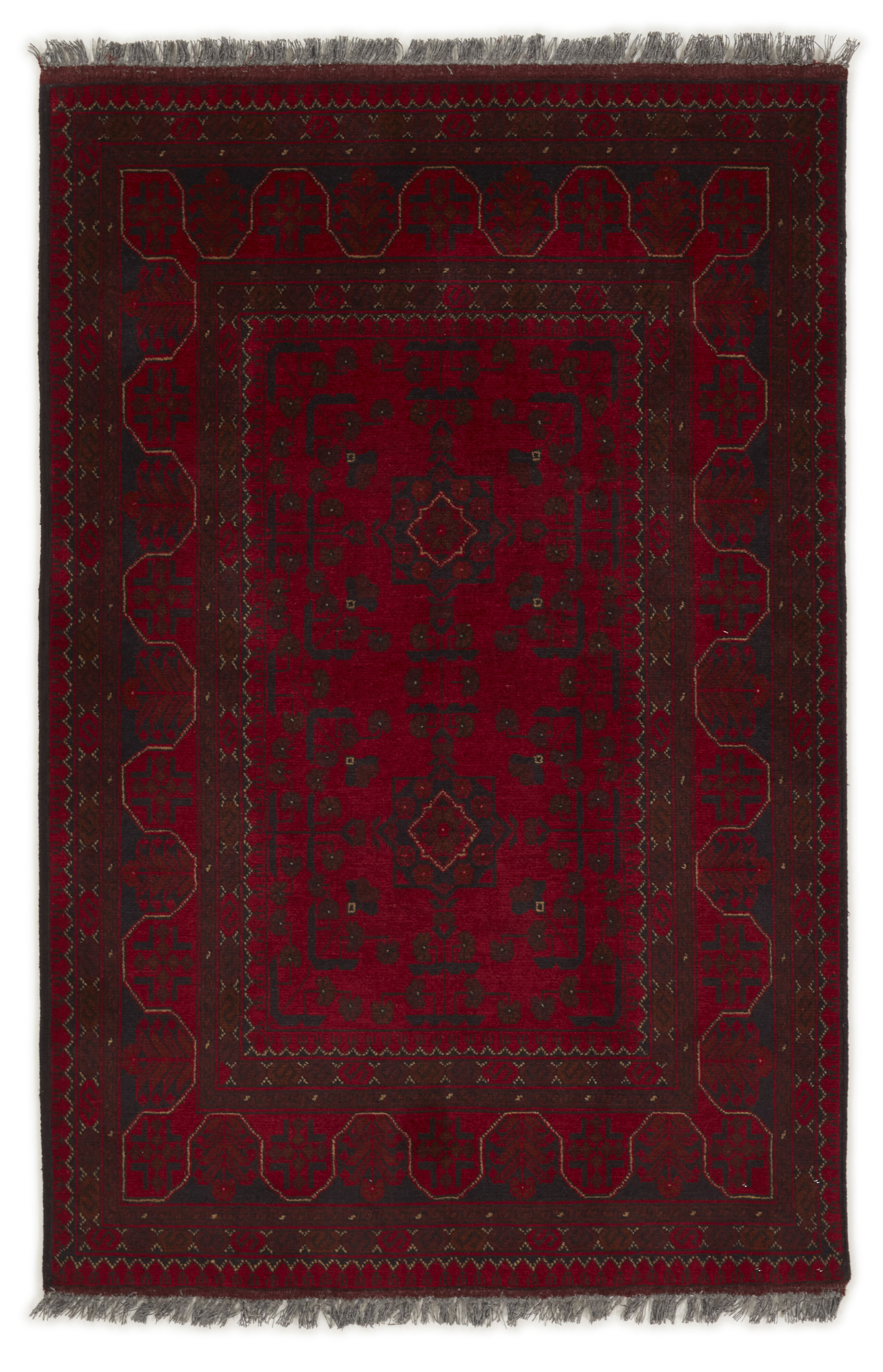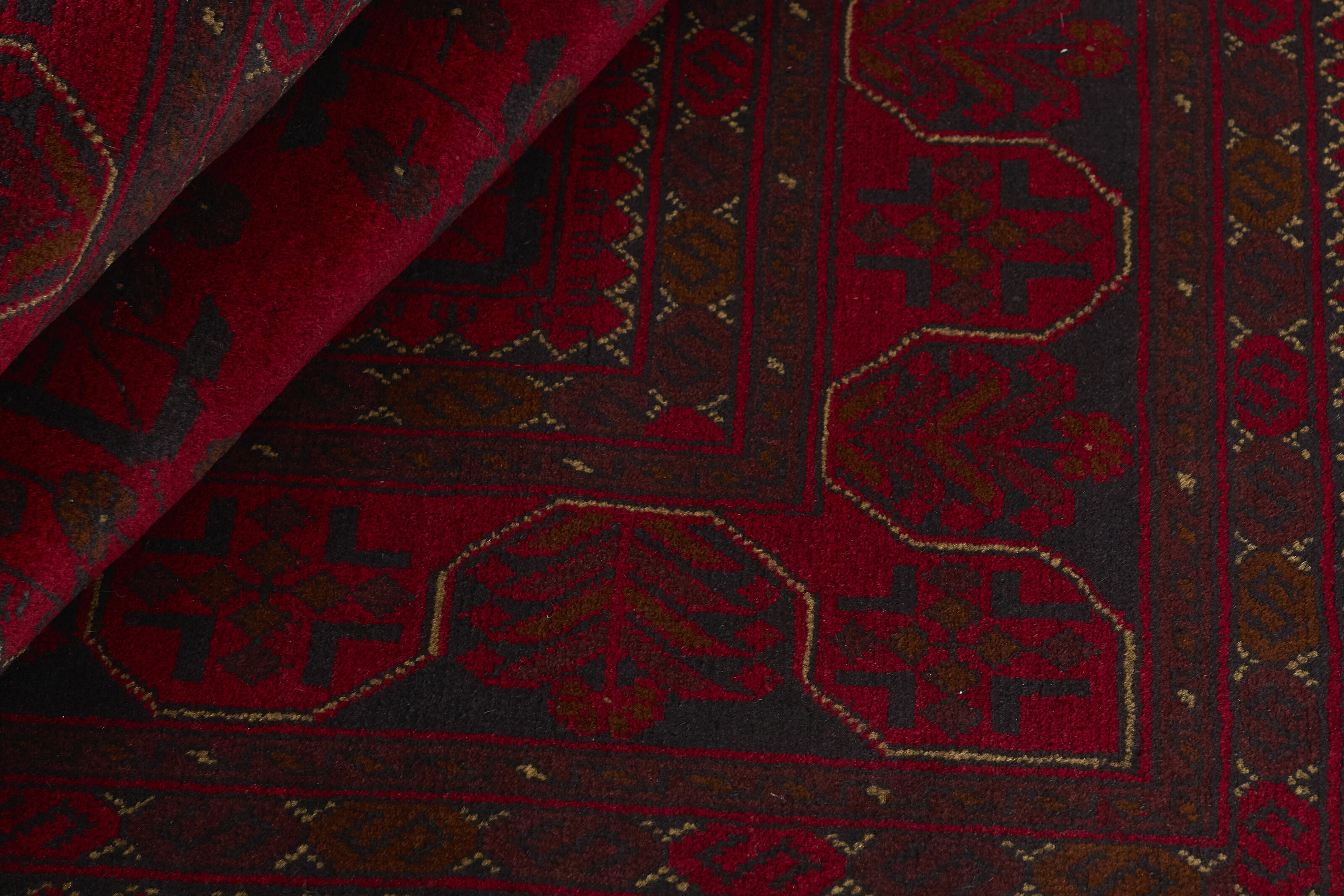 Two of the most popular Afghan rugs are Khal Mohammadi/Old Afghan, and Afghan Aktscha. Khal Mohammadi is handmade by Turkmens in northern Afghanistan. Both Turkmenistan to the North and Afghnaistan to the South are mostly inhabited by nomadic tribes. Kabul, the capitol of Afghanistan, and the city of Herat, are important centres for Afghan rugs. Characteristic of these rugs is the deep, warm, and fiery red base colour, the relatively high and sturdy pile, the wool base weave, the use of goat’s and horse’s hair, and knotting using the Seneh knot and the Gül (Elephant’s Foot) pattern. The base colour is a wide range of warm red nuances, from rust to copper brown. The pattern is a very dark blue, almost black, with ochre and ivory white colour.