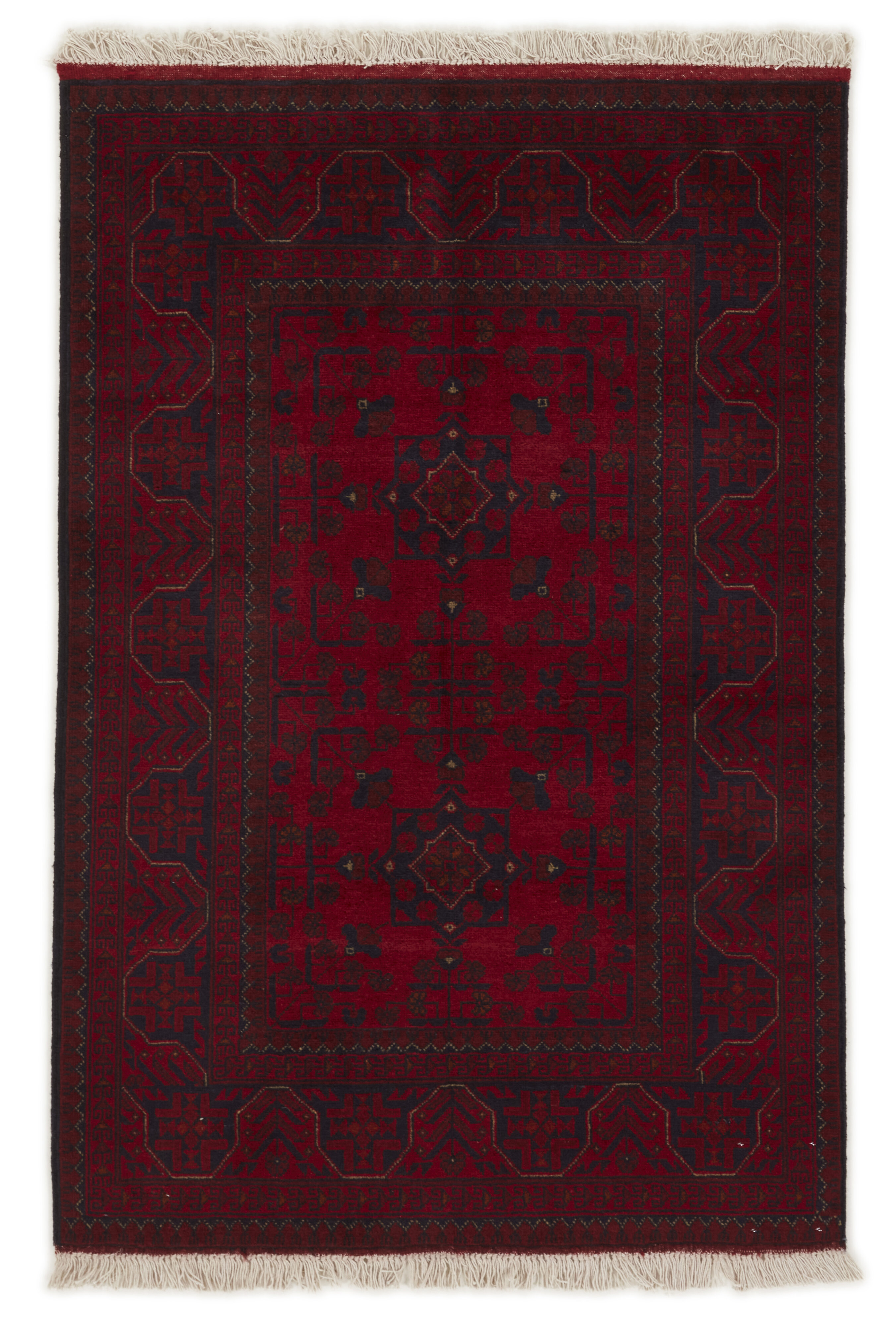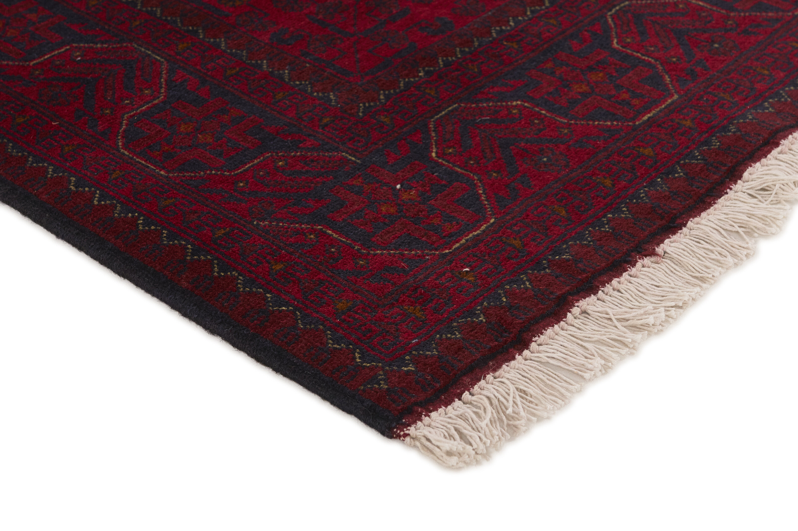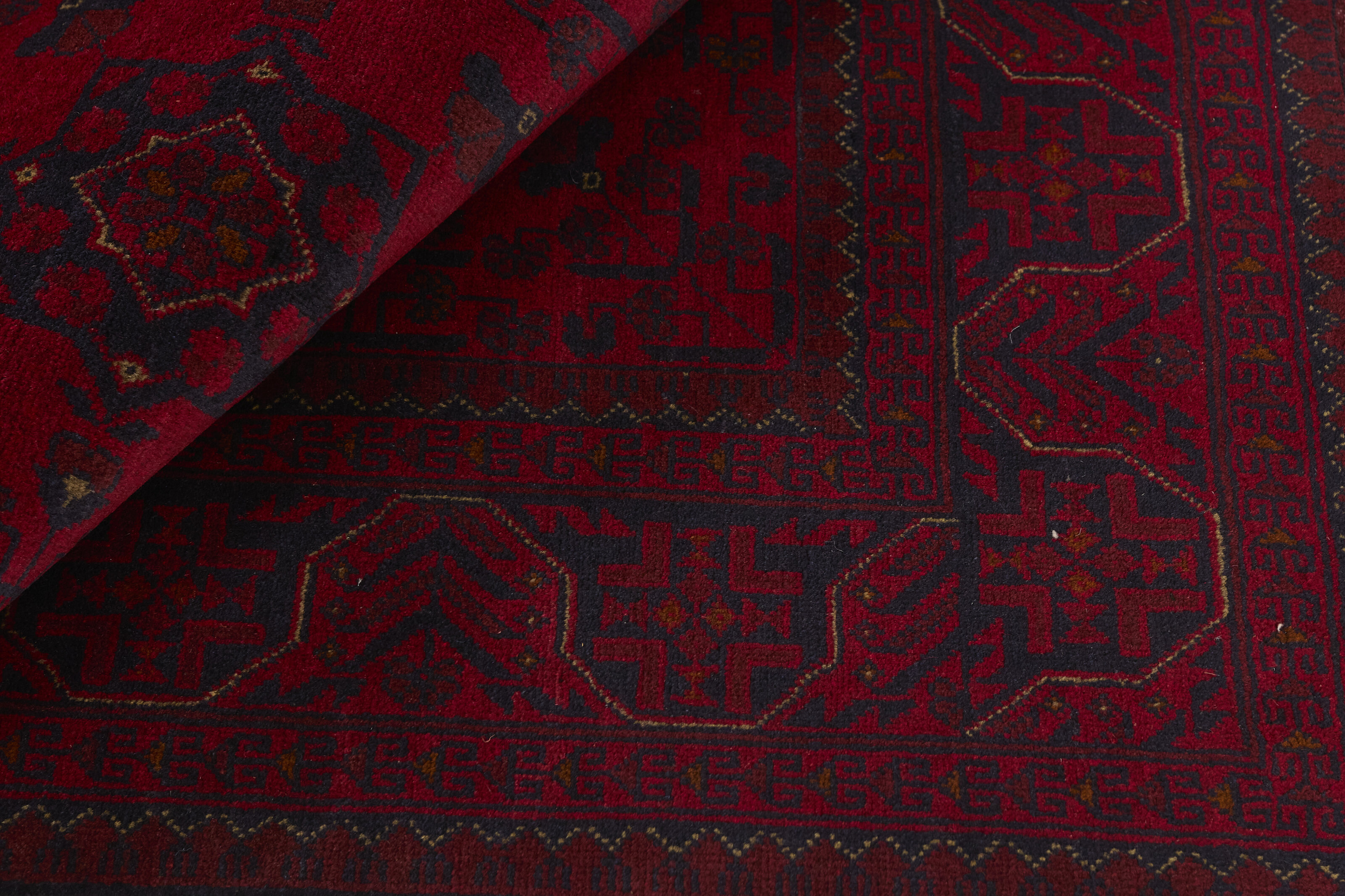 Two of the most popular Afghan rugs are Khal Mohammadi/Old Afghan, and Afghan Aktscha. Khal Mohammadi is handmade by Turkmens in northern Afghanistan. Both Turkmenistan to the North and Afghnaistan to the South are mostly inhabited by nomadic tribes. Kabul, the capitol of Afghanistan, and the city of Herat, are important centres for Afghan rugs. Characteristic of these rugs is the deep, warm, and fiery red base colour, the relatively high and sturdy pile, the wool base weave, the use of goat’s and horse’s hair, and knotting using the Seneh knot and the Gül (Elephant’s Foot) pattern. The base colour is a wide range of warm red nuances, from rust to copper brown. The pattern is a very dark blue, almost black, with ochre and ivory white colour.