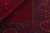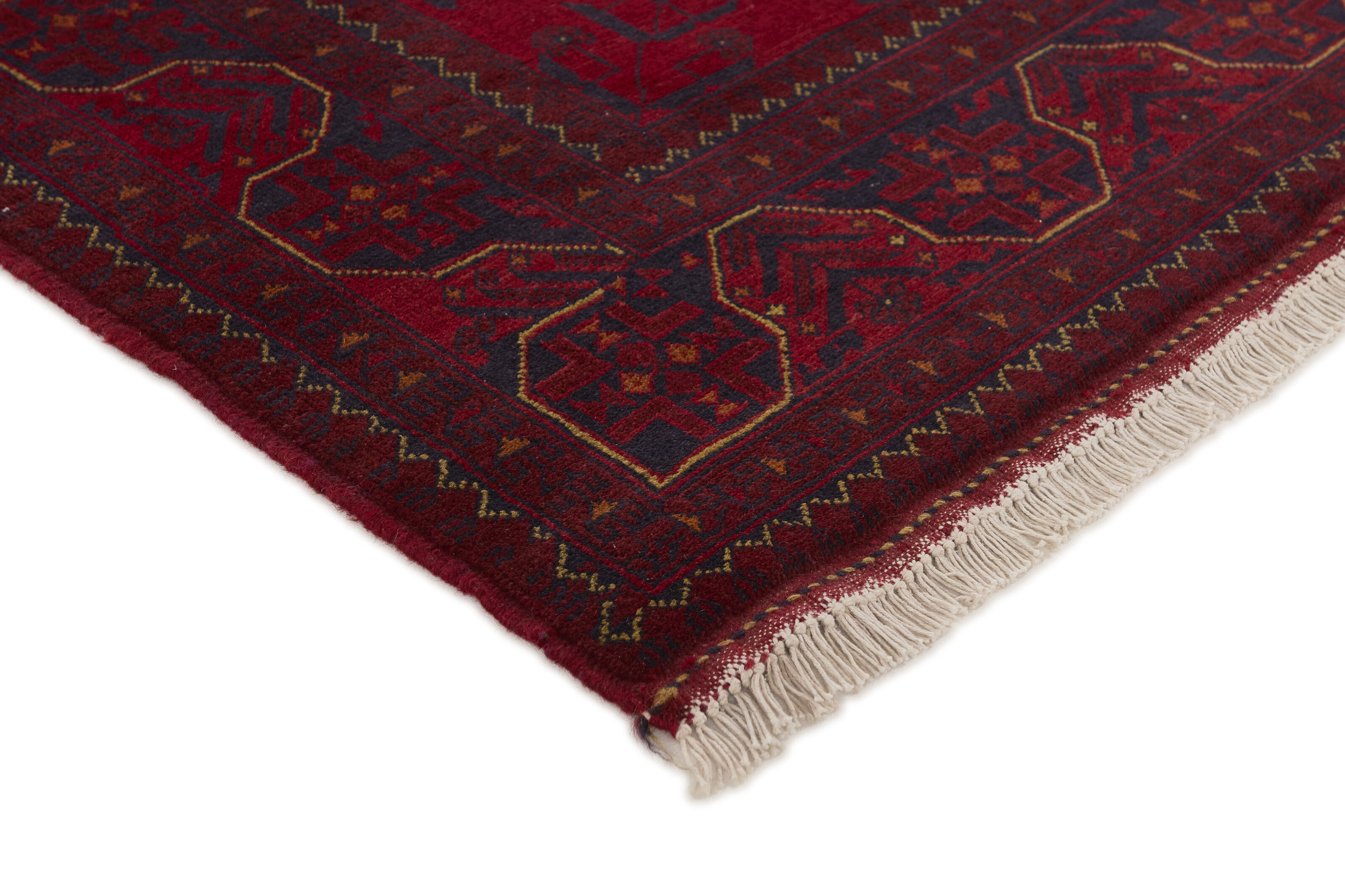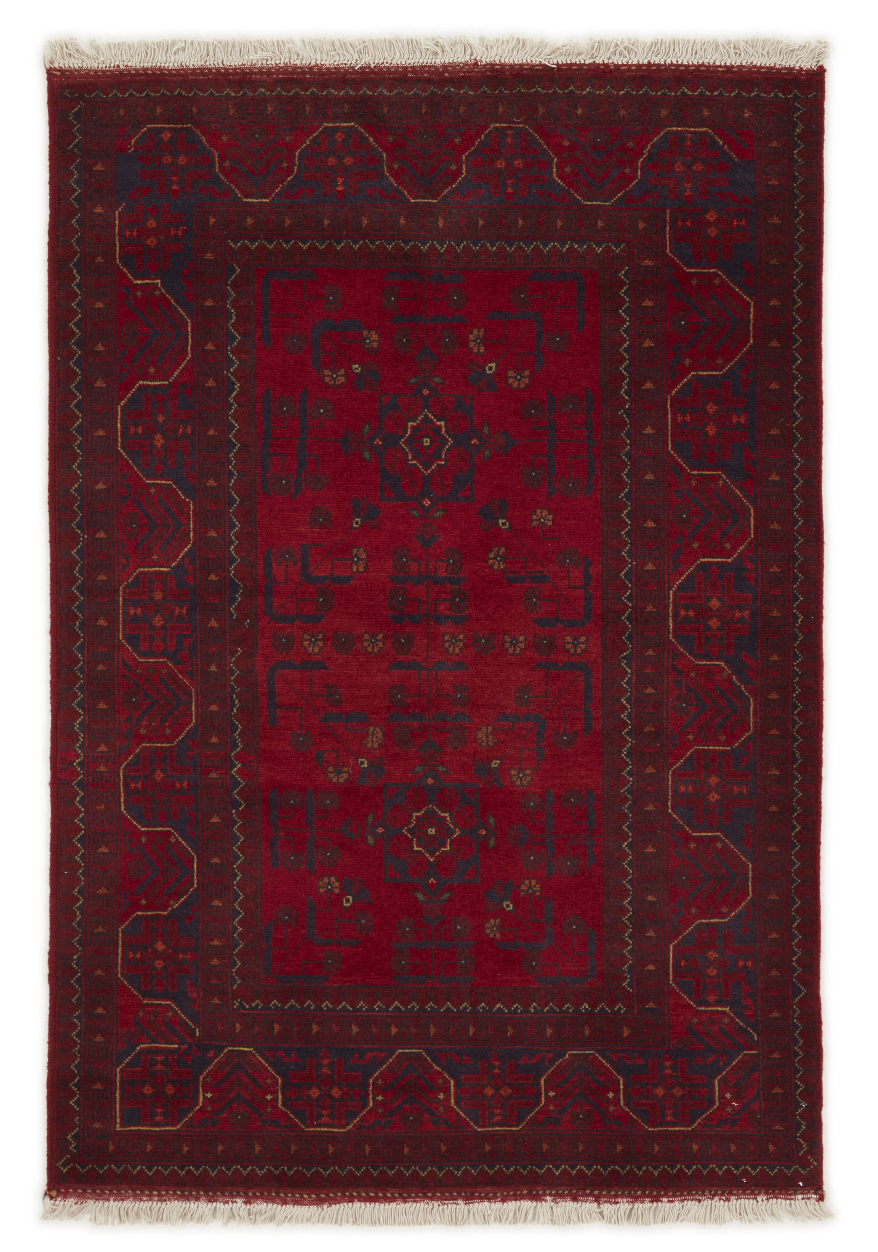 Two of the most popular Afghan rugs are Khal Mohammadi/Old Afghan, and Afghan Aktscha. Khal Mohammadi is handmade by Turkmens in northern Afghanistan. Both Turkmenistan to the North and Afghnaistan to the South are mostly inhabited by nomadic tribes. Kabul, the capitol of Afghanistan, and the city of Herat, are important centres for Afghan rugs. Characteristic of these rugs is the deep, warm, and fiery red base colour, the relatively high and sturdy pile, the wool base weave, the use of goat’s and horse’s hair, and knotting using the Seneh knot and the Gül (Elephant’s Foot) pattern. The base colour is a wide range of warm red nuances, from rust to copper brown. The pattern is a very dark blue, almost black, with ochre and ivory white colour.