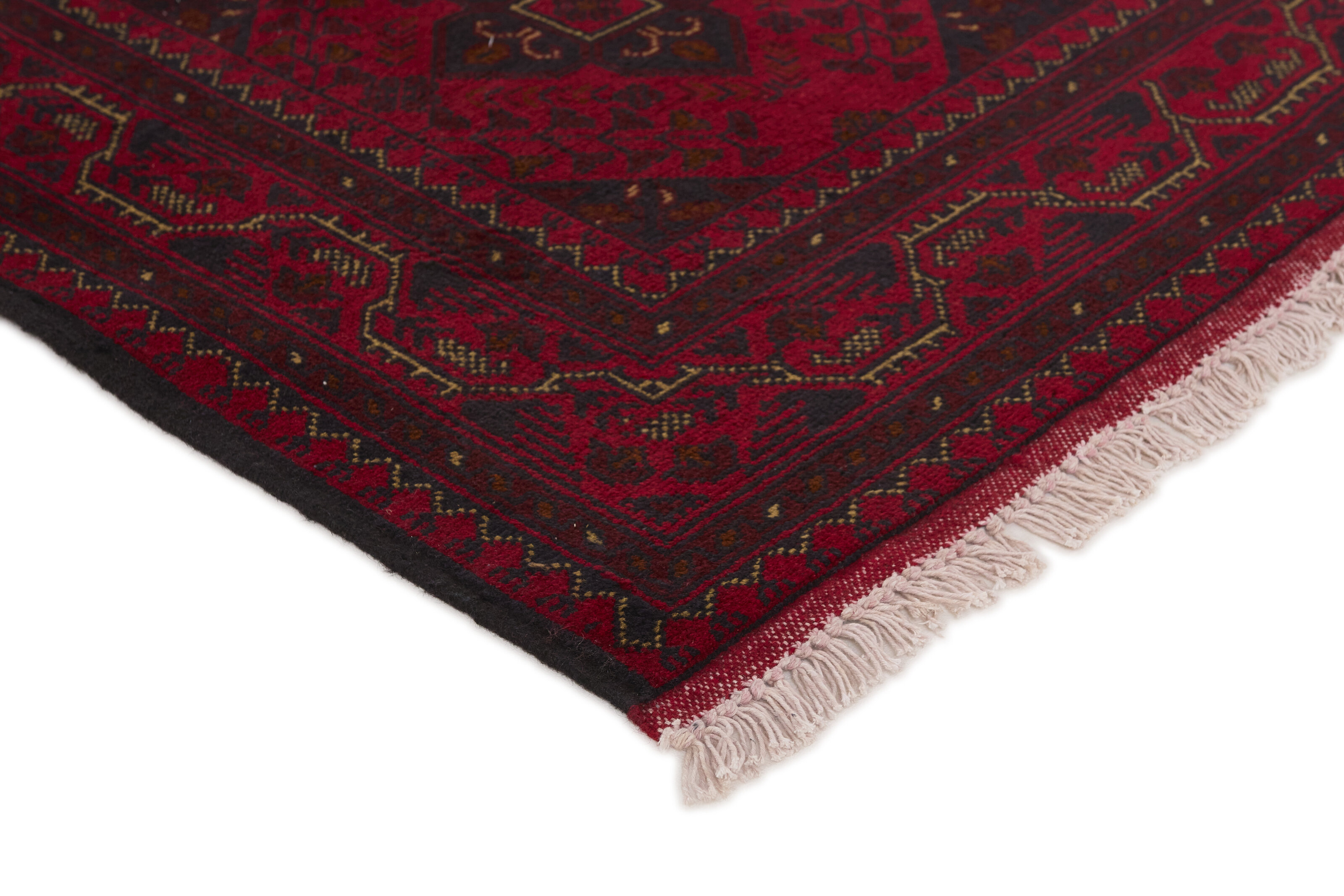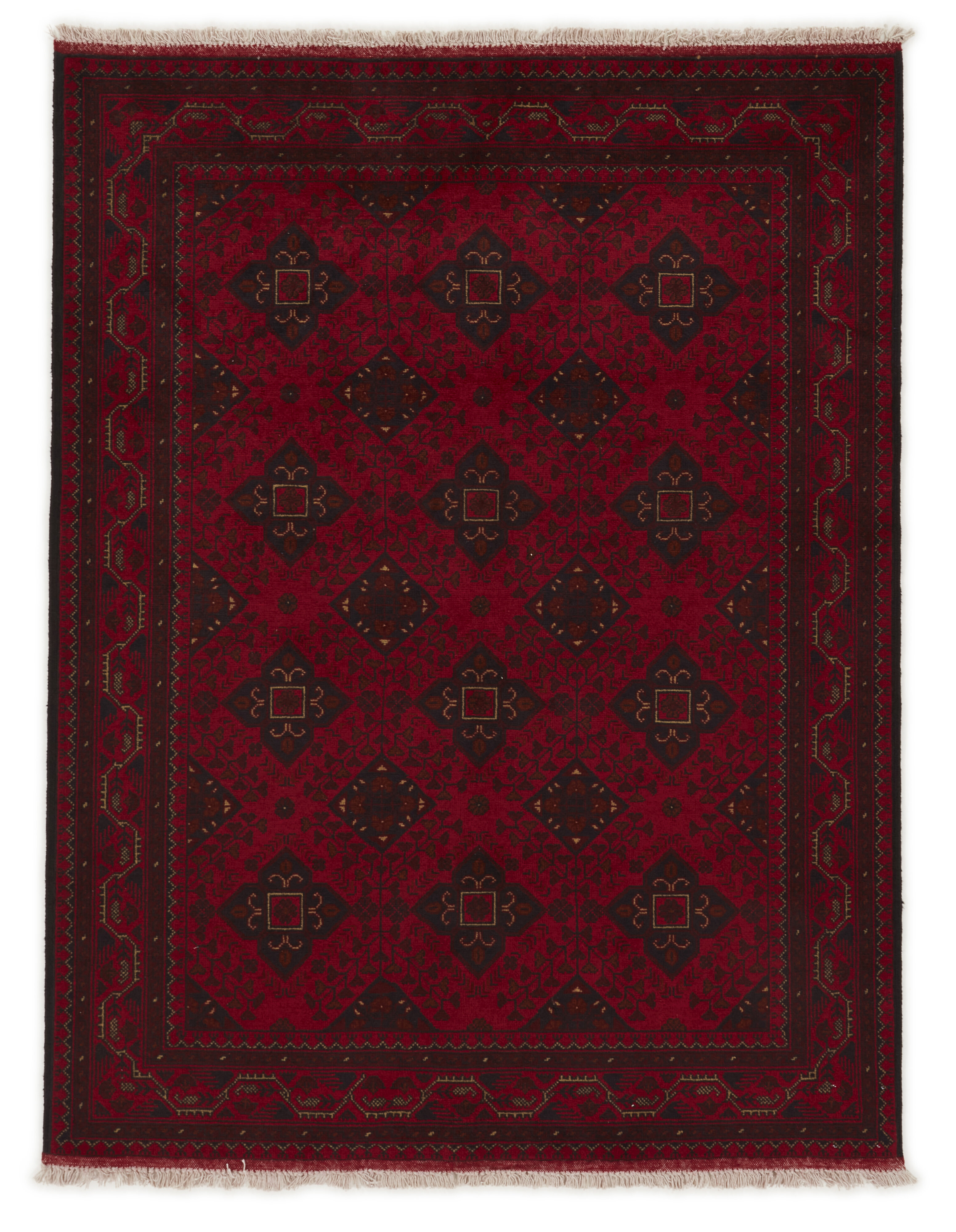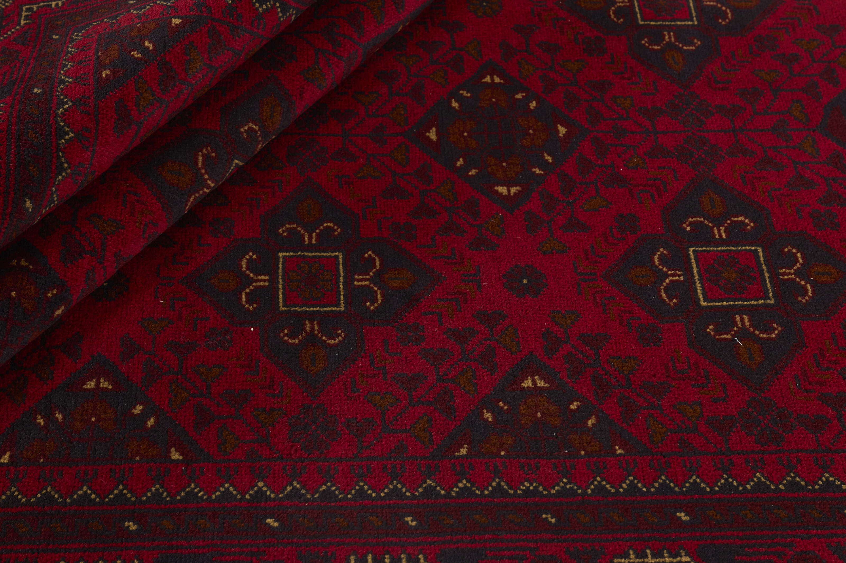 Two of the most popular Afghan rugs are Khal Mohammadi/Old Afghan, and Afghan Aktscha. Khal Mohammadi is handmade by Turkmens in northern Afghanistan. Both Turkmenistan to the North and Afghnaistan to the South are mostly inhabited by nomadic tribes. Kabul, the capitol of Afghanistan, and the city of Herat, are important centres for Afghan rugs. Characteristic of these rugs is the deep, warm, and fiery red base colour, the relatively high and sturdy pile, the wool base weave, the use of goat’s and horse’s hair, and knotting using the Seneh knot and the Gül (Elephant’s Foot) pattern. The base colour is a wide range of warm red nuances, from rust to copper brown. The pattern is a very dark blue, almost black, with ochre and ivory white colour.