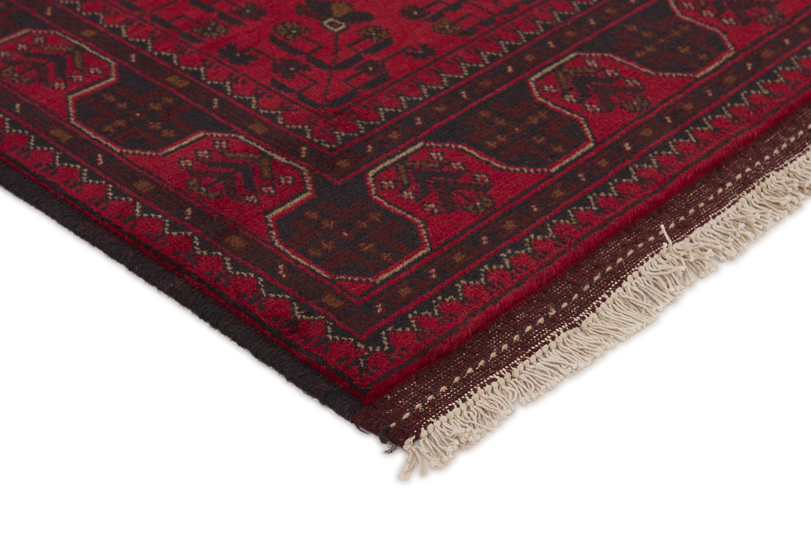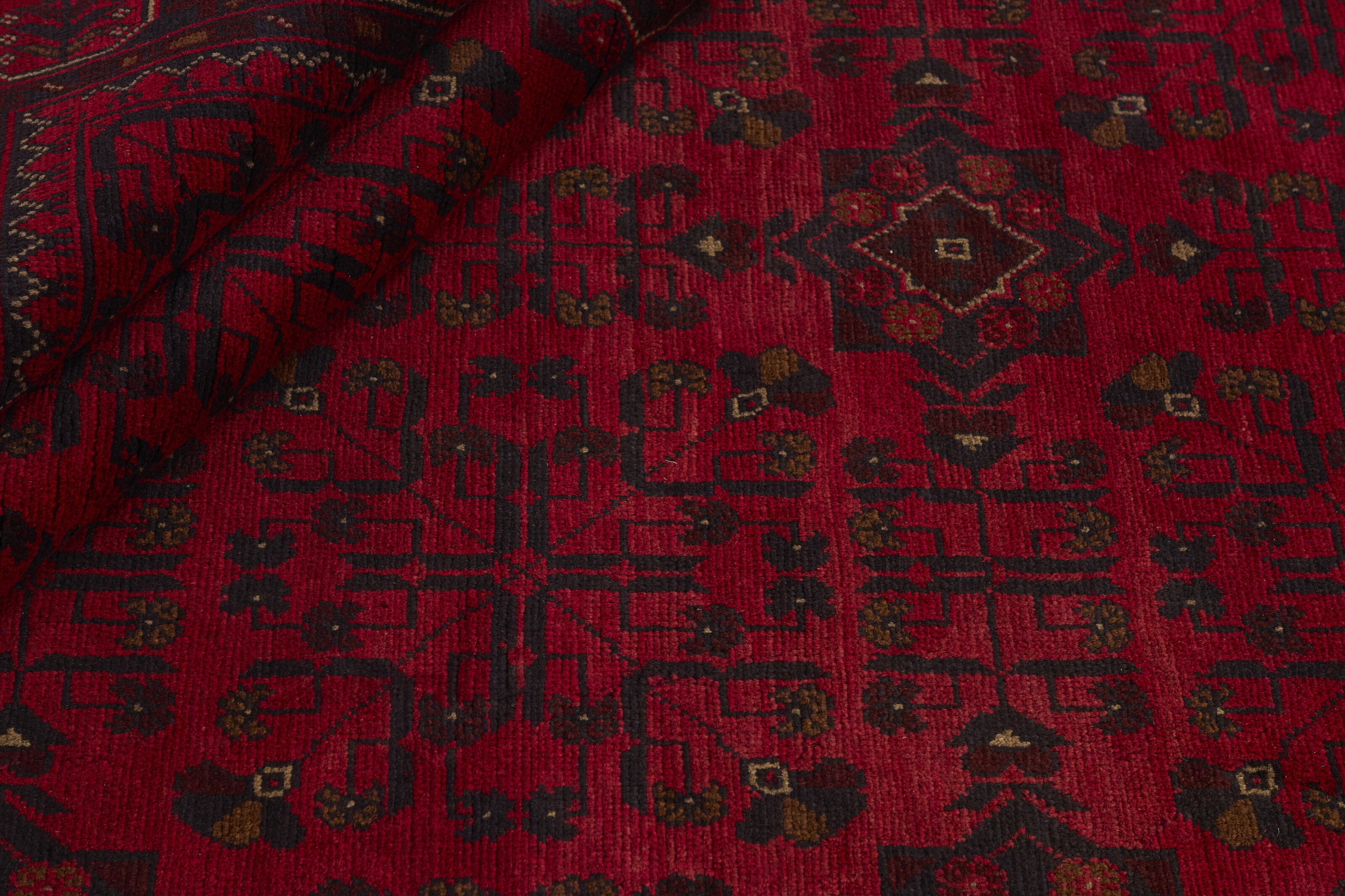 Two of the most popular Afghan rugs are Khal Mohammadi/Old Afghan, and Afghan Aktscha. Khal Mohammadi is handmade by Turkmens in northern Afghanistan. Both Turkmenistan to the North and Afghnaistan to the South are mostly inhabited by nomadic tribes. Kabul, the capitol of Afghanistan, and the city of Herat, are important centres for Afghan rugs. Characteristic of these rugs is the deep, warm, and fiery red base colour, the relatively high and sturdy pile, the wool base weave, the use of goat’s and horse’s hair, and knotting using the Seneh knot and the Gül (Elephant’s Foot) pattern. The base colour is a wide range of warm red nuances, from rust to copper brown. The pattern is a very dark blue, almost black, with ochre and ivory white colour.