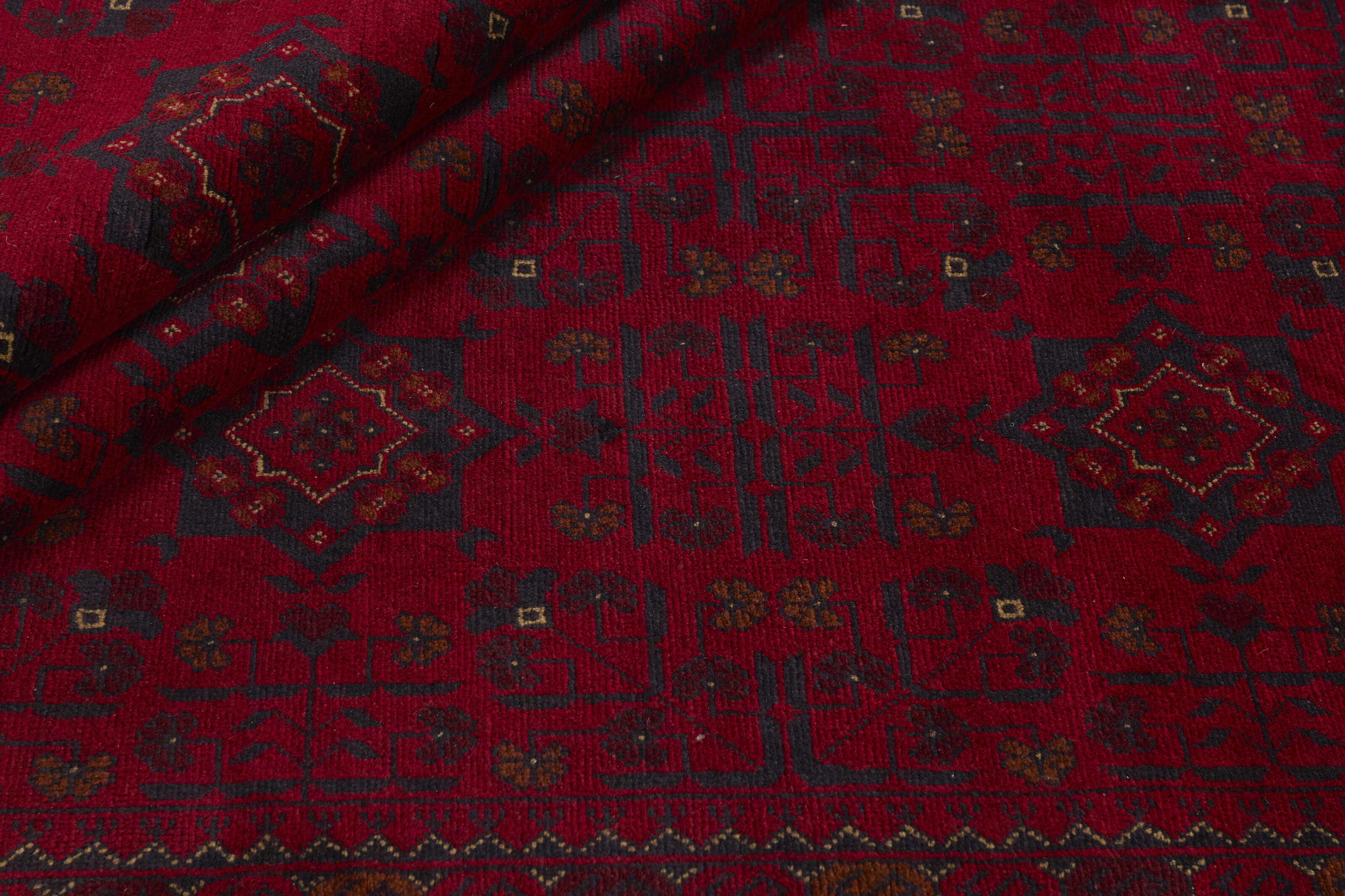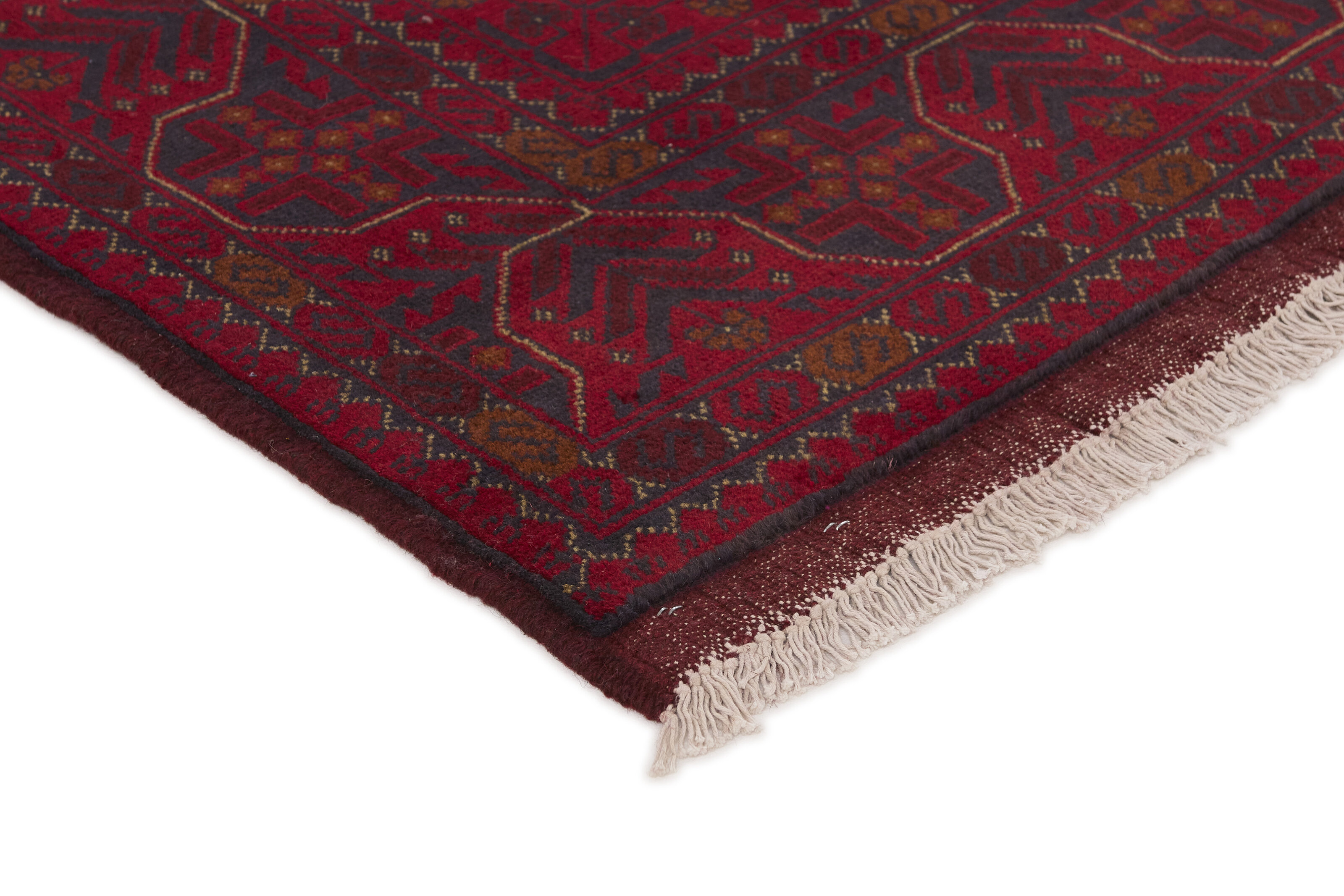 Two of the most popular Afghan rugs are Khal Mohammadi/Old Afghan, and Afghan Aktscha. Khal Mohammadi is handmade by Turkmens in northern Afghanistan. Both Turkmenistan to the North and Afghnaistan to the South are mostly inhabited by nomadic tribes. Kabul, the capitol of Afghanistan, and the city of Herat, are important centres for Afghan rugs. Characteristic of these rugs is the deep, warm, and fiery red base colour, the relatively high and sturdy pile, the wool base weave, the use of goat’s and horse’s hair, and knotting using the Seneh knot and the Gül (Elephant’s Foot) pattern. The base colour is a wide range of warm red nuances, from rust to copper brown. The pattern is a very dark blue, almost black, with ochre and ivory white colour.