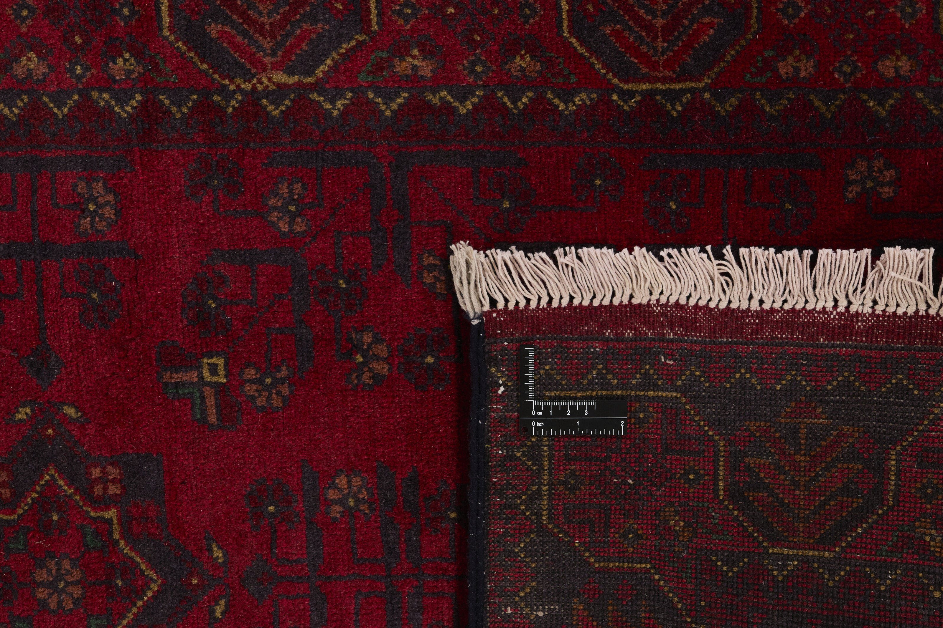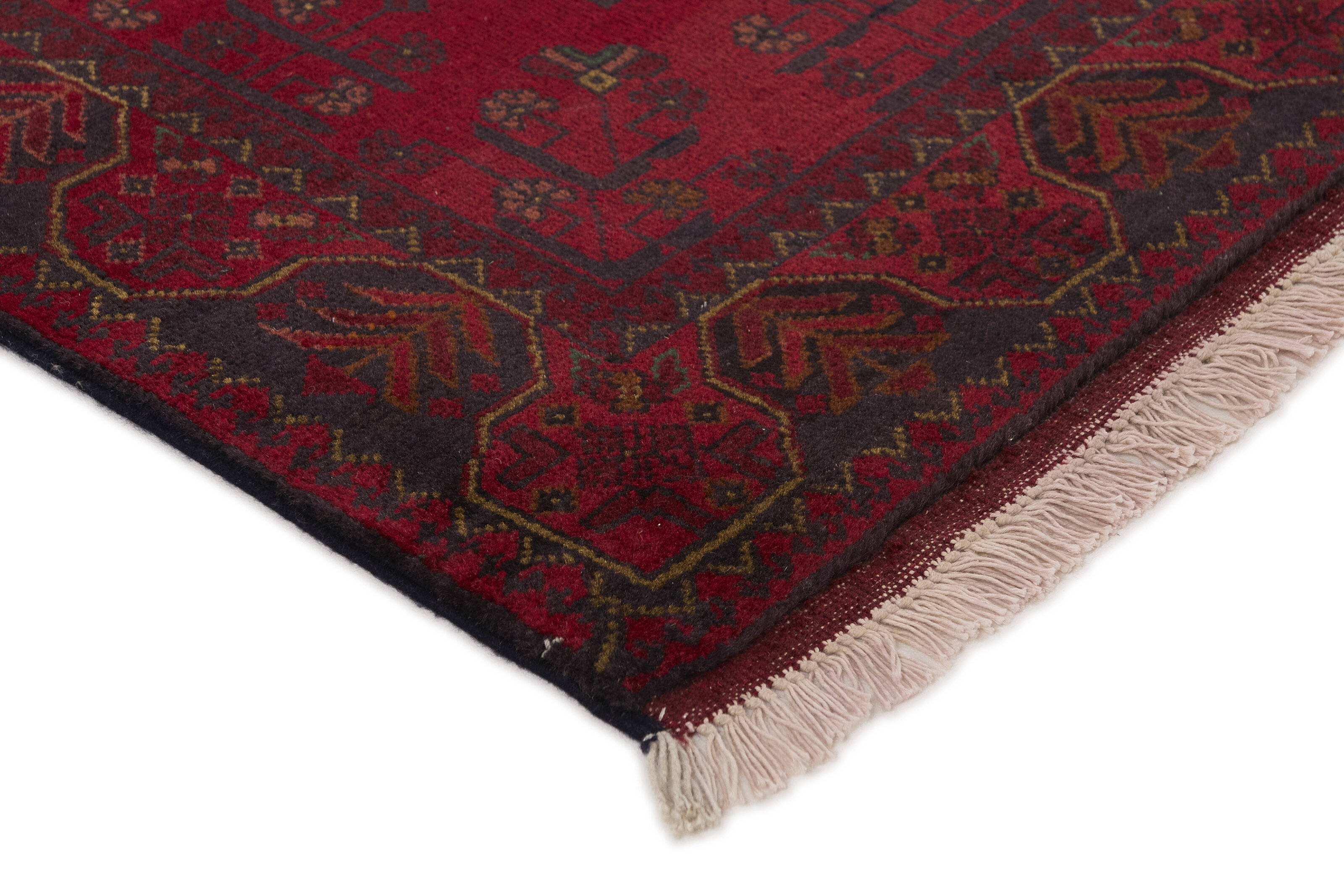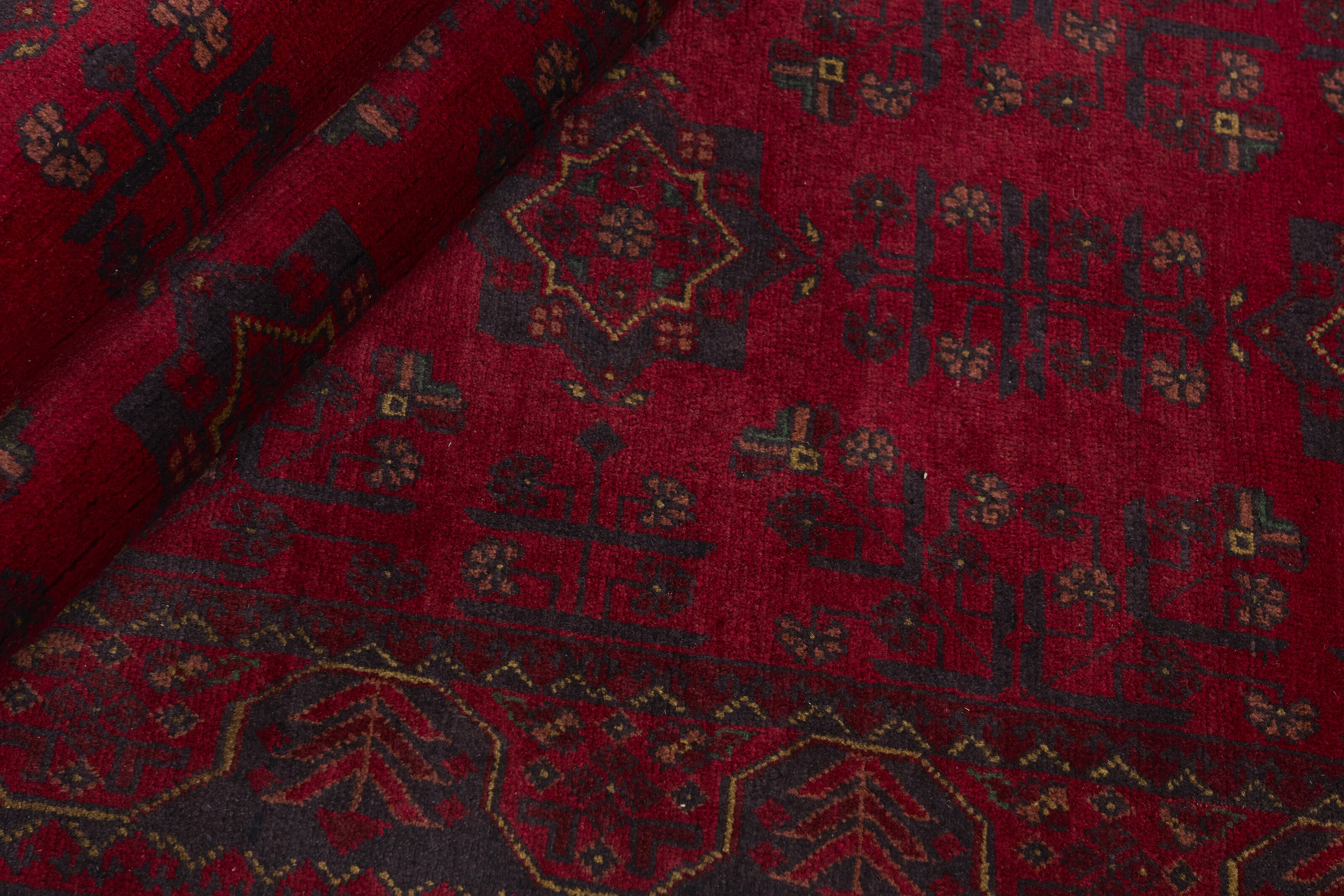 Two of the most popular Afghan rugs are Khal Mohammadi/Old Afghan, and Afghan Aktscha. Khal Mohammadi is handmade by Turkmens in northern Afghanistan. Both Turkmenistan to the North and Afghnaistan to the South are mostly inhabited by nomadic tribes. Kabul, the capitol of Afghanistan, and the city of Herat, are important centres for Afghan rugs. Characteristic of these rugs is the deep, warm, and fiery red base colour, the relatively high and sturdy pile, the wool base weave, the use of goat’s and horse’s hair, and knotting using the Seneh knot and the Gül (Elephant’s Foot) pattern. The base colour is a wide range of warm red nuances, from rust to copper brown. The pattern is a very dark blue, almost black, with ochre and ivory white colour.