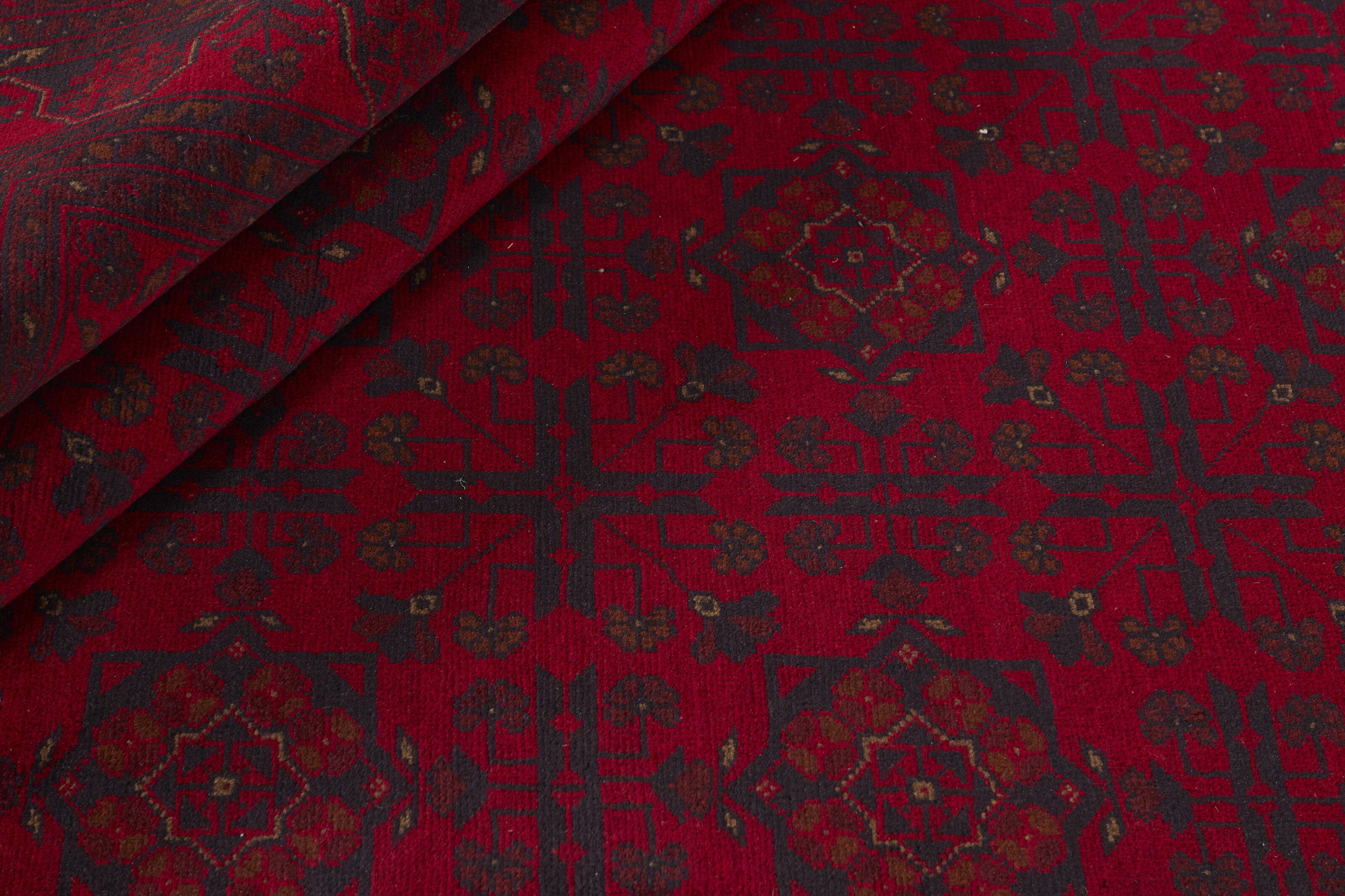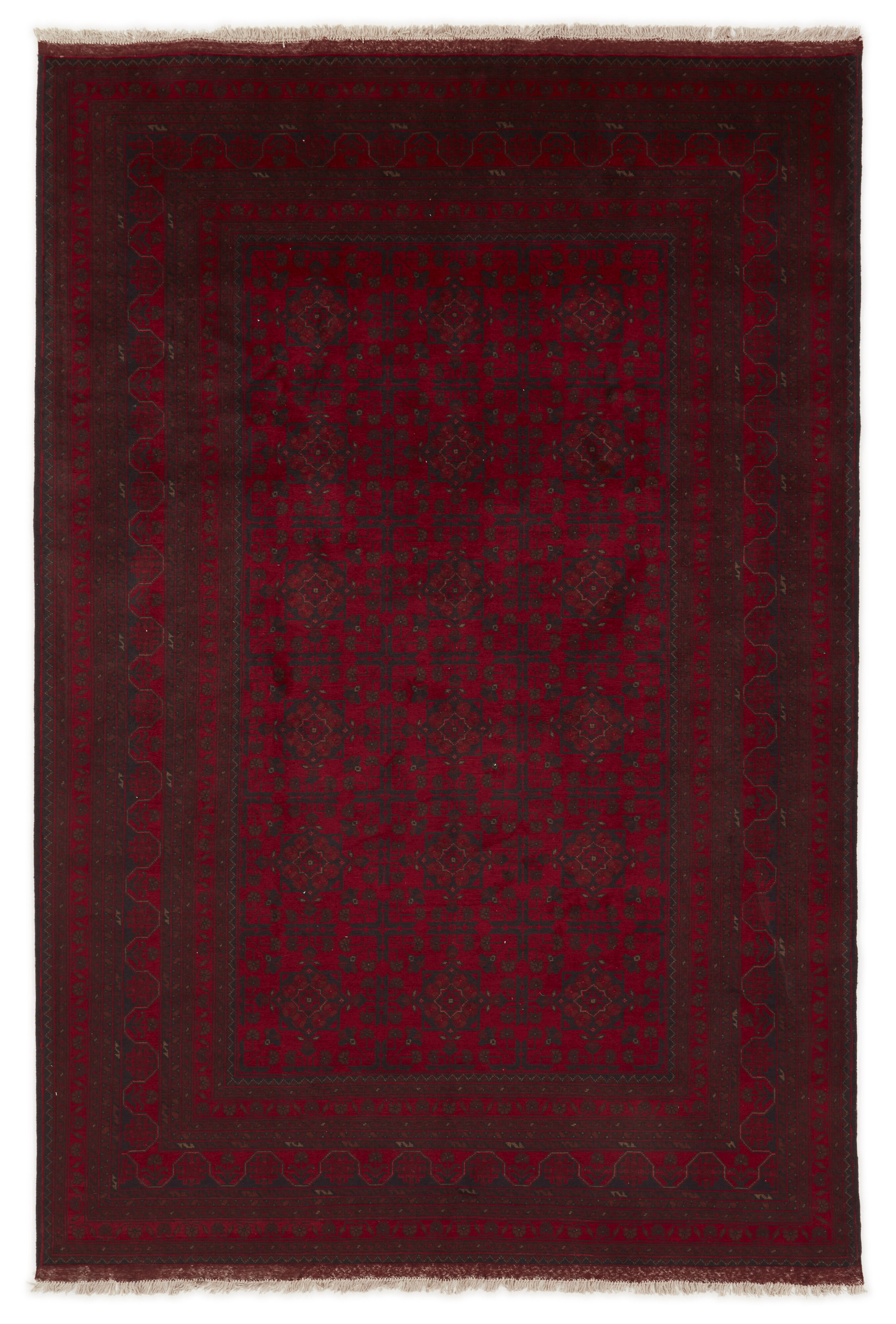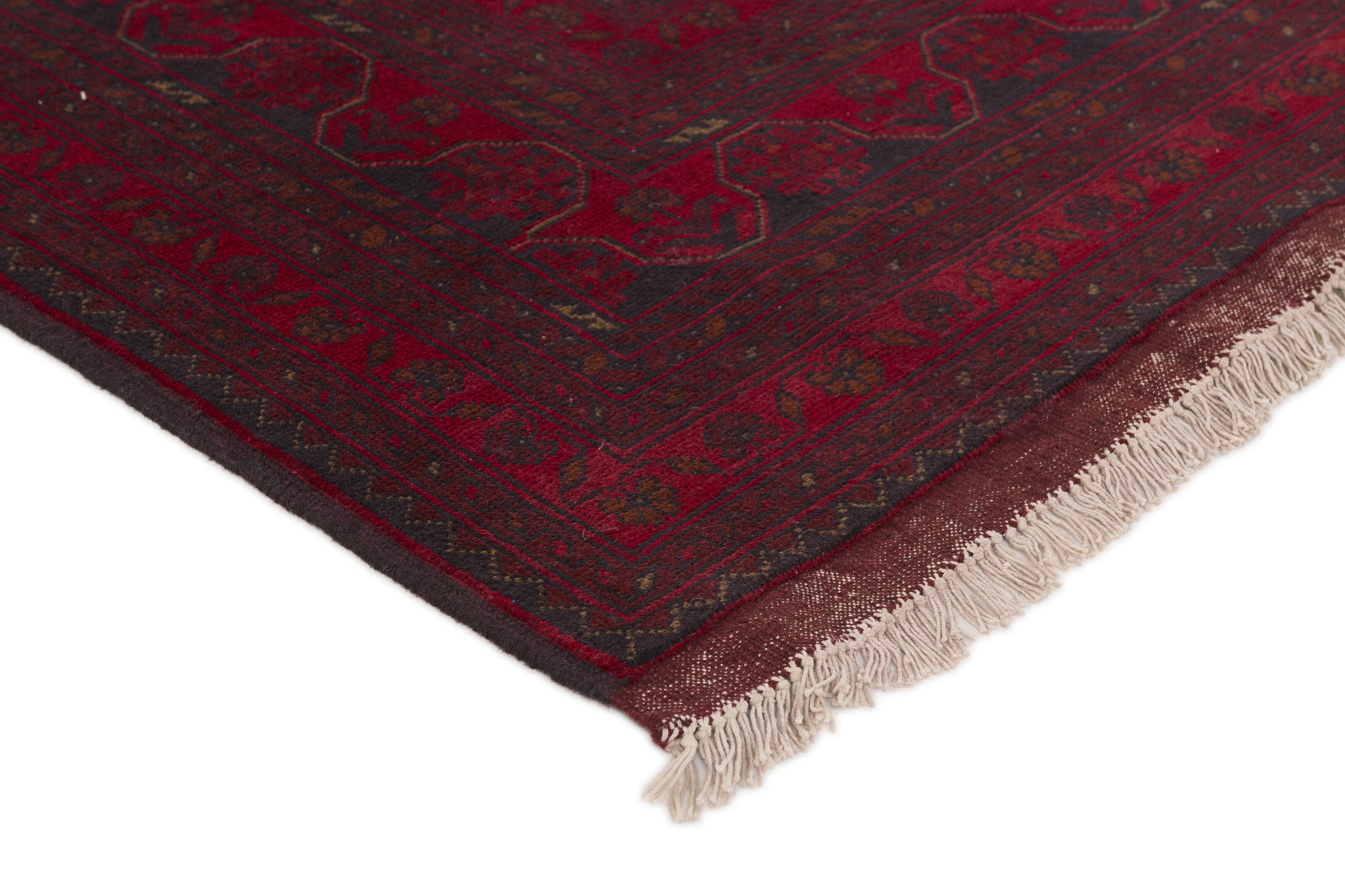 Two of the most popular Afghan rugs are Khal Mohammadi/Old Afghan, and Afghan Aktscha. Khal Mohammadi is handmade by Turkmens in northern Afghanistan. Both Turkmenistan to the North and Afghnaistan to the South are mostly inhabited by nomadic tribes. Kabul, the capitol of Afghanistan, and the city of Herat, are important centres for Afghan rugs. Characteristic of these rugs is the deep, warm, and fiery red base colour, the relatively high and sturdy pile, the wool base weave, the use of goat’s and horse’s hair, and knotting using the Seneh knot and the Gül (Elephant’s Foot) pattern. The base colour is a wide range of warm red nuances, from rust to copper brown. The pattern is a very dark blue, almost black, with ochre and ivory white colour.