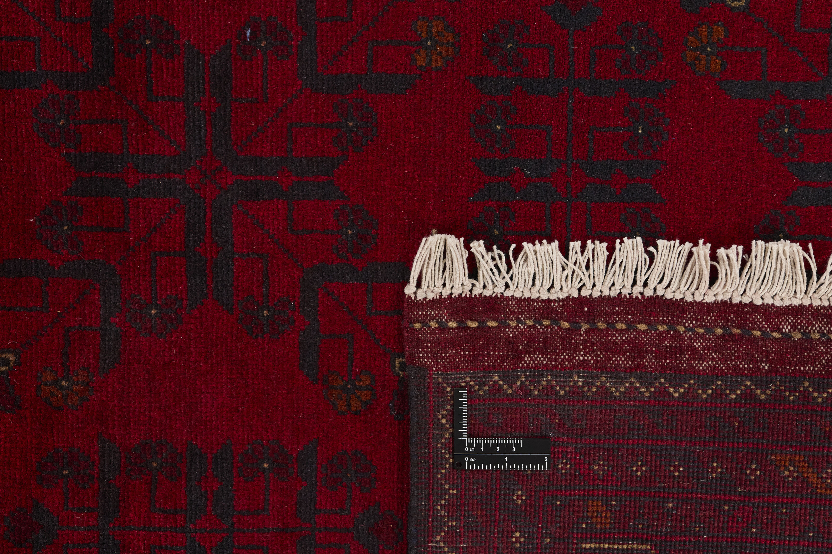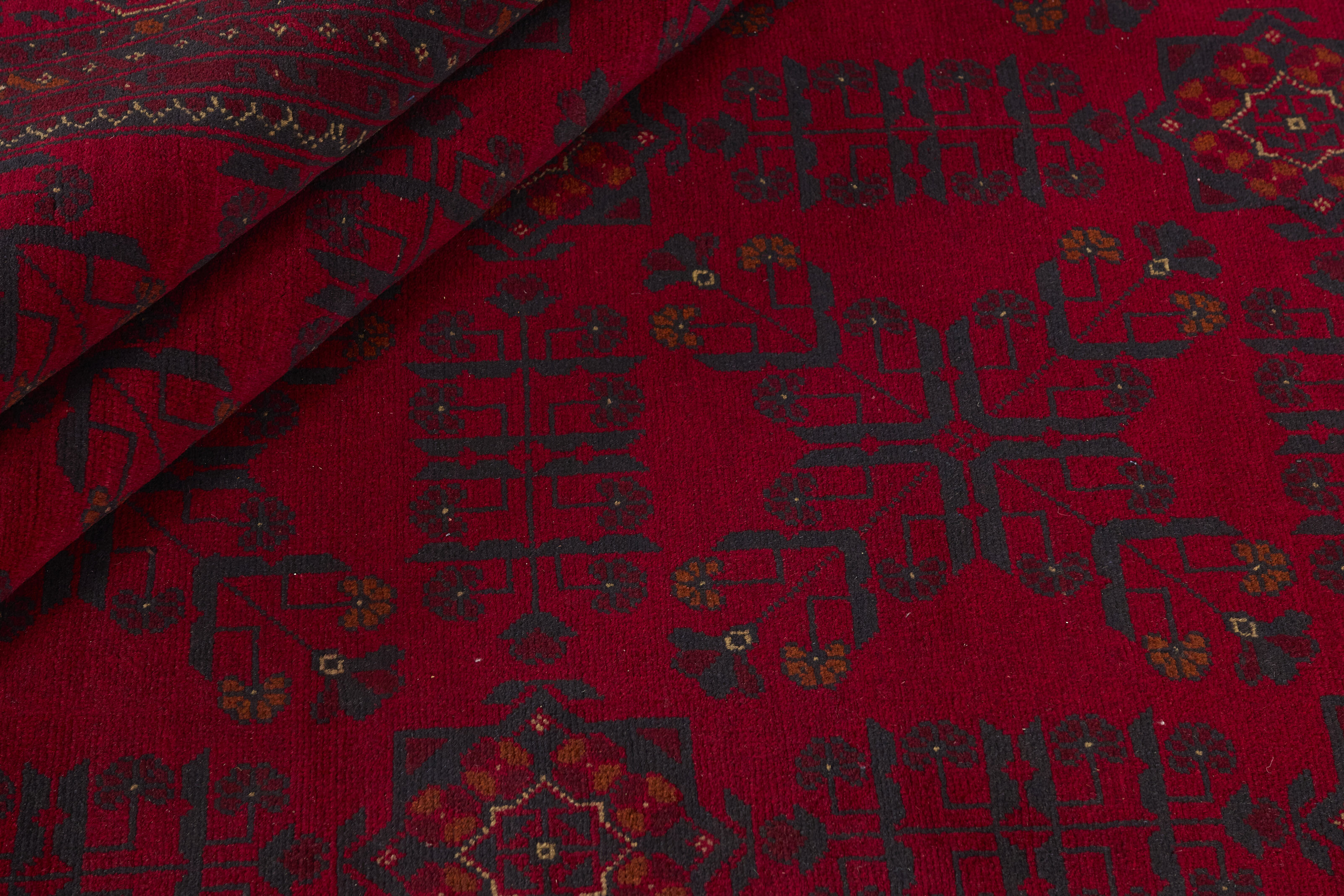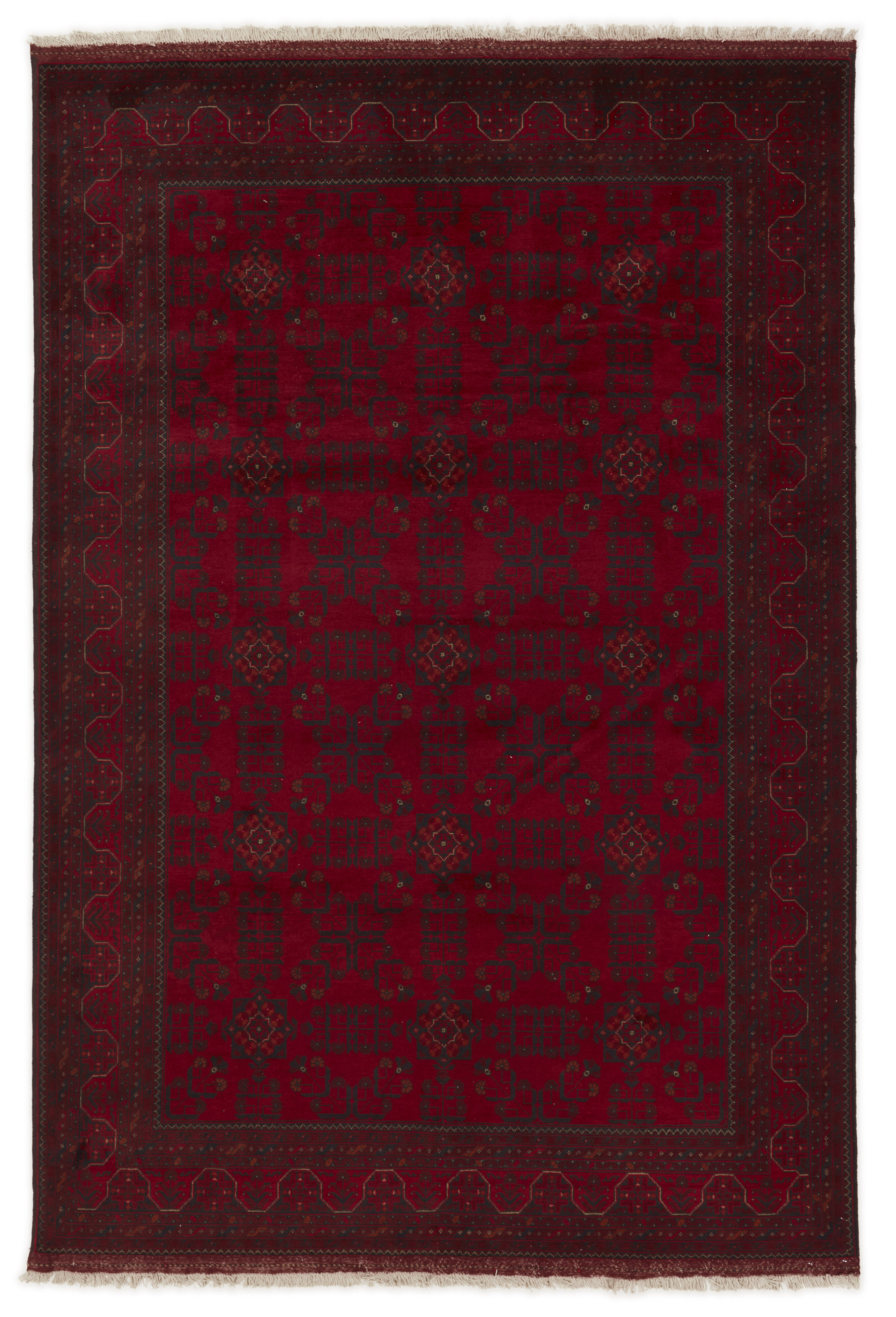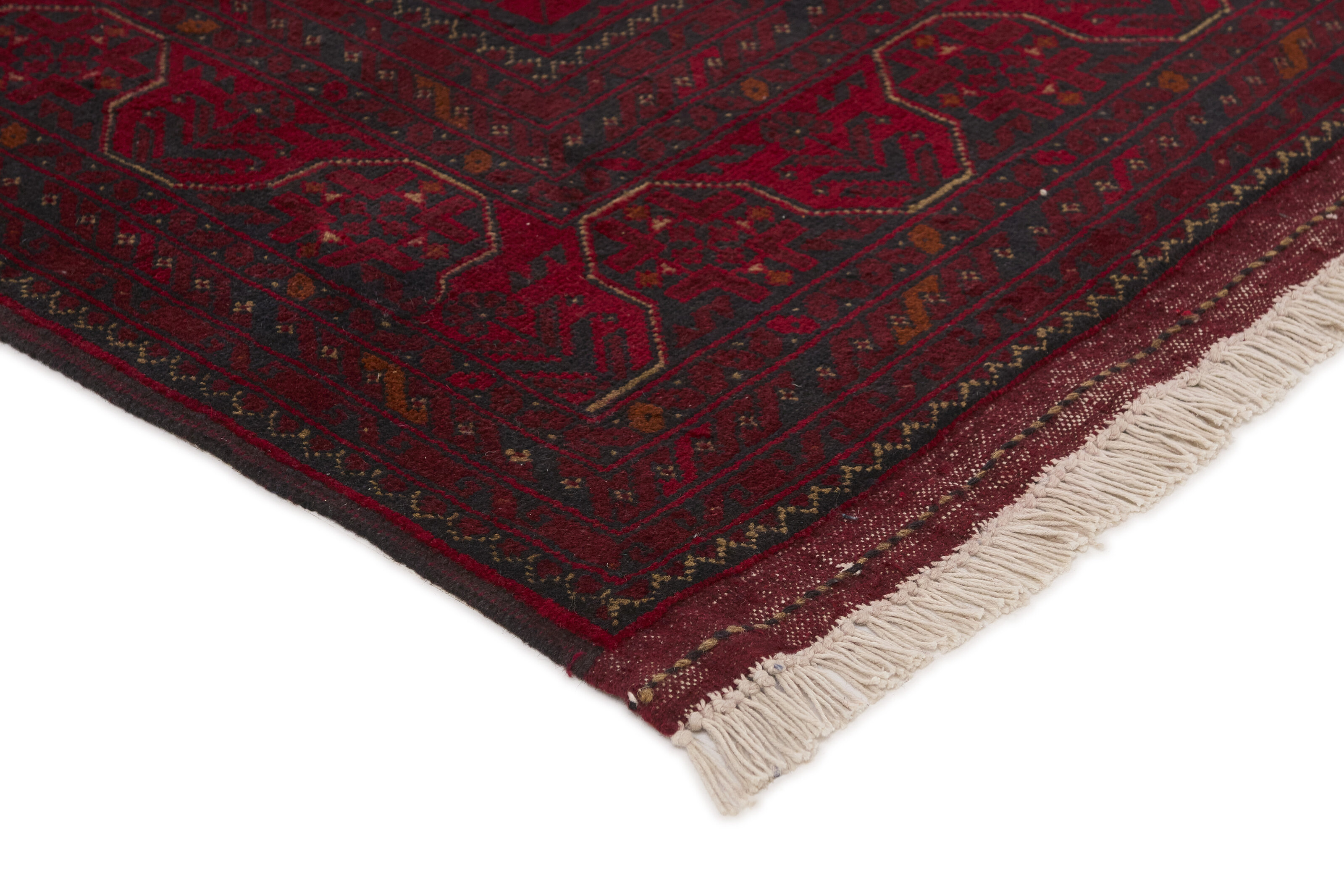 Two of the most popular Afghan rugs are Khal Mohammadi/Old Afghan, and Afghan Aktscha. Khal Mohammadi is handmade by Turkmens in northern Afghanistan. Both Turkmenistan to the North and Afghnaistan to the South are mostly inhabited by nomadic tribes. Kabul, the capitol of Afghanistan, and the city of Herat, are important centres for Afghan rugs. Characteristic of these rugs is the deep, warm, and fiery red base colour, the relatively high and sturdy pile, the wool base weave, the use of goat’s and horse’s hair, and knotting using the Seneh knot and the Gül (Elephant’s Foot) pattern. The base colour is a wide range of warm red nuances, from rust to copper brown. The pattern is a very dark blue, almost black, with ochre and ivory white colour.