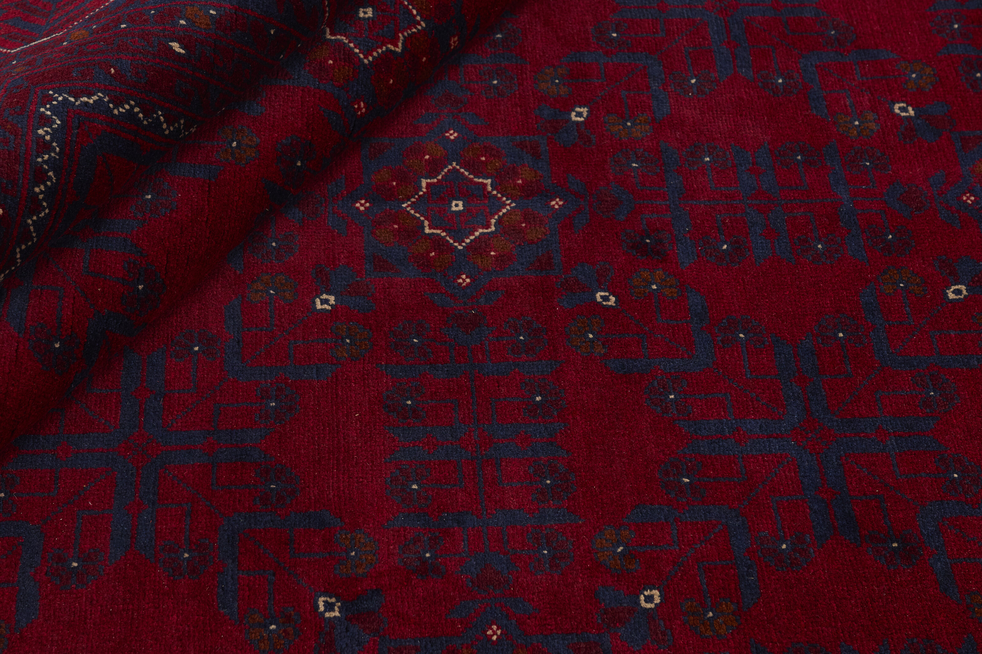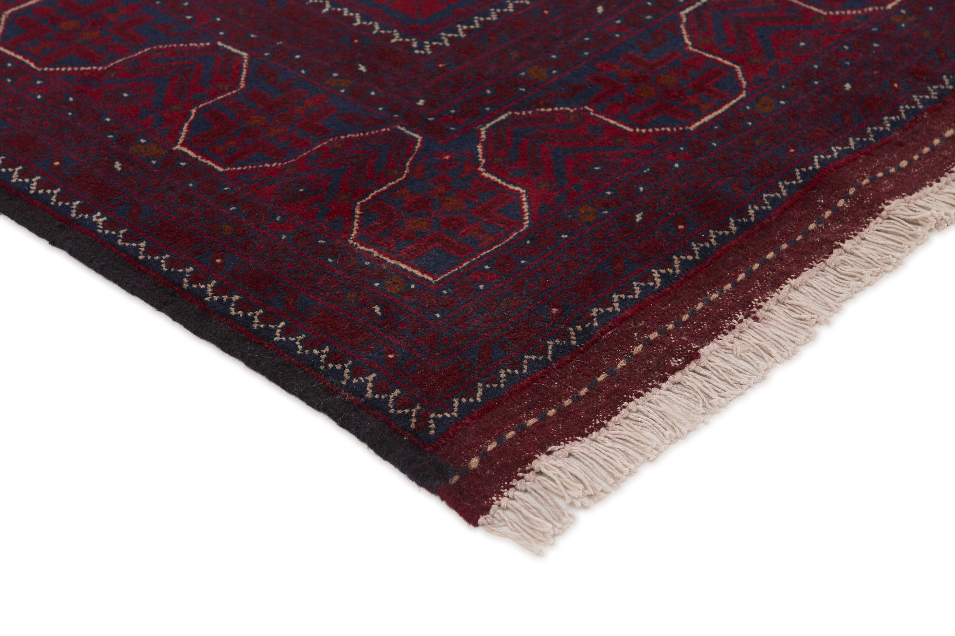Two of the most popular Afghan rugs are Khal Mohammadi/Old Afghan, and Afghan Aktscha. Khal Mohammadi is handmade by Turkmens in northern Afghanistan. Both Turkmenistan to the North and Afghnaistan to the South are mostly inhabited by nomadic tribes. Kabul, the capitol of Afghanistan, and the city of Herat, are important centres for Afghan rugs. Characteristic of these rugs is the deep, warm, and fiery red base colour, the relatively high and sturdy pile, the wool base weave, the use of goat’s and horse’s hair, and knotting using the Seneh knot and the Gül (Elephant’s Foot) pattern. The base colour is a wide range of warm red nuances, from rust to copper brown. The pattern is a very dark blue, almost black, with ochre and ivory white colour.