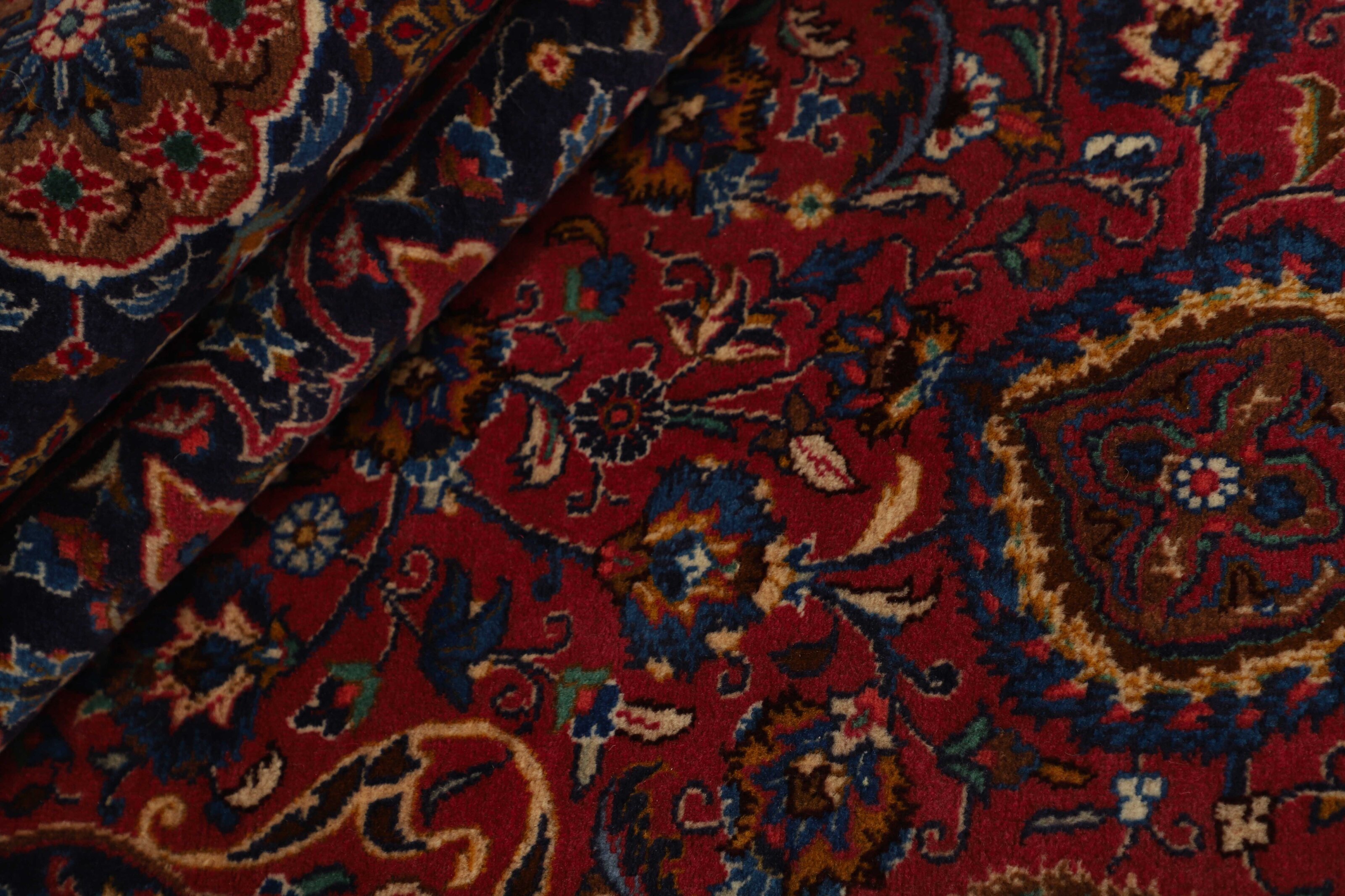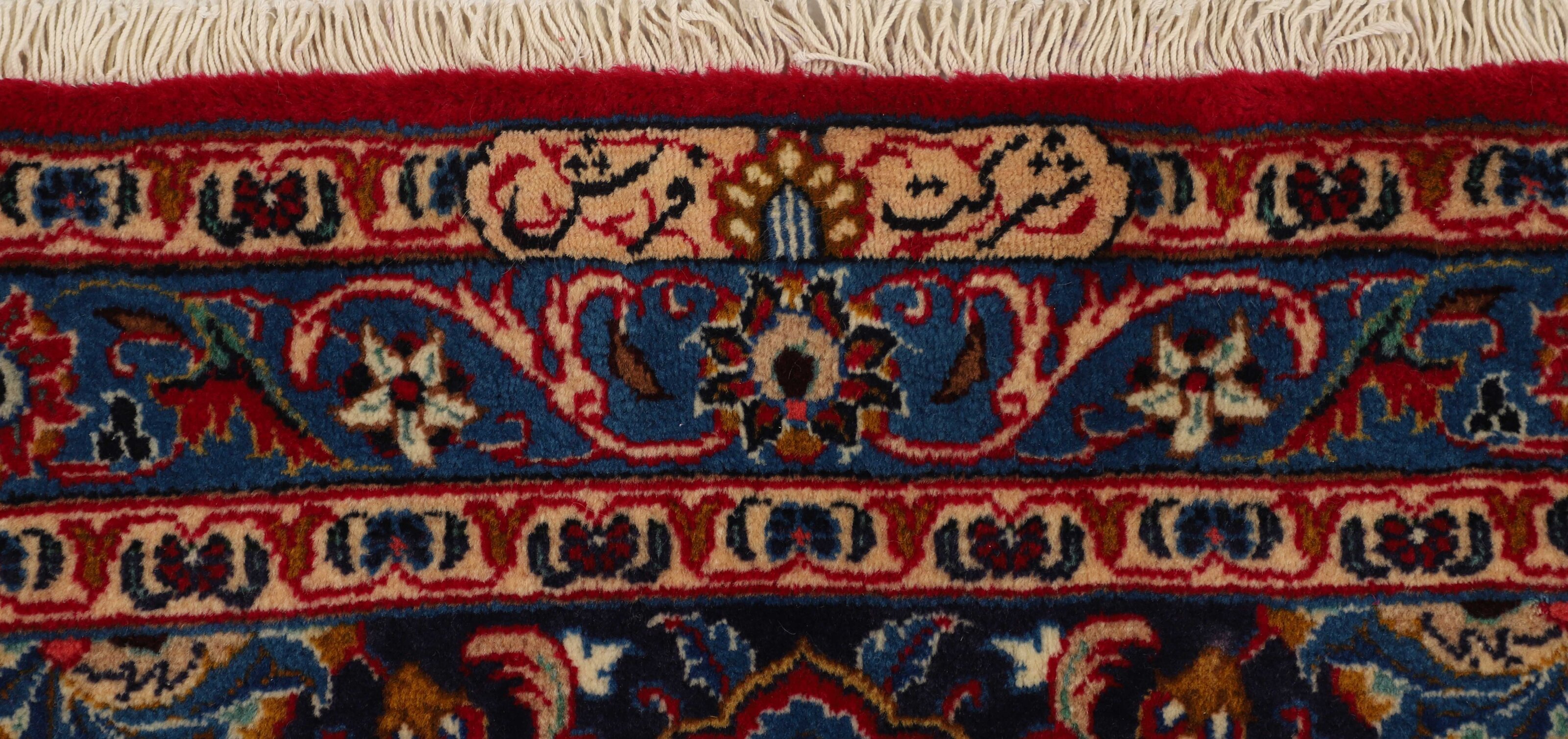 In the eastern part of Iran, close to Turkmenistan, in the large area named Khorassan, the city Mashad is situated. This city is an important centre for trading village and nomad rugs. The colours is dark and rich, the ground is often filled with flower motifs, surrounded by traditional Persian borders in different sizes. Mashad is the second most popular city in Iran and is the capitol of the Razavi Khorasan province. Mashad is situated in the north-eastern part of Iran, close to the border with Afghanistan and Turkmenistan. Although Mashad is now situated close to the border, it used to be more central when the Persian Empire stretched further East. It was part of a network of cities that stretched into Central Asia: Merv, Tashkent, Samarkand and Herat. It is also among the oldest known centres for rug knotting. The rug production is extensive in Mashad and mostly big rugs with medallions are produced. Mashad rugs are also sold under the name Meshed. The city of Mashad is known for producing some of the finest wool in Iran. The rugs are of a very high quality and are among the most beautiful rugs in [Iran and] the world. The colours are often red, while the ground colour can be blue purple with a cream coloured pattern. Often, the Mashad rugs have a harmonic middle medallion and large corner motifs. The base of the rug is plentifully decorated with varicoloured flower bouquets and leaves. Numerous borders, consisting of a broad main border after the finest Iranian tradition, frame the entire rug. Sherkat is the designation for a select series of rug types that are knotted in special workshops as part of a state controlled project, the purpose of which is to support and thereby preserve the production of fine classical Persian rug patterns.