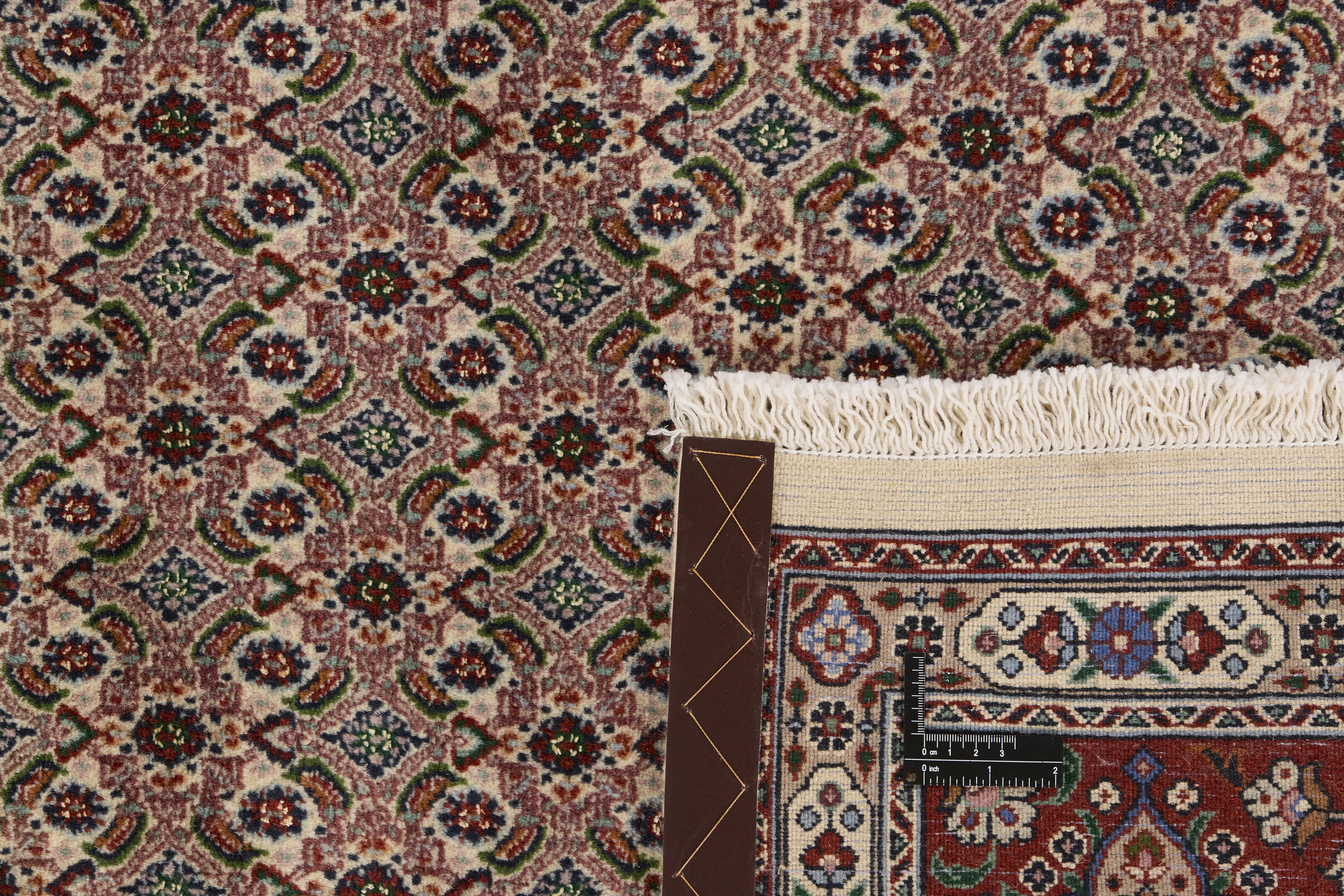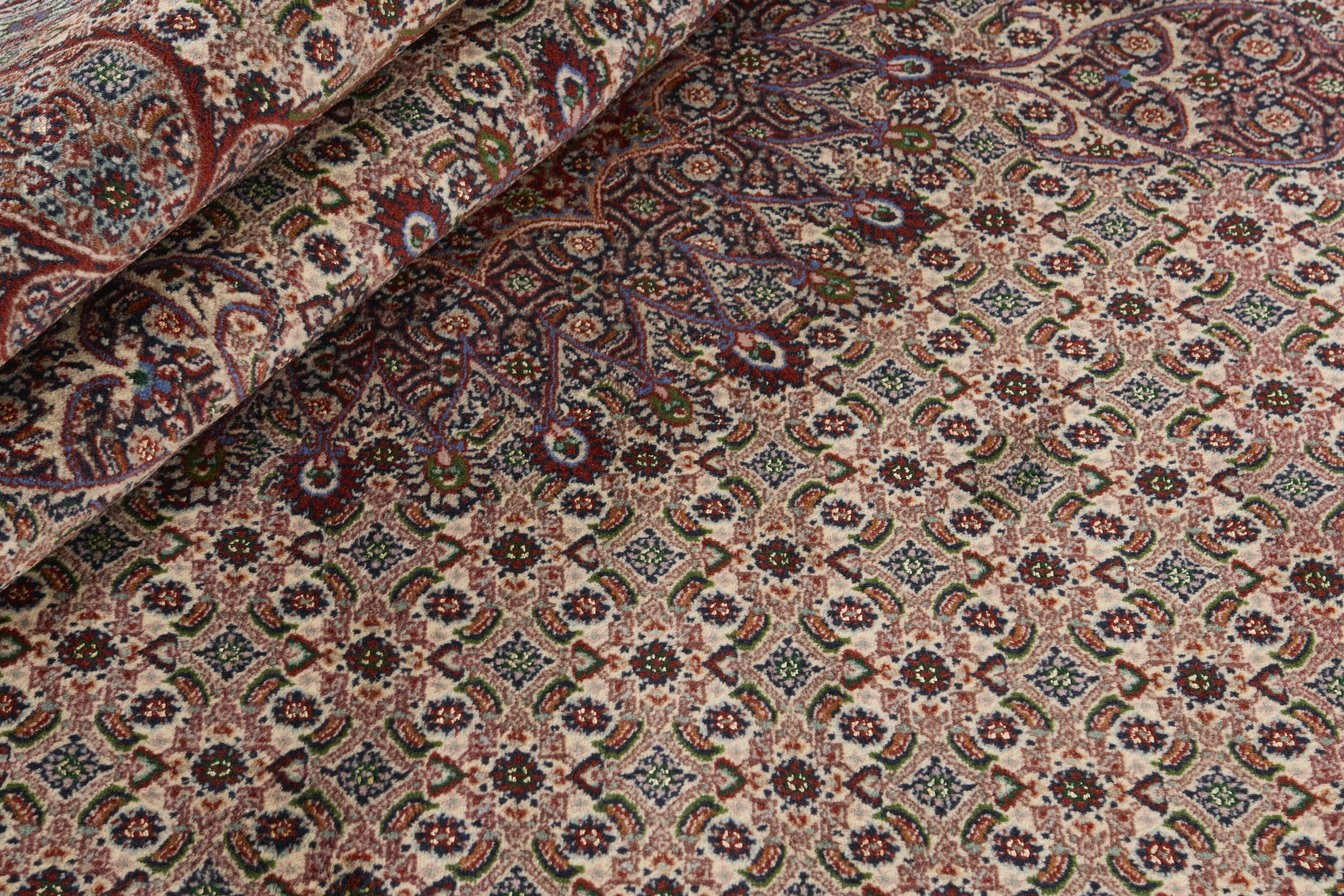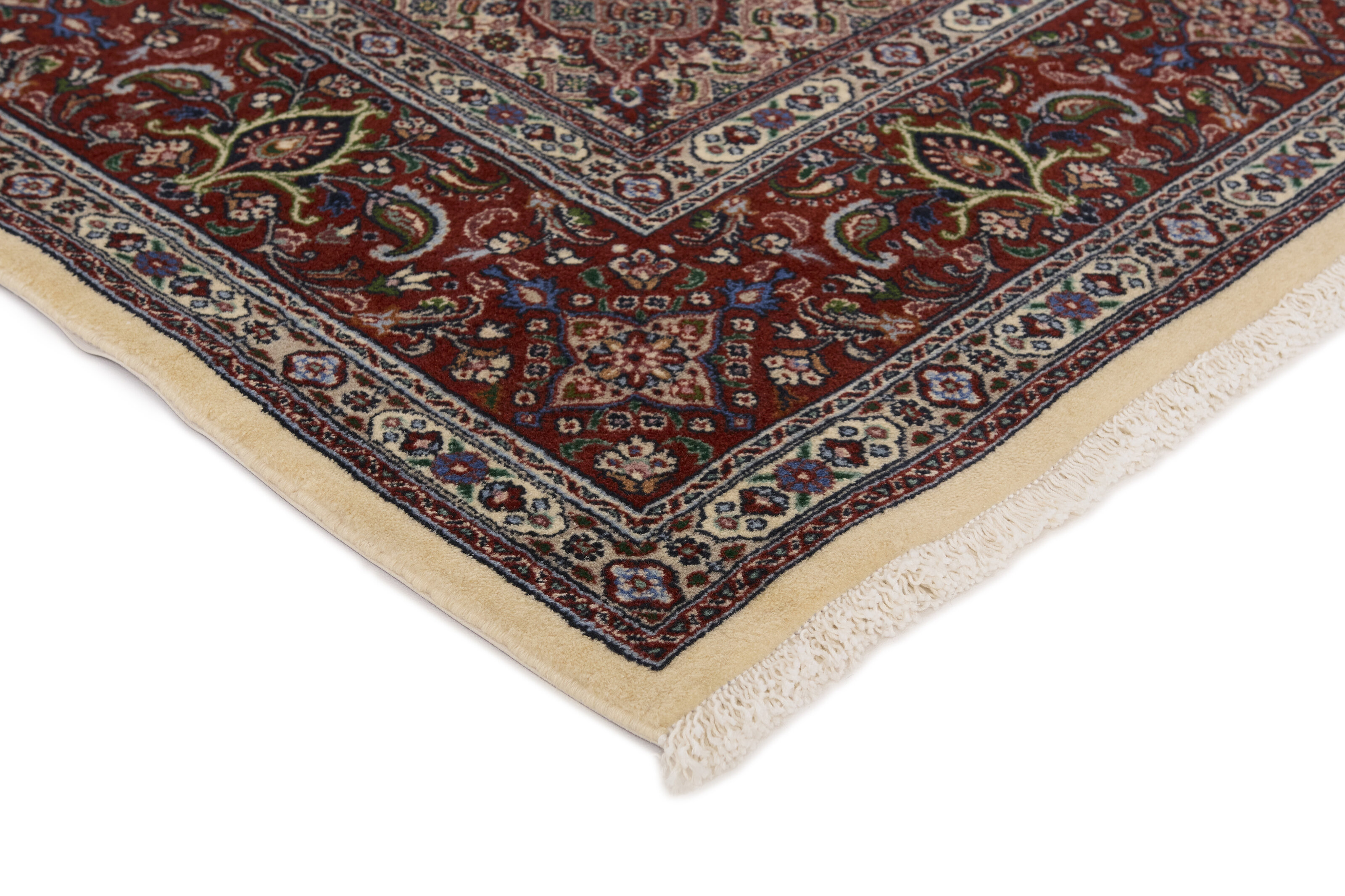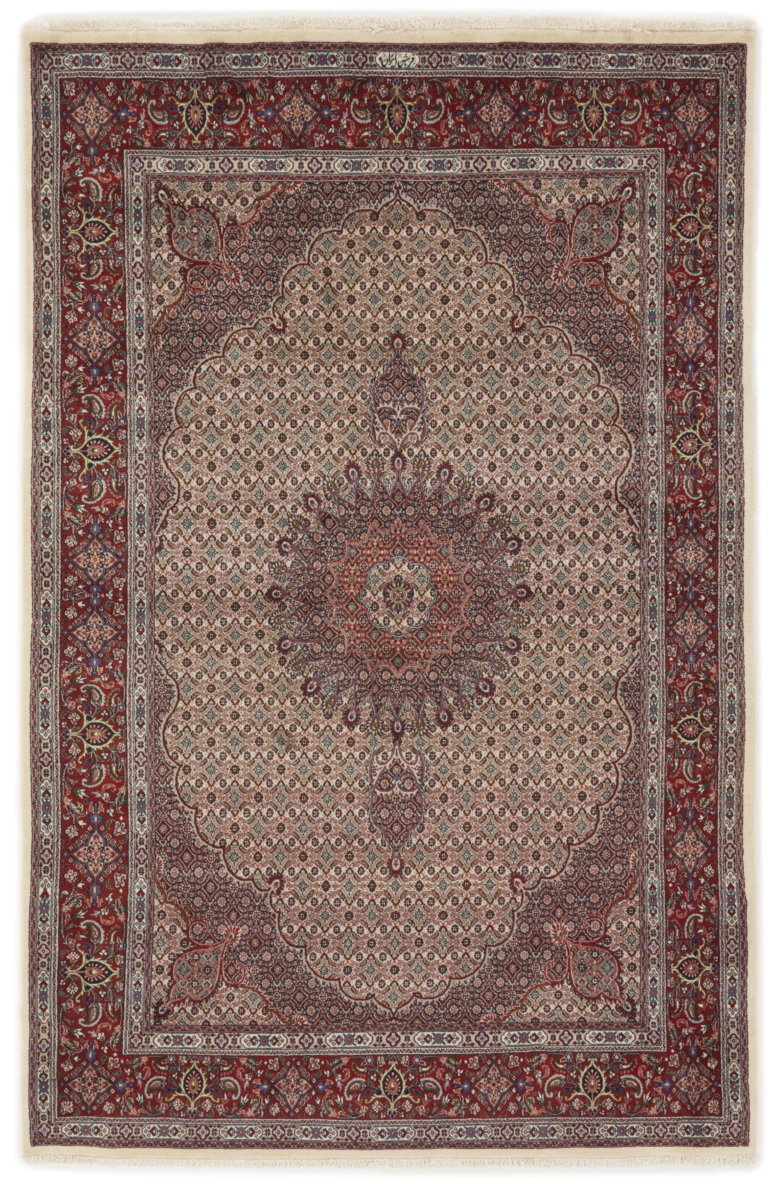 Moud Mahi SherkatItem no.: 1520419 Size: 195 cm x 305 cmMoud is a small town south of Mashad, in the Khorrasan Province. Rugs from this area are characterised by homogeneity in patterns and quality. Warp and weft are cotton and the pile is wool. The trimmings are a version of the traditional Persian turtle trimming. The rugs are produced in all sizes. Moud rugs are often copied in India, because of their remarkable homogeneity. The characteristic Moud designs are among the most uniform, evenly knotted, and easily recognisable designs of the Khorrasan Province. Moud Mahi are made in a beige, light red, or blue tone, with all-over Mahi patterns or with a star shaped medallion. Mahi means fish, and the Mahi pattern is the most commonly used pattern in genuine Persian rugs. When looking at it closely, you can see a pond encircled by four fish. Sherkat is the designation for a select series of rug types that are knotted in special workshops as part of a state-controlled project, the purpose of which is to support and thereby preserve the production of fine classical Persian rug patterns.