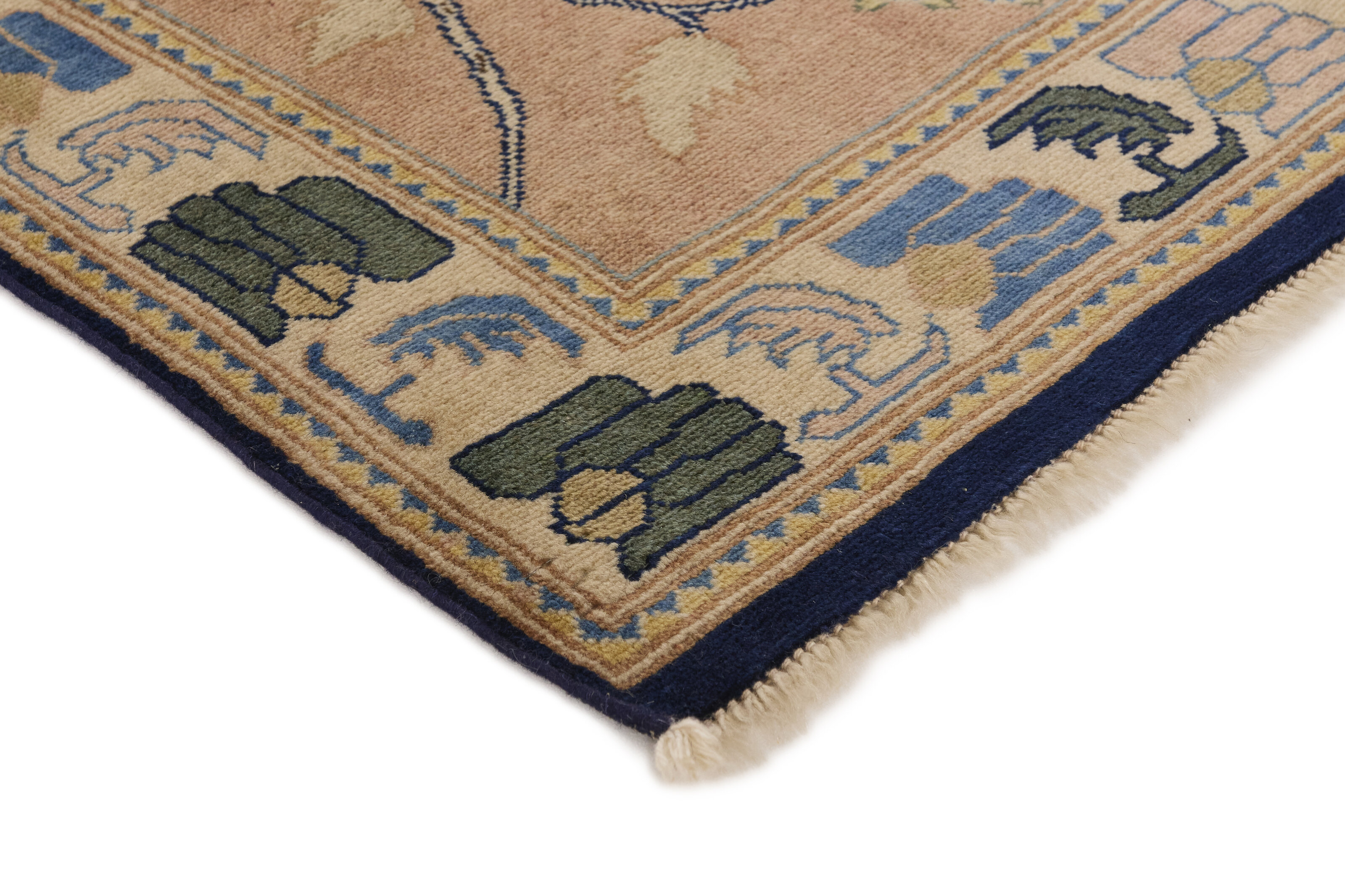 Ardebil SherkatItem no.: 332129 Size: 100 cm x 150 cmArdebil and Meshkin (or Meshkinshahr) are situated in East Azerbaijan, east of Tabriz. Ardebil is the biggest and most important of the two cities, and it was home to the Safavaids, a royal family in 17th century Iran. The Safavid mosque and mausoleum complex is located in the city centre. The two 1542 rugs known as the Ardebil rugs, now shared between London and California, were originally placed in the mosque. The rugs produced in Ardebil and Meshkin today are heavily influenced by impressions from other parts of Azerbaijan; by the village rugs covered in geometrical patterns, and by the Tabriz rugs, with their simple patterns and medallions on a Herati base, which provides a beautiful contrast to the calm blue, red, or cream coloured base. Wool and cotton is used for the warp and weft, while the pile is generally wool, although there is a significant production of rugs with mixed silk/wool piles. Sherkat is the designation for a select series of rug types that are knotted in special workshops as part of a state-controlled project, the purpose of which is to support and thereby preserve the production of fine classical Persian rug patterns.