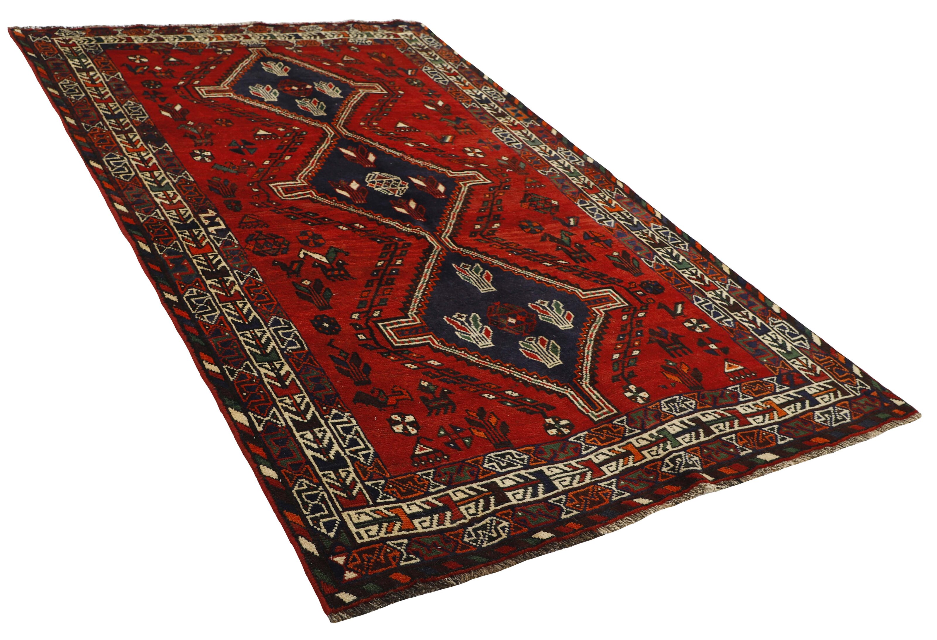 ShirazItem no.: 1489781 Size: 160 cm x 252 cmShiraz, with a population of about one million, is the capitol of the south-eastern province of Fars, and is situated in the Zargros Mountains. Shiraz is an age-old city, which has been the capitol of Iran several times, and it is known as the city of roses and nightingales. It has a reputation of being very relaxed, with a “ we will get around to that tomorrow”-attitude. Shiraz has laid name to rugs that are knotted in the small towns and villages surrounding it, from where they are brought to the city to be sold. The local tribes like the Kashghai, whose best works are even finer and more densely knotted than those knotted in Shiraz itself, also make them. Shiraz rugs are characterised by a deep claret colour, combined with dark blue and small areas of white and green. The wool is soft, and darker wool, sometimes mixed with goat’s hair, is used for both warp and weft. The patterns are coarse and geometrical, often identical to the Kashghai patterns. Often, small, geometrical birds and animals brighten them up. Shiraz rugs are made in all sizes, although big rugs are rare.