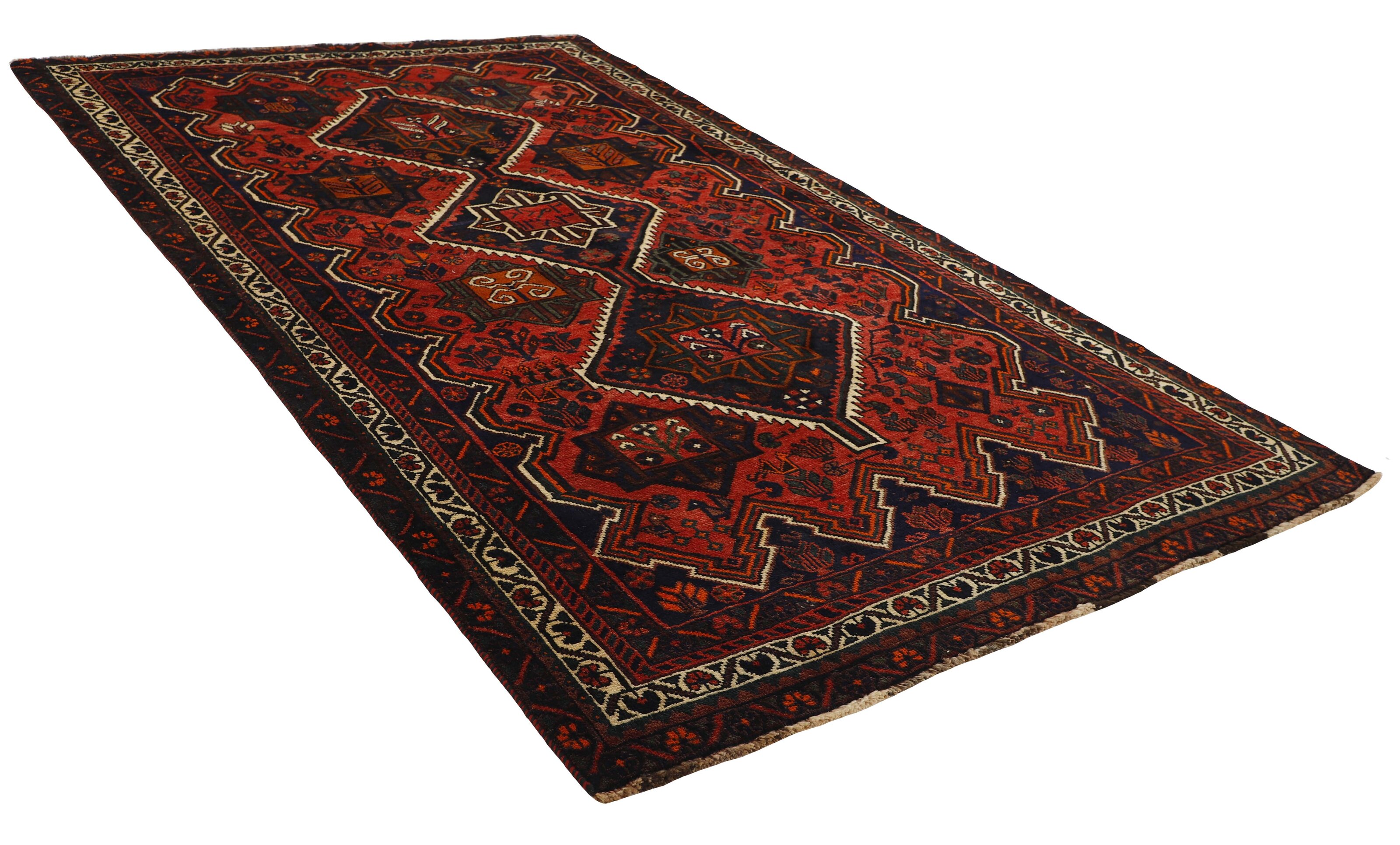 ShirazItem no.: 1489790 Size: 195 cm x 314 cmShiraz, with a population of about one million, is the capitol of the south-eastern province of Fars, and is situated in the Zargros Mountains. Shiraz is an age-old city, which has been the capitol of Iran several times, and it is known as the city of roses and nightingales. It has a reputation of being very relaxed, with a “ we will get around to that tomorrow”-attitude. Shiraz has laid name to rugs that are knotted in the small towns and villages surrounding it, from where they are brought to the city to be sold. The local tribes like the Kashghai, whose best works are even finer and more densely knotted than those knotted in Shiraz itself, also make them. Shiraz rugs are characterised by a deep claret colour, combined with dark blue and small areas of white and green. The wool is soft, and darker wool, sometimes mixed with goat’s hair, is used for both warp and weft. The patterns are coarse and geometrical, often identical to the Kashghai patterns. Often, small, geometrical birds and animals brighten them up. Shiraz rugs are made in all sizes, although big rugs are rare.