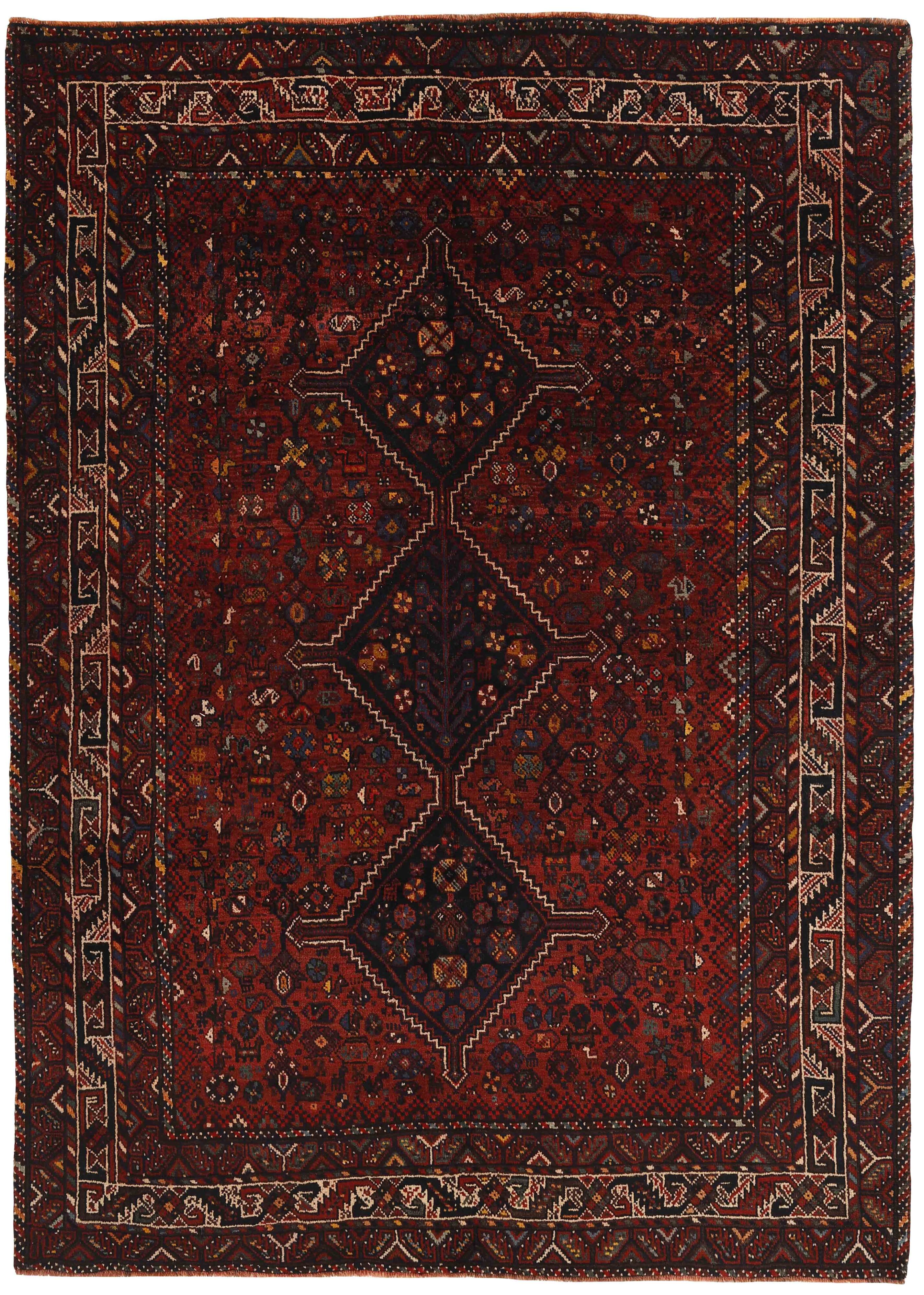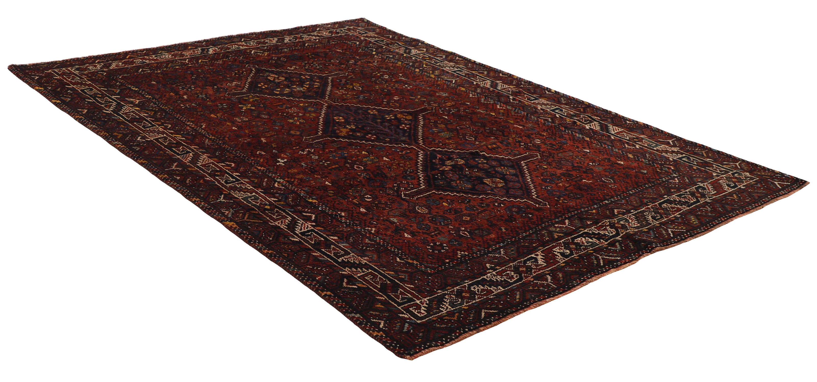 ShirazItem no.: 1489791 Size: 203 cm x 275 cmShiraz, with a population of about one million, is the capitol of the south-eastern province of Fars, and is situated in the Zargros Mountains. Shiraz is an age-old city, which has been the capitol of Iran several times, and it is known as the city of roses and nightingales. It has a reputation of being very relaxed, with a “ we will get around to that tomorrow”-attitude. Shiraz has laid name to rugs that are knotted in the small towns and villages surrounding it, from where they are brought to the city to be sold. The local tribes like the Kashghai, whose best works are even finer and more densely knotted than those knotted in Shiraz itself, also make them. Shiraz rugs are characterised by a deep claret colour, combined with dark blue and small areas of white and green. The wool is soft, and darker wool, sometimes mixed with goat’s hair, is used for both warp and weft. The patterns are coarse and geometrical, often identical to the Kashghai patterns. Often, small, geometrical birds and animals brighten them up. Shiraz rugs are made in all sizes, although big rugs are rare.