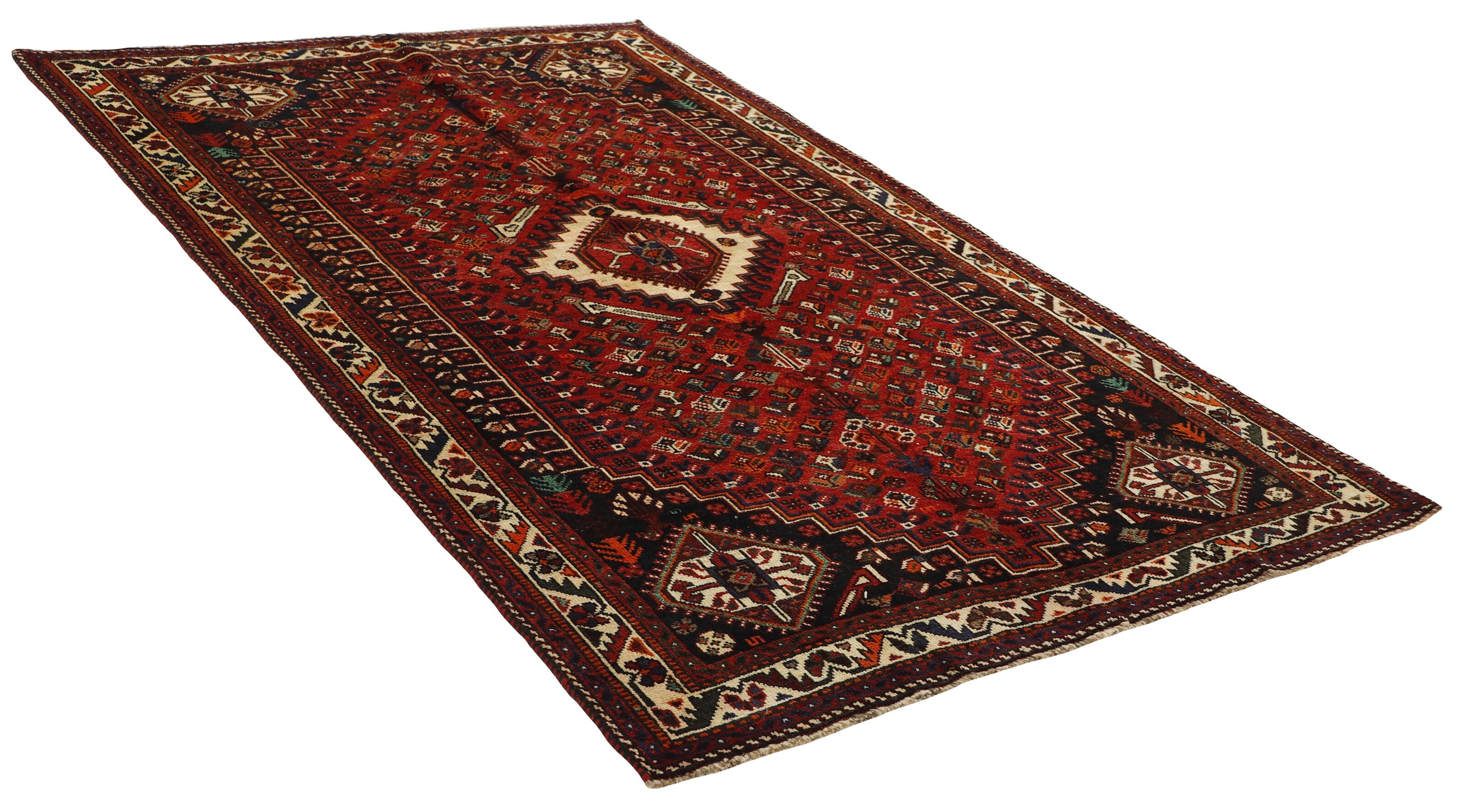 ShirazItem no.: 1489807 Size: 161 cm x 259 cmShiraz, with a population of about one million, is the capitol of the south-eastern province of Fars, and is situated in the Zargros Mountains. Shiraz is an age-old city, which has been the capitol of Iran several times, and it is known as the city of roses and nightingales. It has a reputation of being very relaxed, with a “ we will get around to that tomorrow”-attitude. Shiraz has laid name to rugs that are knotted in the small towns and villages surrounding it, from where they are brought to the city to be sold. The local tribes like the Kashghai, whose best works are even finer and more densely knotted than those knotted in Shiraz itself, also make them. Shiraz rugs are characterised by a deep claret colour, combined with dark blue and small areas of white and green. The wool is soft, and darker wool, sometimes mixed with goat’s hair, is used for both warp and weft. The patterns are coarse and geometrical, often identical to the Kashghai patterns. Often, small, geometrical birds and animals brighten them up. Shiraz rugs are made in all sizes, although big rugs are rare.