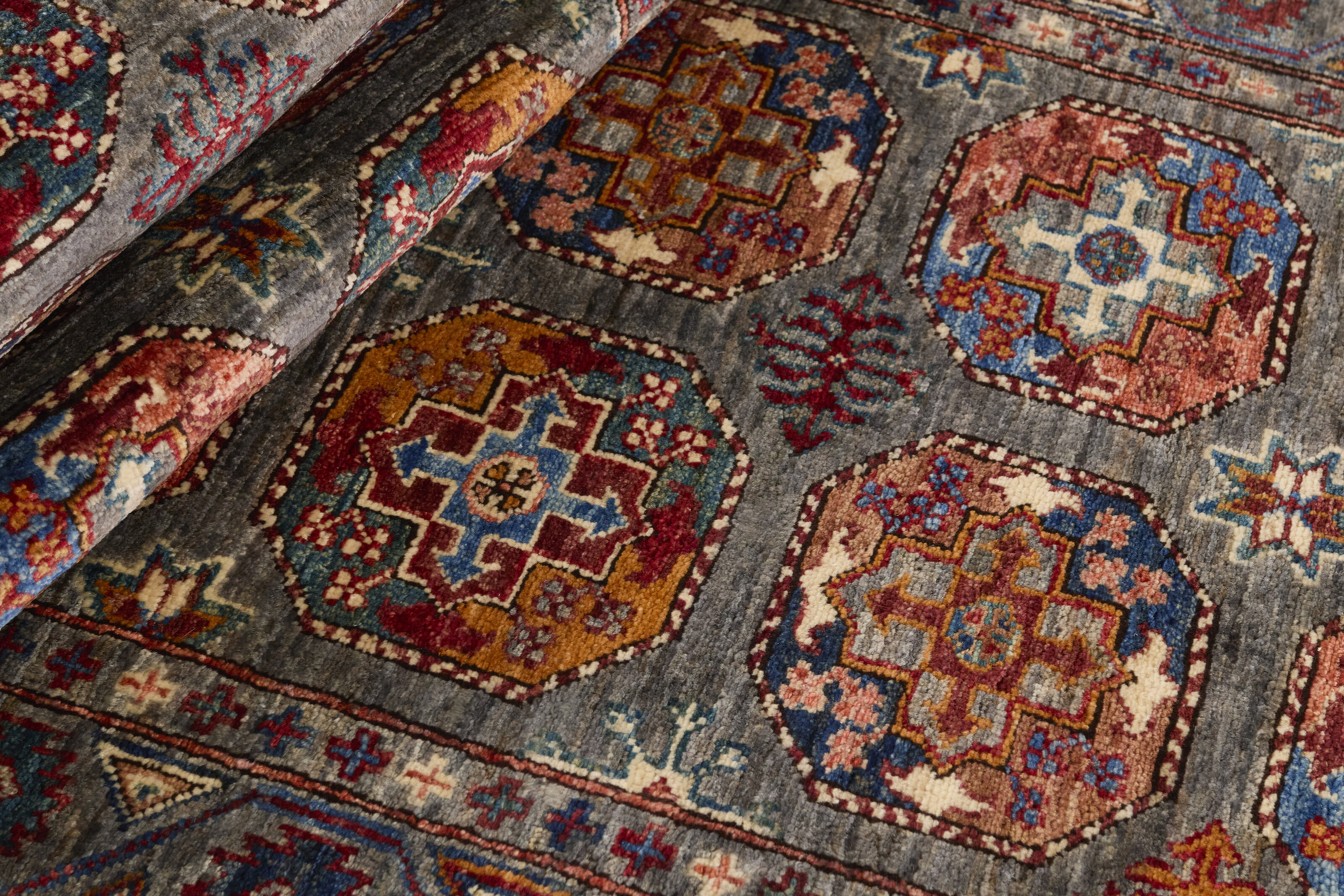 The story behind the Ziegler name dates back to 1870-80, to the Arak area of Persia, where the Ziegler Company from Manchester established its own large knottery, to meet the demand for rugs in patterns, colours and sizes tailored to western taste. The production took place in the company’s own workshops and not in the homes of the knotters themselves. The Ziegler rugs were produced until the First World War and were densely knotted rugs in delicate, pastel-like colours. Later on, the patterns have inspired different Turkmen nomad families and they are now produced in Afghanistan and Turkmenistan. The rugs, with their charming characteristics of flowers and leaf patterns, are all unique variations of a harmoniously balanced range of earth tones, consisting of nuances such as madder lake, burned sienna, burned umber, ochre, wine leaf yellow, indigo blue, and henna orange. To add the graceful and very sought-after patina, the rugs are exposed to a particularly intense washing, followed by sun drying.